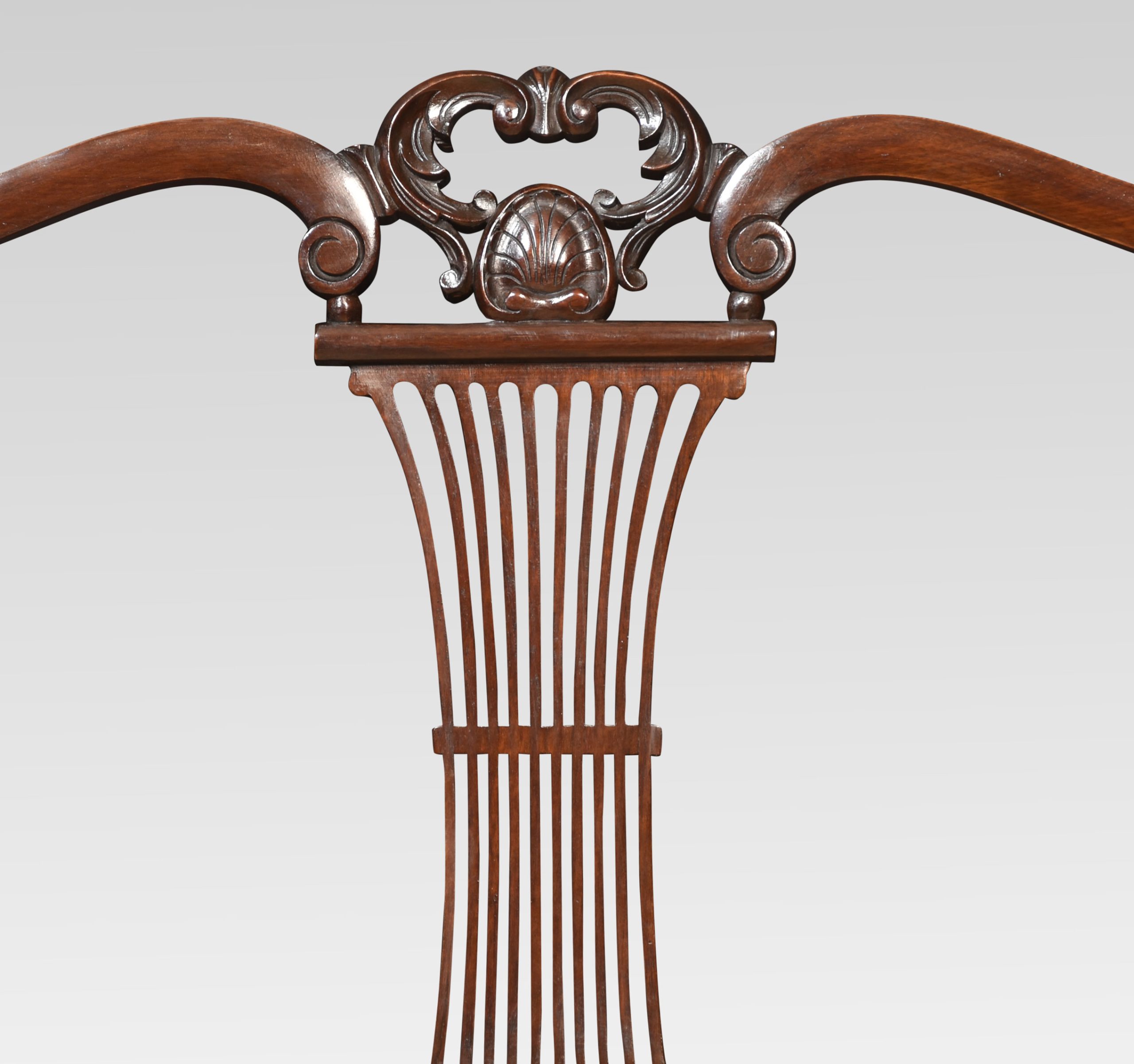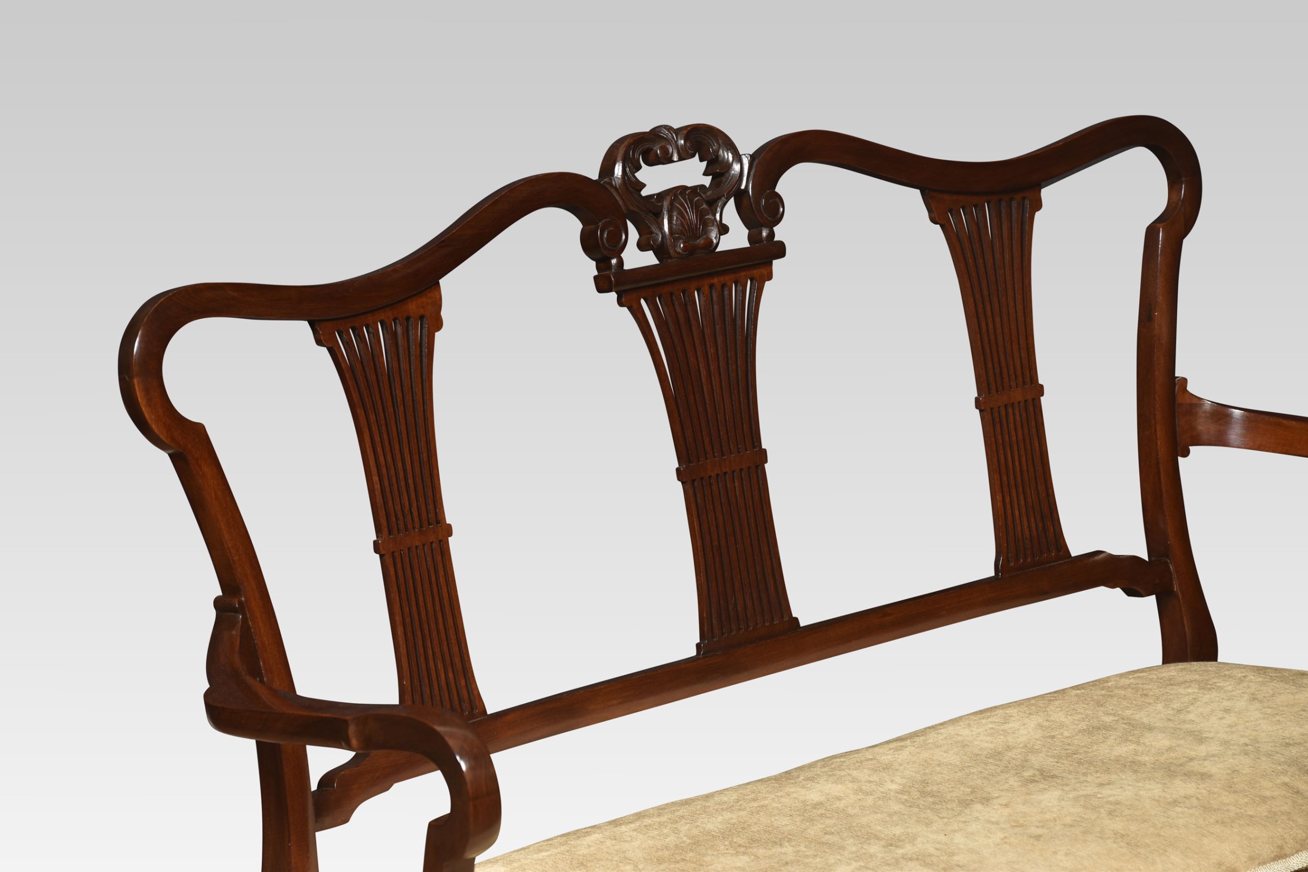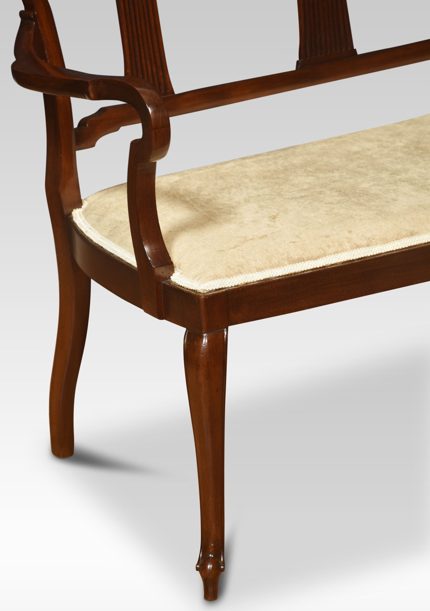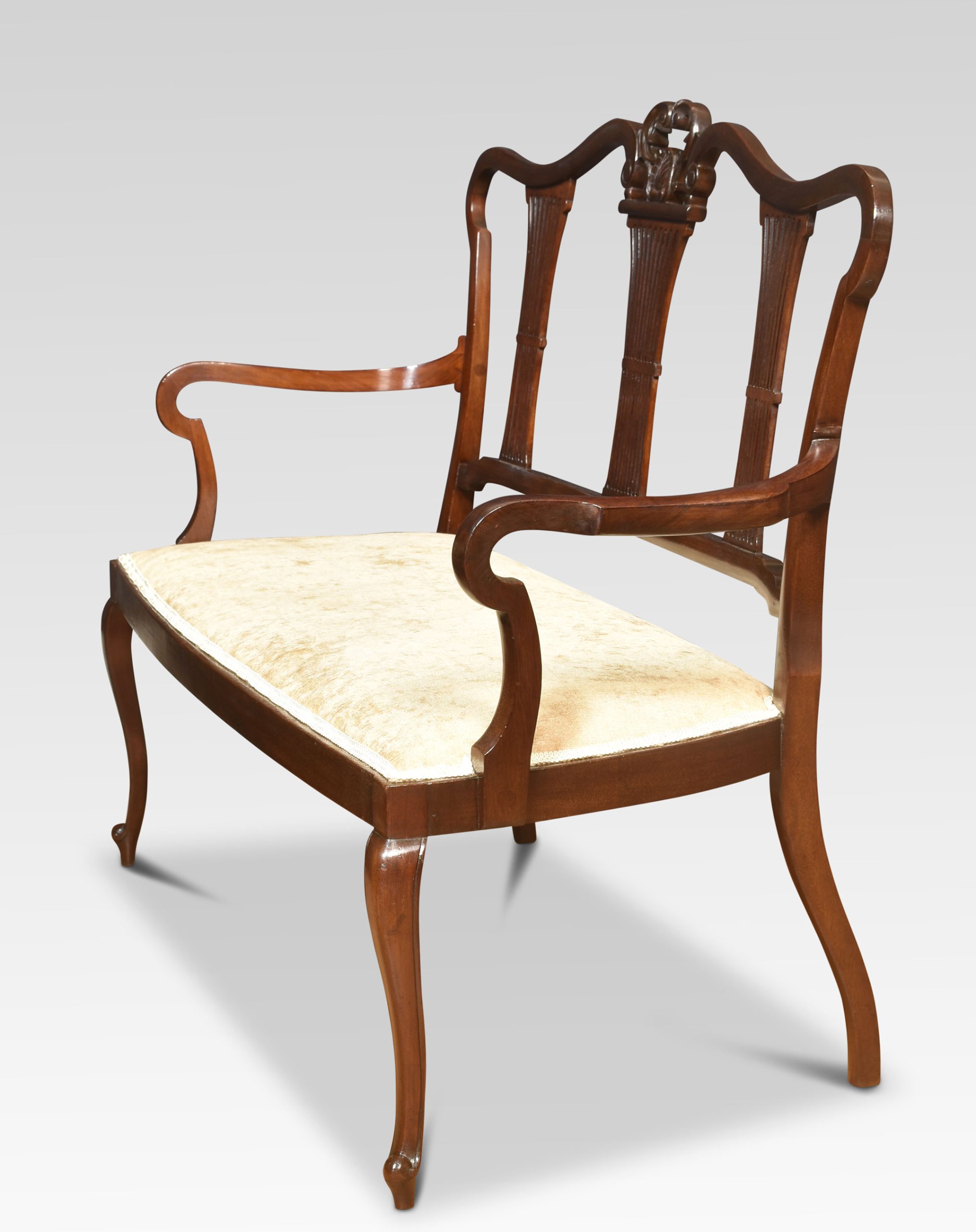 Two seater mahogany settee, having three-part splat back to the upholstered seat enclosed by scrolling arms raised up on cabriole front legs.