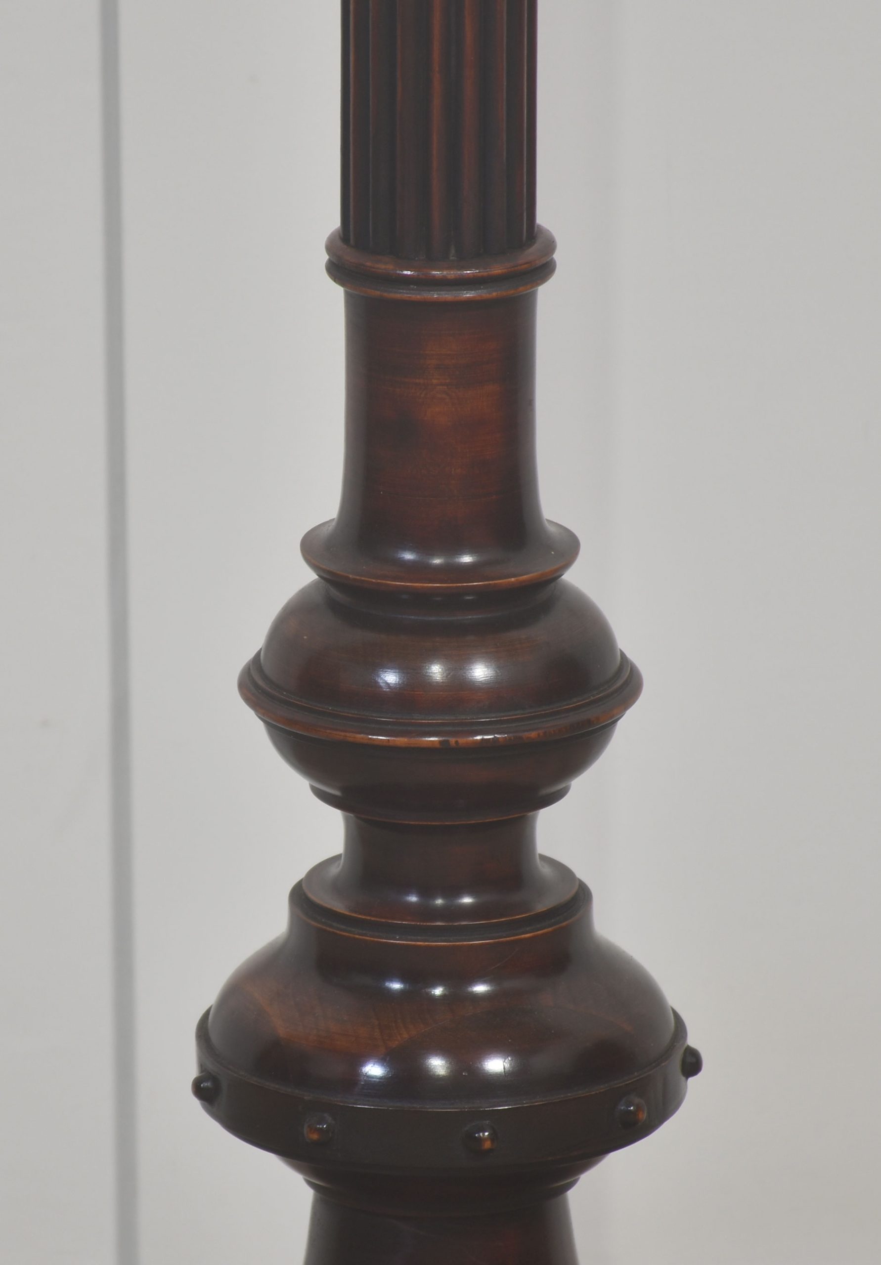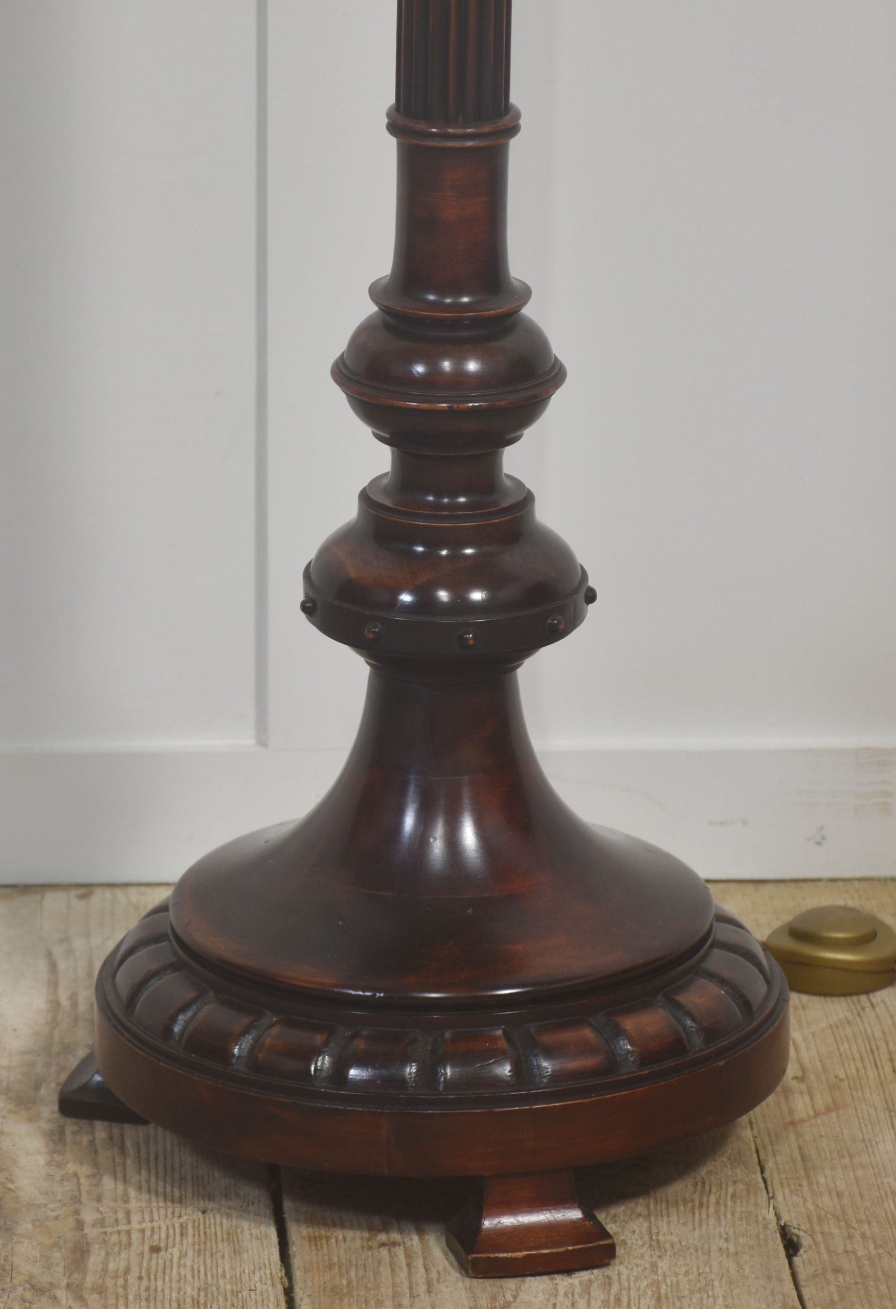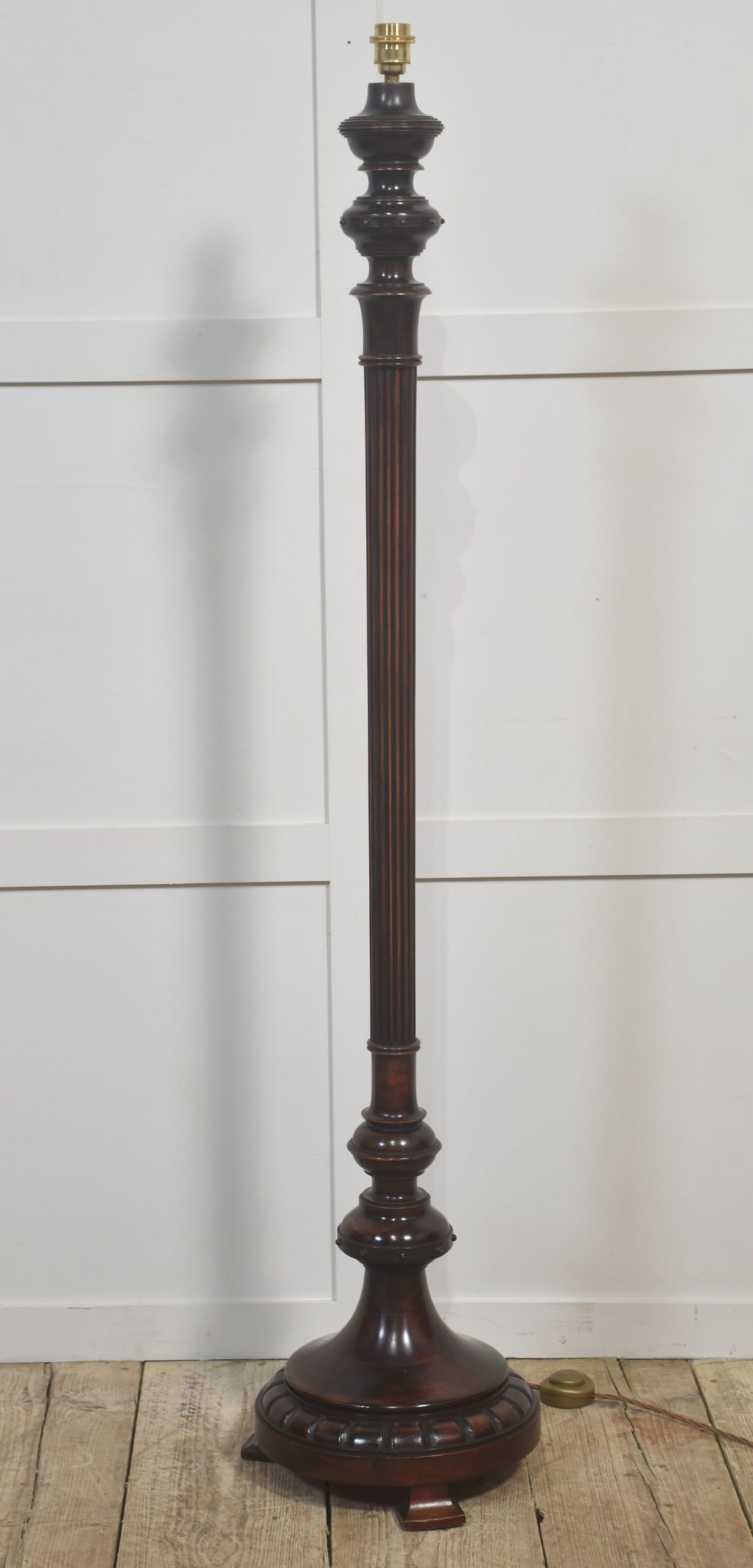 An elegant mahogany floor lamp of classic proportions, featuring a finely turned and fluted column with baluster-form detailing. The richly toned mahogany exhibits a deep, warm patina and rises from a substantial stepped base, reflecting quality craftsmanship and traditional design. The lamp has been professionally rewired with a braided cable and fully tested for safe, modern use. Operated by a foot switch. Shade not included. A refined and versatile lighting piece suited to traditional or transitional interiors.