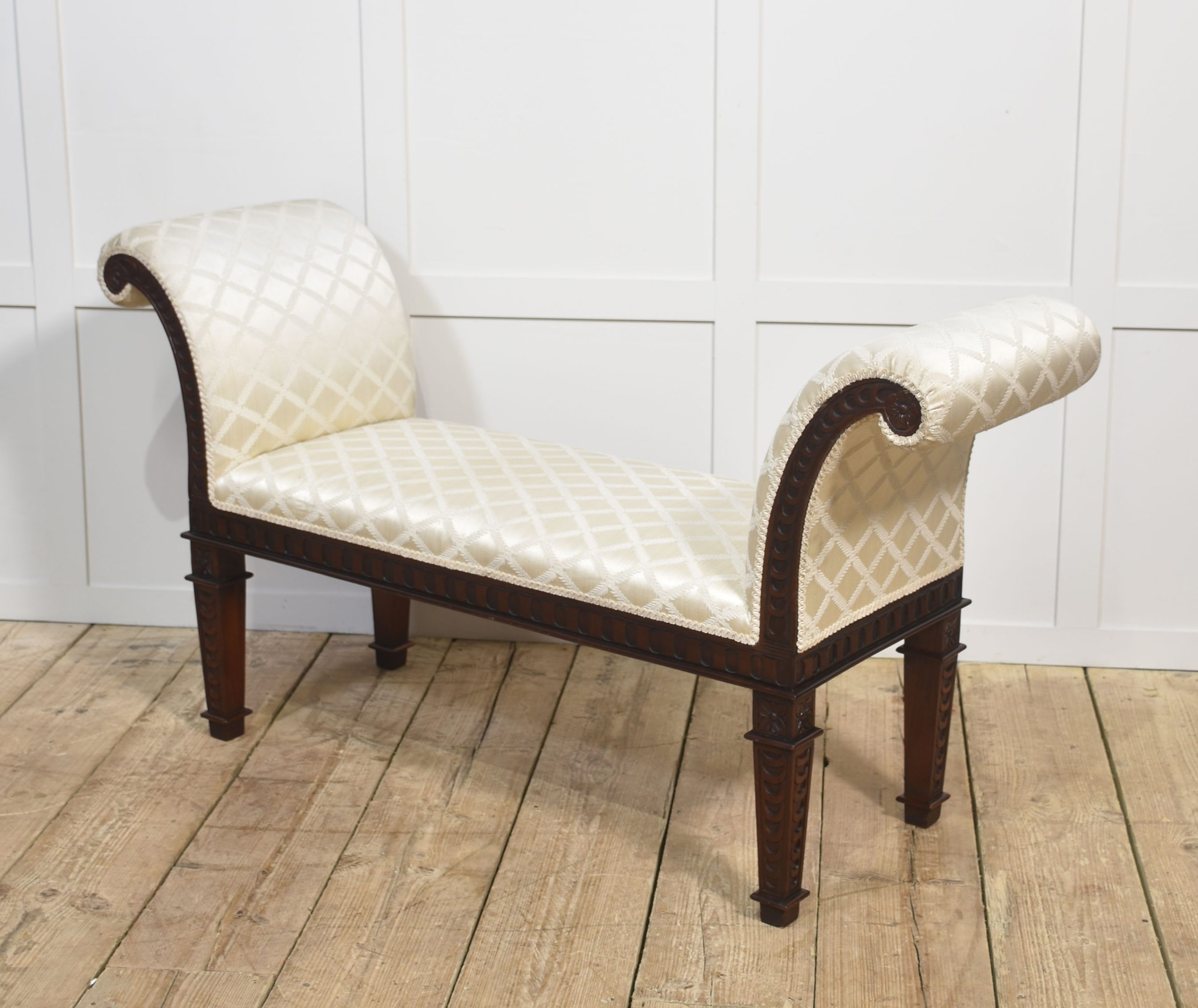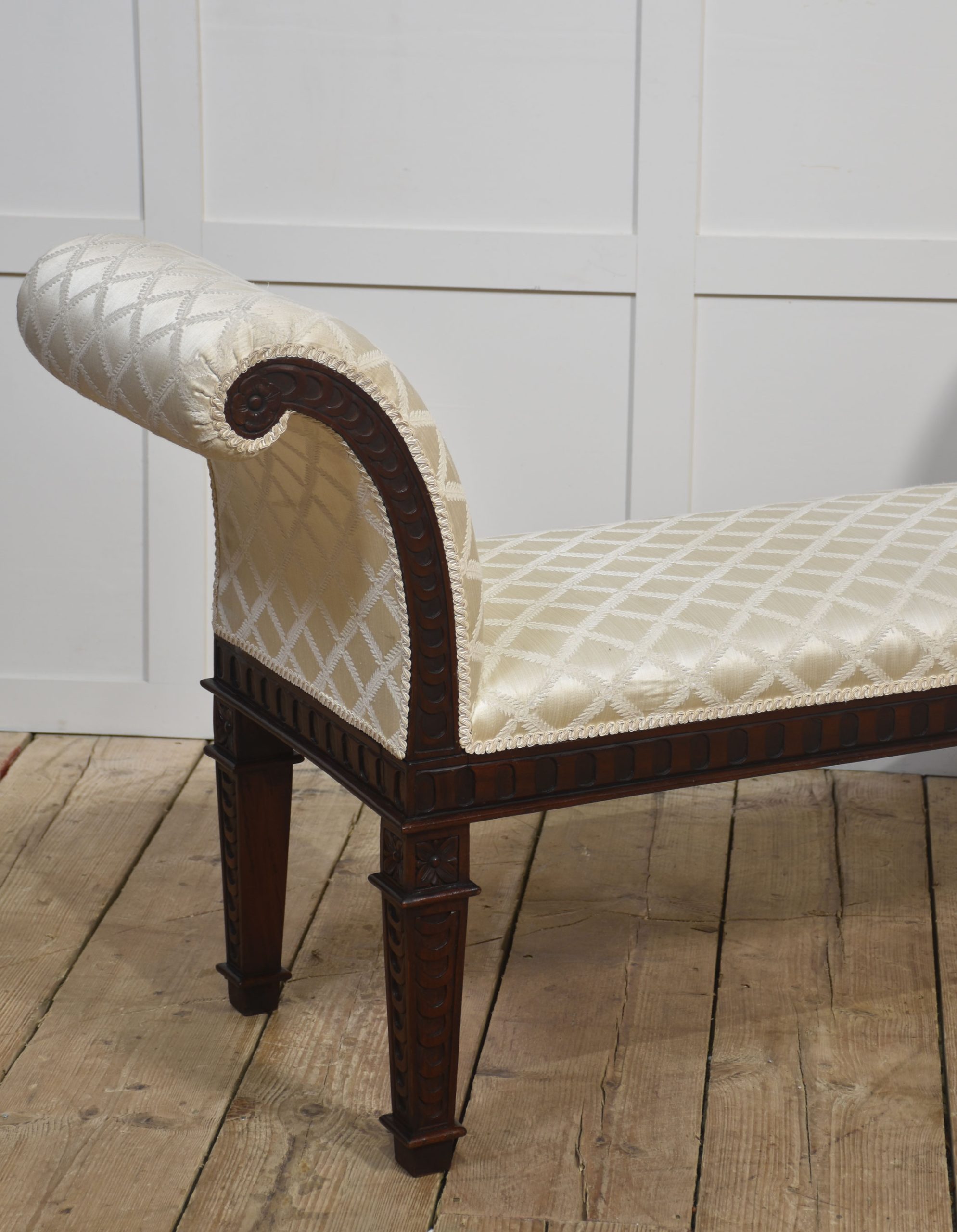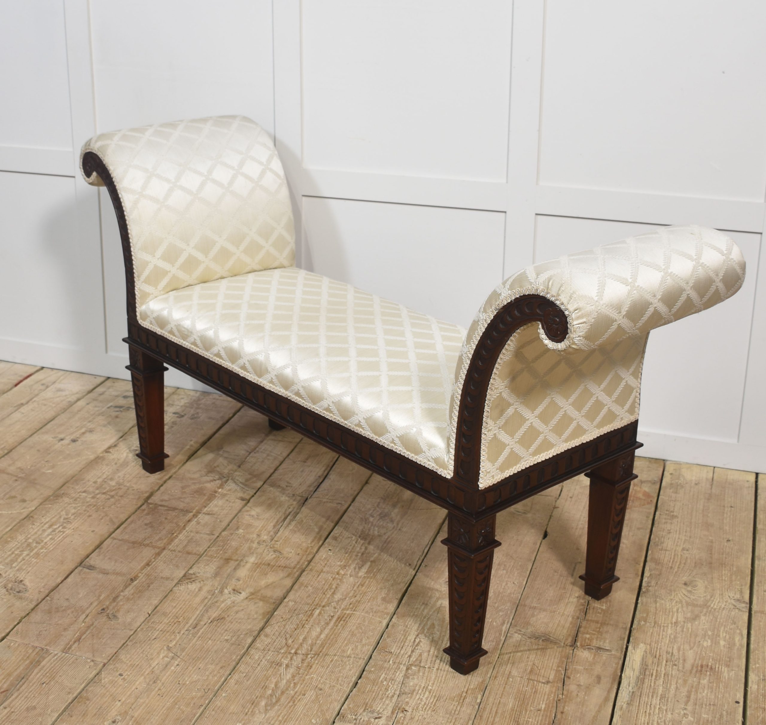 This refined window seat/bench exudes timeless sophistication, blending elegant design with exceptional craftsmanship. The frame is crafted from rich mahogany, showcasing intricate hand-carved details along the legs and scrolled arms. Upholstered in a luxurious cream satin fabric with a subtle diamond pattern, the seat offers both comfort and understated glamour.