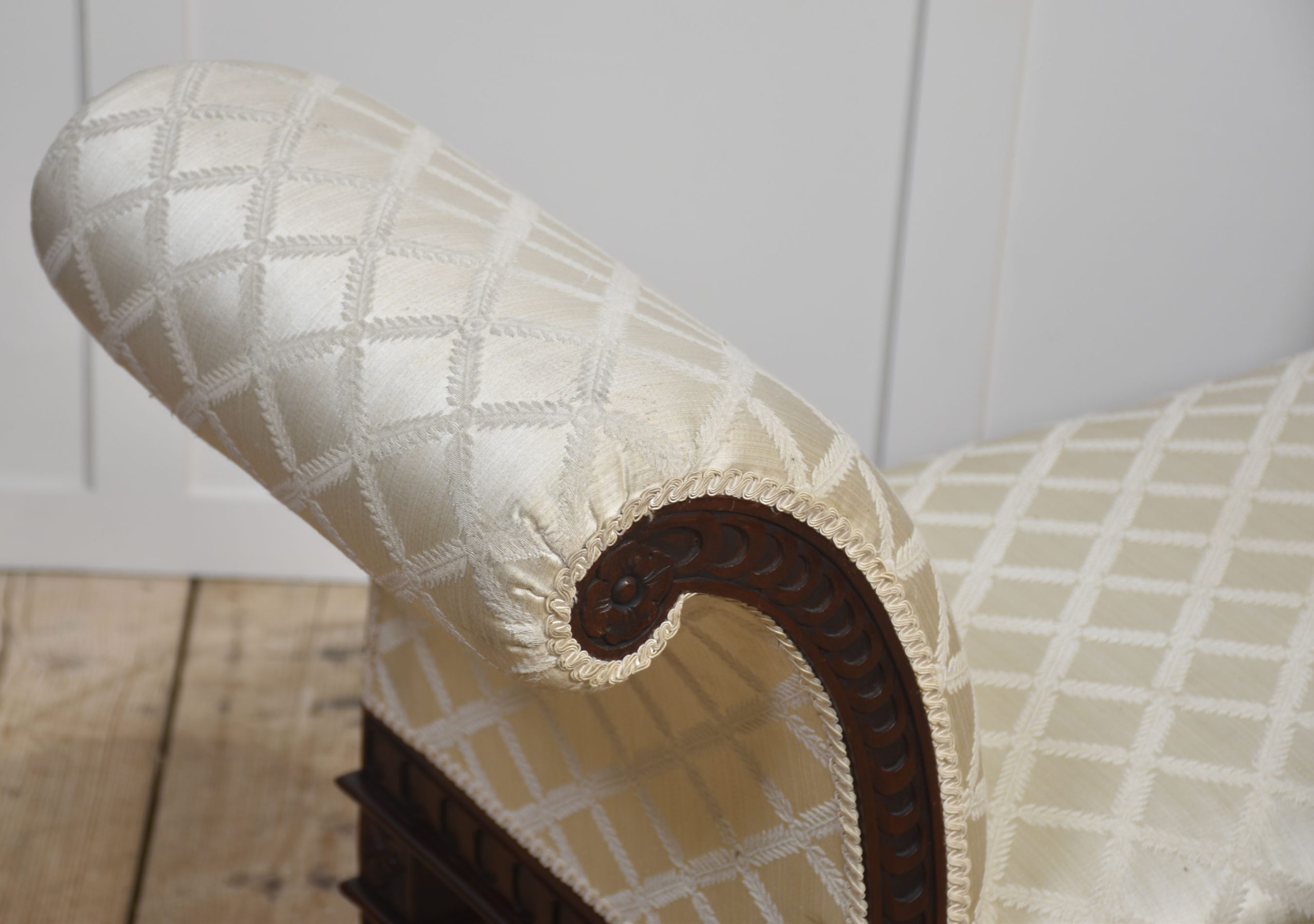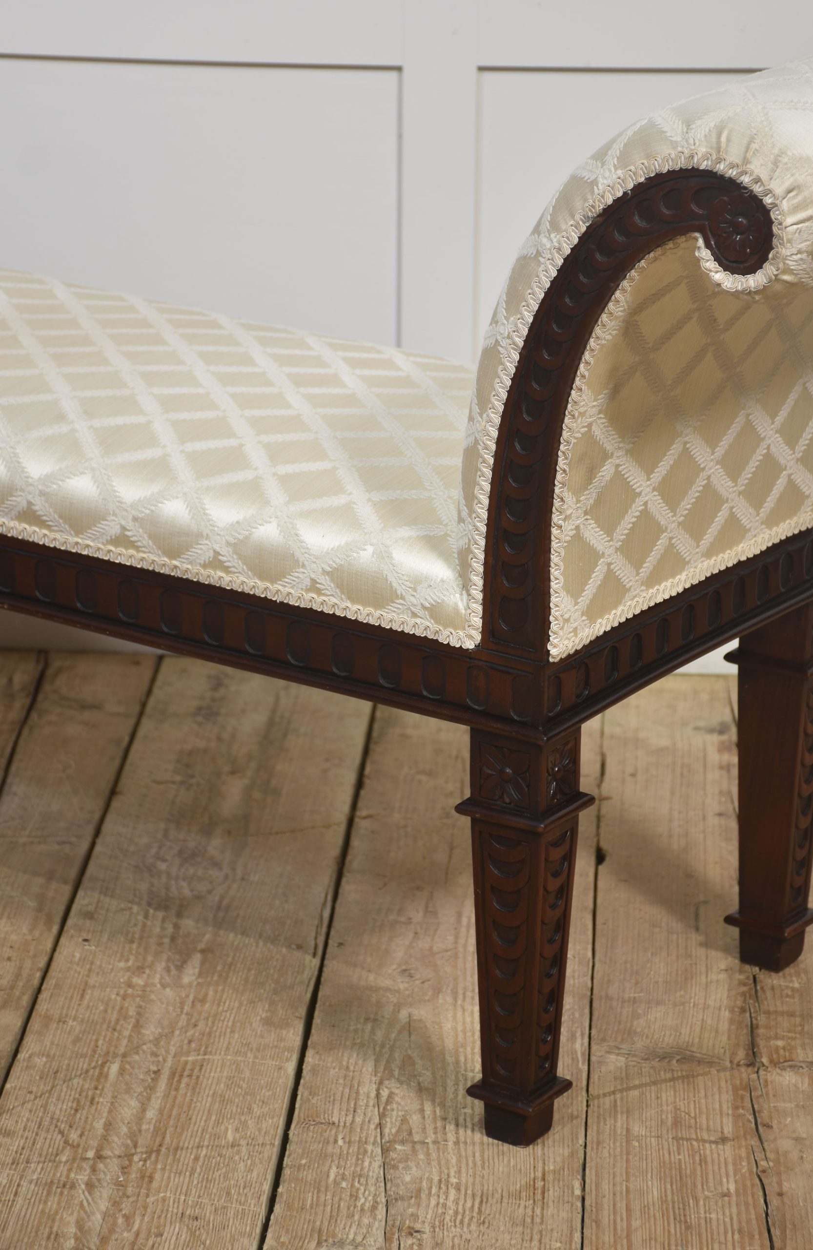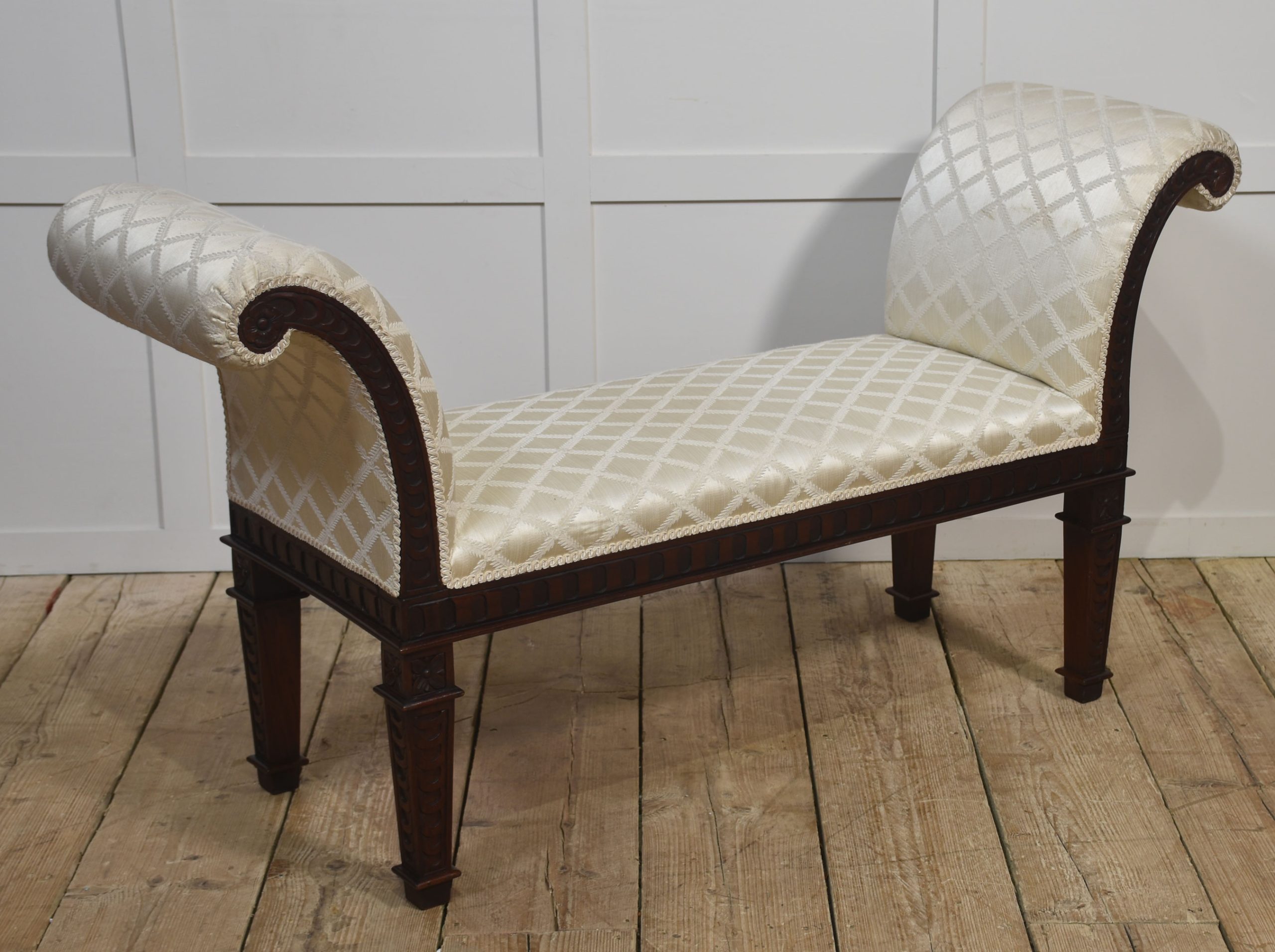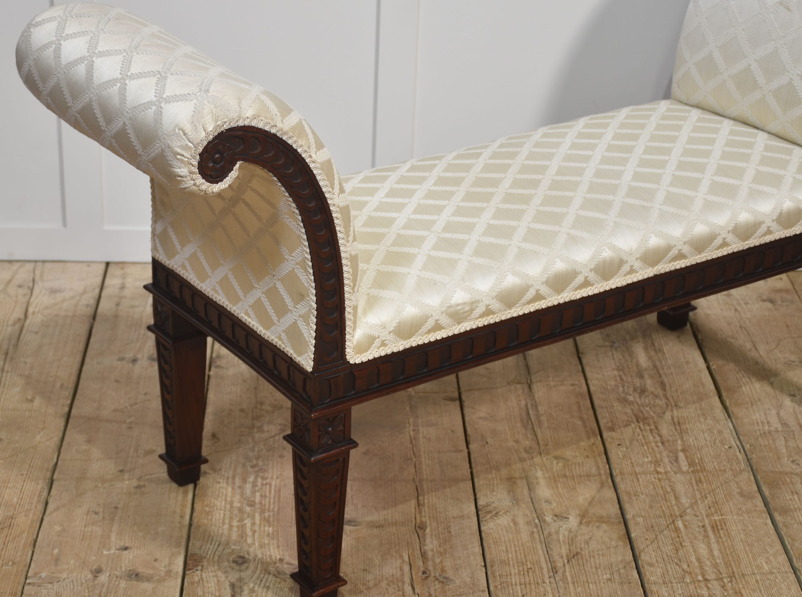 This refined window seat/bench exudes timeless sophistication, blending elegant design with exceptional craftsmanship. The frame is crafted from rich mahogany, showcasing intricate hand-carved details along the legs and scrolled arms. Upholstered in a luxurious cream satin fabric with a subtle diamond pattern, the seat offers both comfort and understated glamour.