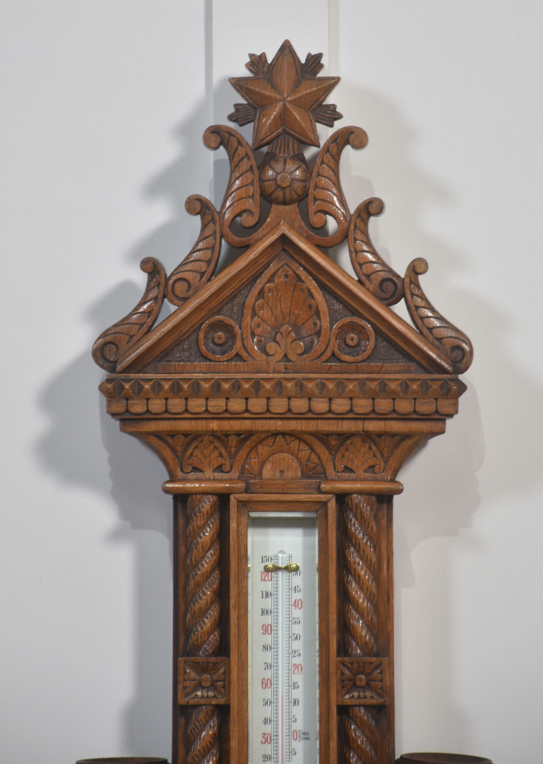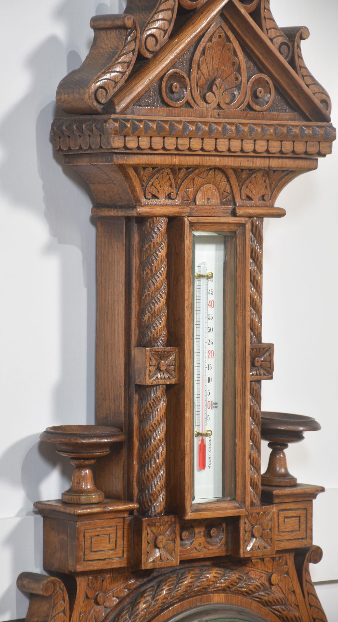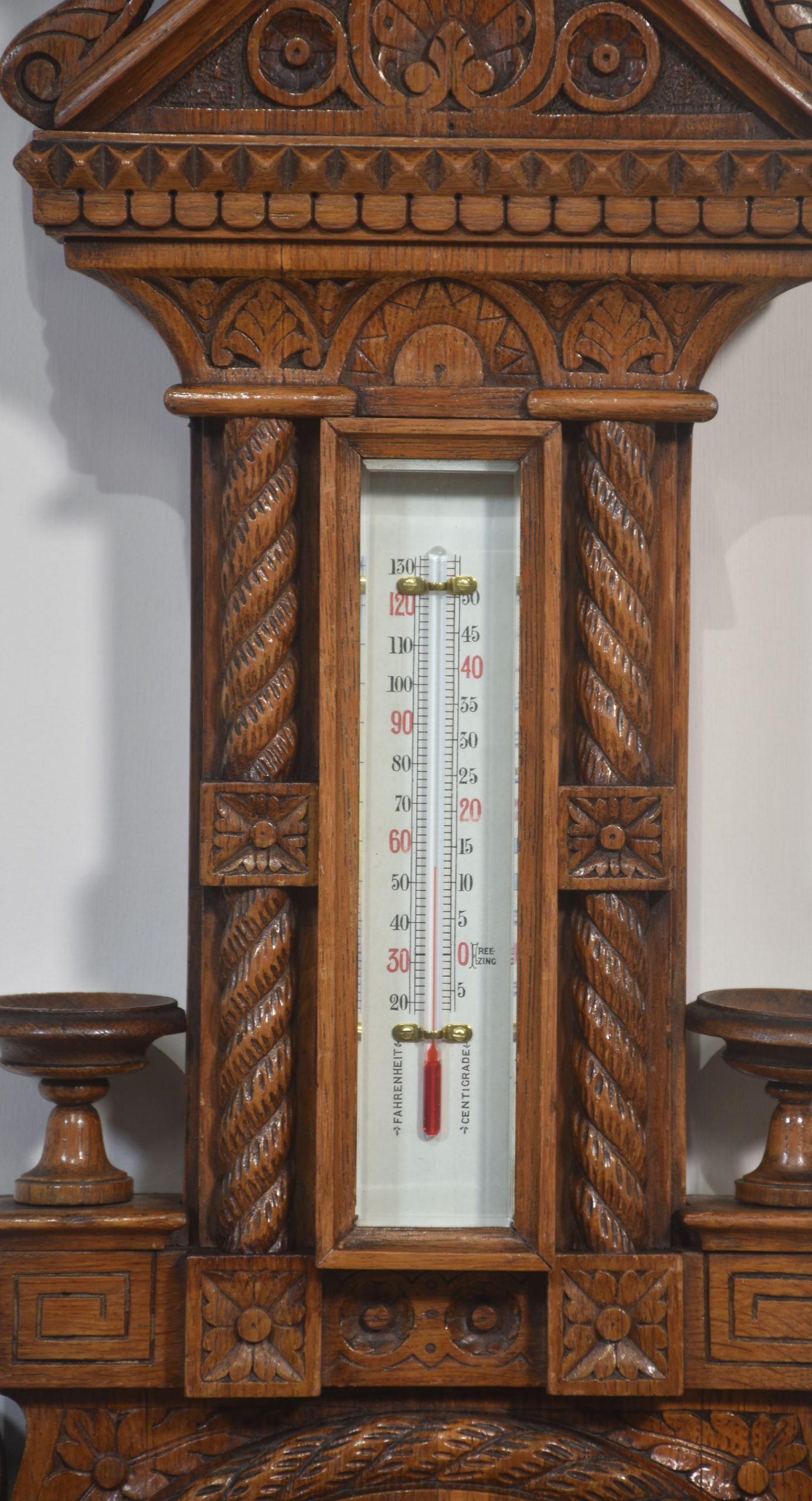 Carved oak barometer, the shaped carved oak frame with rectangular thermometer encased by glass. Above the silvered dial with silvered bezel, flanked by crisp scrolling carved decoration.