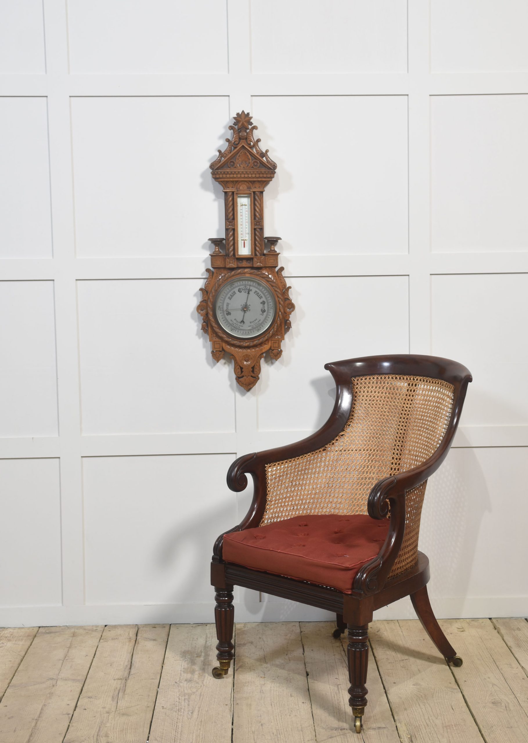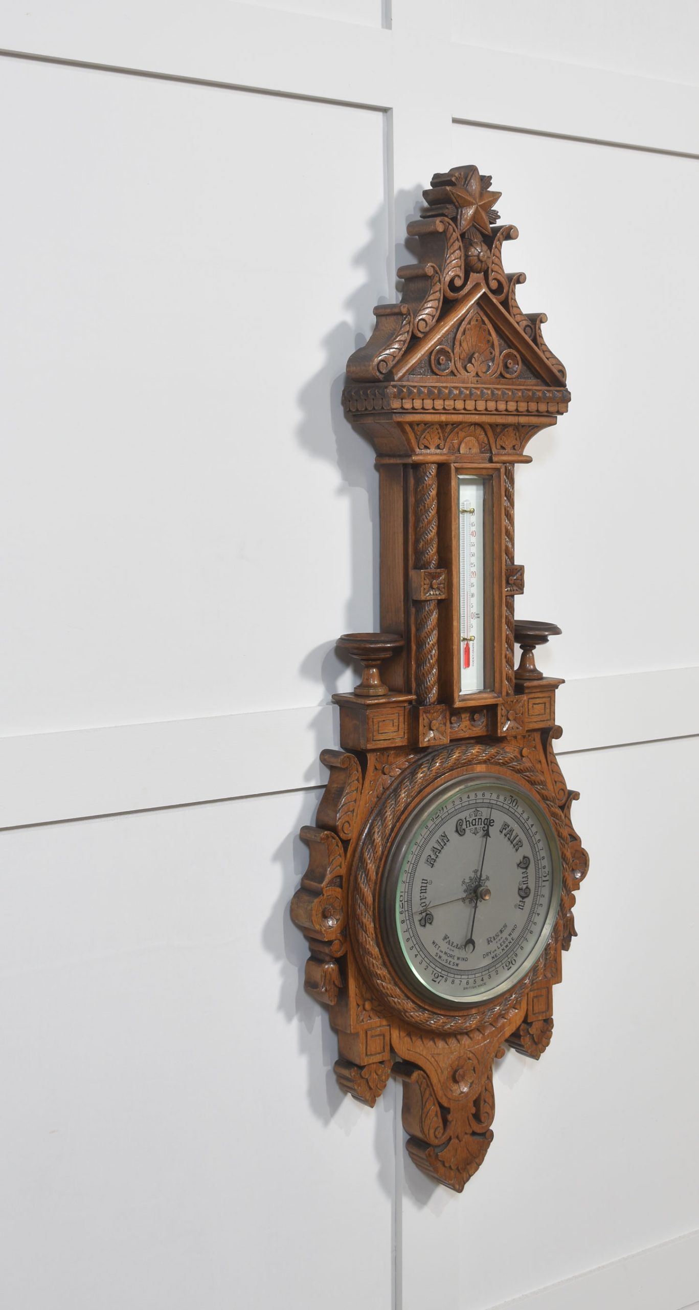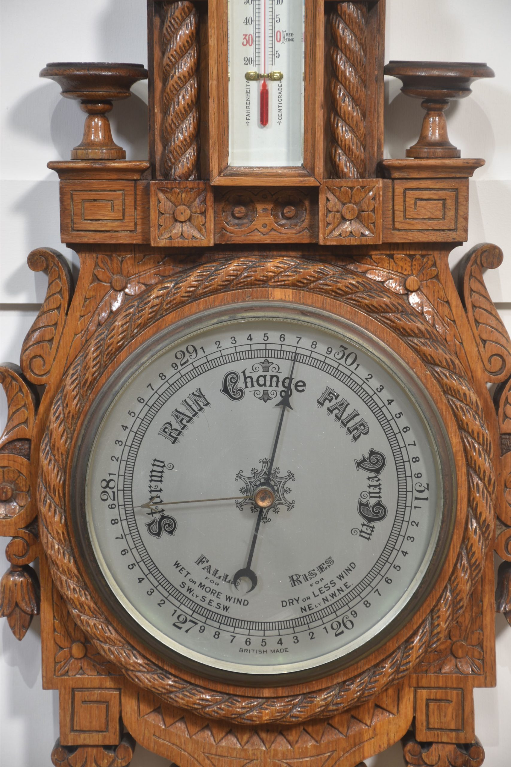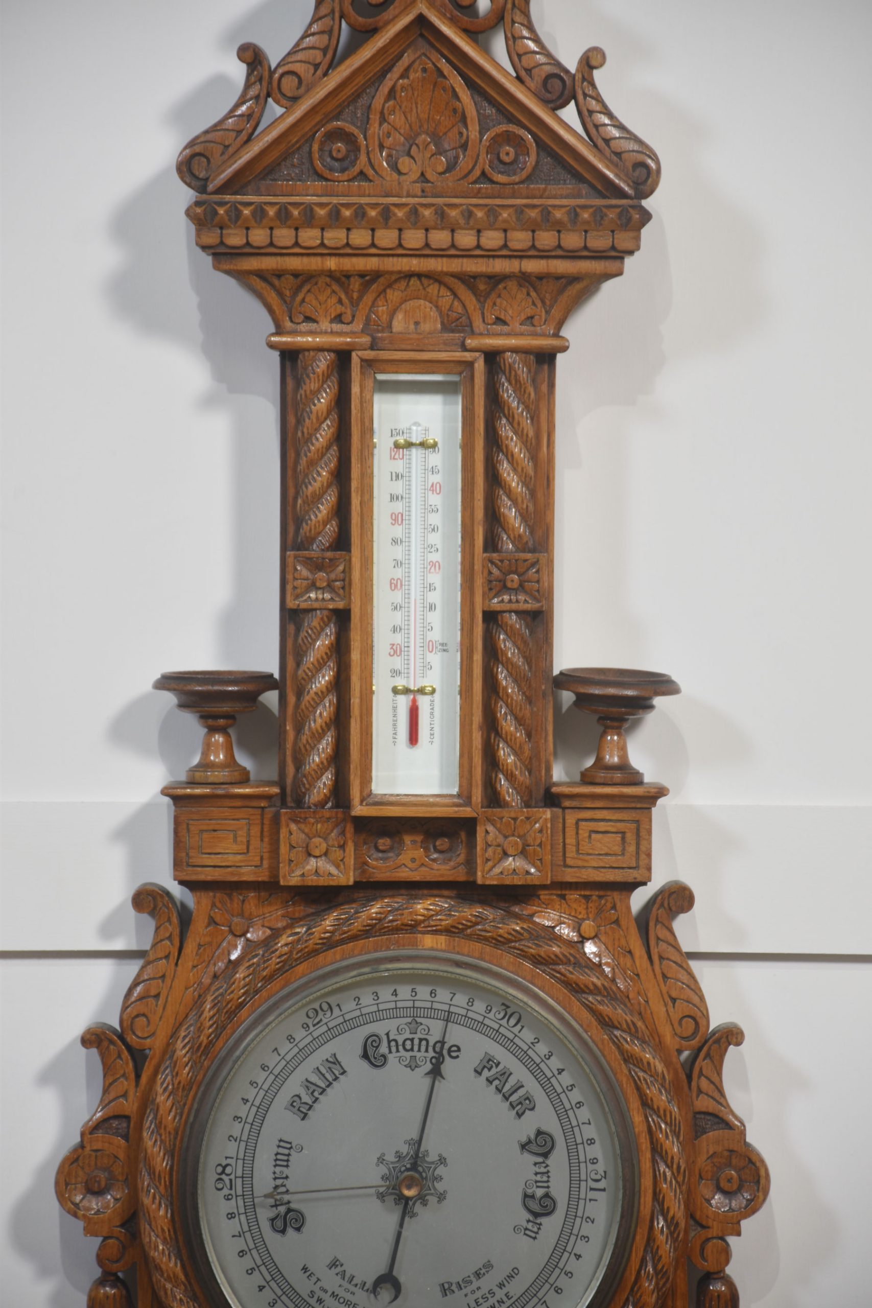 Carved oak barometer, the shaped carved oak frame with rectangular thermometer encased by glass. Above the silvered dial with silvered bezel, flanked by crisp scrolling carved decoration.