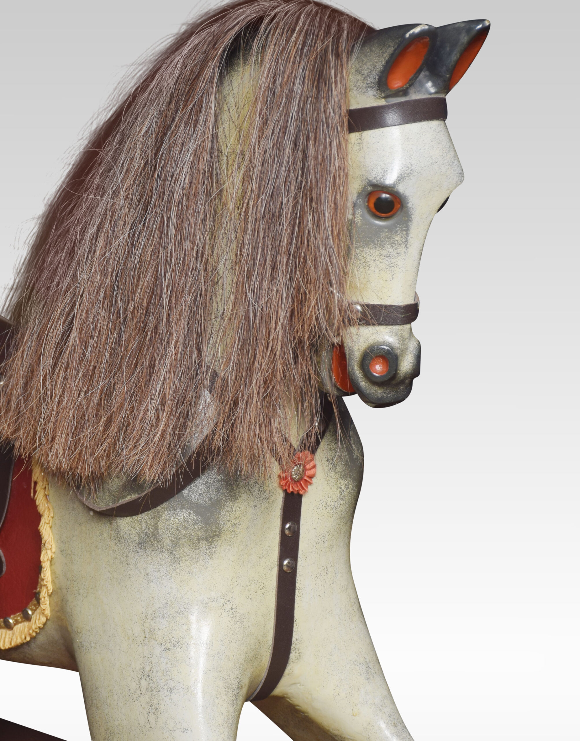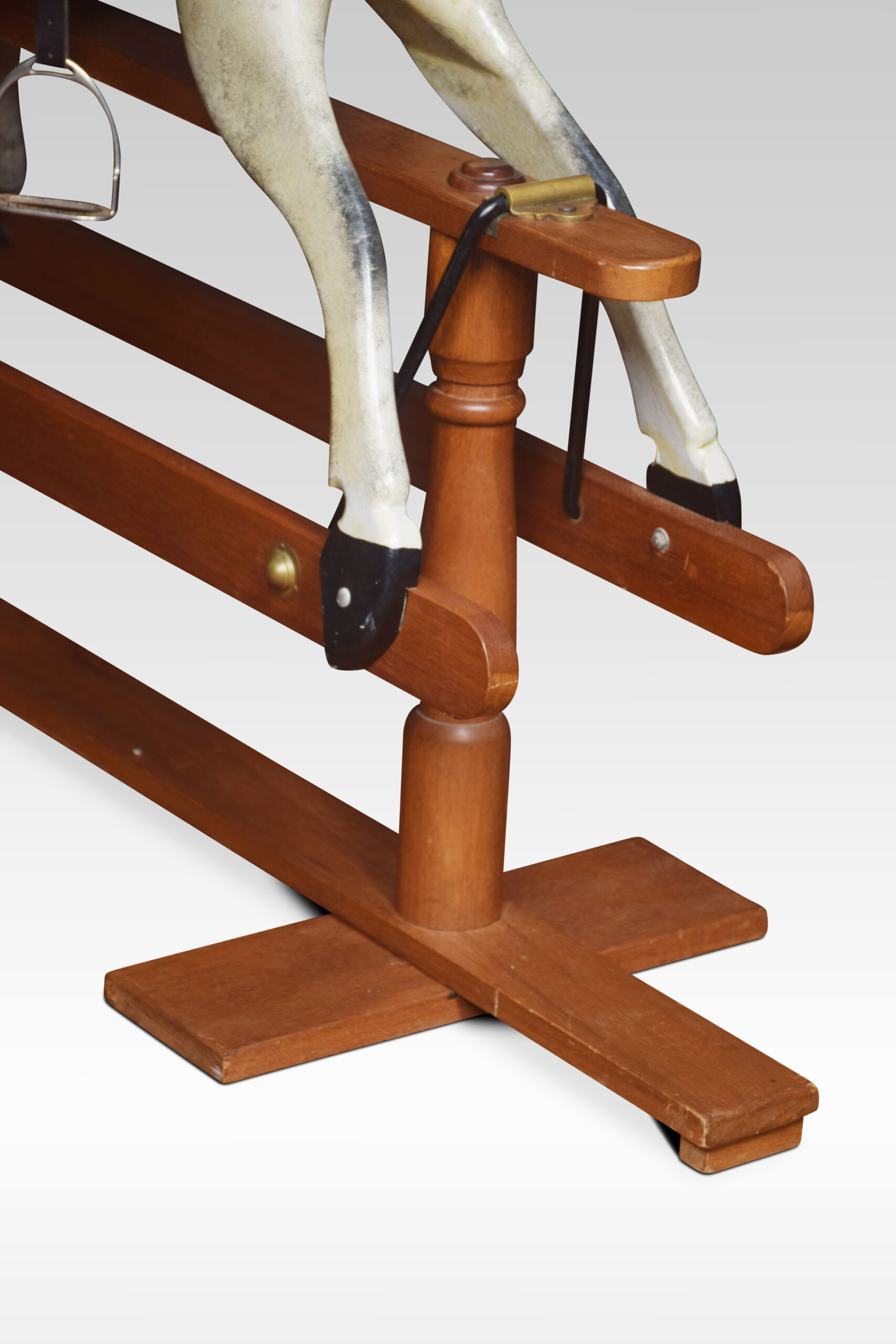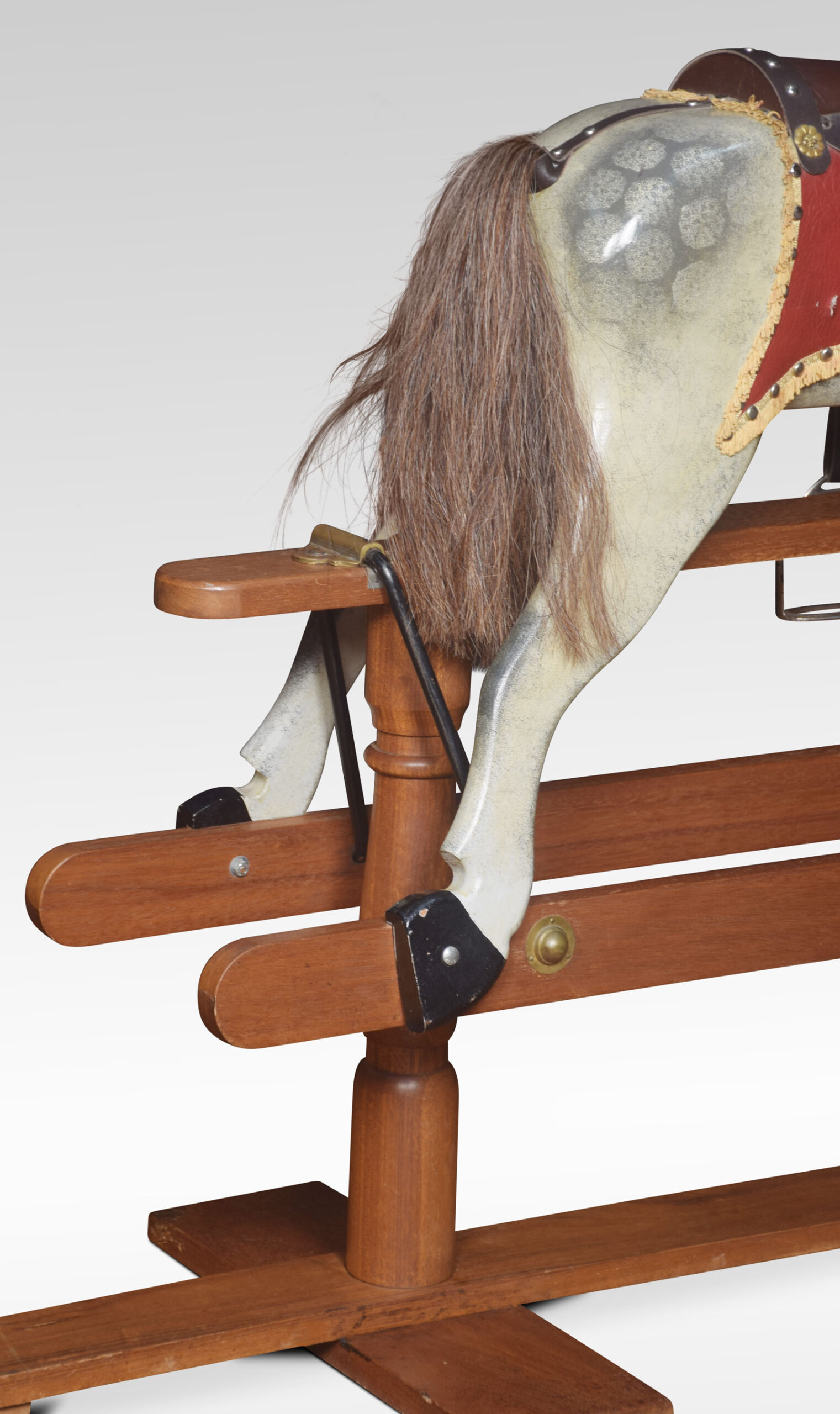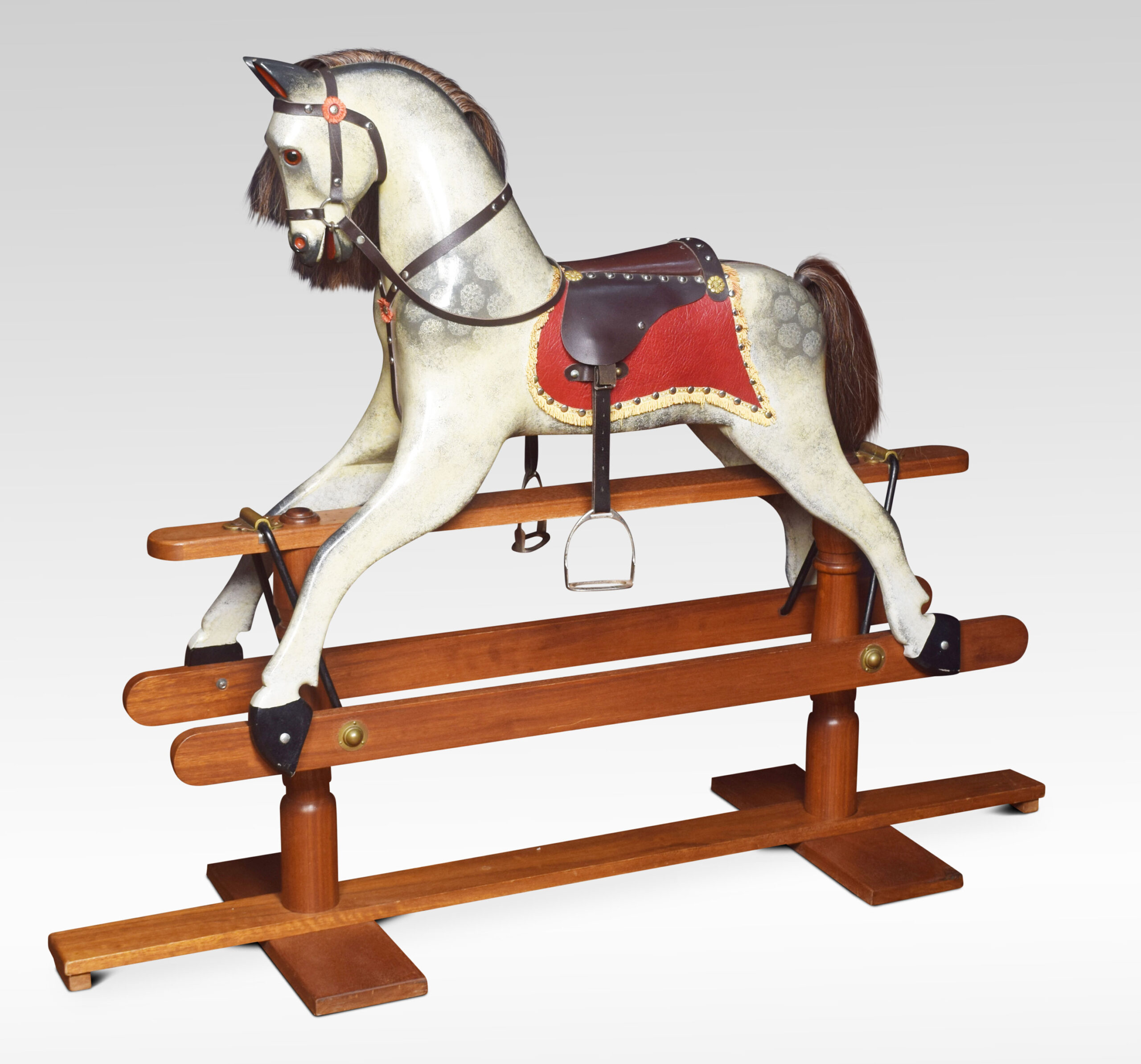 Carved and painted pine rocking horse with leather saddle and harness on trestle rocker.