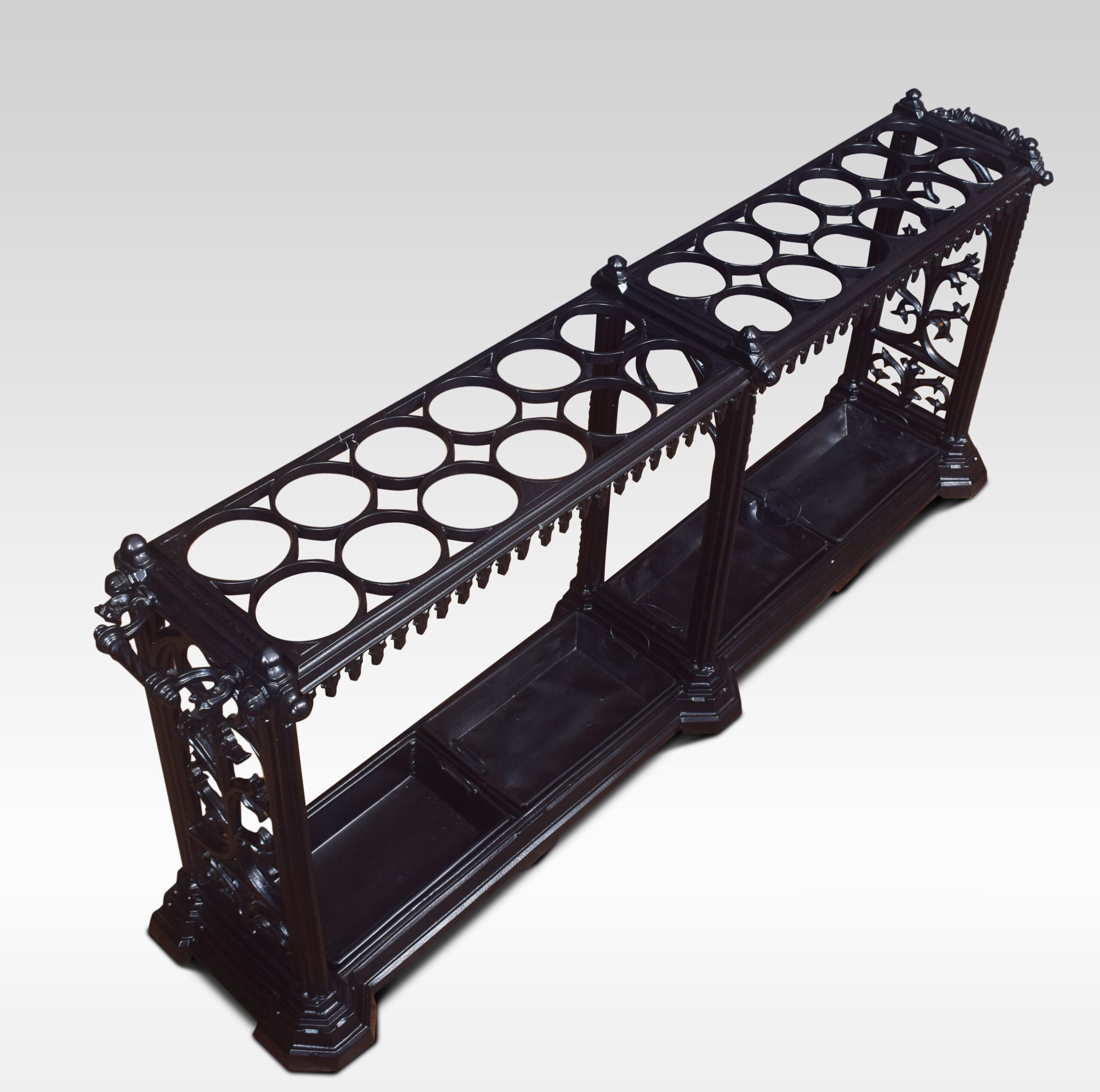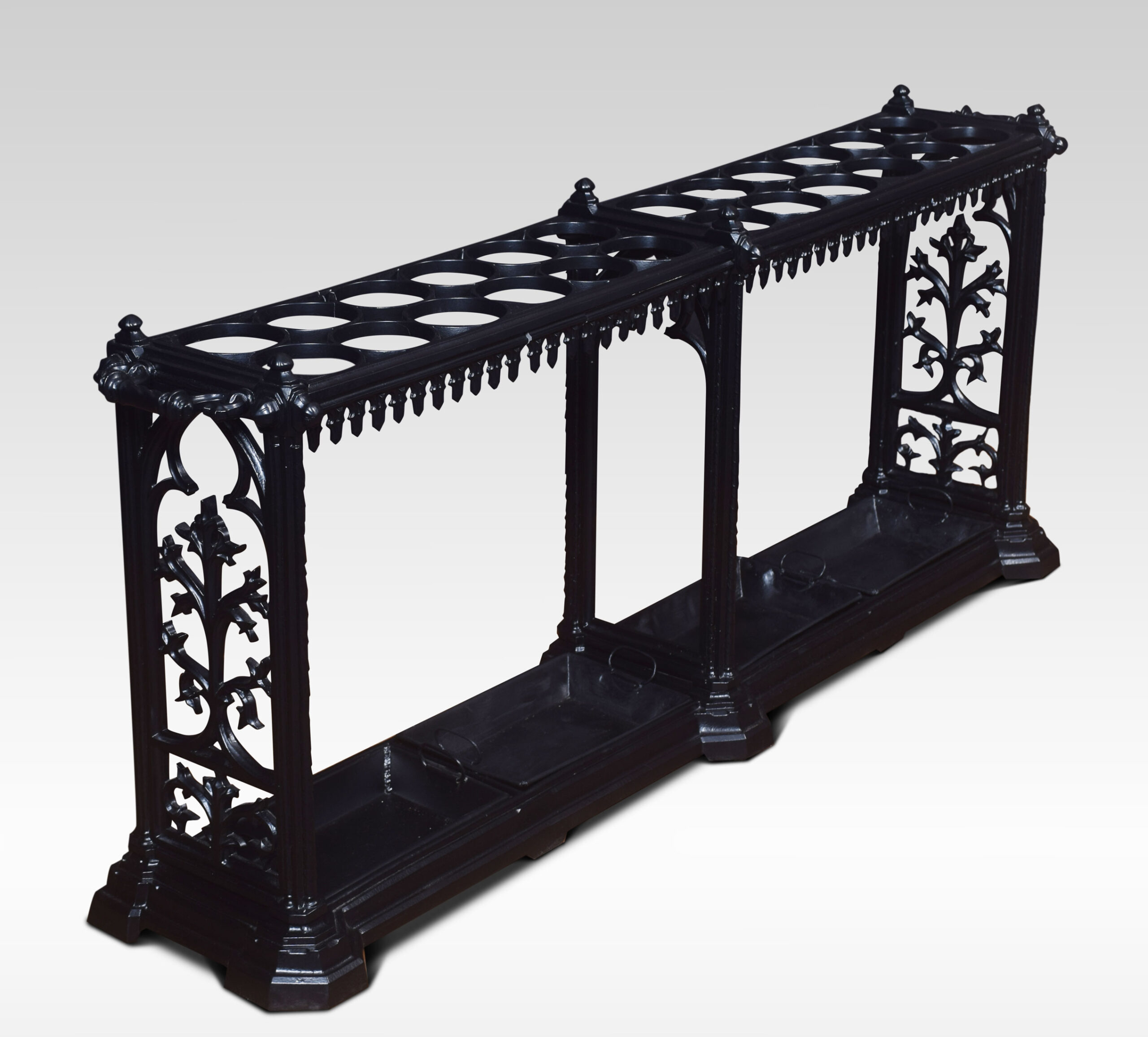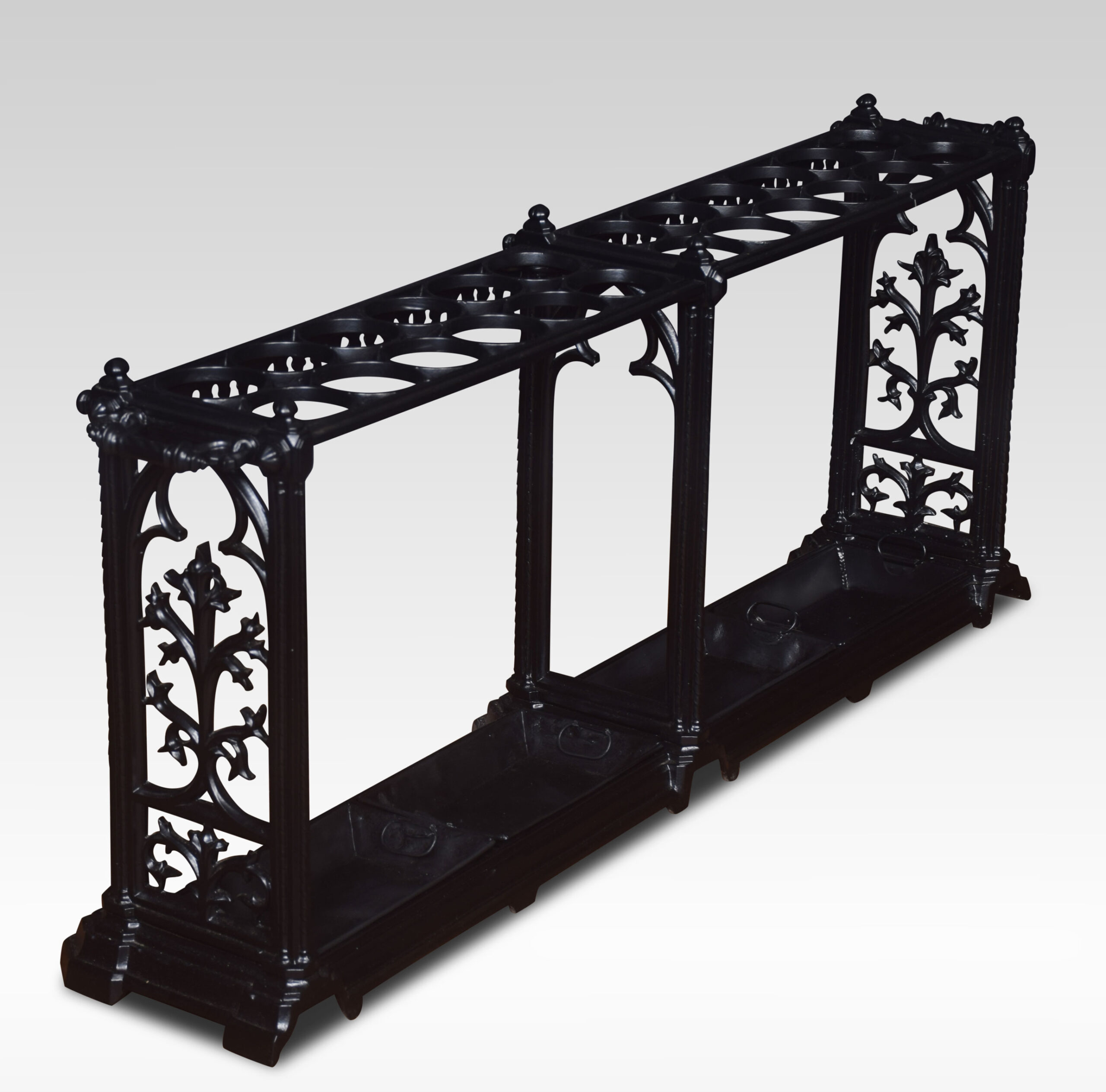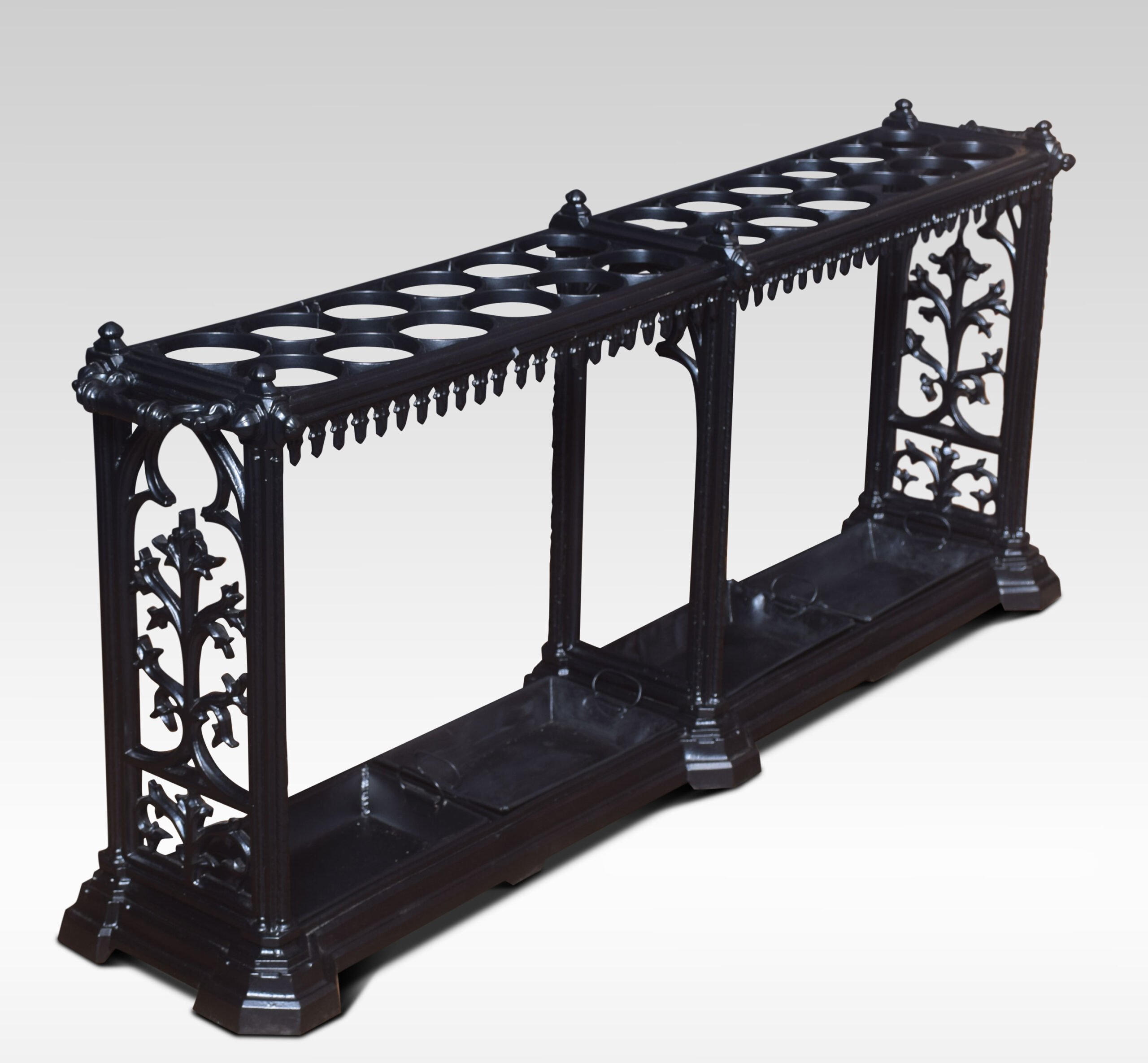 Cast iron twenty-four ring umbrella stand of rectangular form, with raised finials to each corner and circular apertures, the ends with foliated decoration above with drop-in drip trays and cast base.