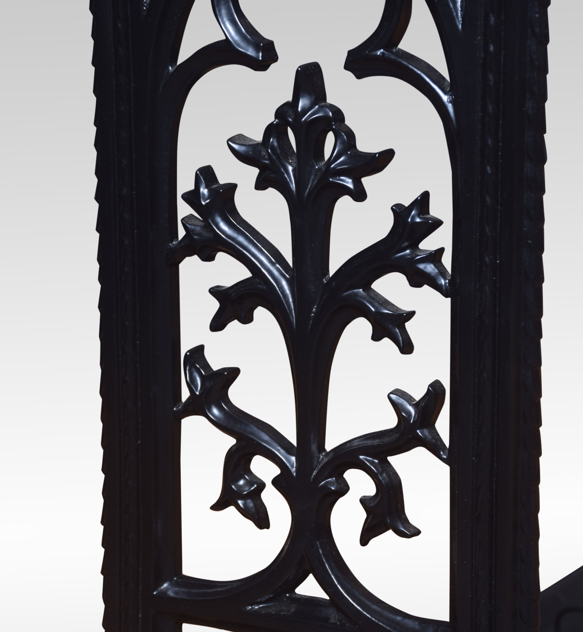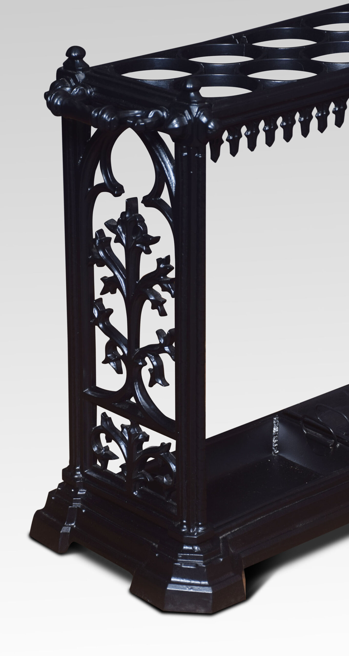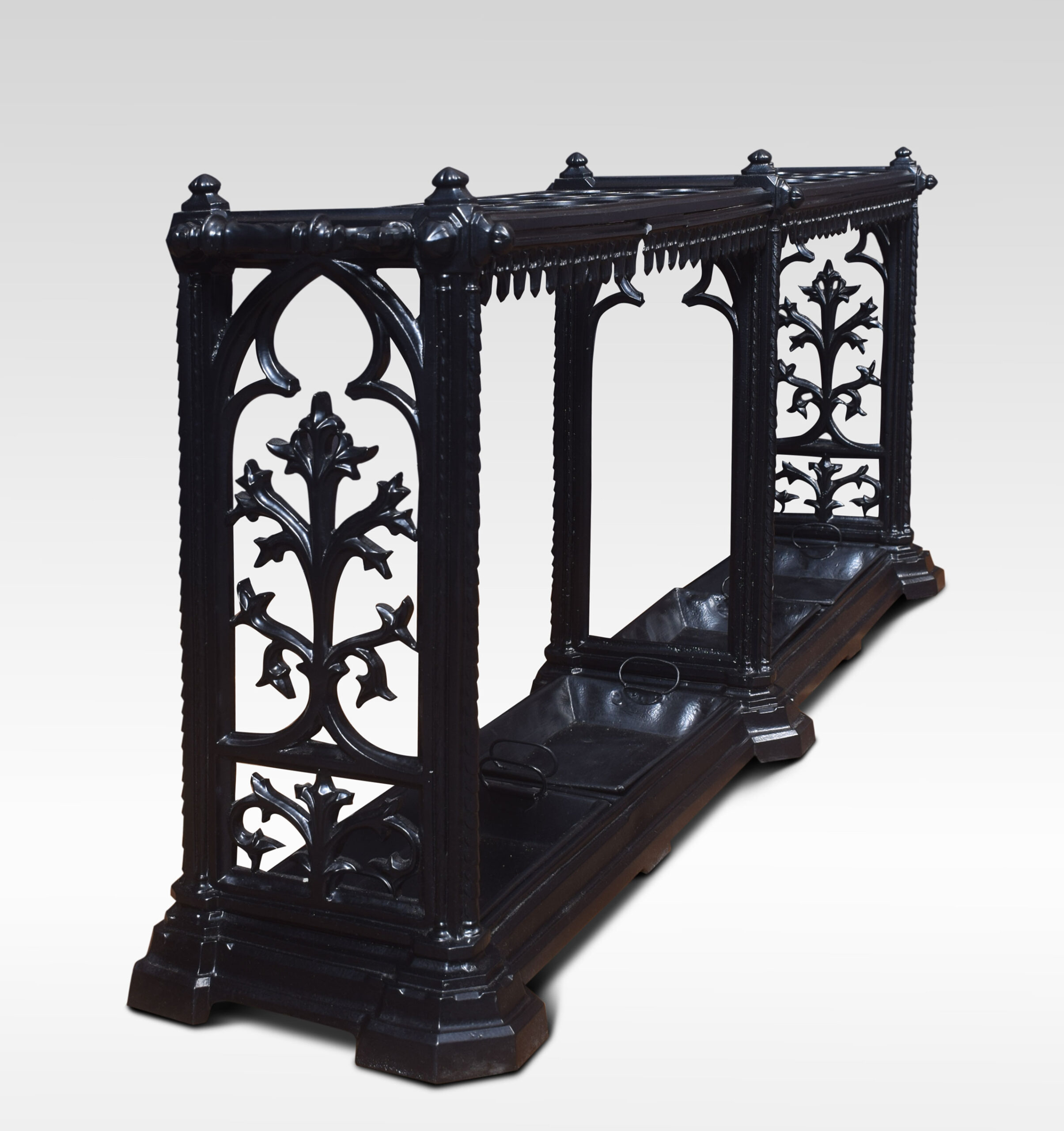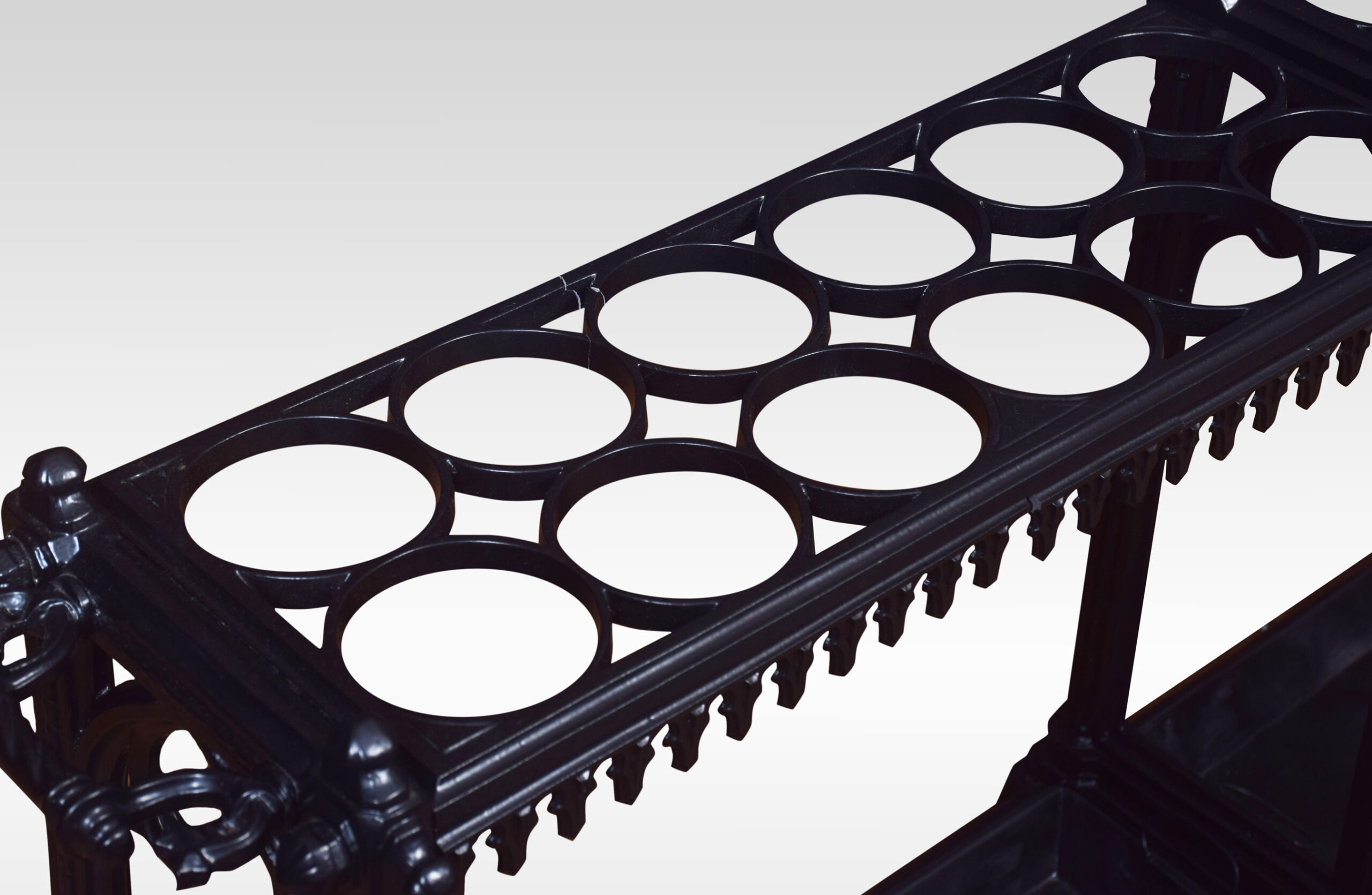 Cast iron twenty-four ring umbrella stand of rectangular form, with raised finials to each corner and circular apertures, the ends with foliated decoration above with drop-in drip trays and cast base.