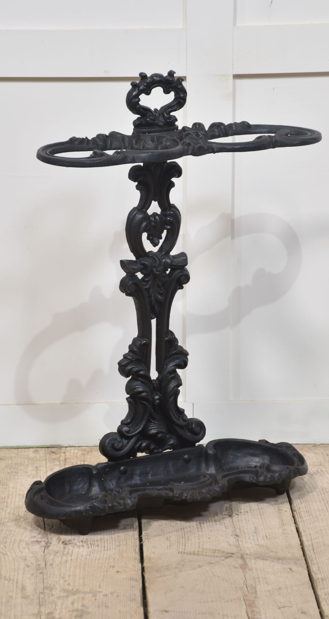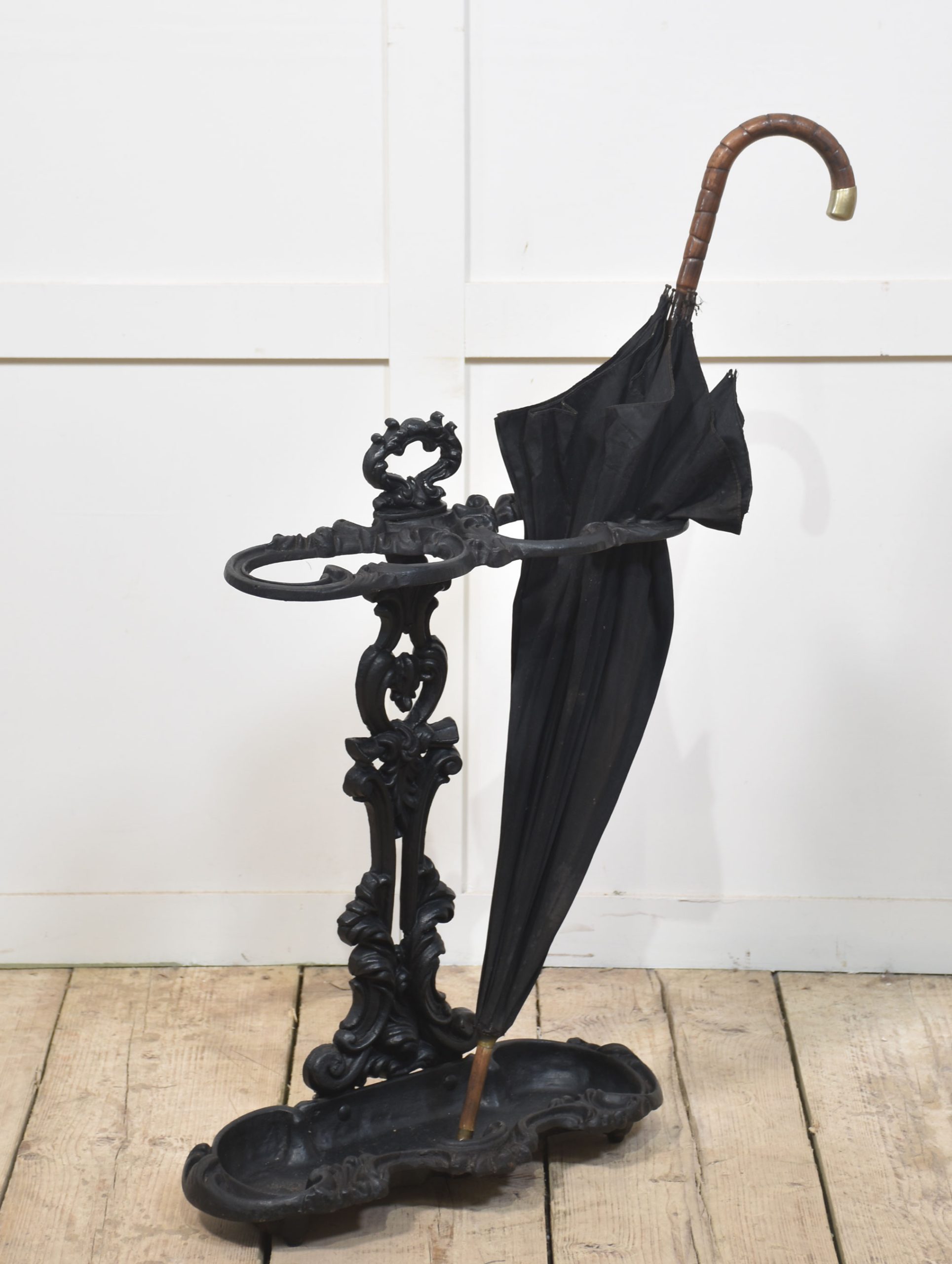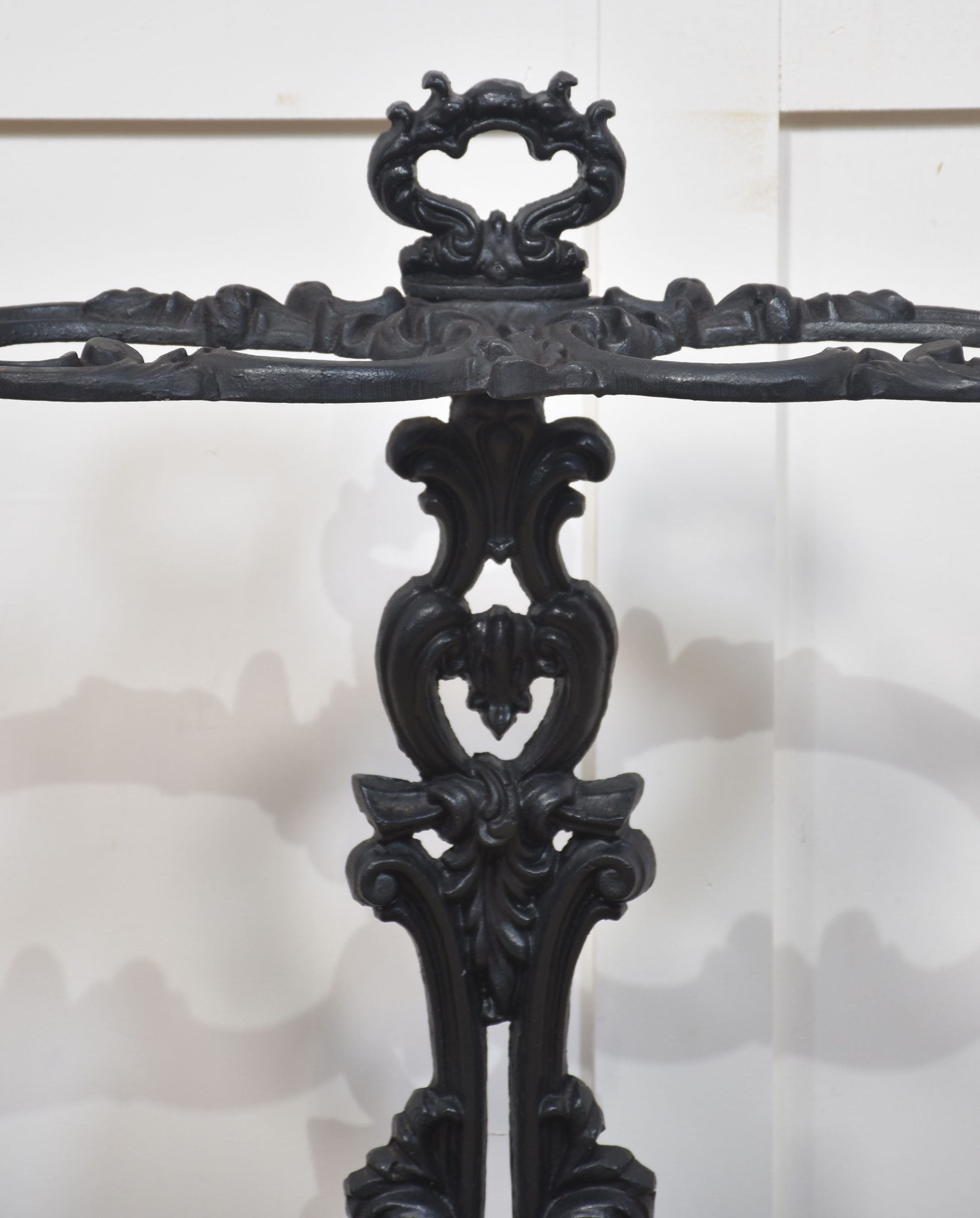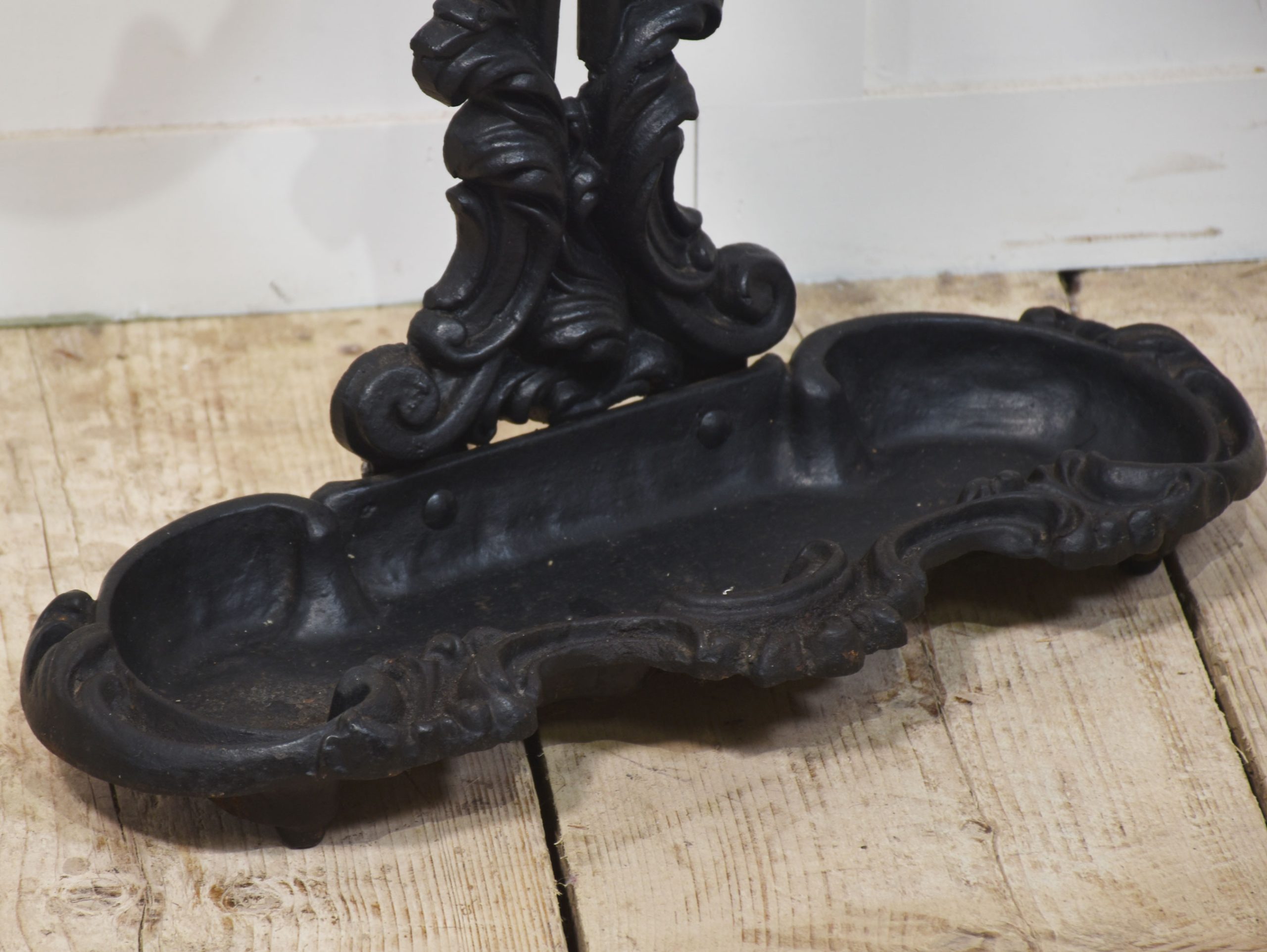 Cast Iron Umbrella Stand having pierced back with raised floral, leaf and scroll decoration having drip pan to the shaped base