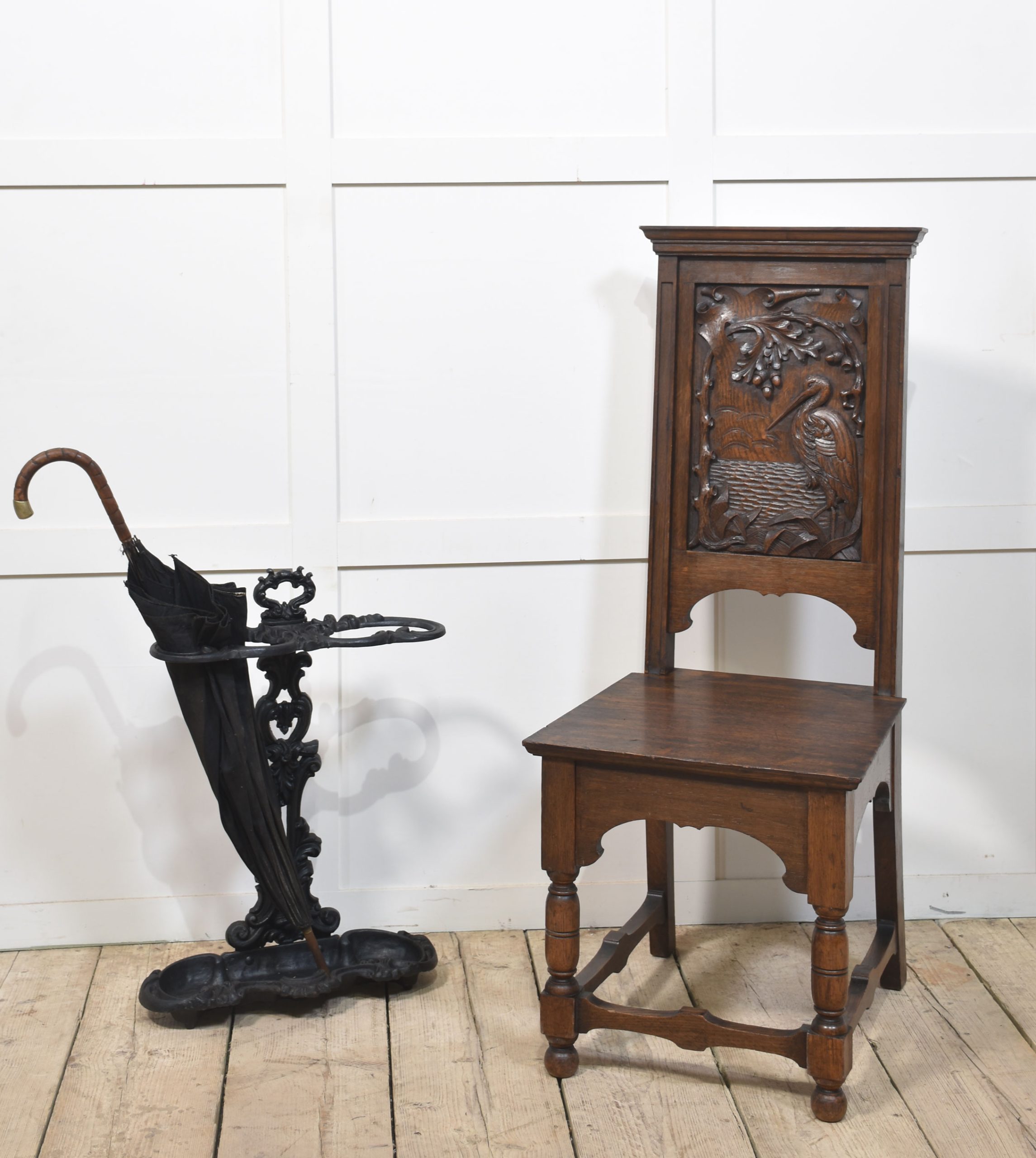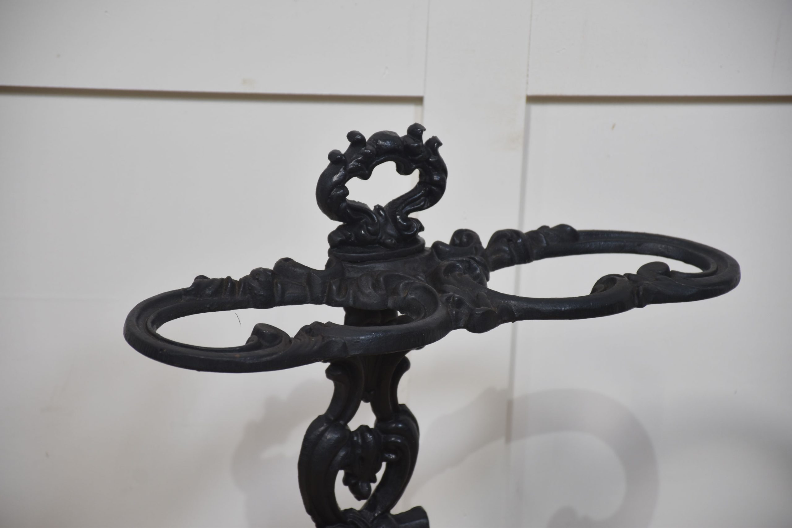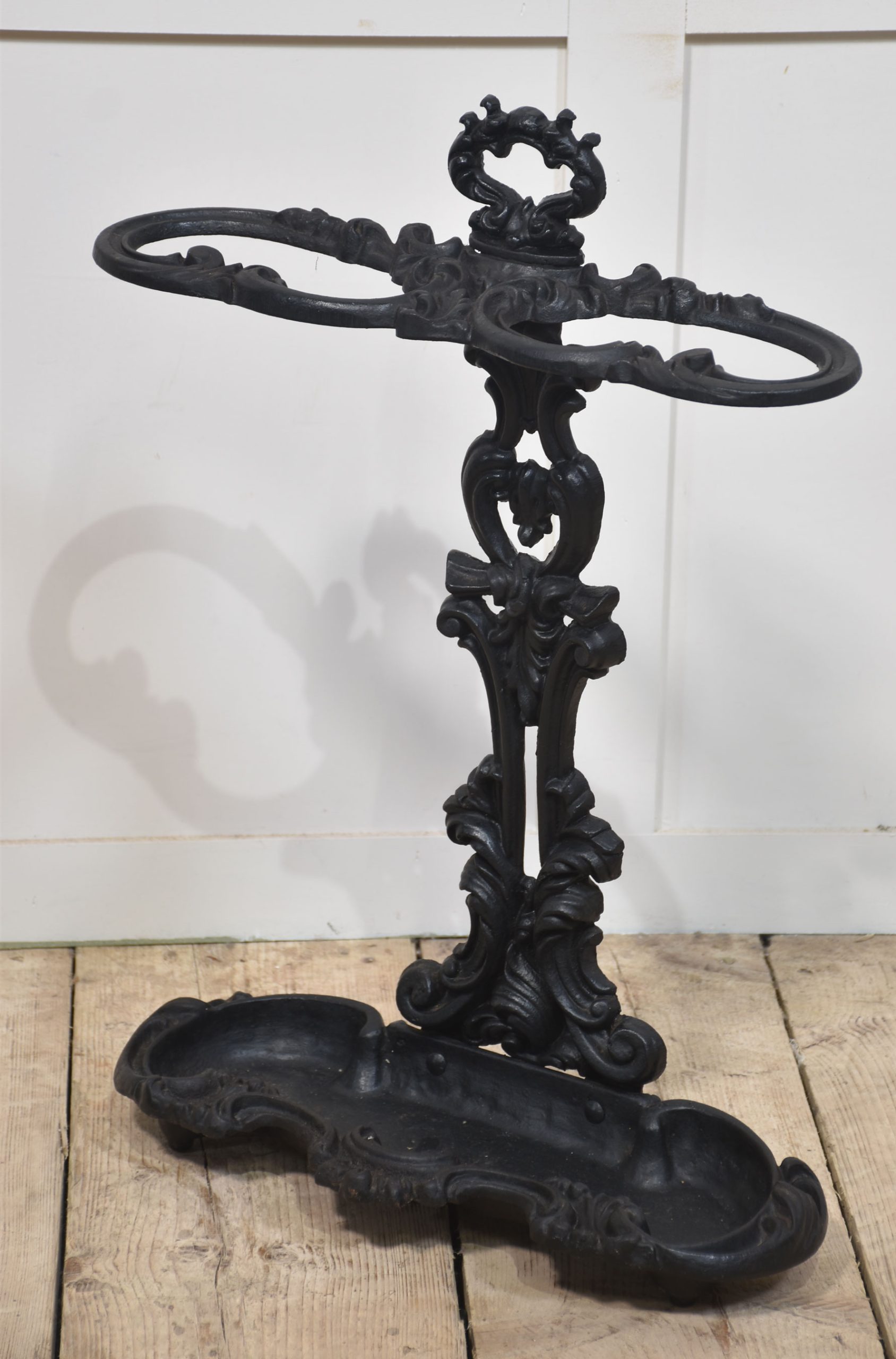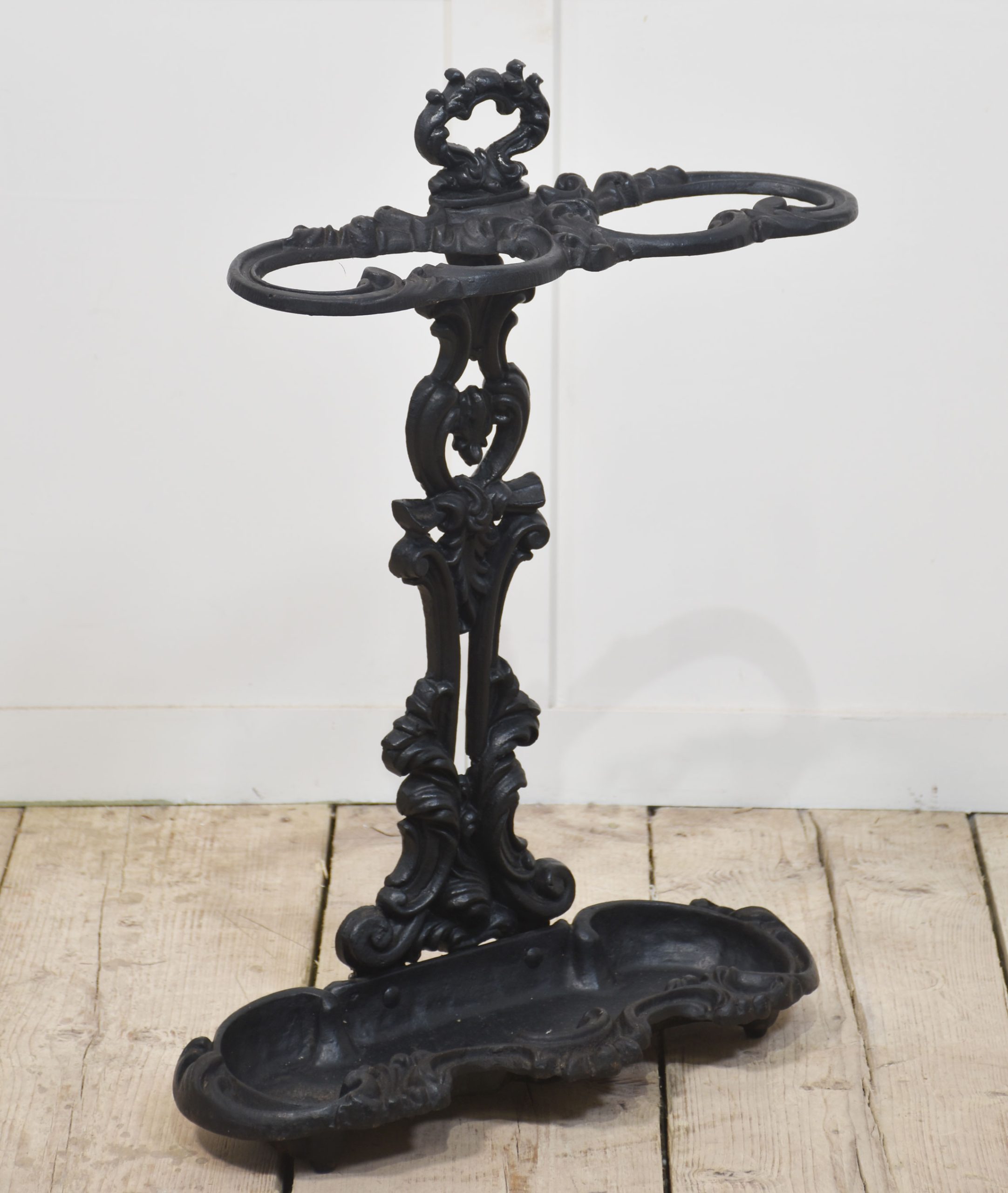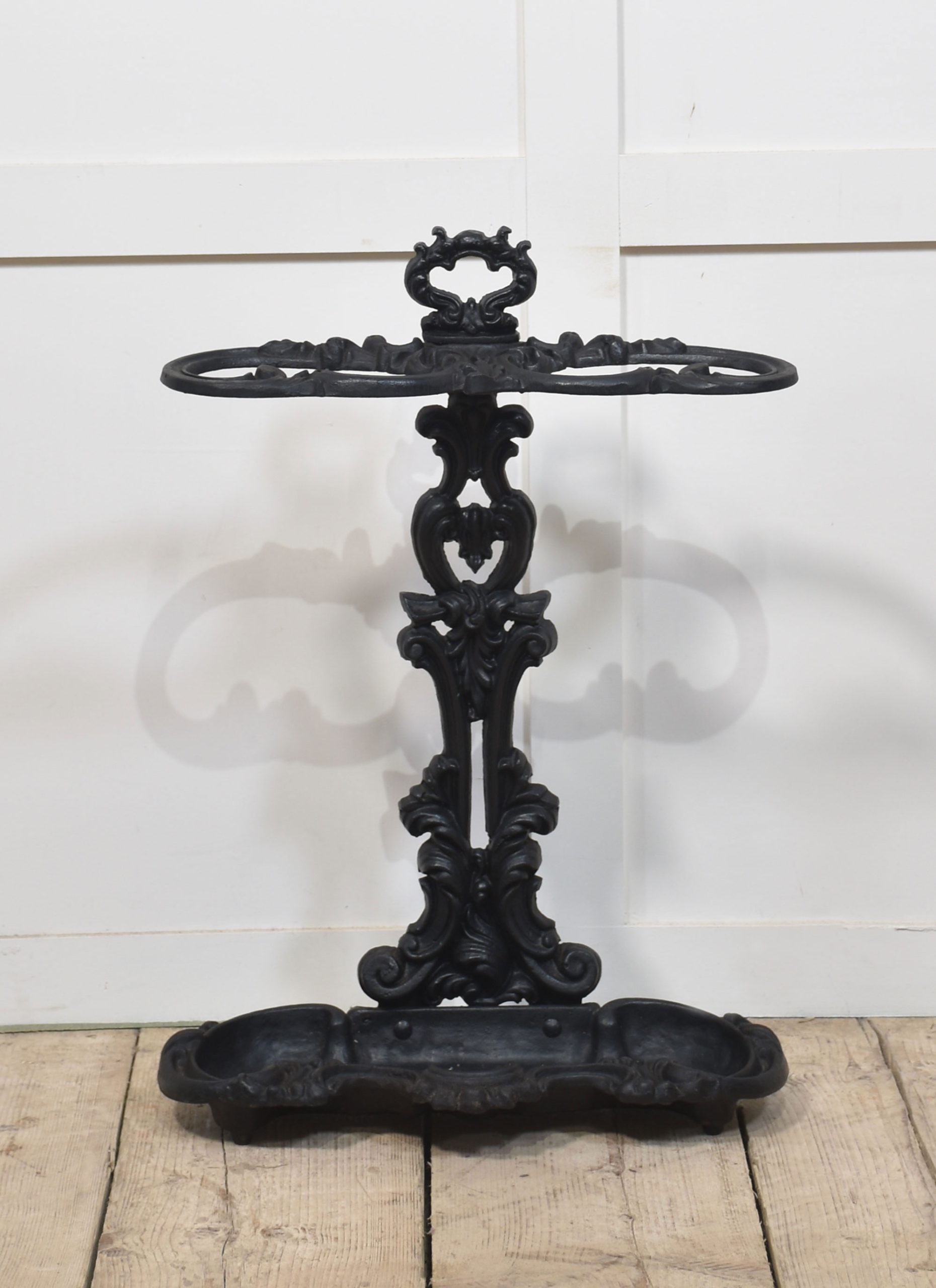 Cast Iron Umbrella Stand having pierced back with raised floral, leaf and scroll decoration having drip pan to the shaped base