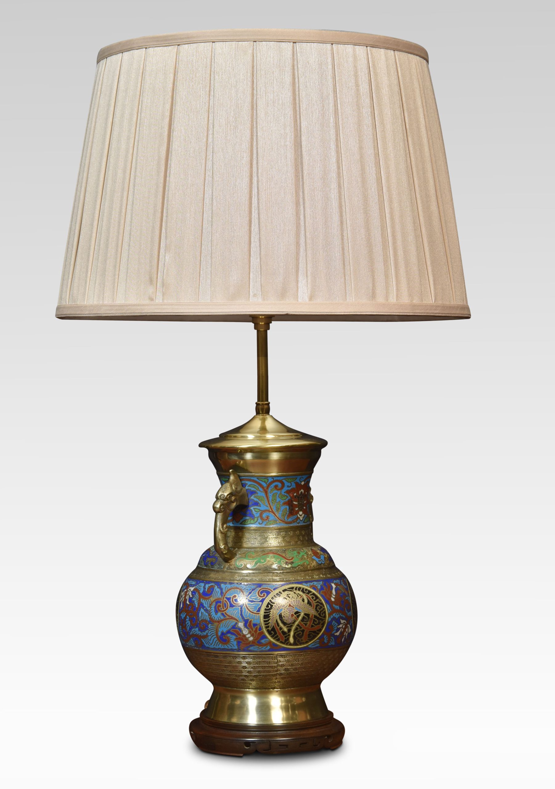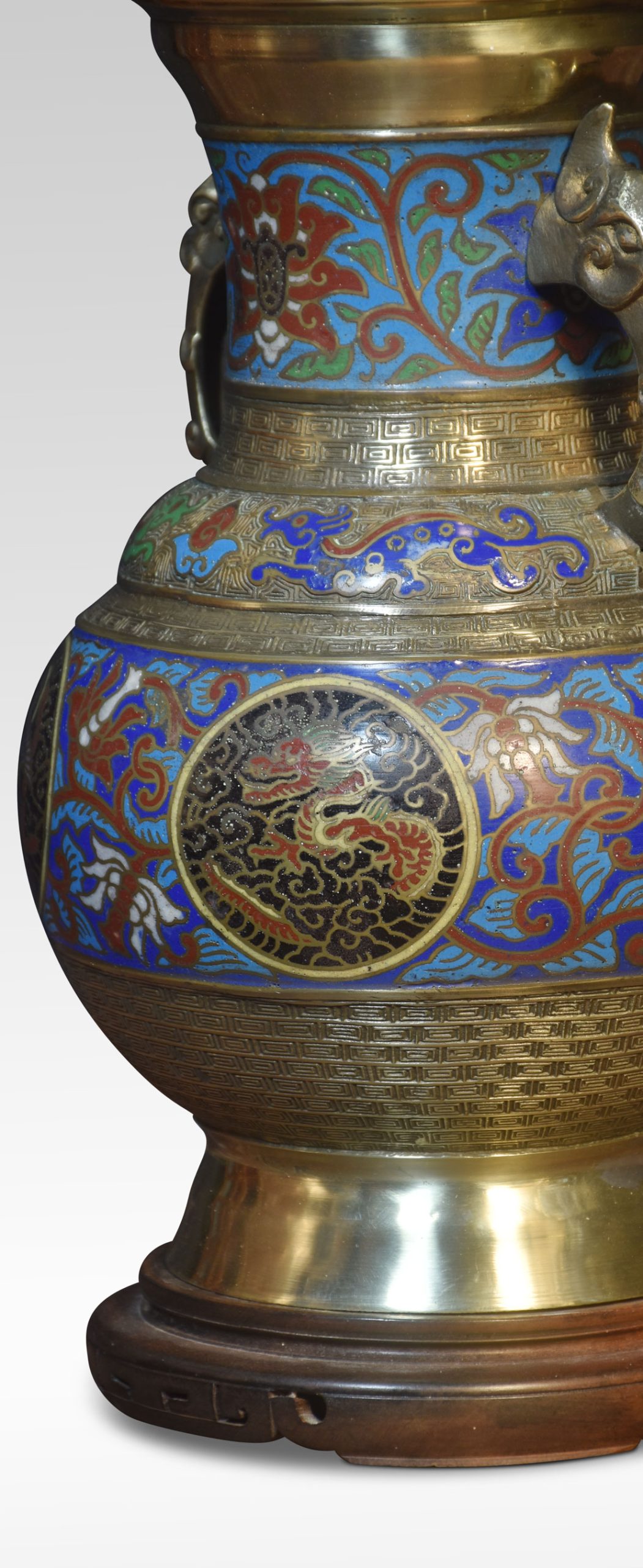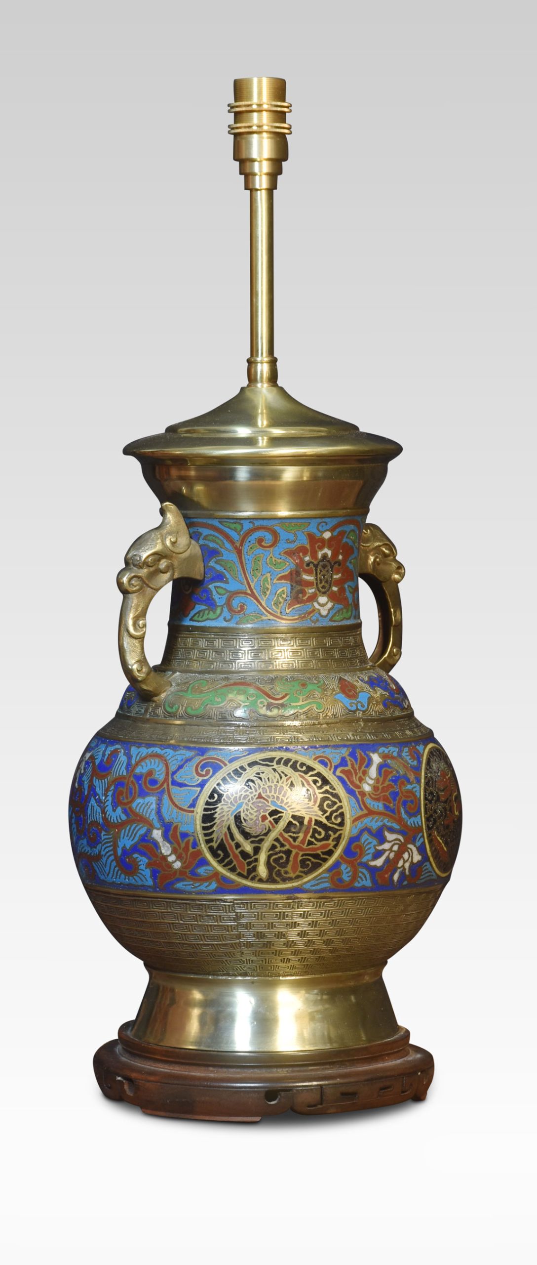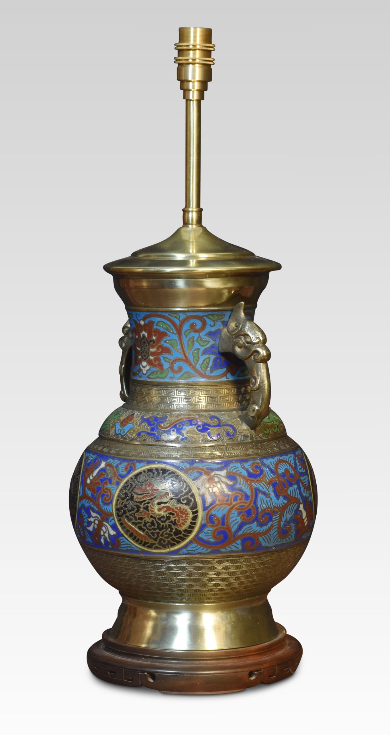 Chinese cloisonne twin-handled lamp base with panels of foliate motifs and roundels featuring dragons and phoenixes, between Greek key borders, the twin handles partially modelled with dragon heads. Raised up on pierced ebonies base.