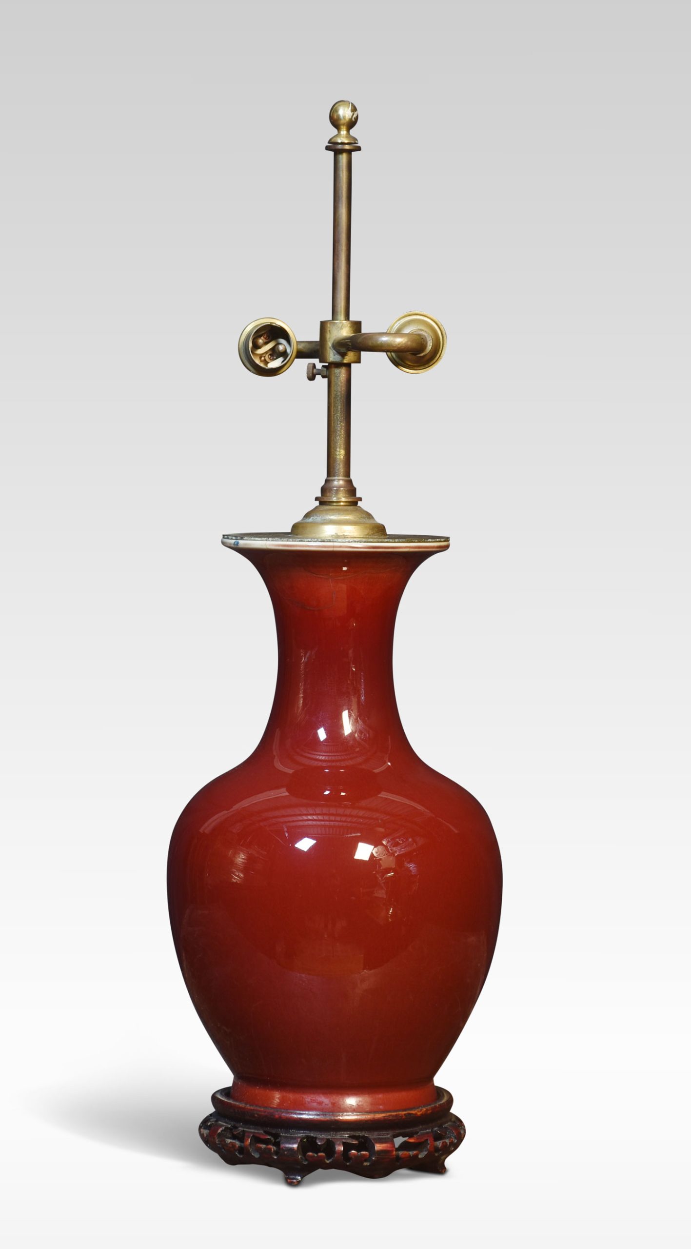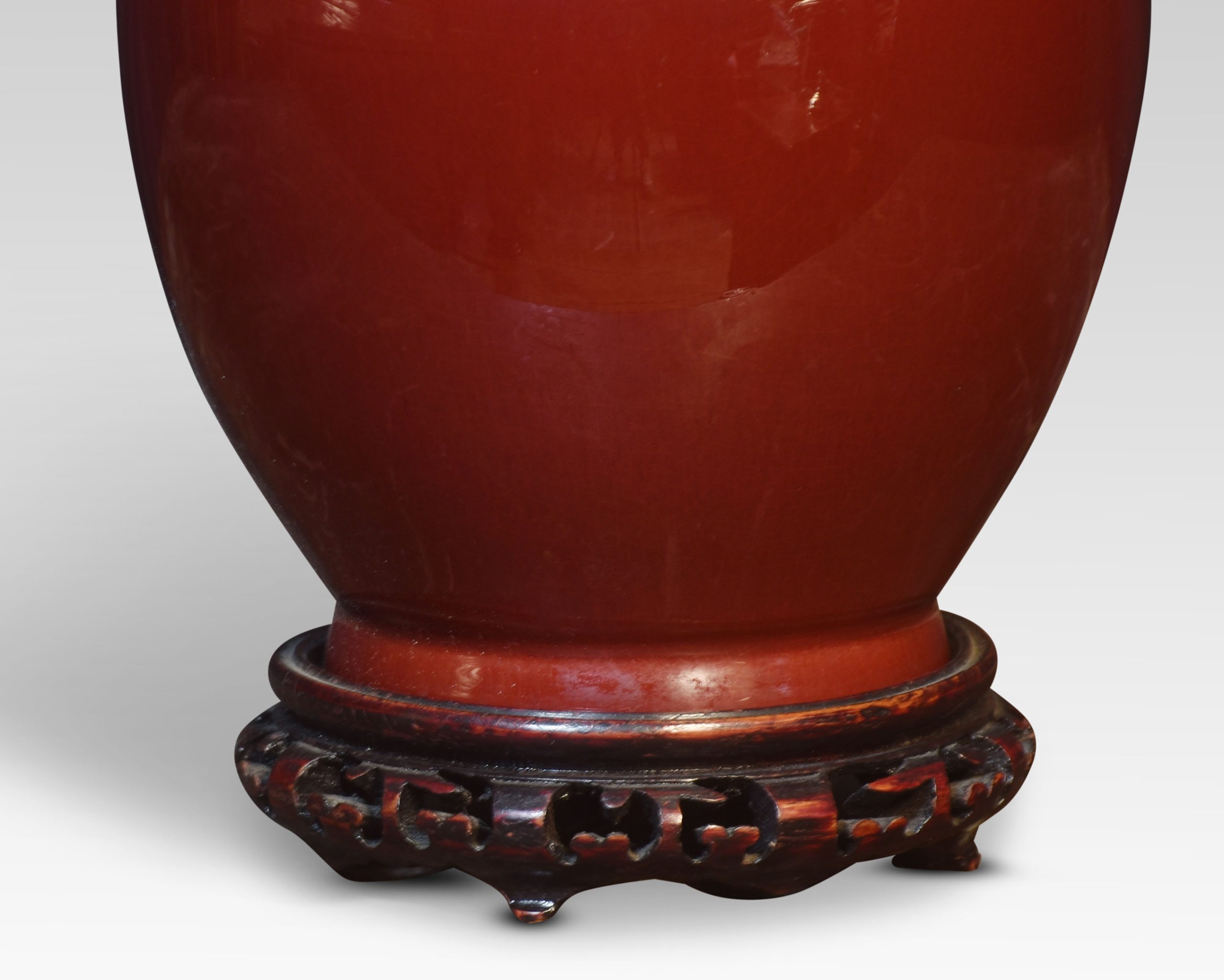 Chinese porcelain monochrome sang-de-boeuf baluster vase lamp, with carved and pierced wood base.