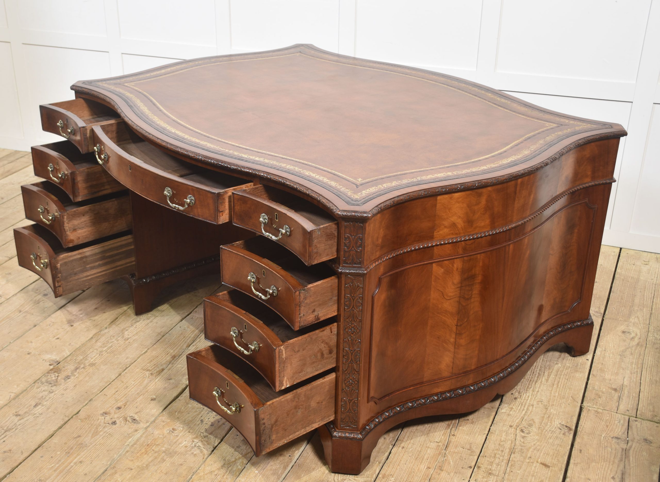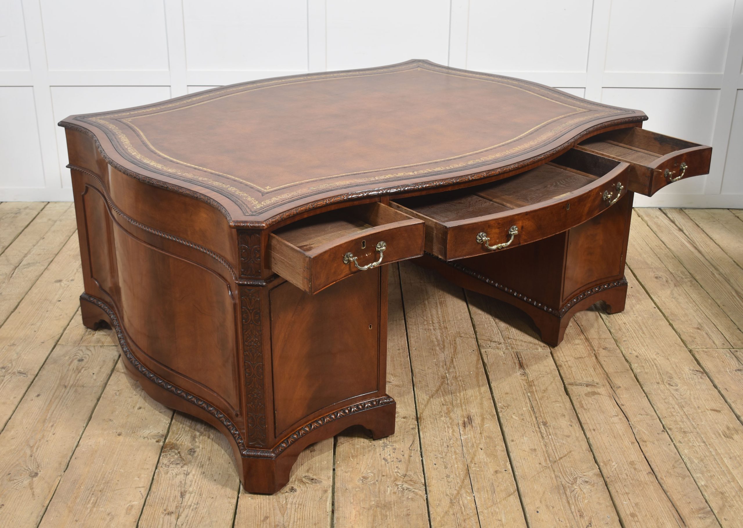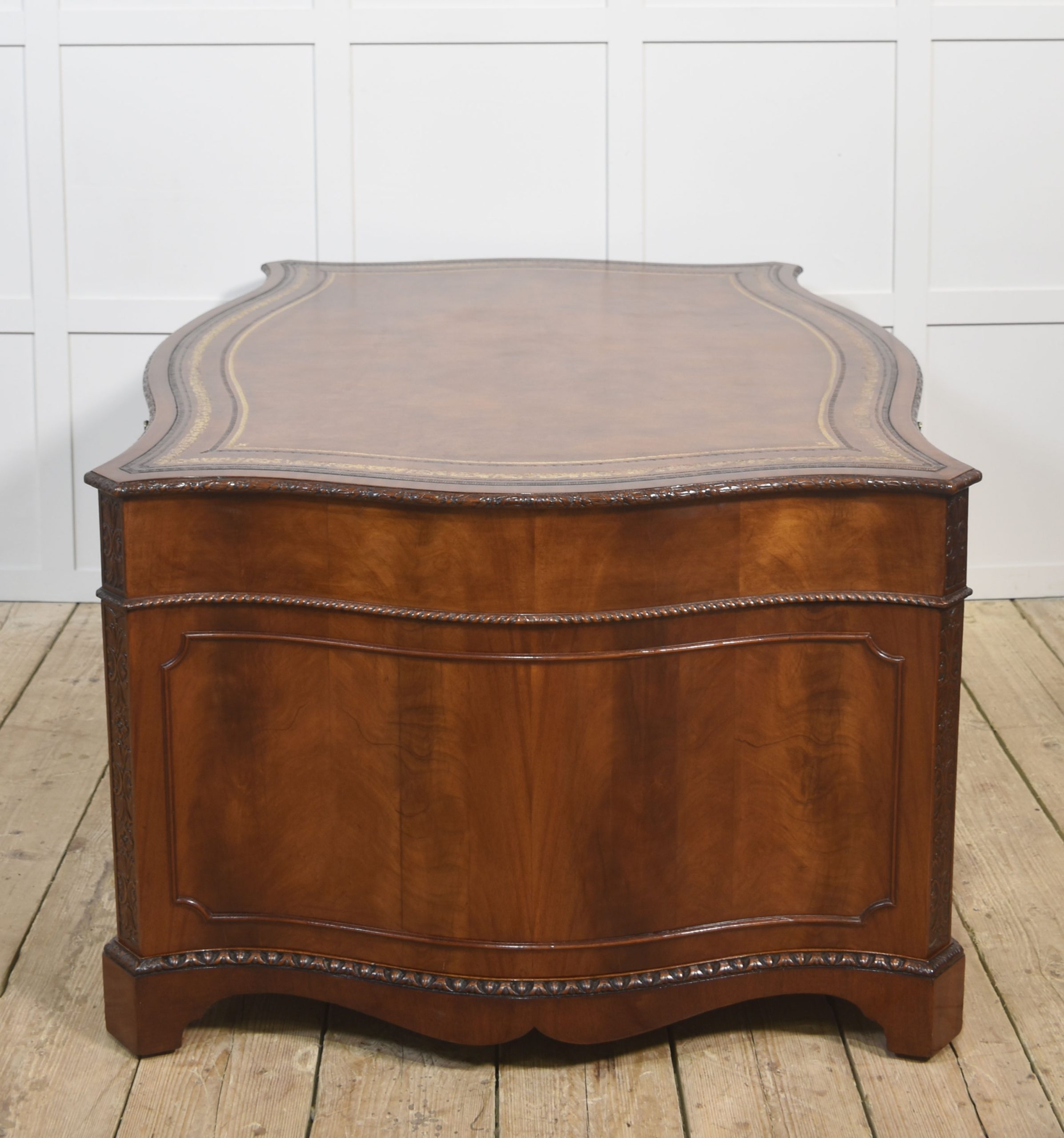 A finely crafted Chippendale Revival partner’s desk in rich mahogany, distinguished by its serpentine outline and elaborate carved ornamentation. The moulded edge encloses a gilt-tooled leather writing surface, the warm tones of which harmonise beautifully with the figured mahogany veneers.
