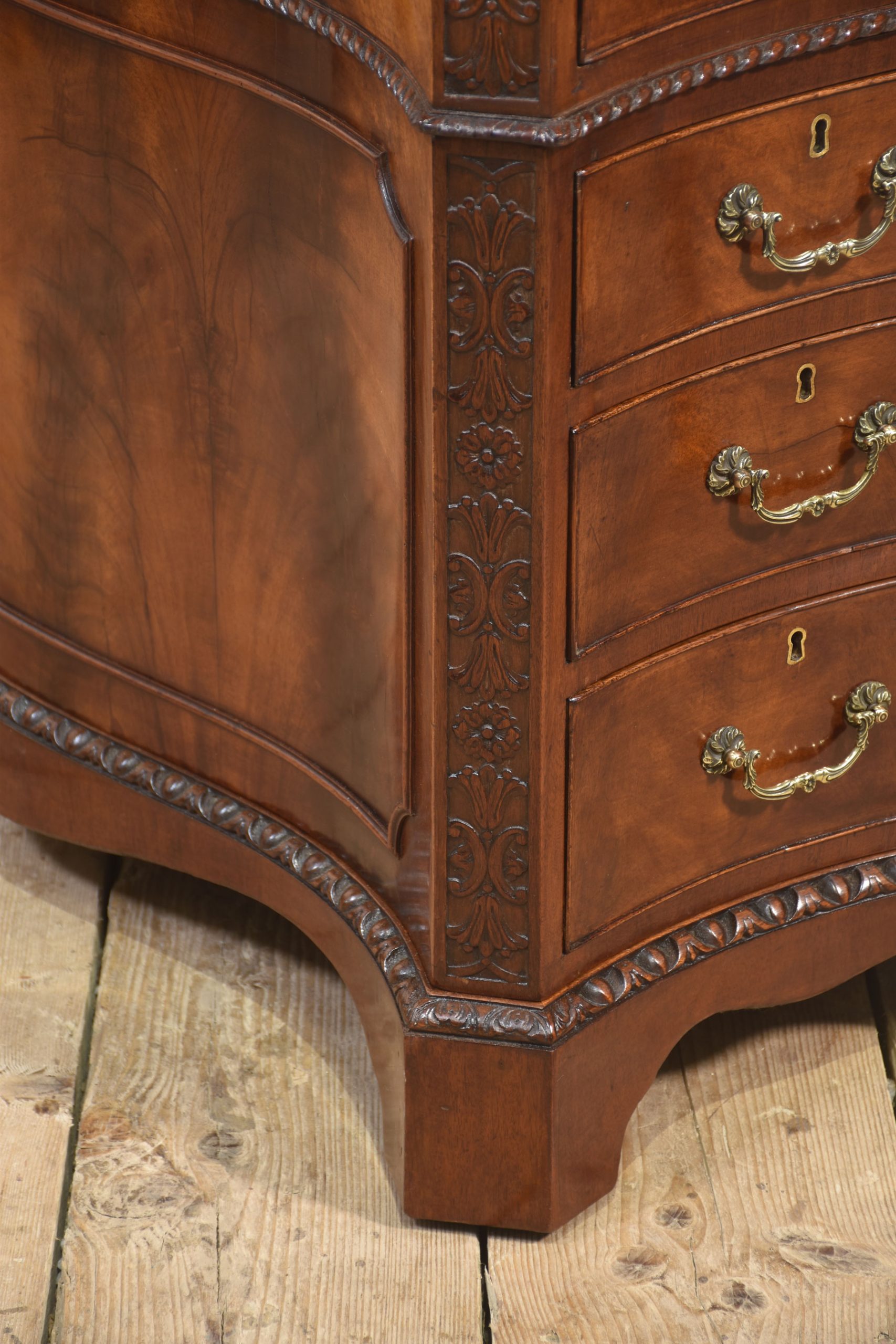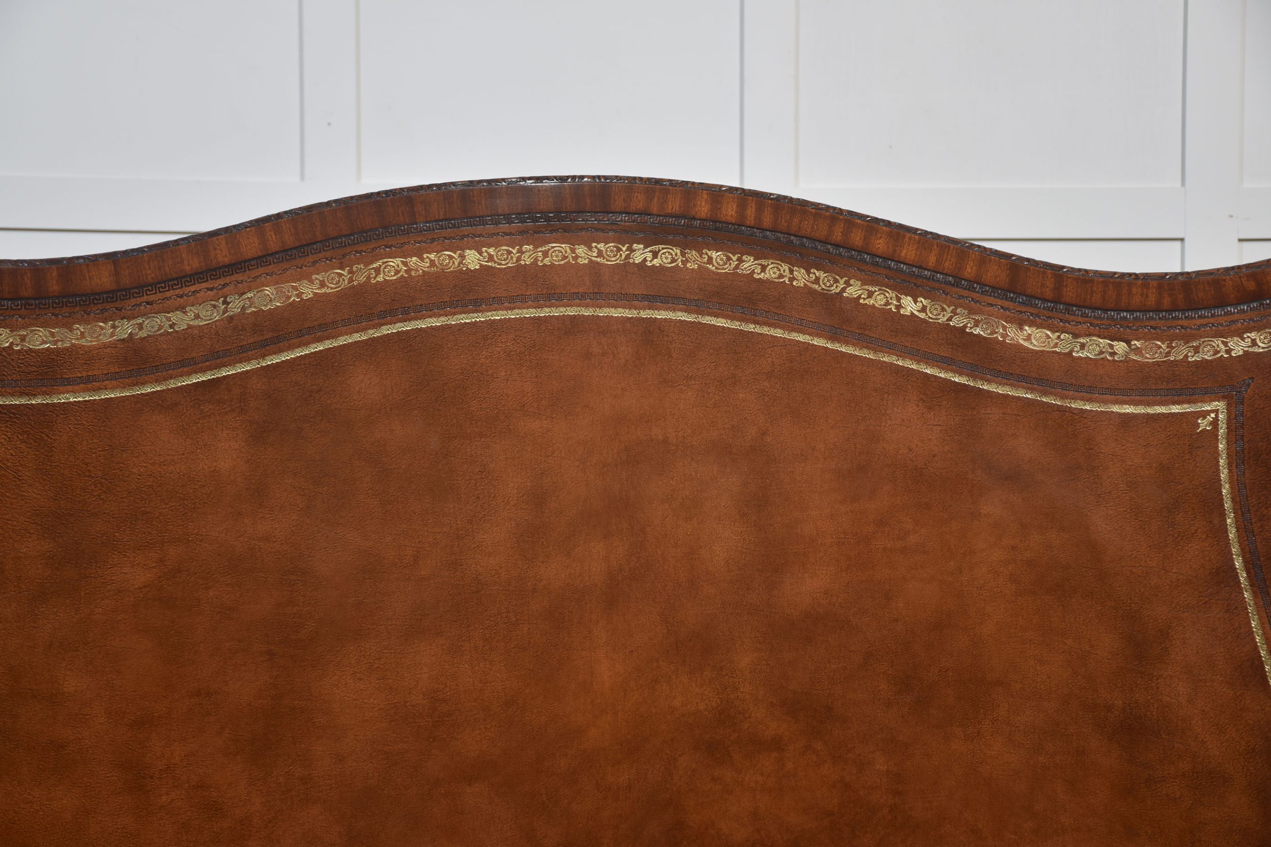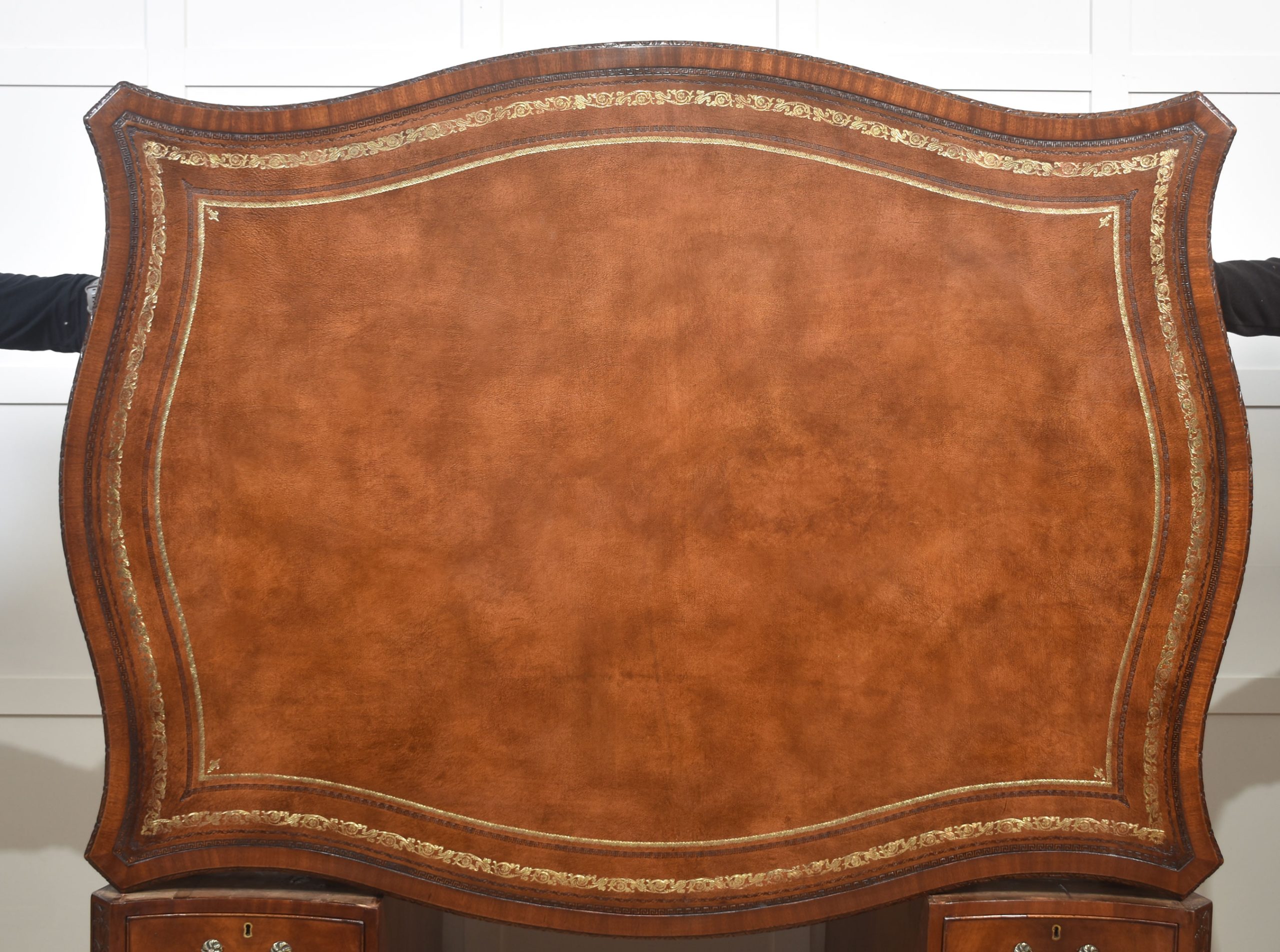 A finely crafted Chippendale Revival partner’s desk in rich mahogany, distinguished by its serpentine outline and elaborate carved ornamentation. The moulded edge encloses a gilt-tooled leather writing surface, the warm tones of which harmonise beautifully with the figured mahogany veneers.