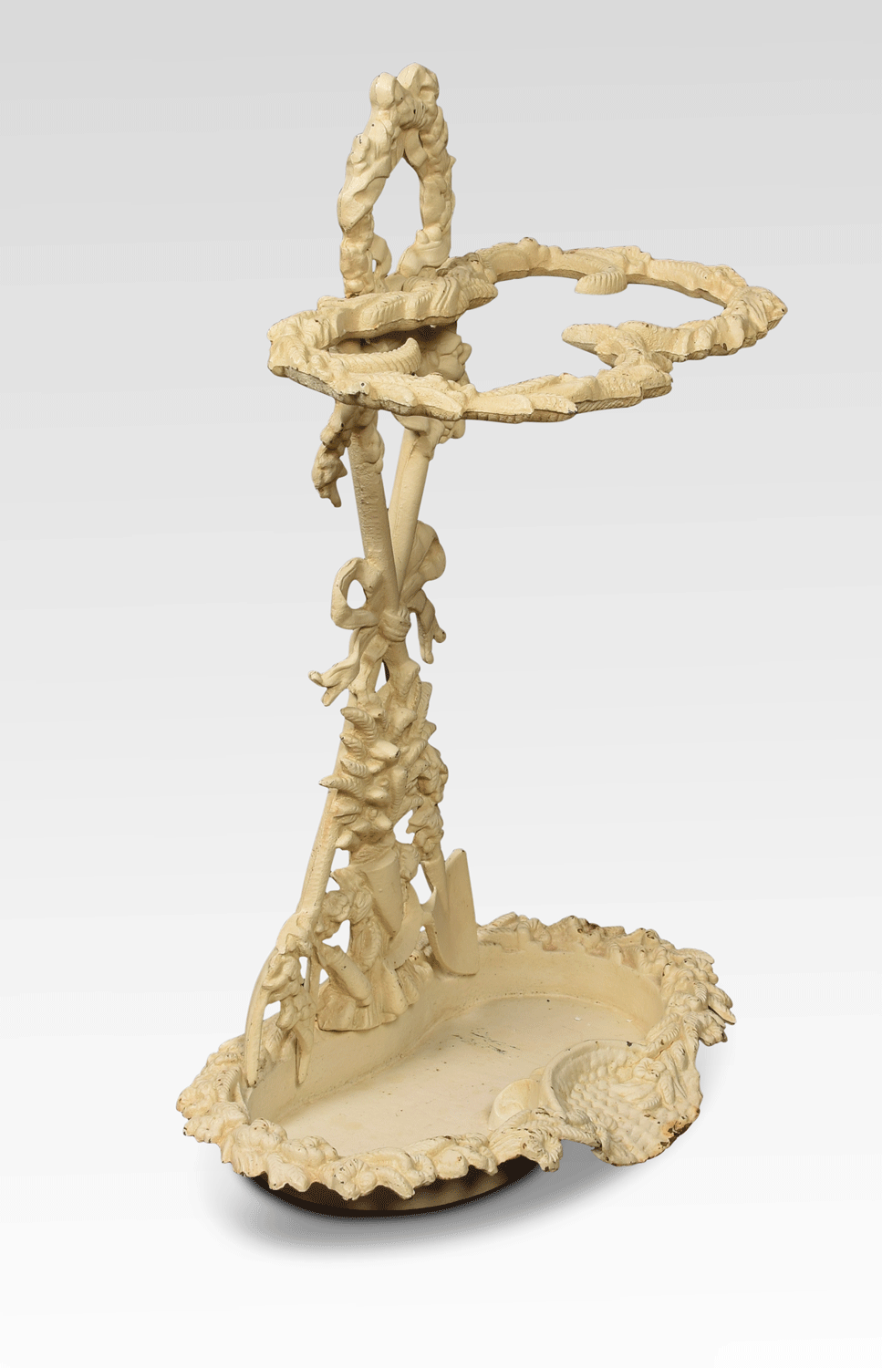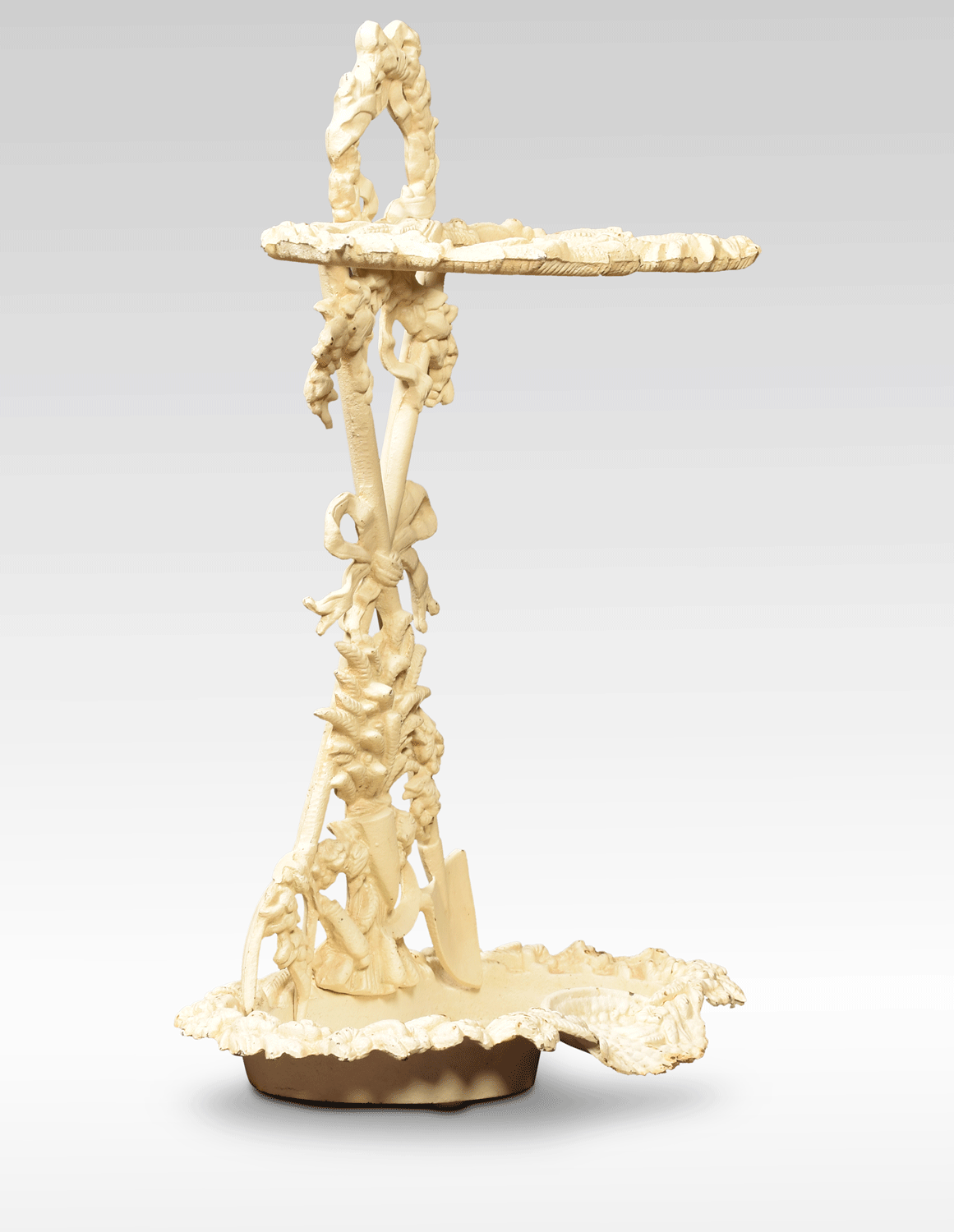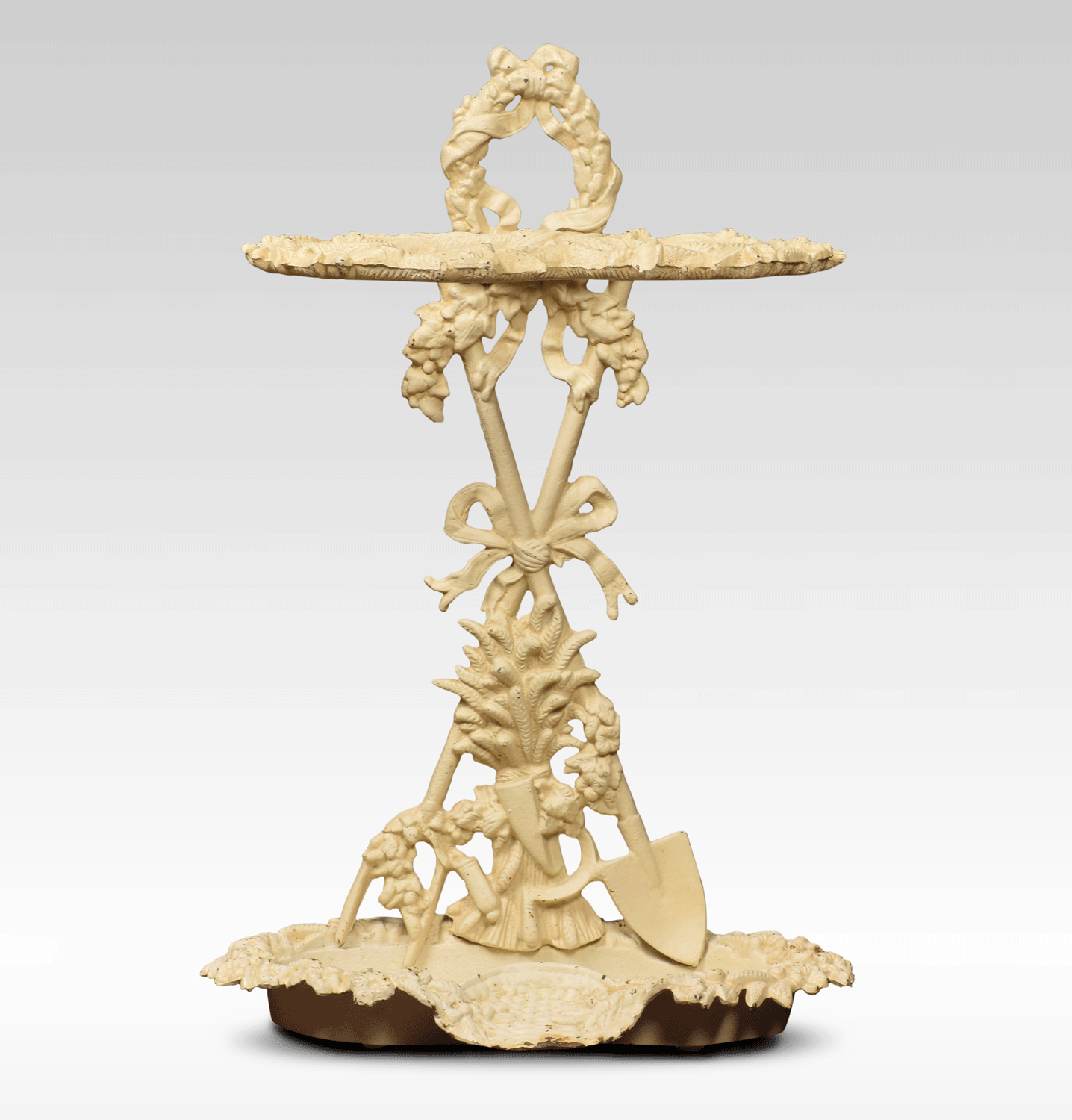 Coalbrookdale style painted cast iron umbrella / stick stand with decorative bows and garlands and drip tray to the base.