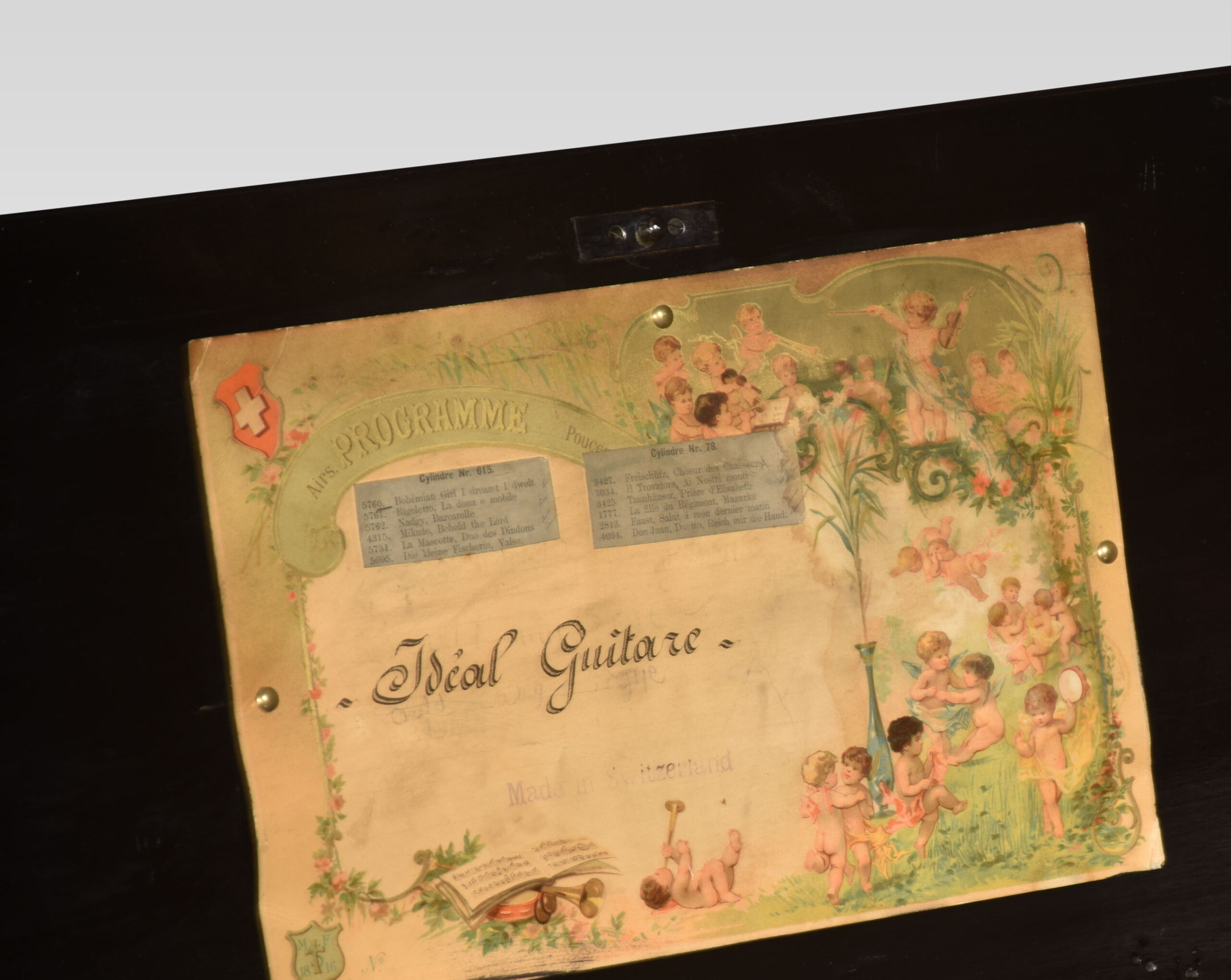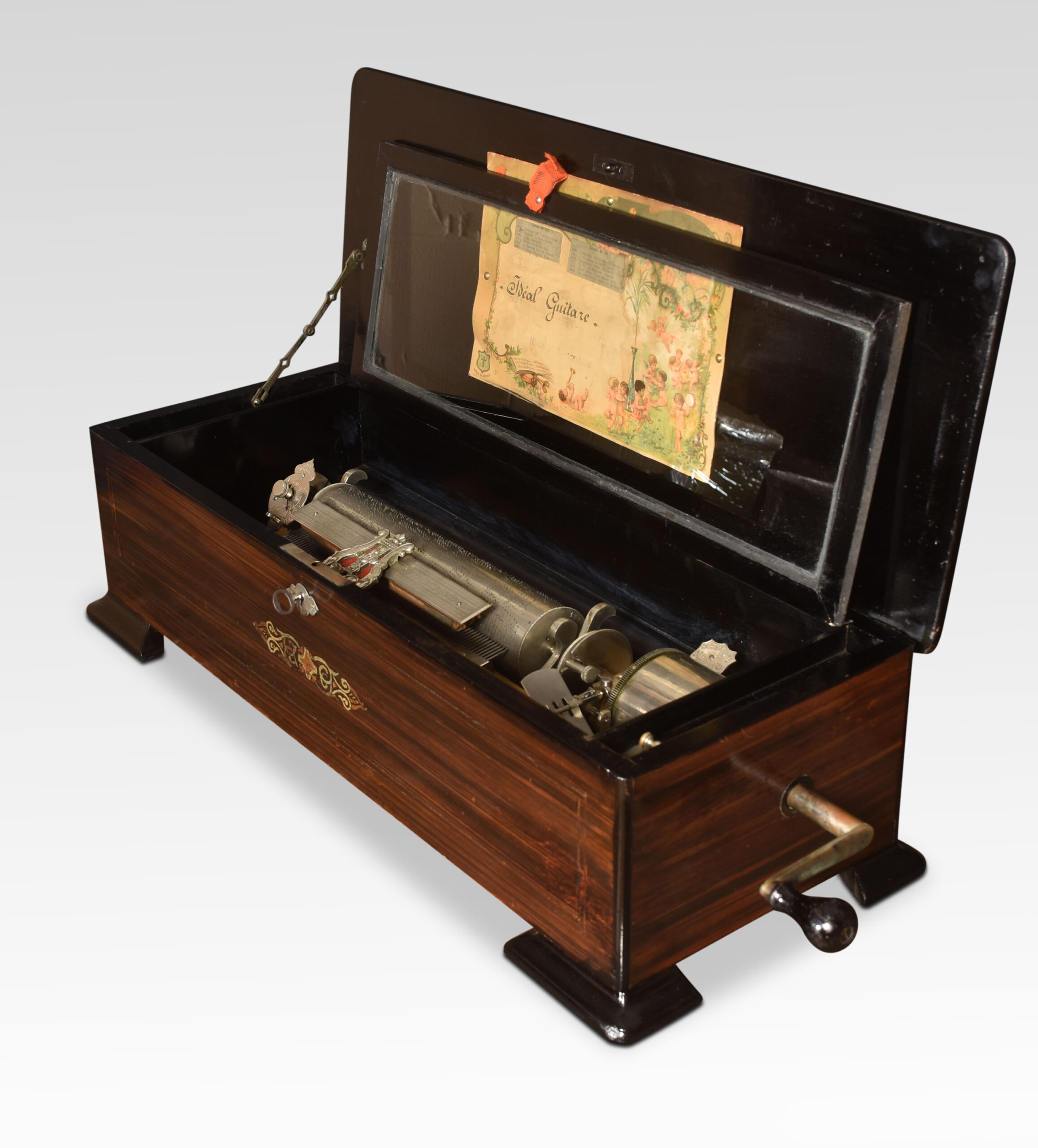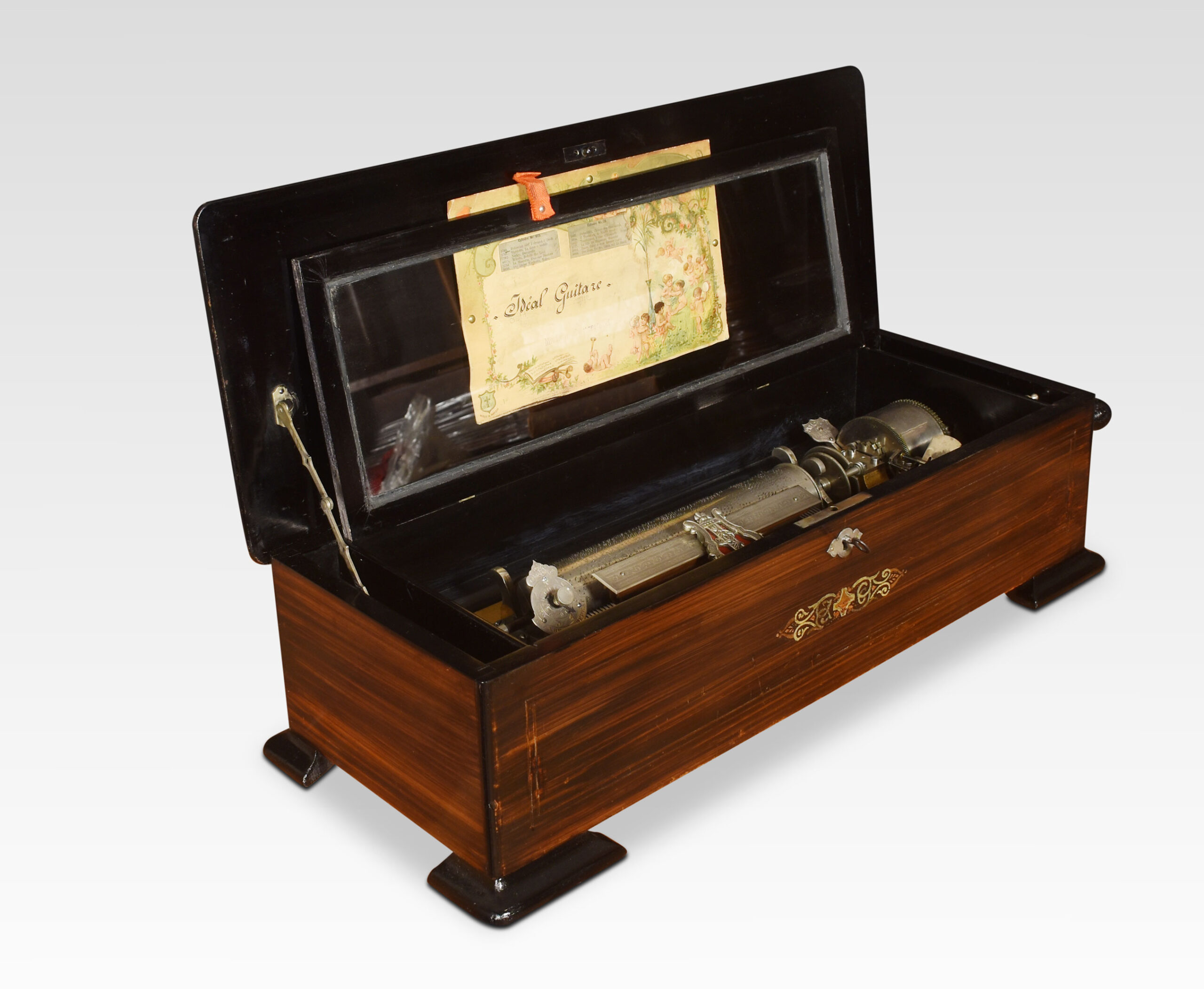 Swis music box with original tune sheet, cylinder, comb and the brass bed plate, within a rosewood case, the lid inlaid with boxwood lines and a central motif.