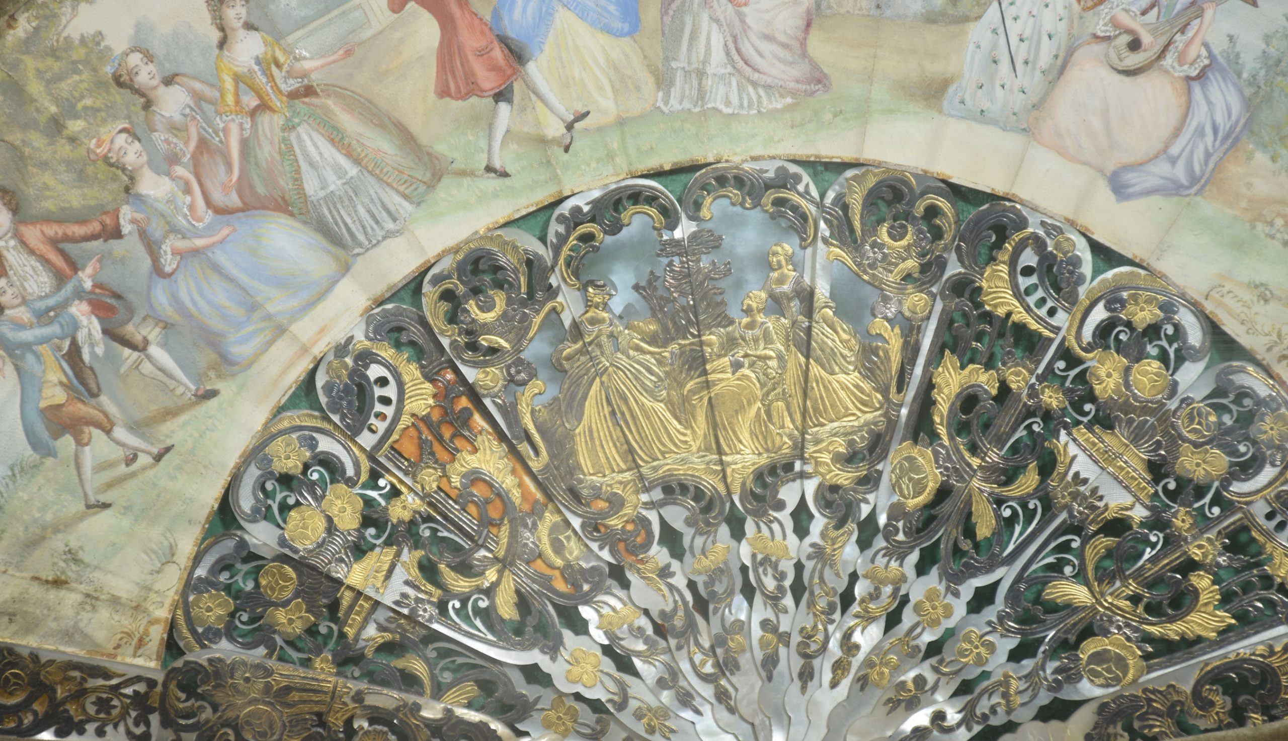 The fan’s guards and sticks are intricately pierced and decorated with scrolling foliate and floral motifs highlighted with polychrome and gilded accents. At the center, a gilt cartouche with classical figures is surrounded by elaborate ornamental designs.