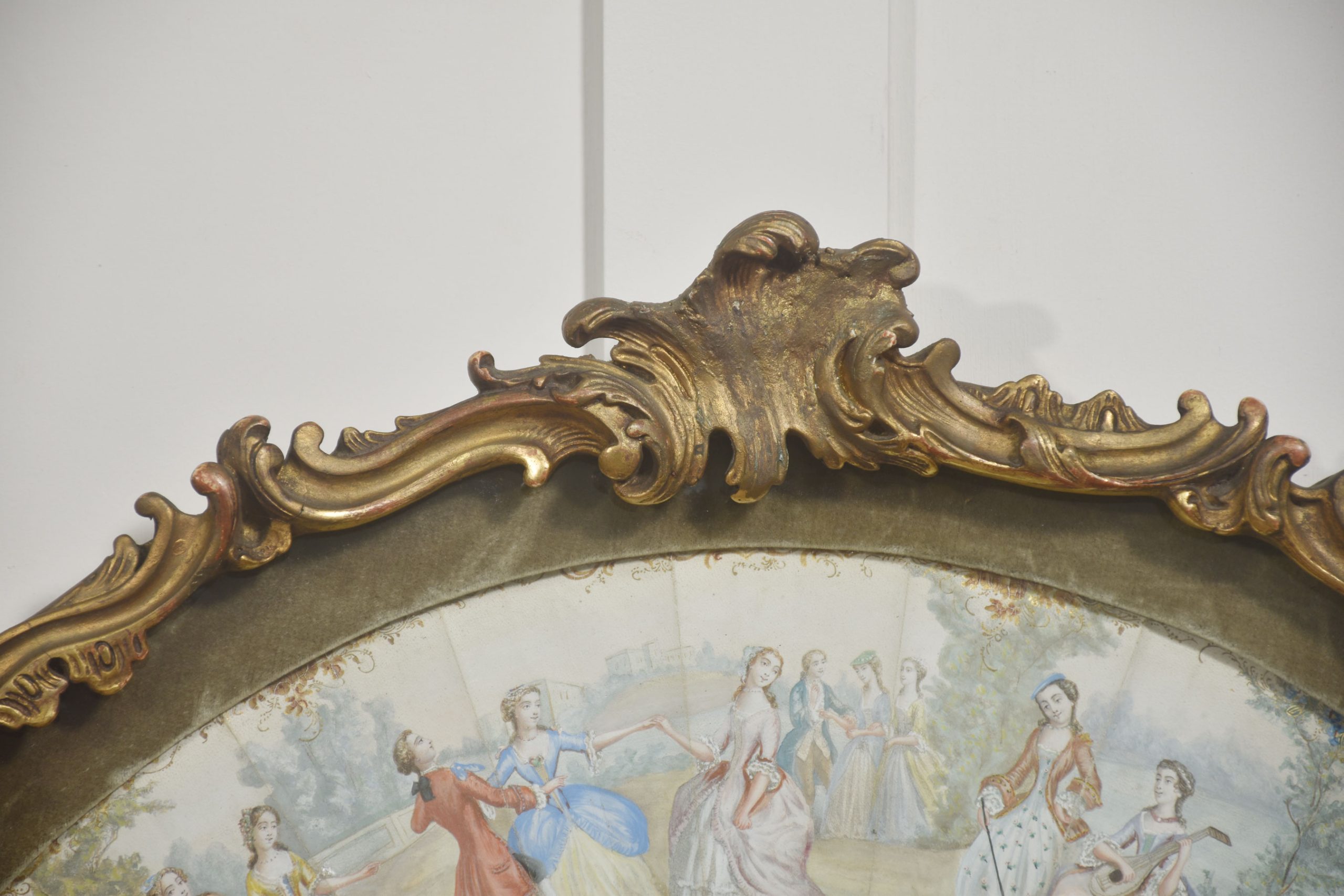 This wall-mounted decorative fan combines a finely crafted folding fan with an ornate Rococo-style frame intended for display. The painted leaf depicts an elegant pastoral fête galante scene, with figures in 18th-century court dress dancing and conversing in a garden setting, reflecting the Rococo revival taste popular in the later 19th century.