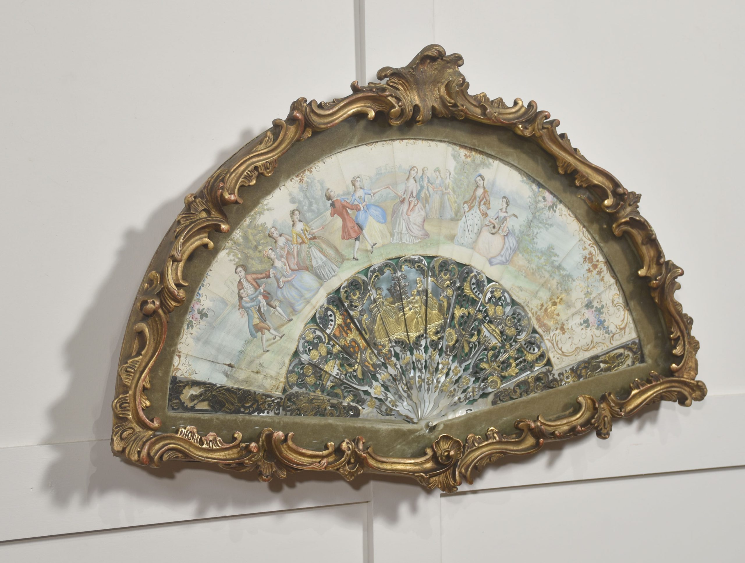 The fan is mounted within an exuberant carved and gilt frame ornamented with scrolling acanthus and shell motifs, transforming the accessory into a decorative wall object. Such framed fans reflect the late 19th-century practice of displaying elaborate fans as works of art within interior decoration.