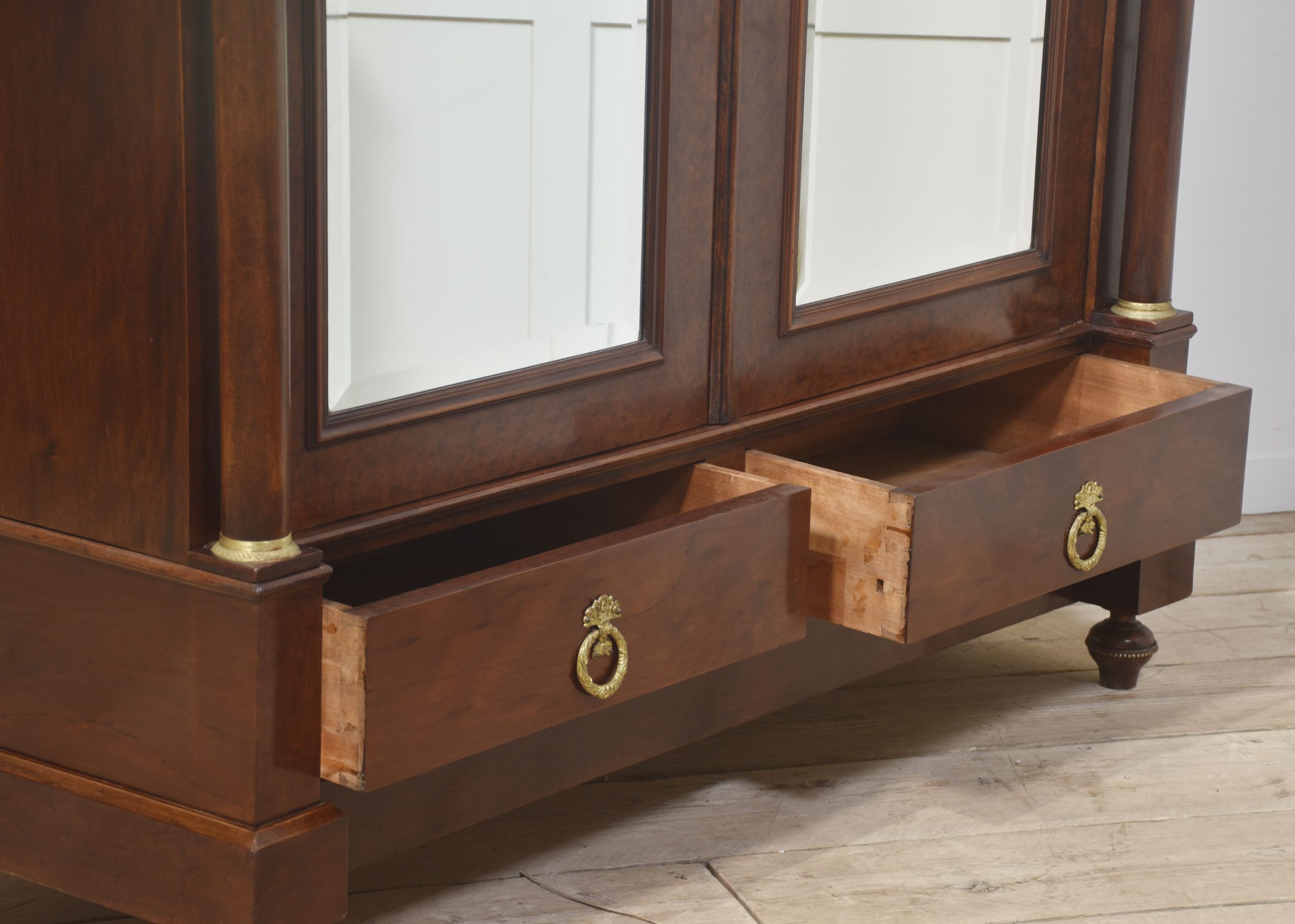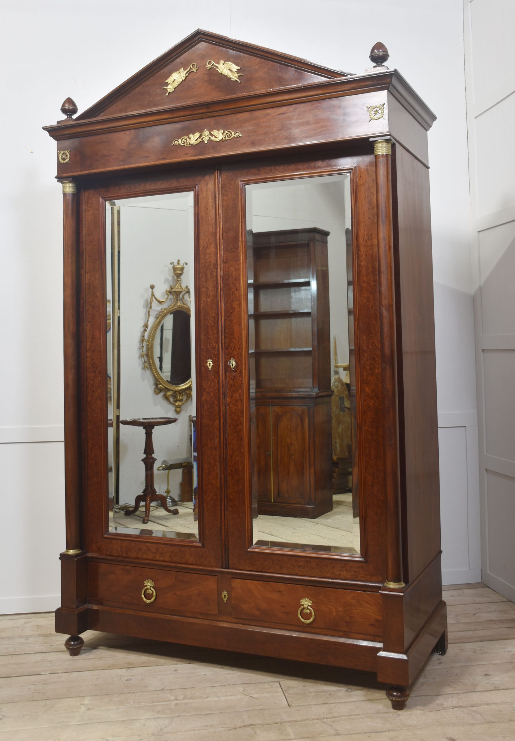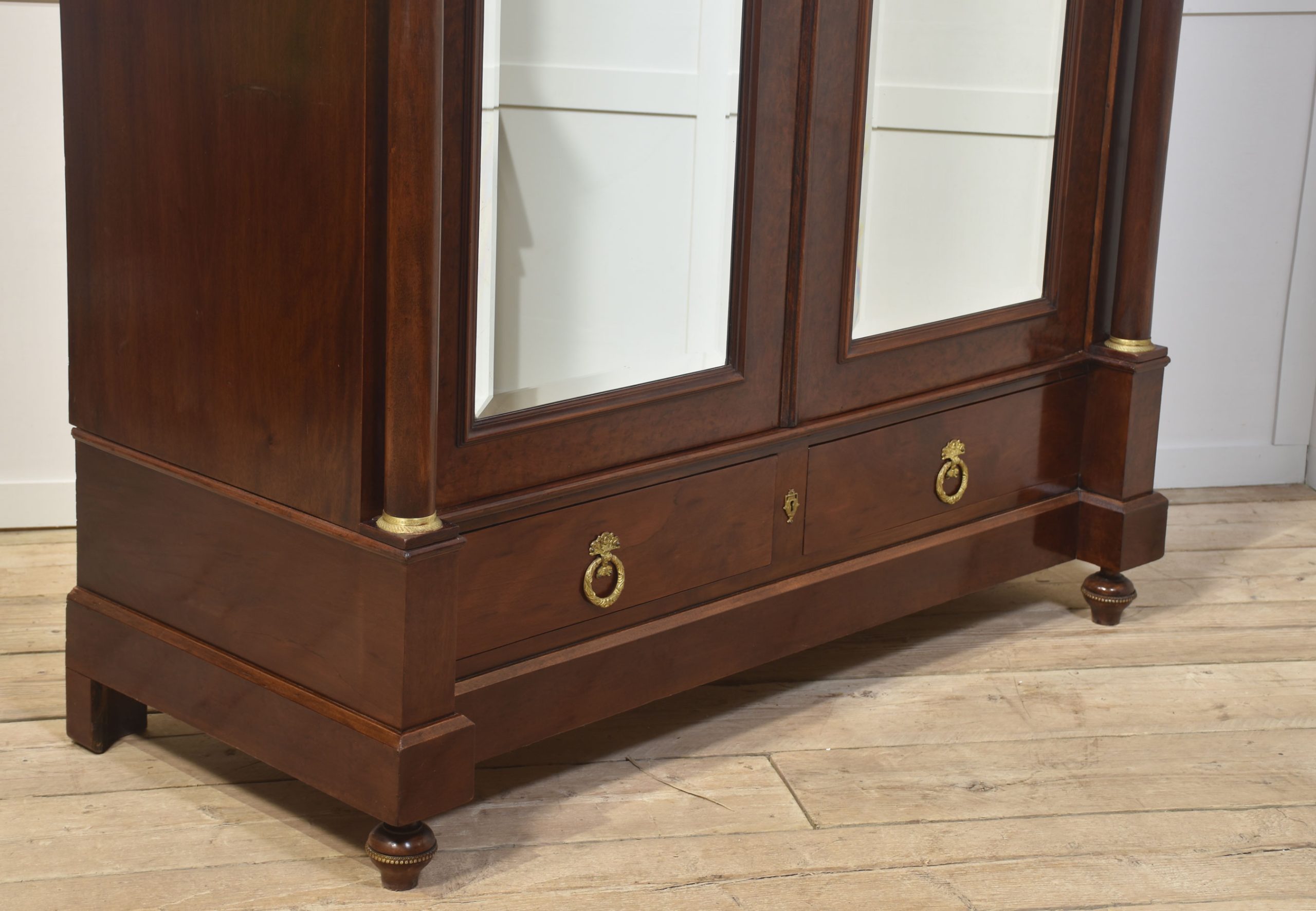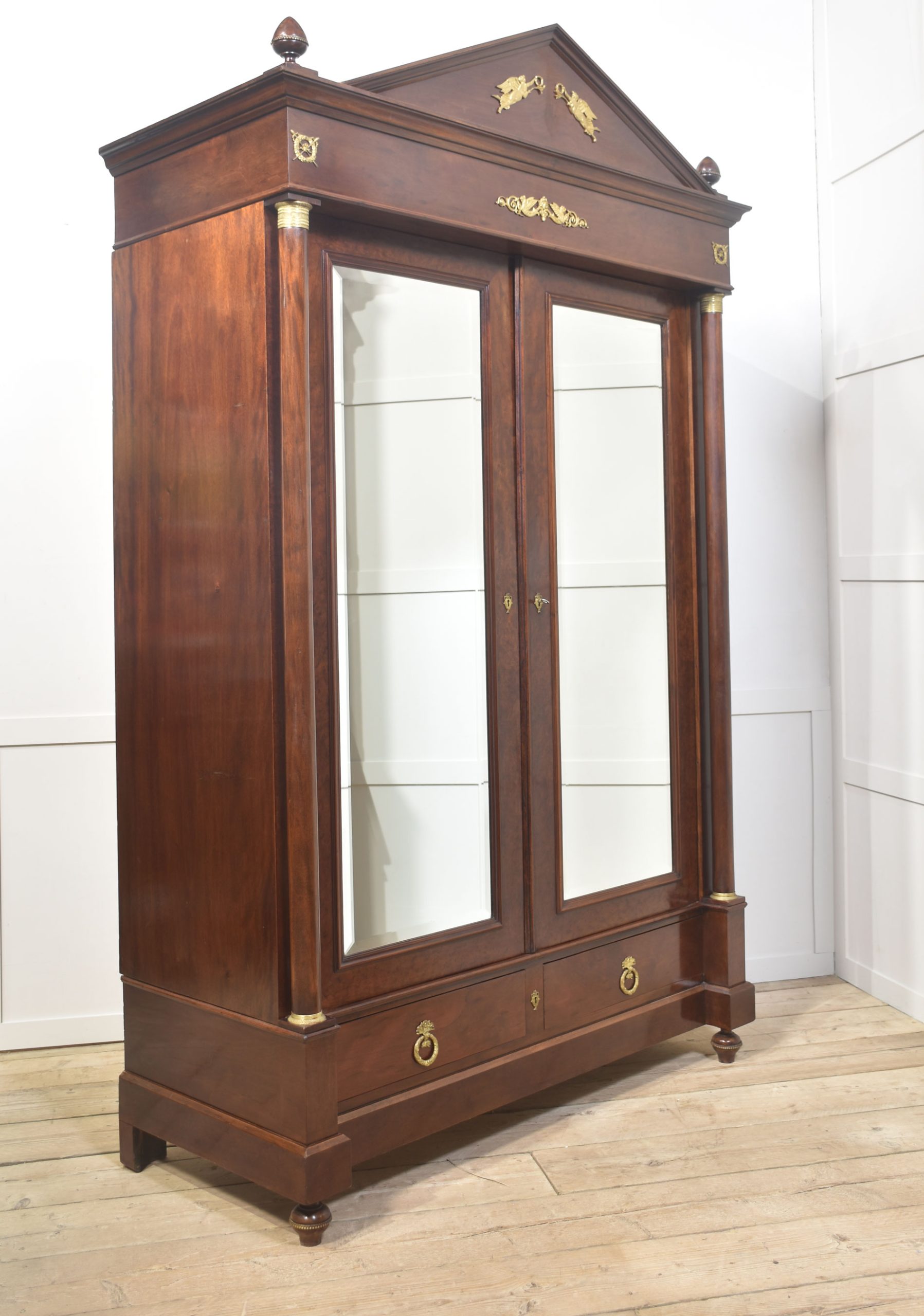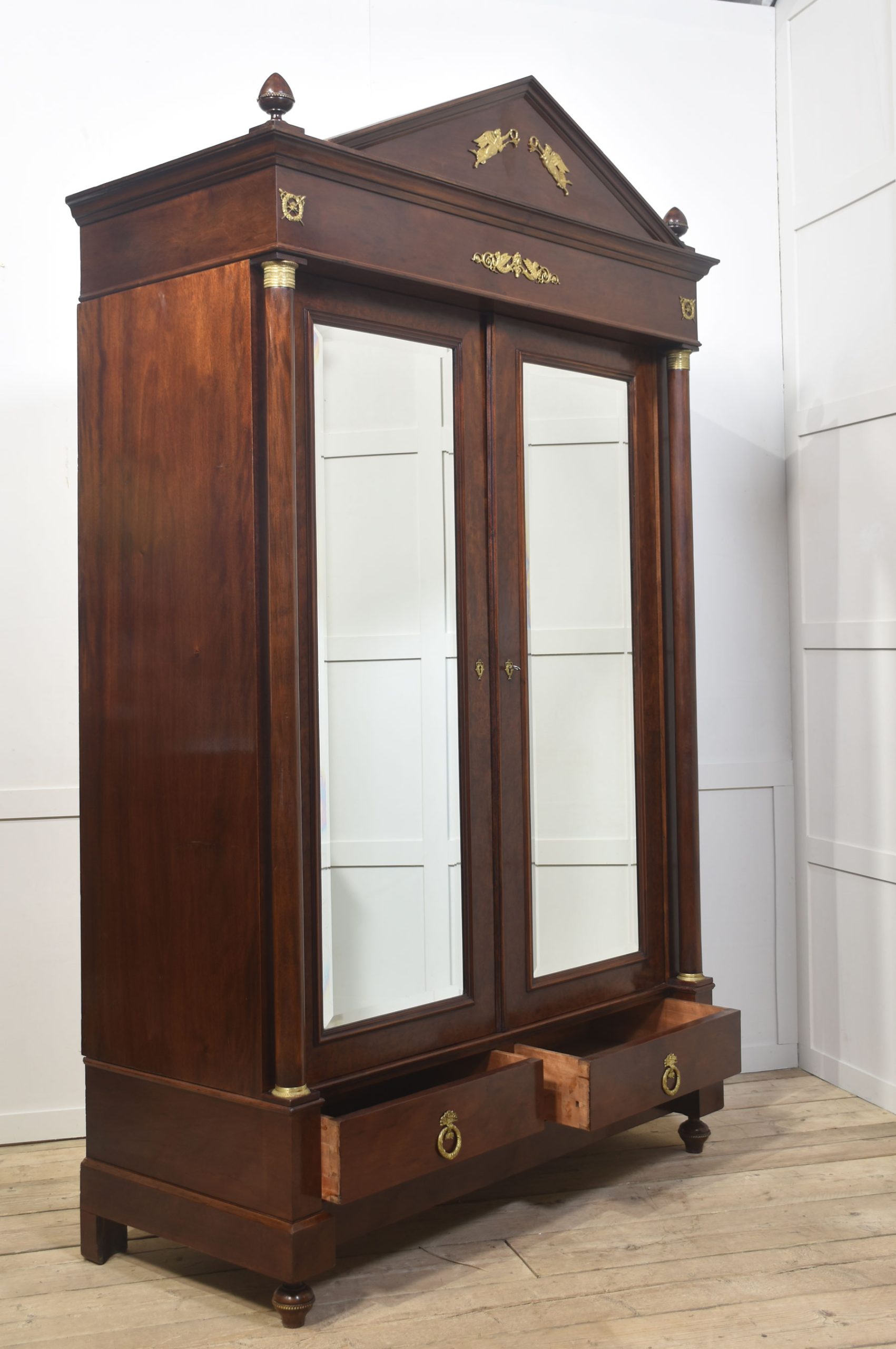 Empire wardrobe, the projecting removable cornice with brass decoration flanked by turned finials. Above two large bevelled mirror doors opening to reveal a large hanging area. FLanked by circular columns with brass capitals. To the base section fitted with a pair of deep drawers with brass ring handles. All raised up on turned feet.