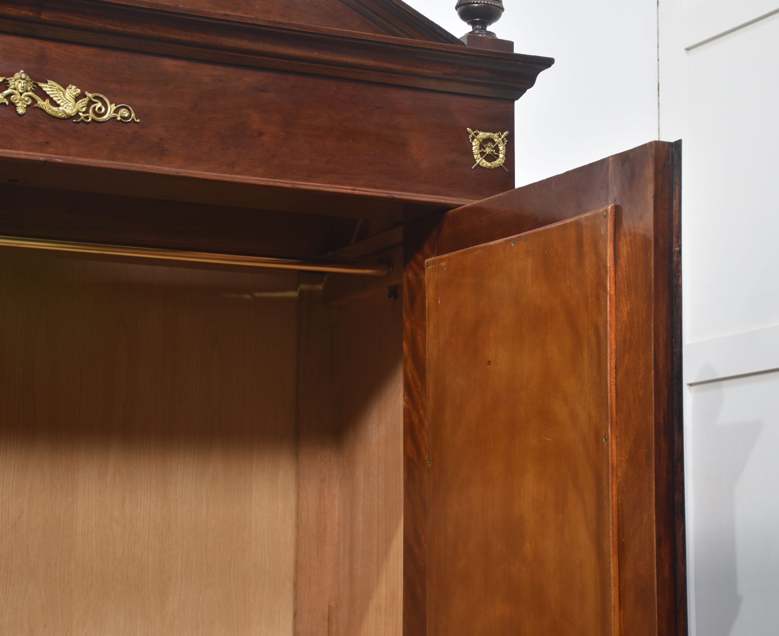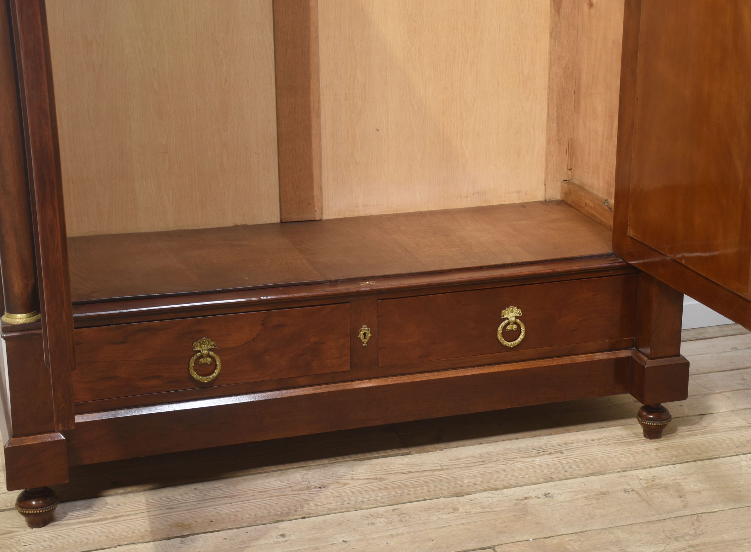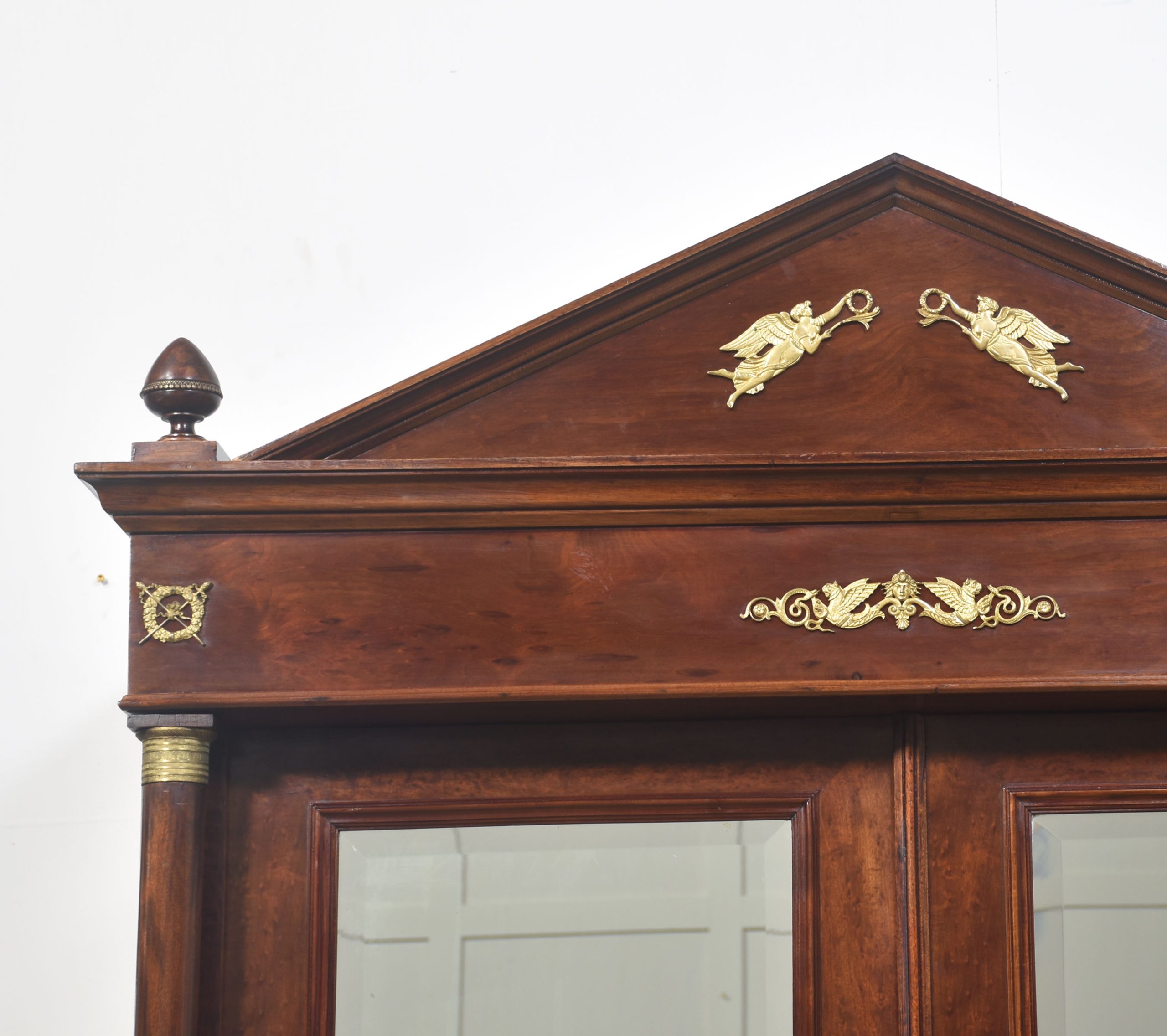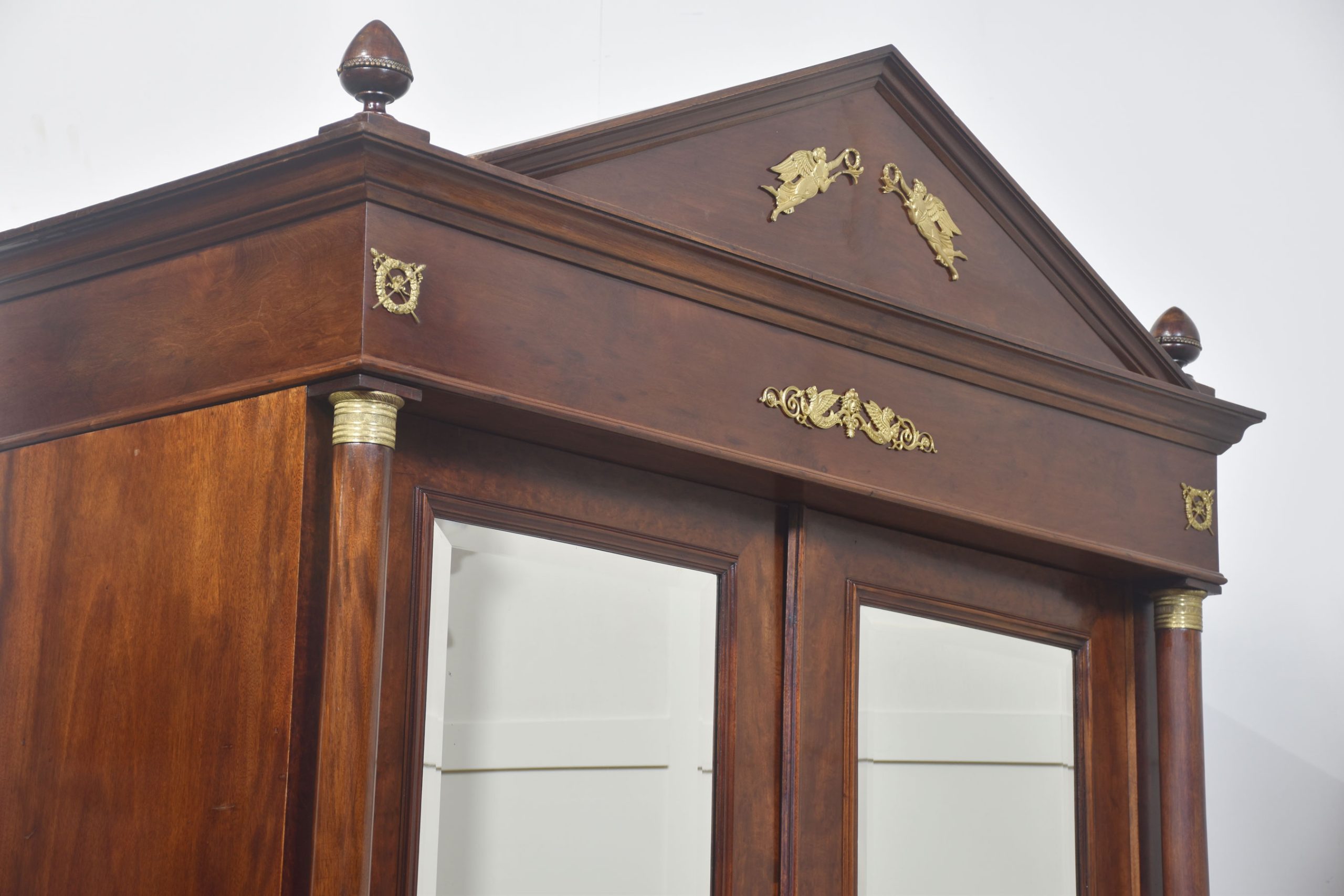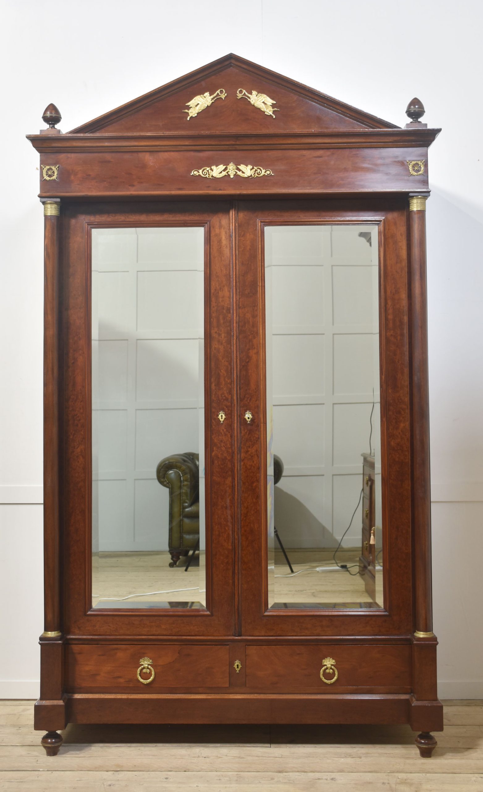 Empire wardrobe, the projecting removable cornice with brass decoration flanked by turned finials. Above two large bevelled mirror doors opening to reveal a large hanging area. FLanked by circular columns with brass capitals. To the base section fitted with a pair of deep drawers with brass ring handles. All raised up on turned feet.