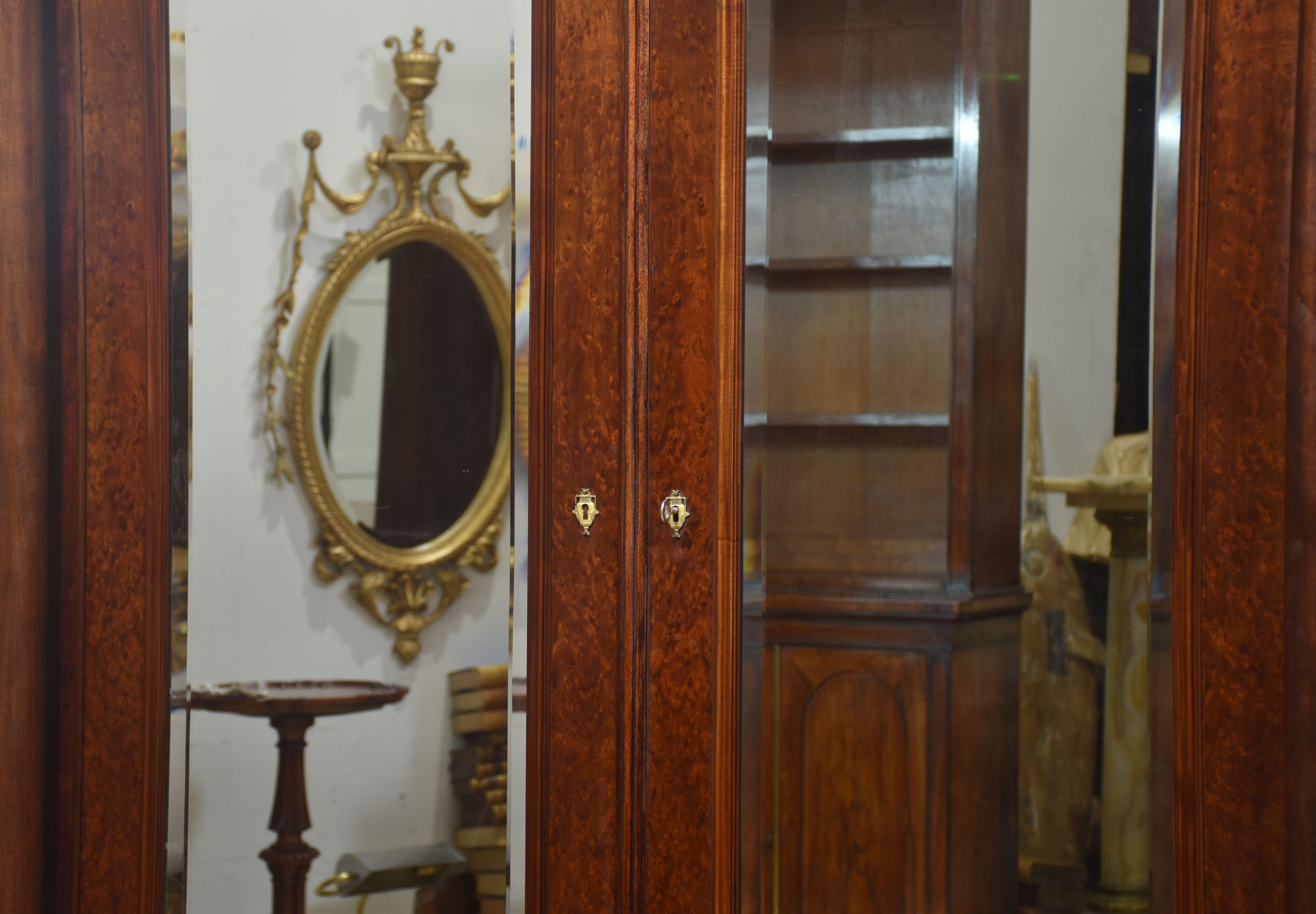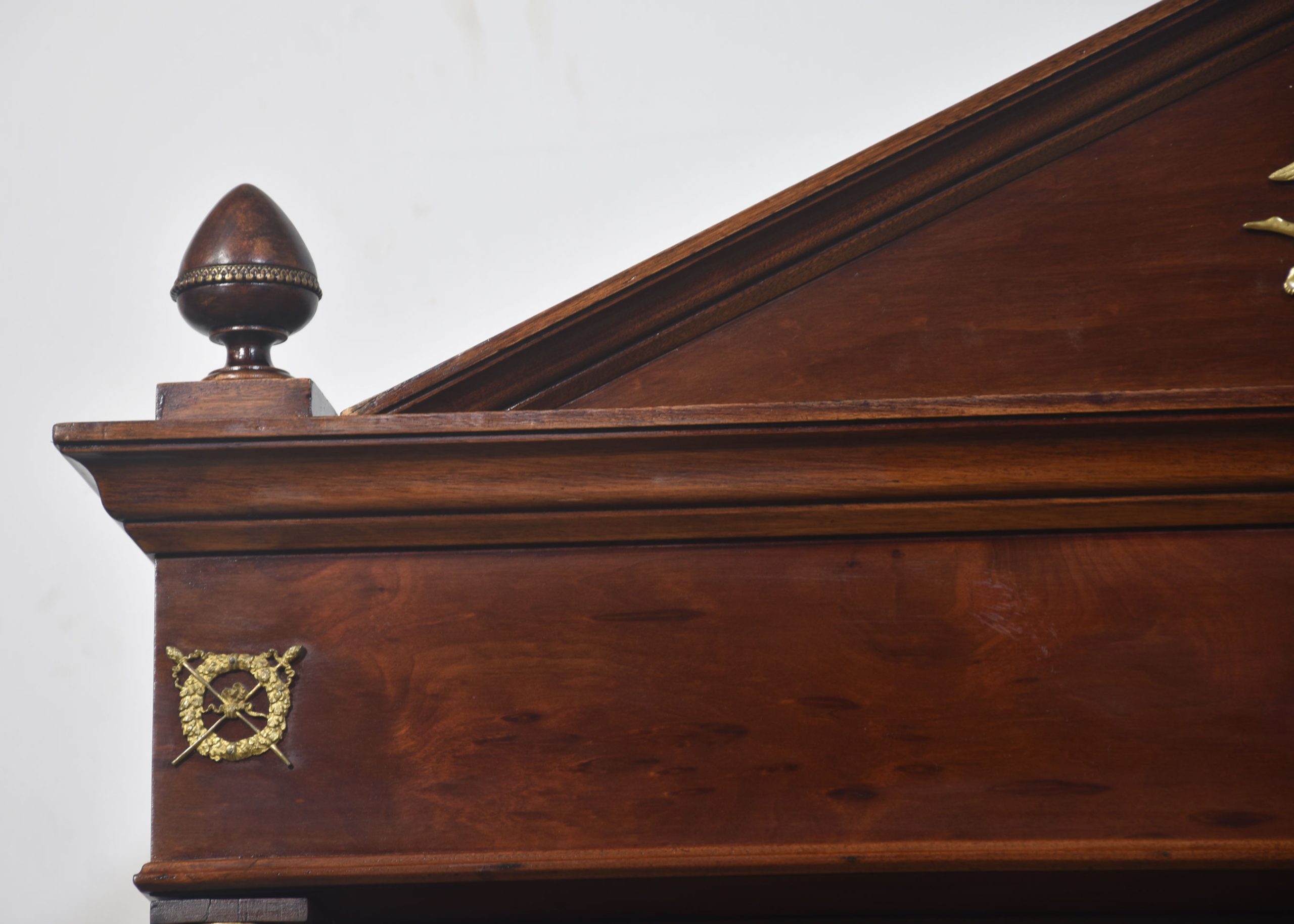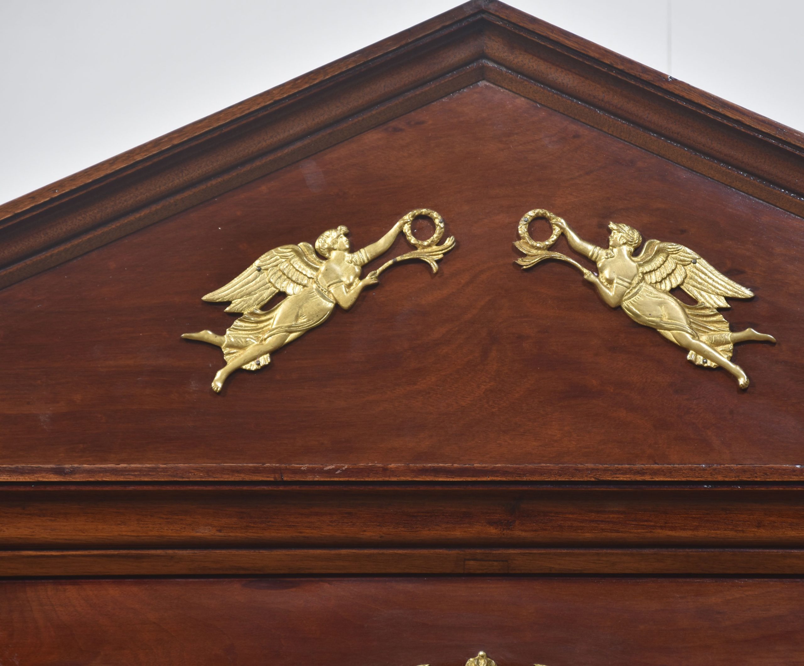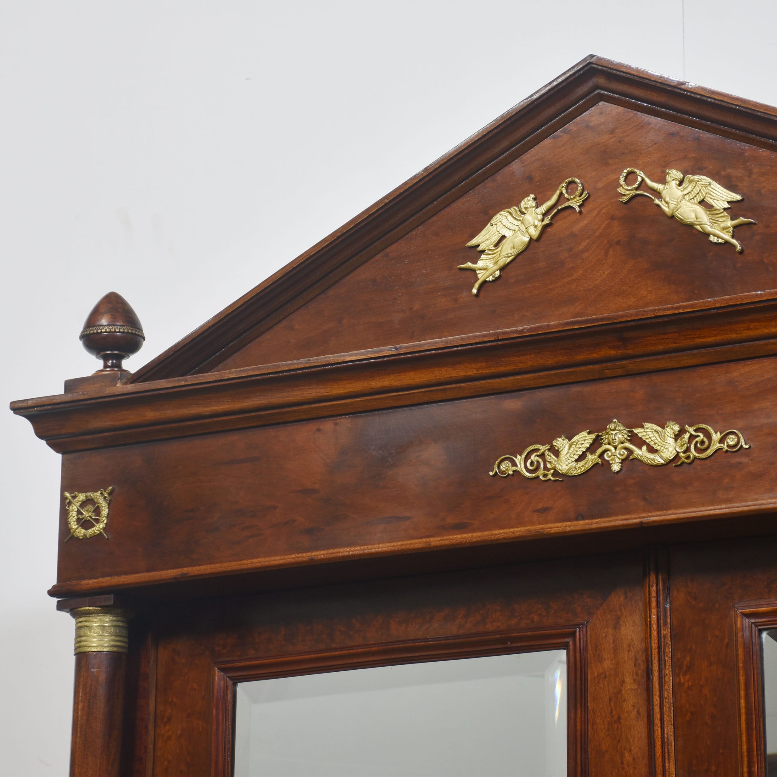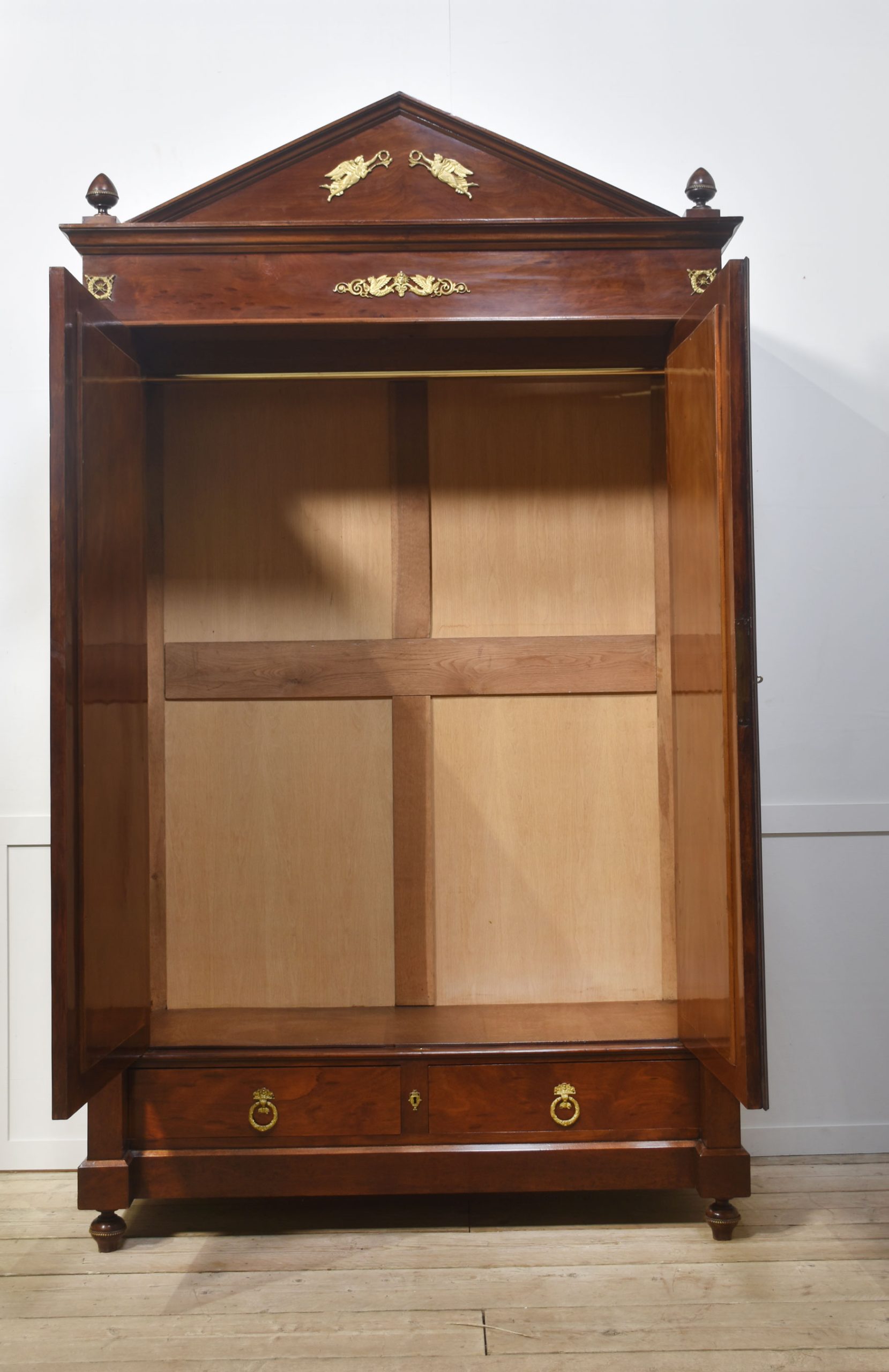 Empire wardrobe, the projecting removable cornice with brass decoration flanked by turned finials. Above two large bevelled mirror doors opening to reveal a large hanging area. FLanked by circular columns with brass capitals. To the base section fitted with a pair of deep drawers with brass ring handles. All raised up on turned feet.