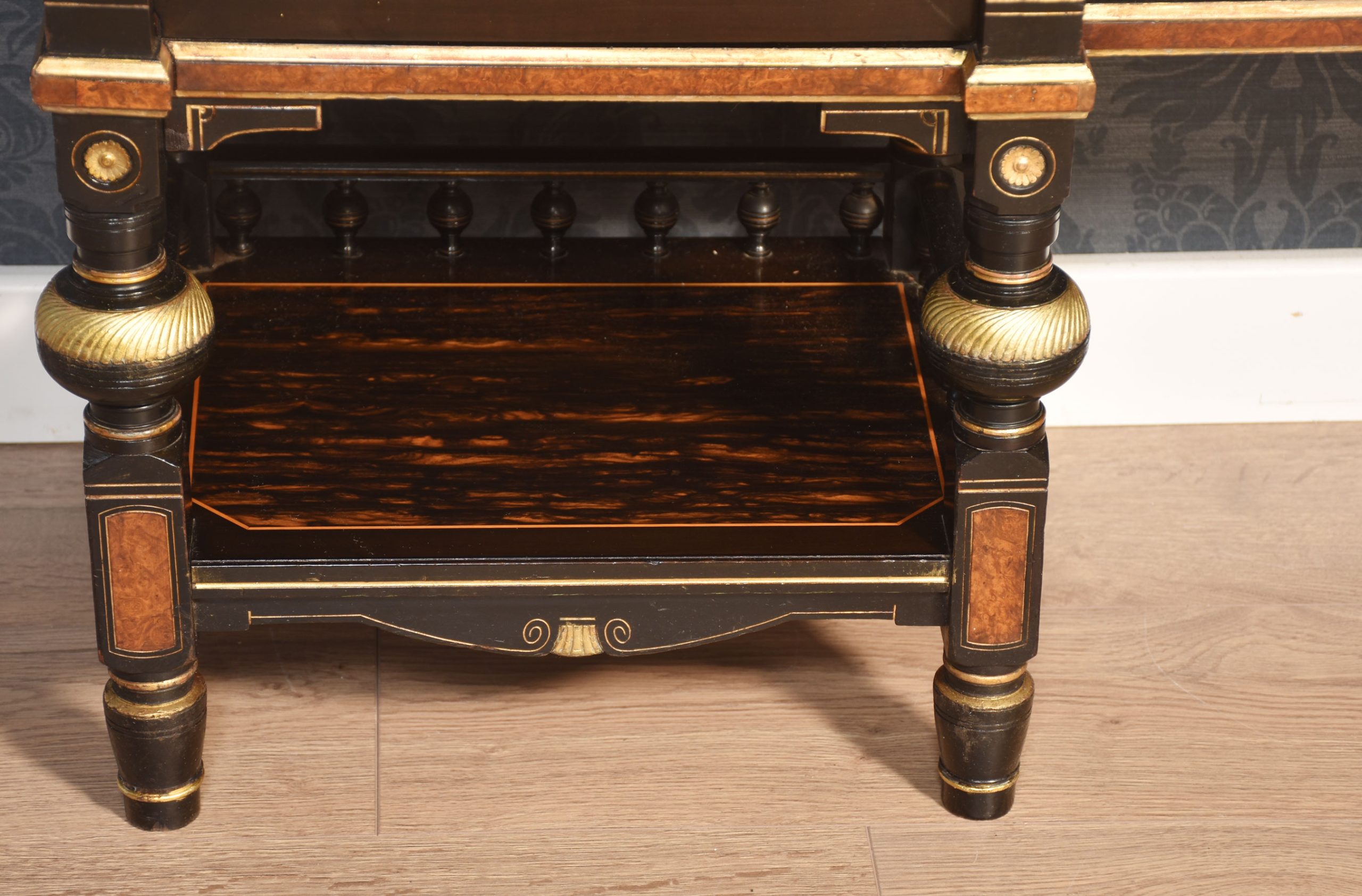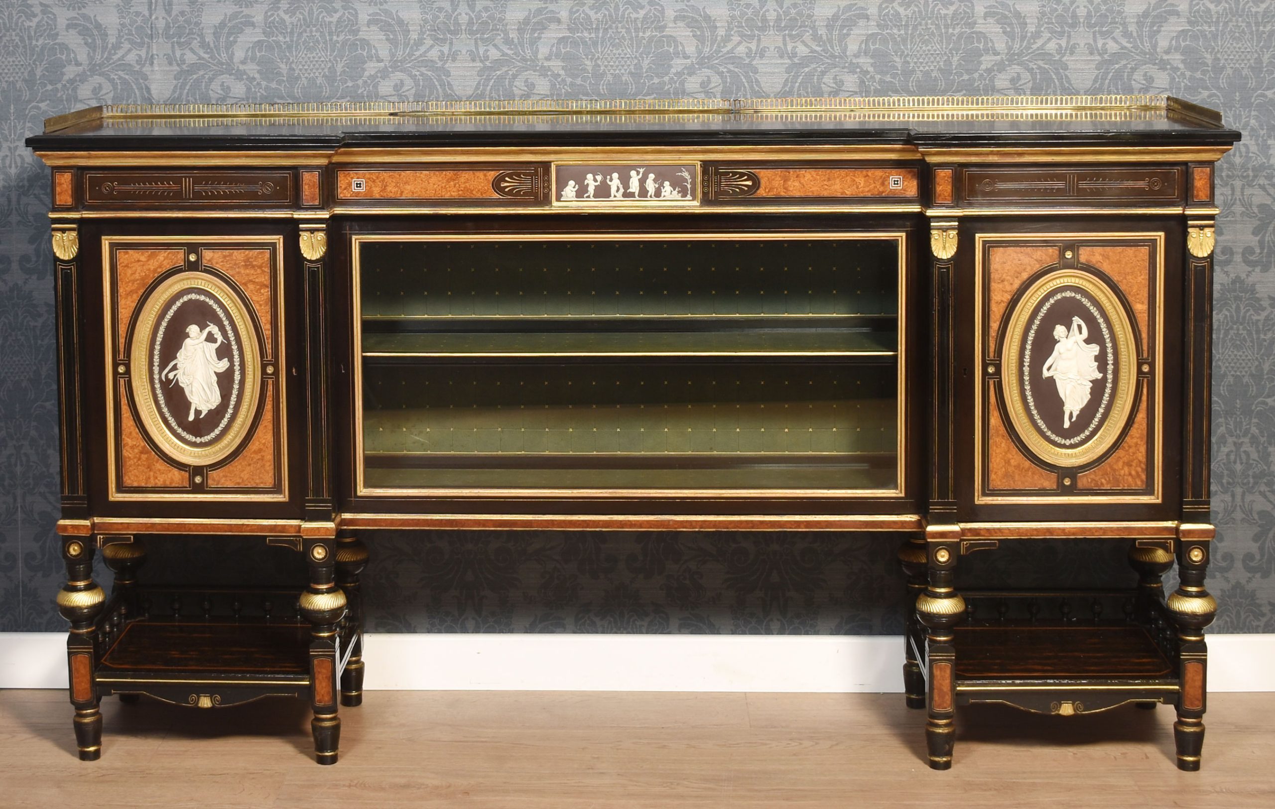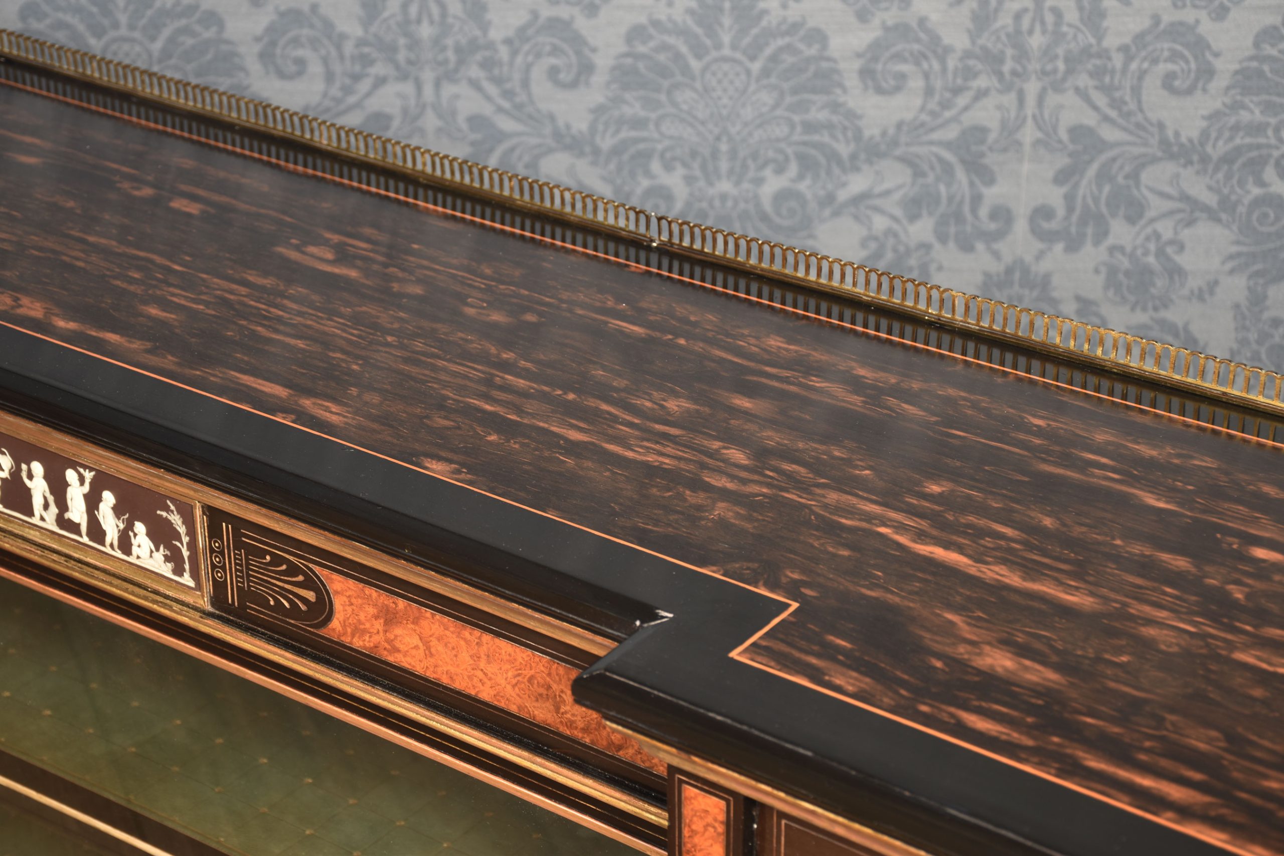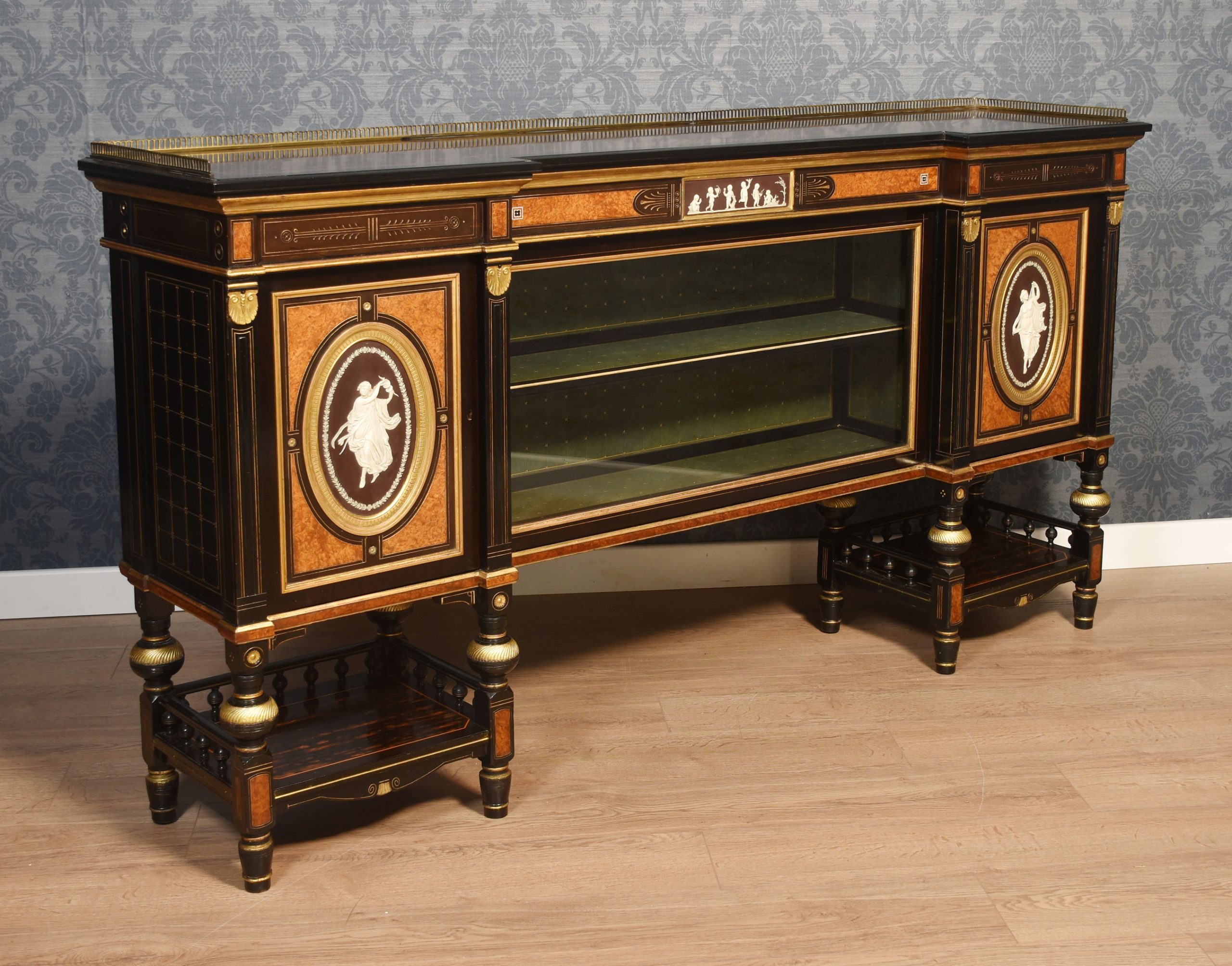 Superb exhibition quality 19th Century English cabinet by Lamb of Manchester, the raised pierced brass gallery above large rectangular coromandel top and ebonized edge. To the freeze with gilded detail and central cameo. The base section is fitted with a large central glazed door opening to reveal a green leather-lined interior. Flanked by a pair of paneled doors with oval female cameos. All raised up on turned supports united by under tiers.