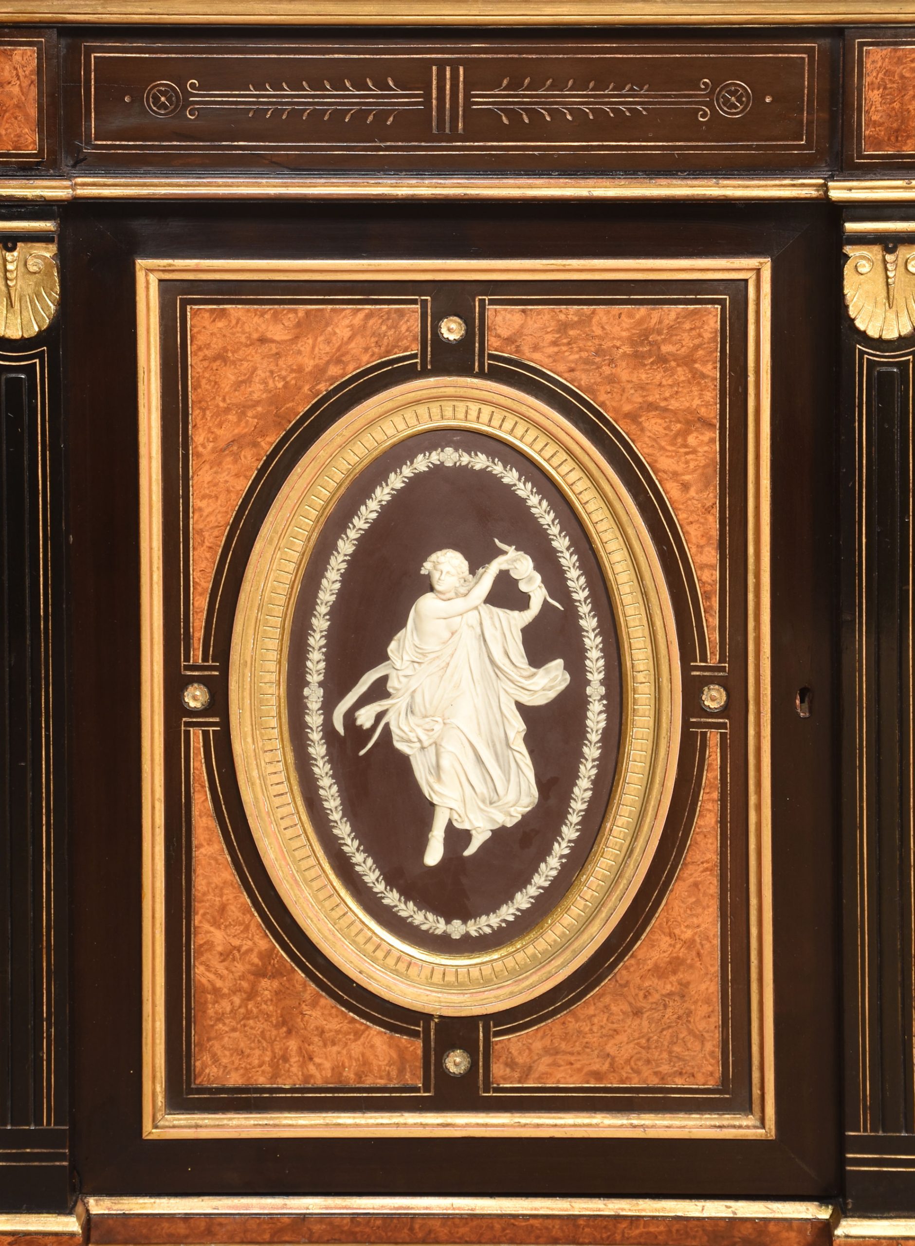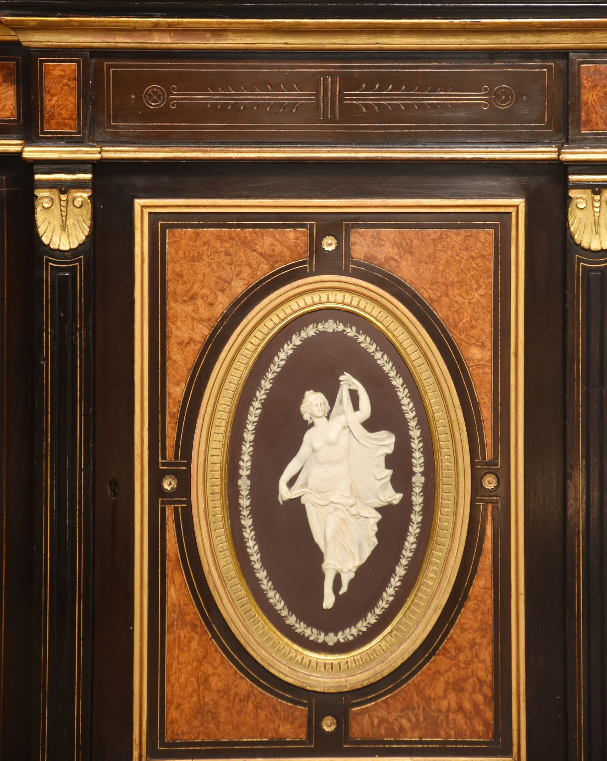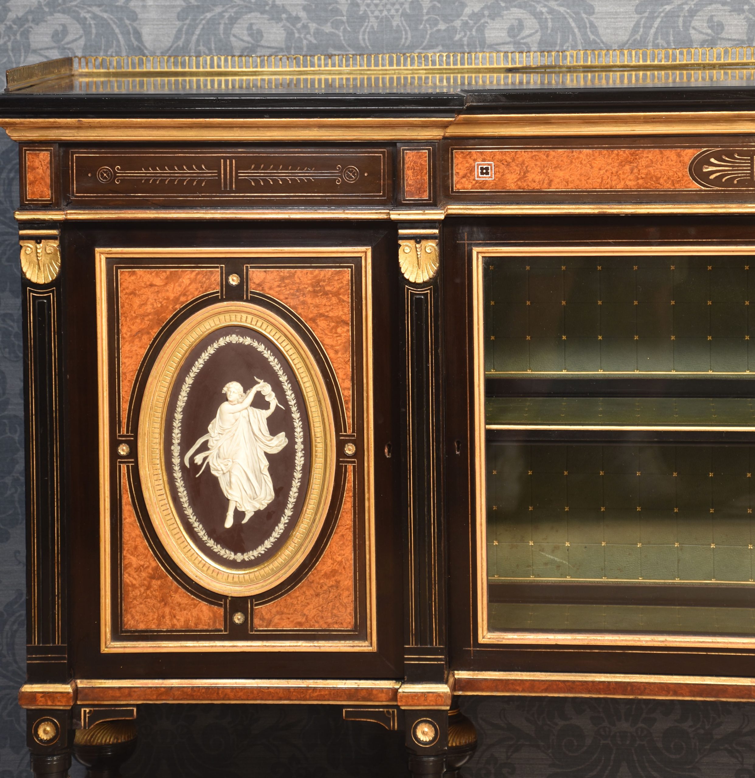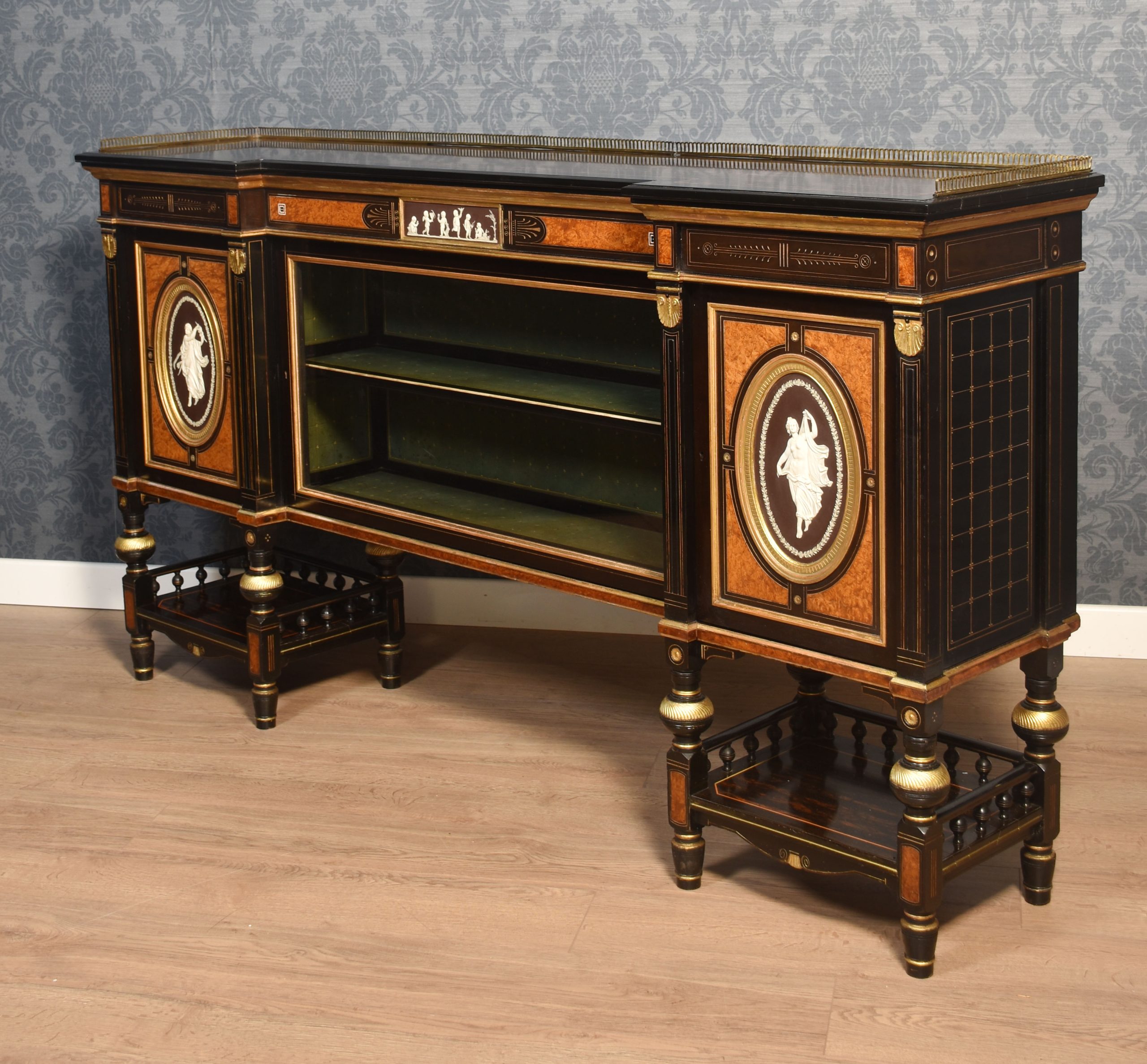 Superb exhibition quality 19th Century English cabinet by Lamb of Manchester, the raised pierced brass gallery above large rectangular coromandel top and ebonized edge. To the freeze with gilded detail and central cameo. The base section is fitted with a large central glazed door opening to reveal a green leather-lined interior. Flanked by a pair of paneled doors with oval female cameos. All raised up on turned supports united by under tiers.