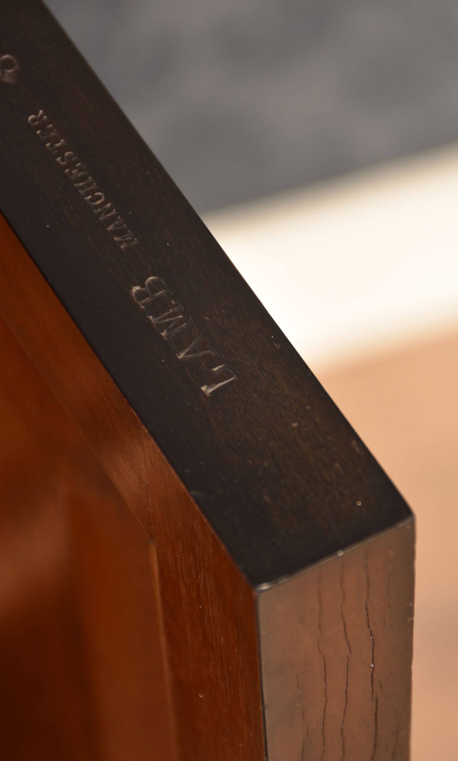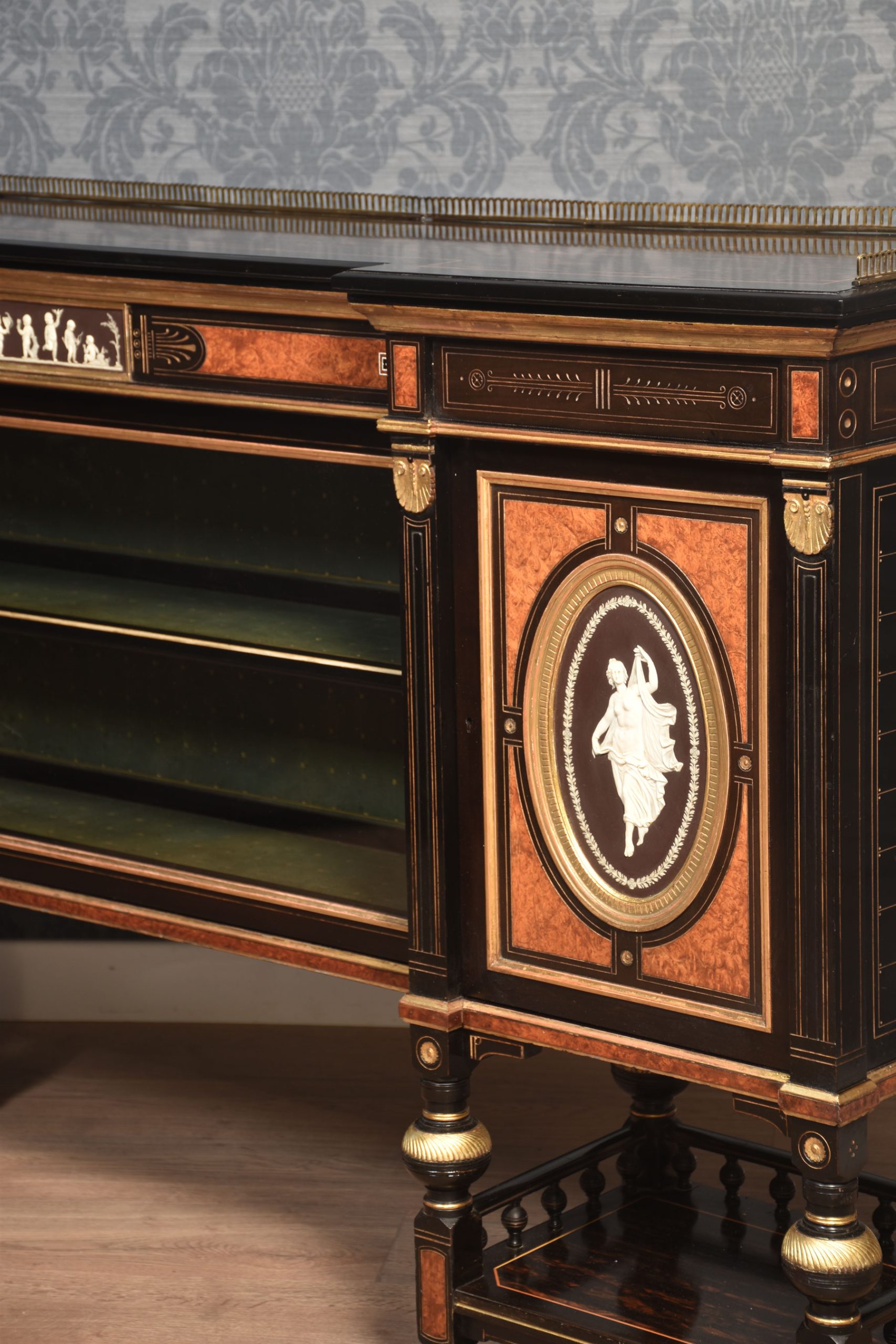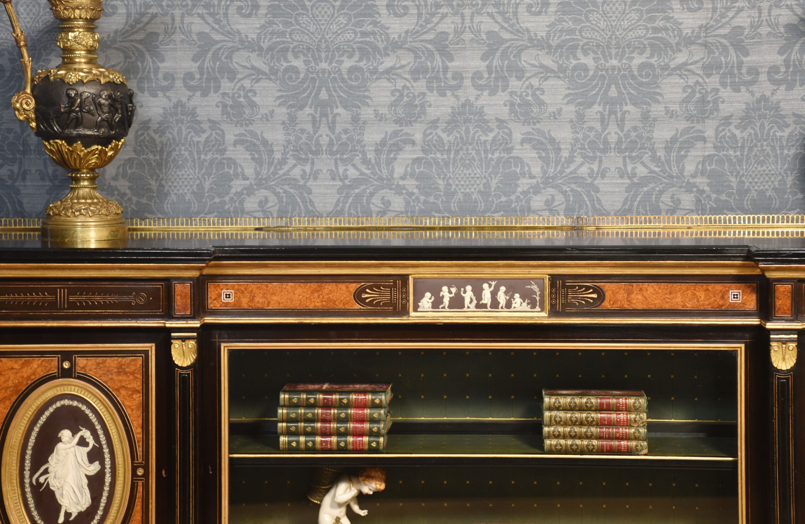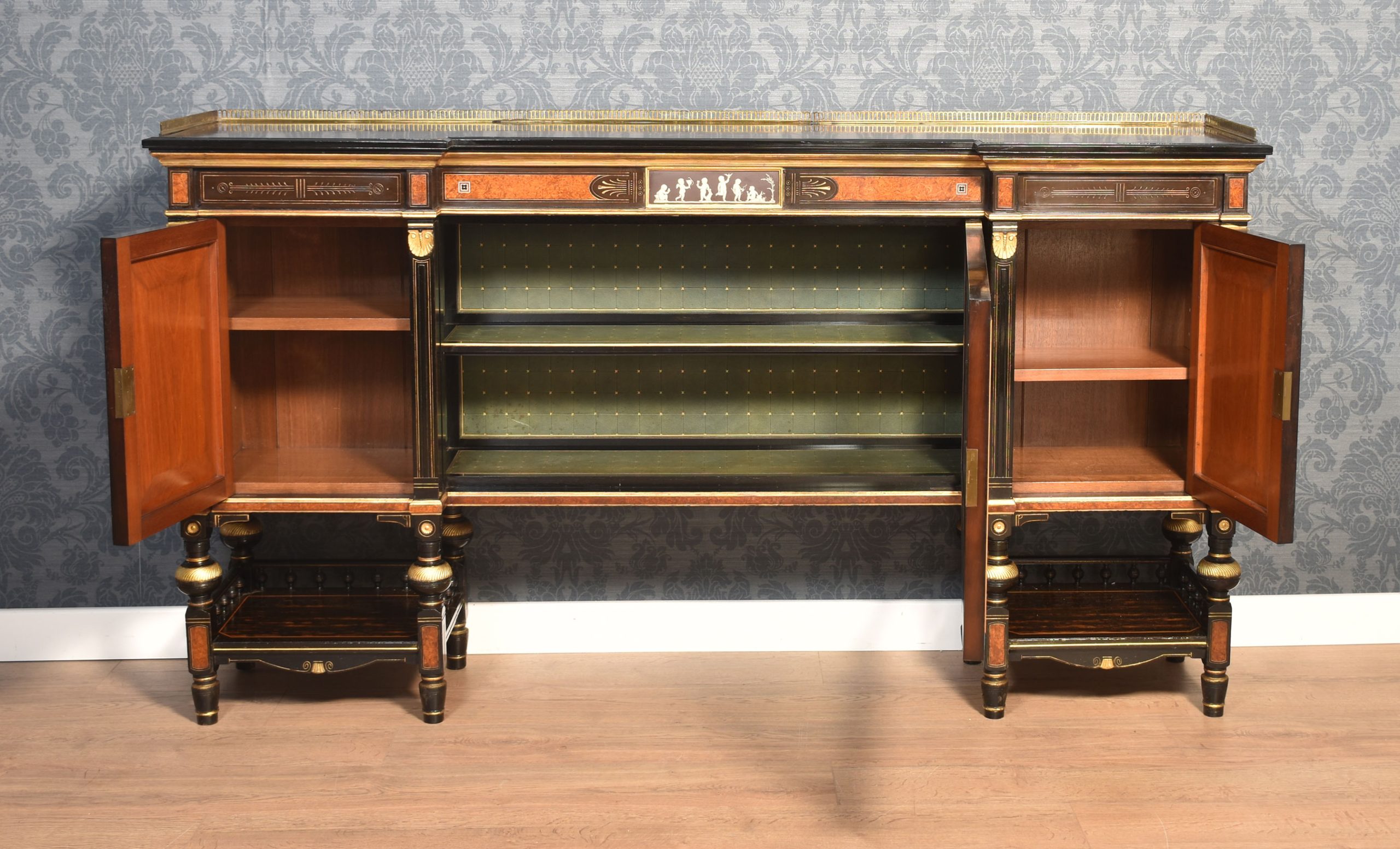 Superb exhibition quality 19th Century English cabinet by Lamb of Manchester, the raised pierced brass gallery above large rectangular coromandel top and ebonized edge. To the freeze with gilded detail and central cameo. The base section is fitted with a large central glazed door opening to reveal a green leather-lined interior. Flanked by a pair of paneled doors with oval female cameos. All raised up on turned supports united by under tiers.