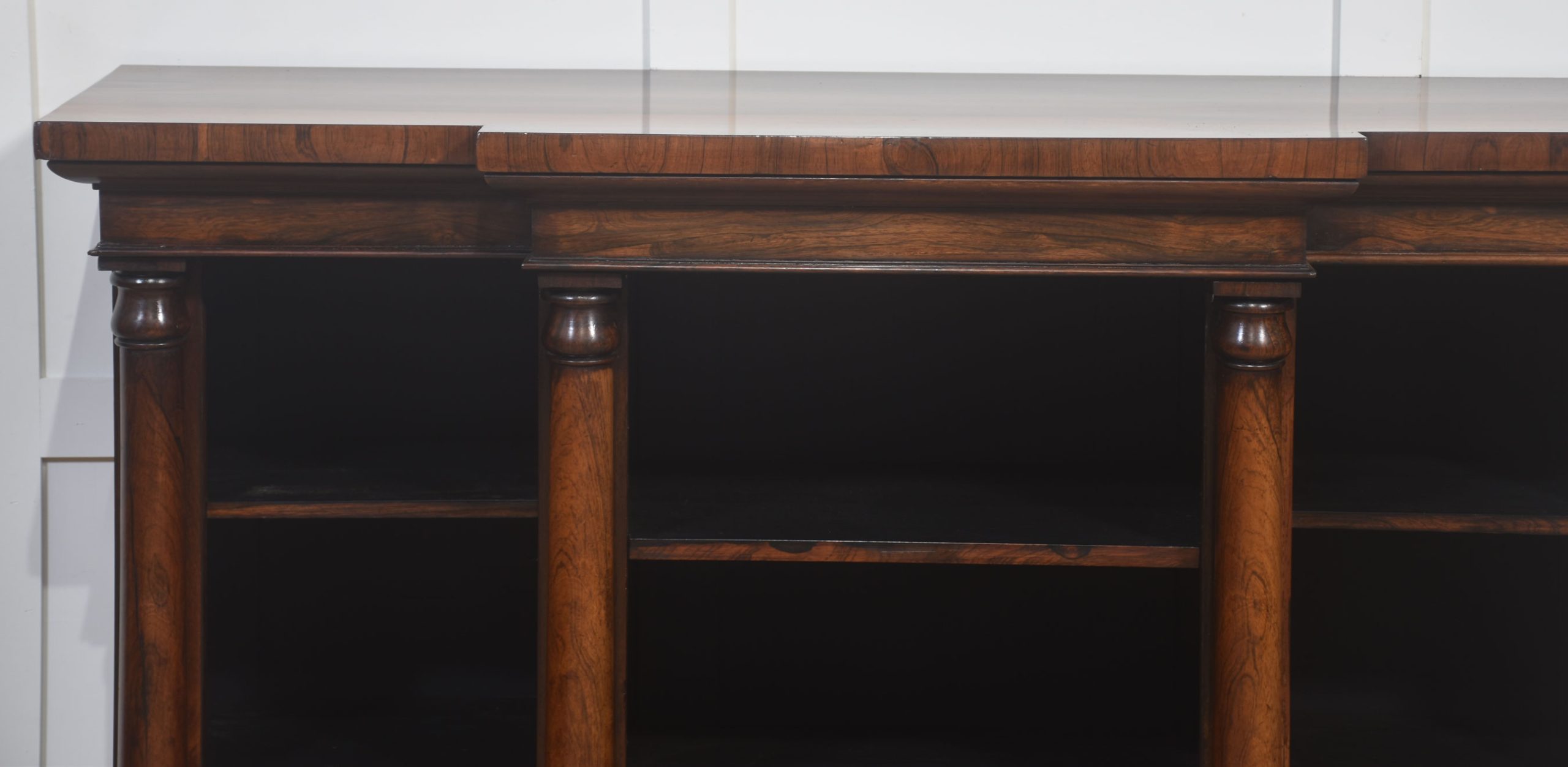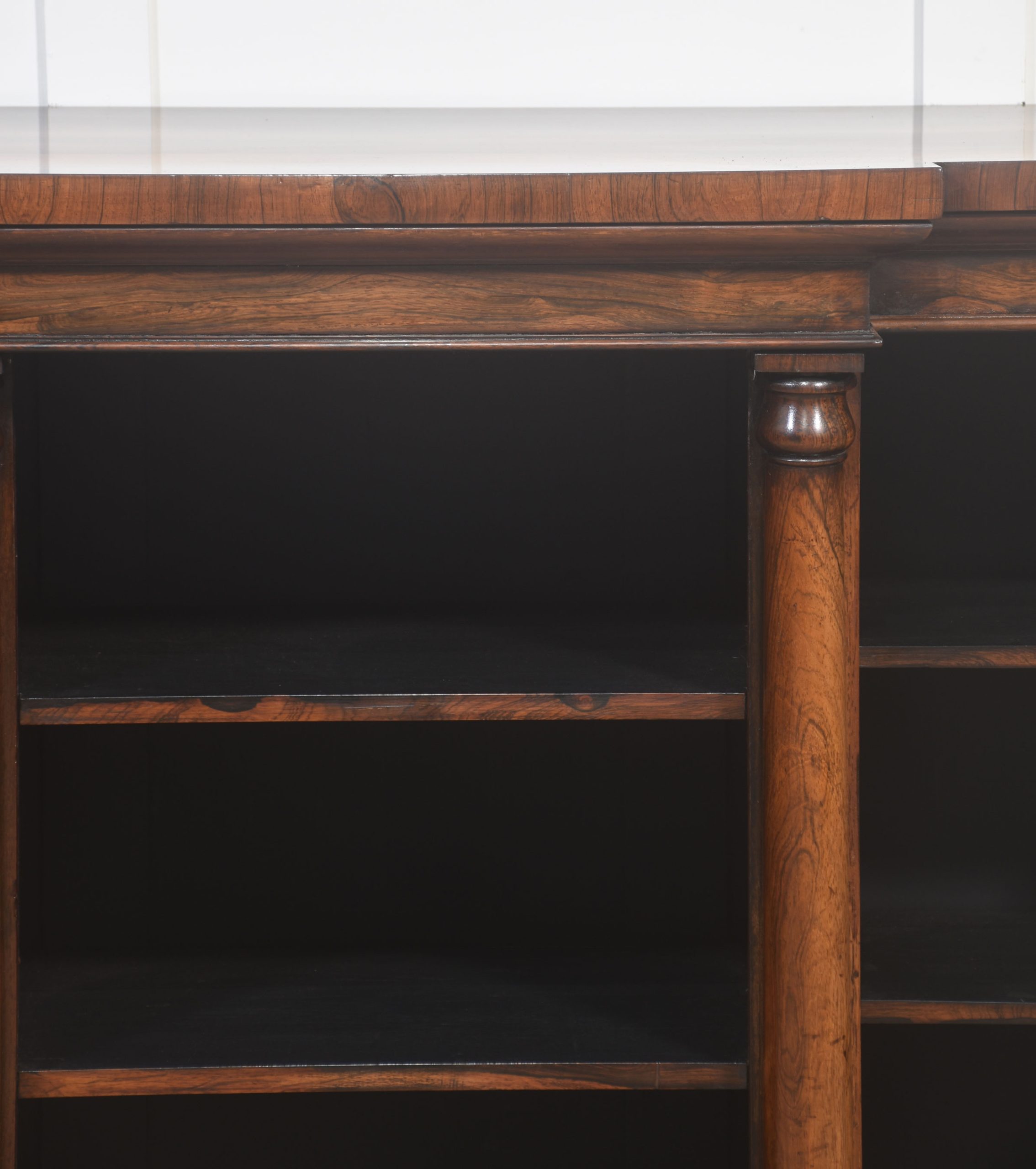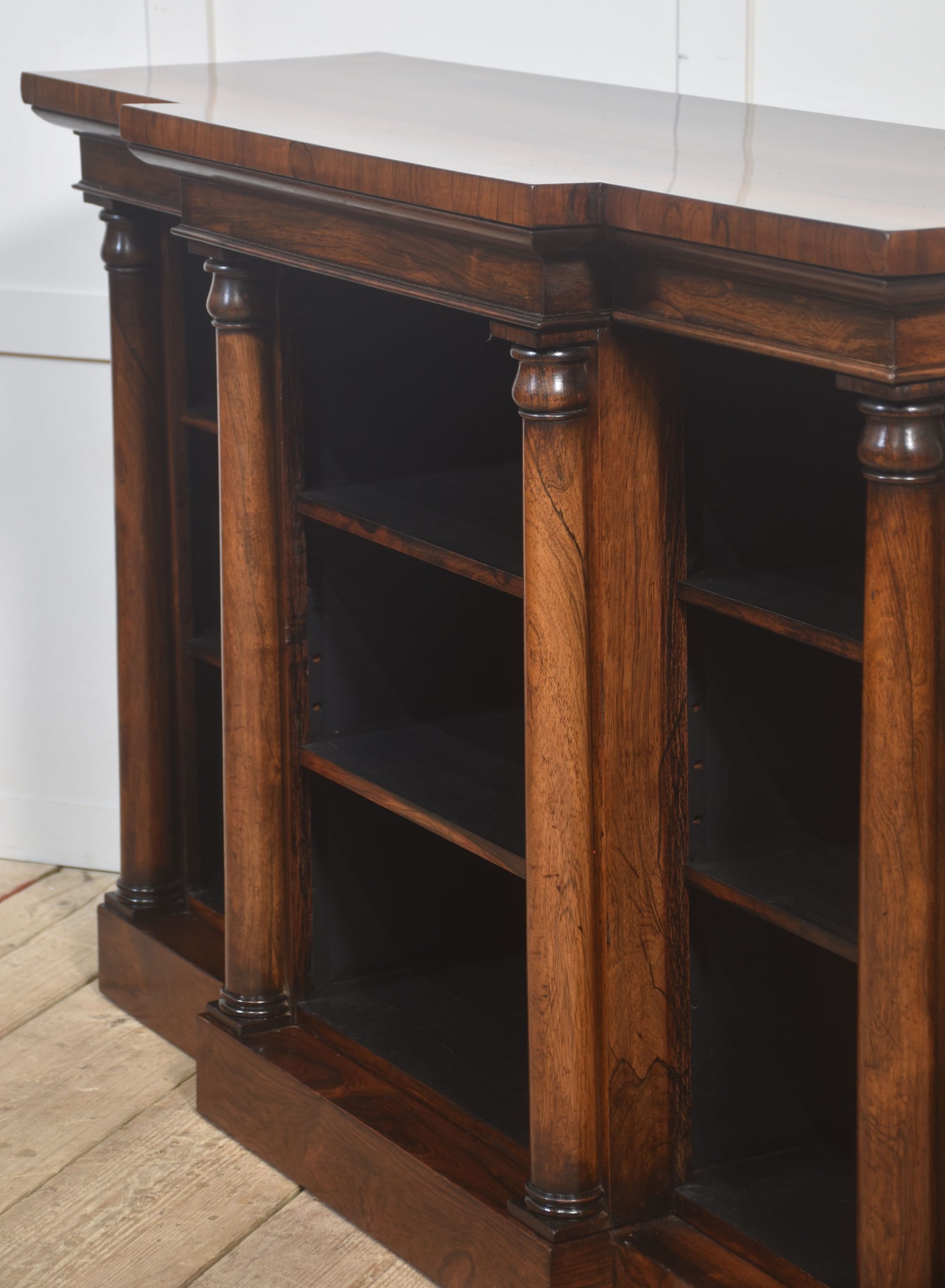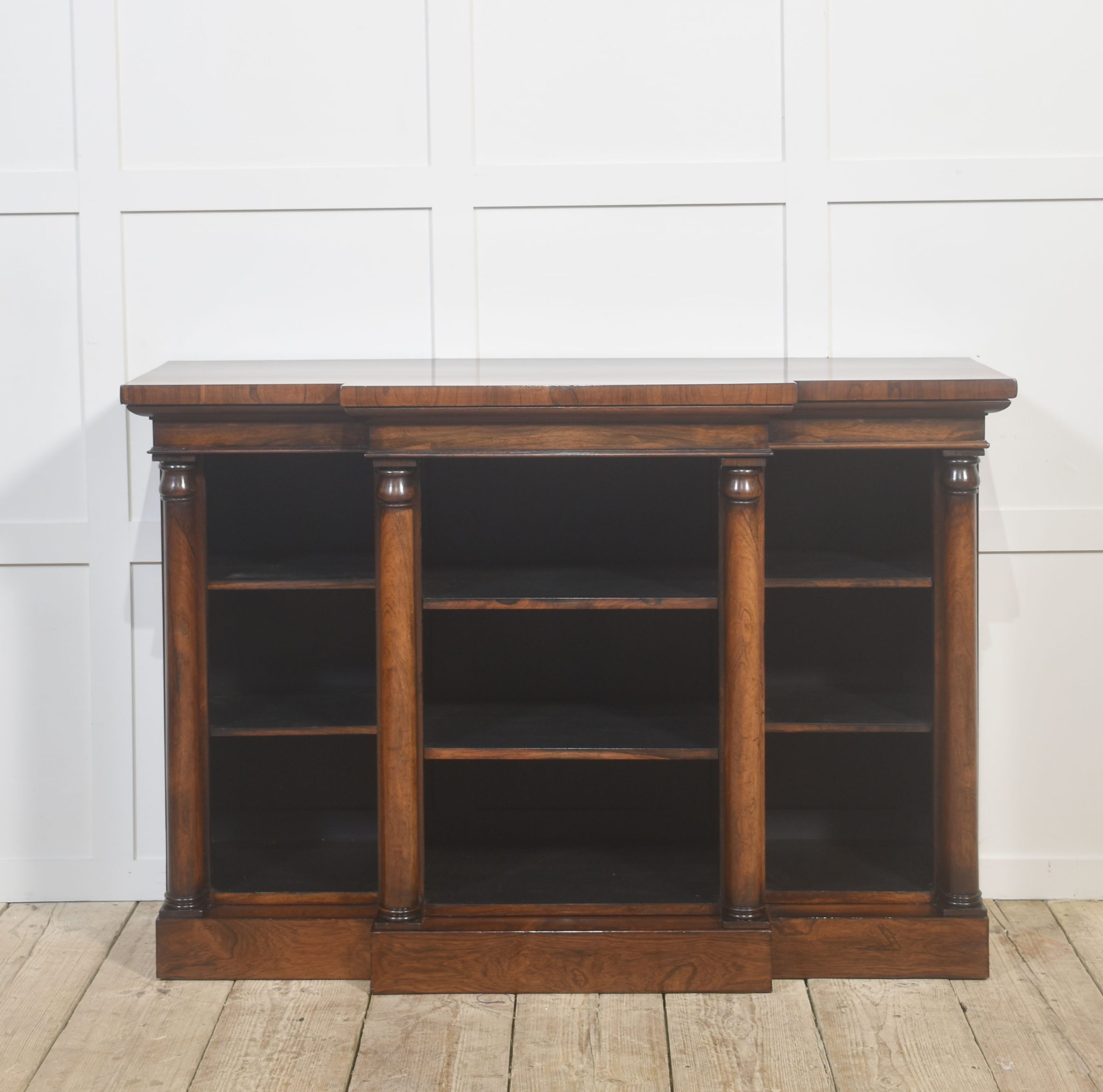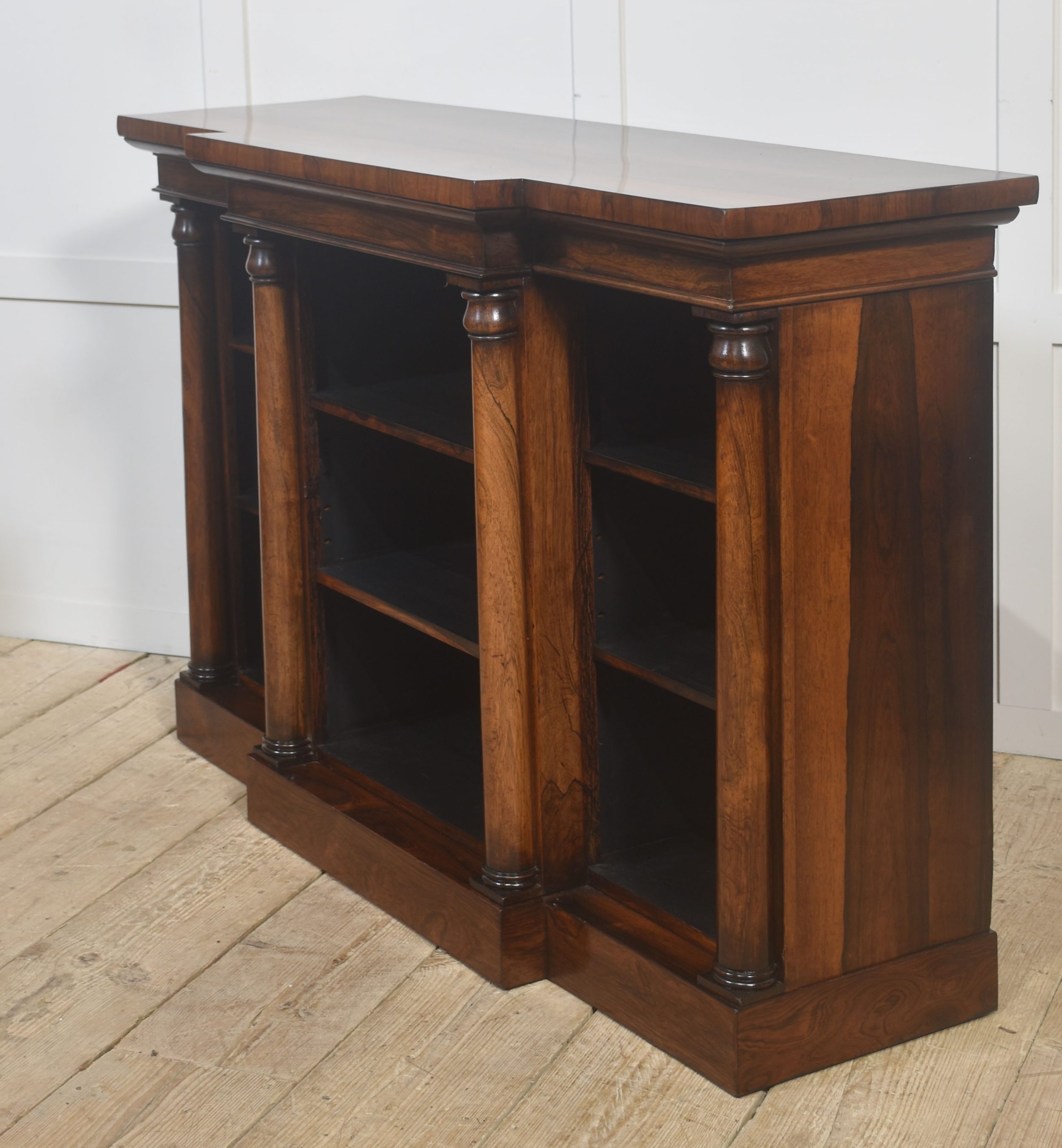 A distinguished 19th-century rosewood breakfront open bookcase of exceptional quality. The stepped breakfront top displays richly figured rosewood grain and sits above three open sections arranged in a classic breakfront formation. Each bay is flanked by substantial turned columns, adding architectural presence and visual balance. The interior is fitted with adjustable shelves, offering versatile storage for books or decorative pieces.