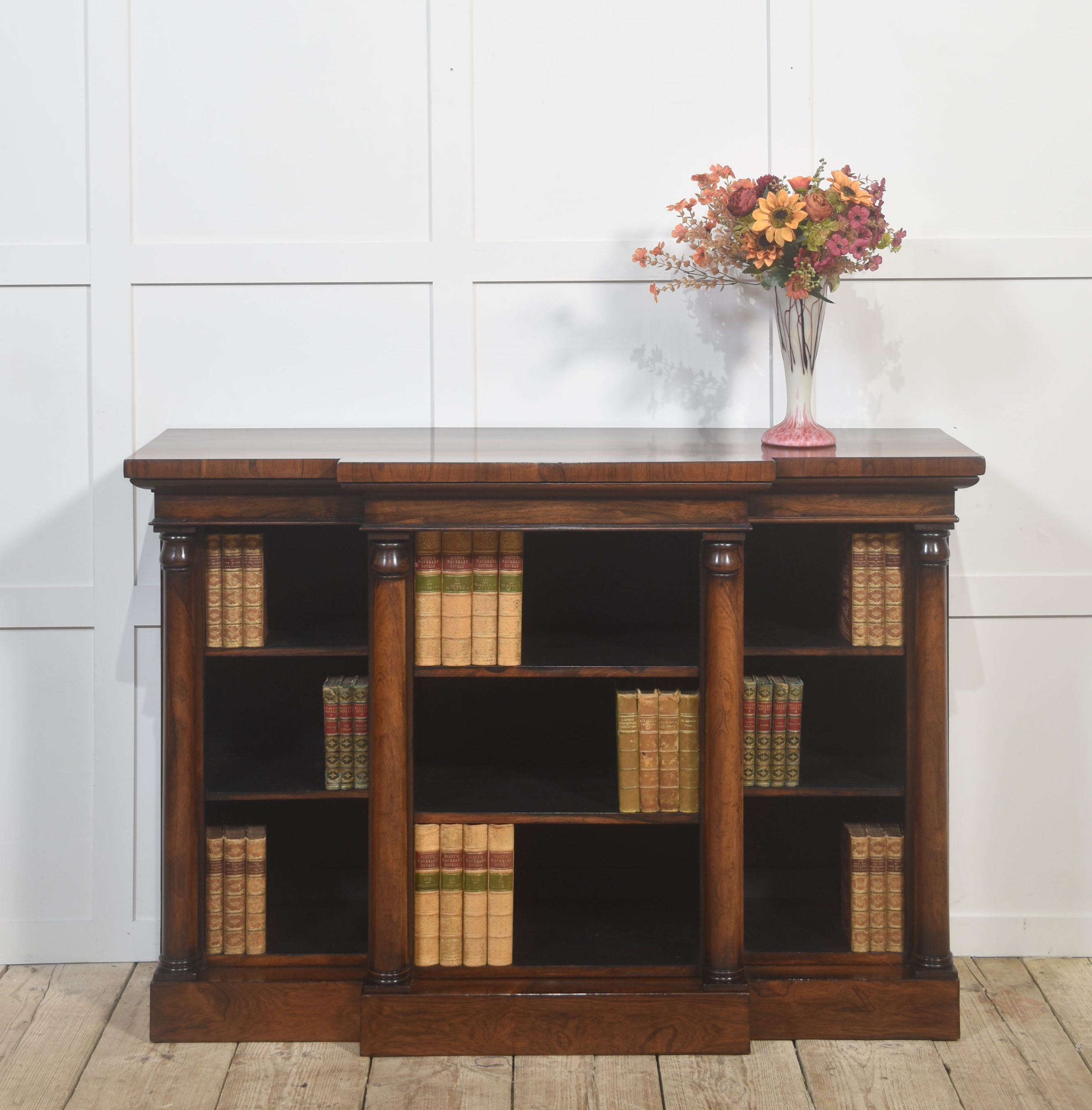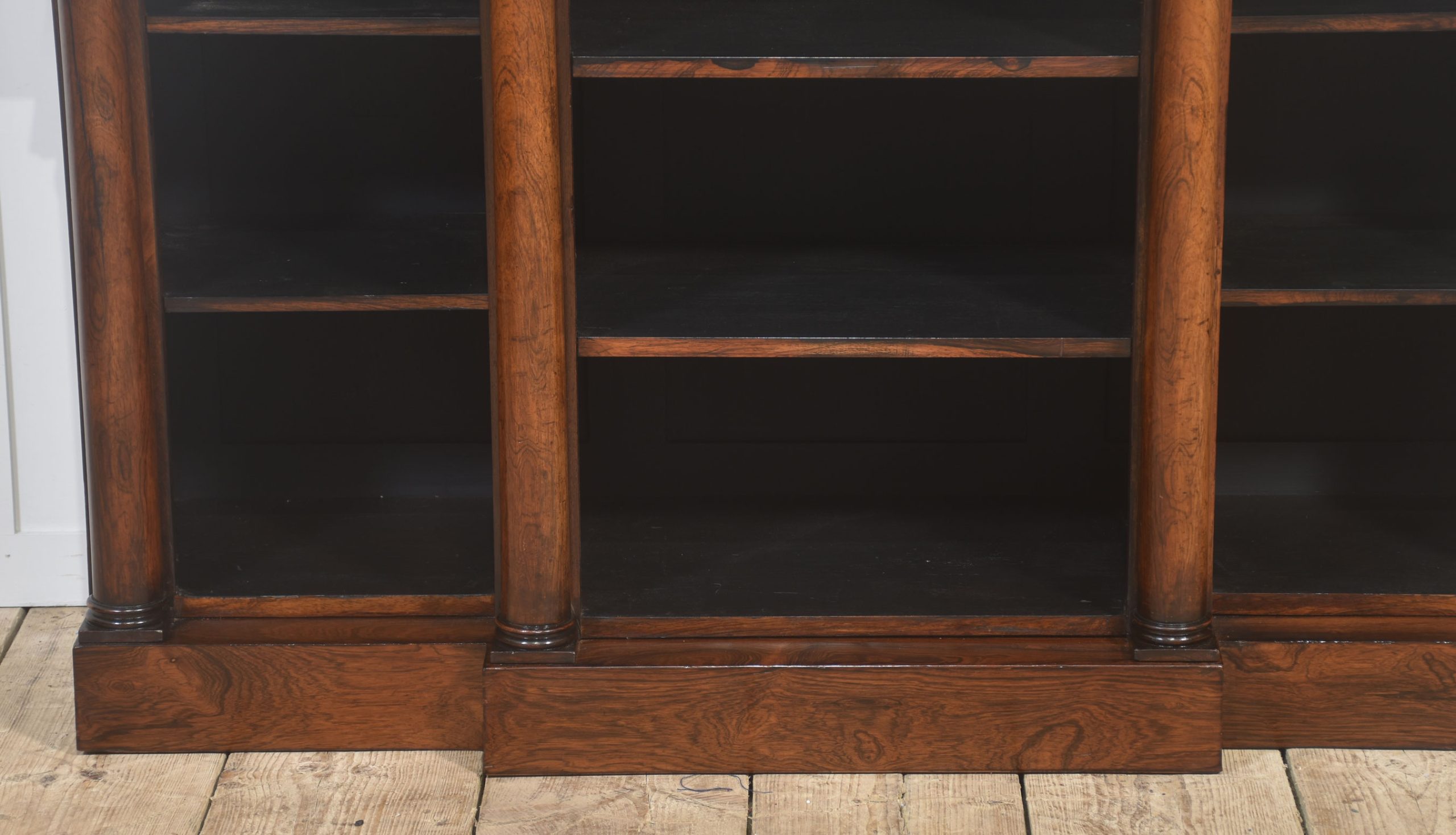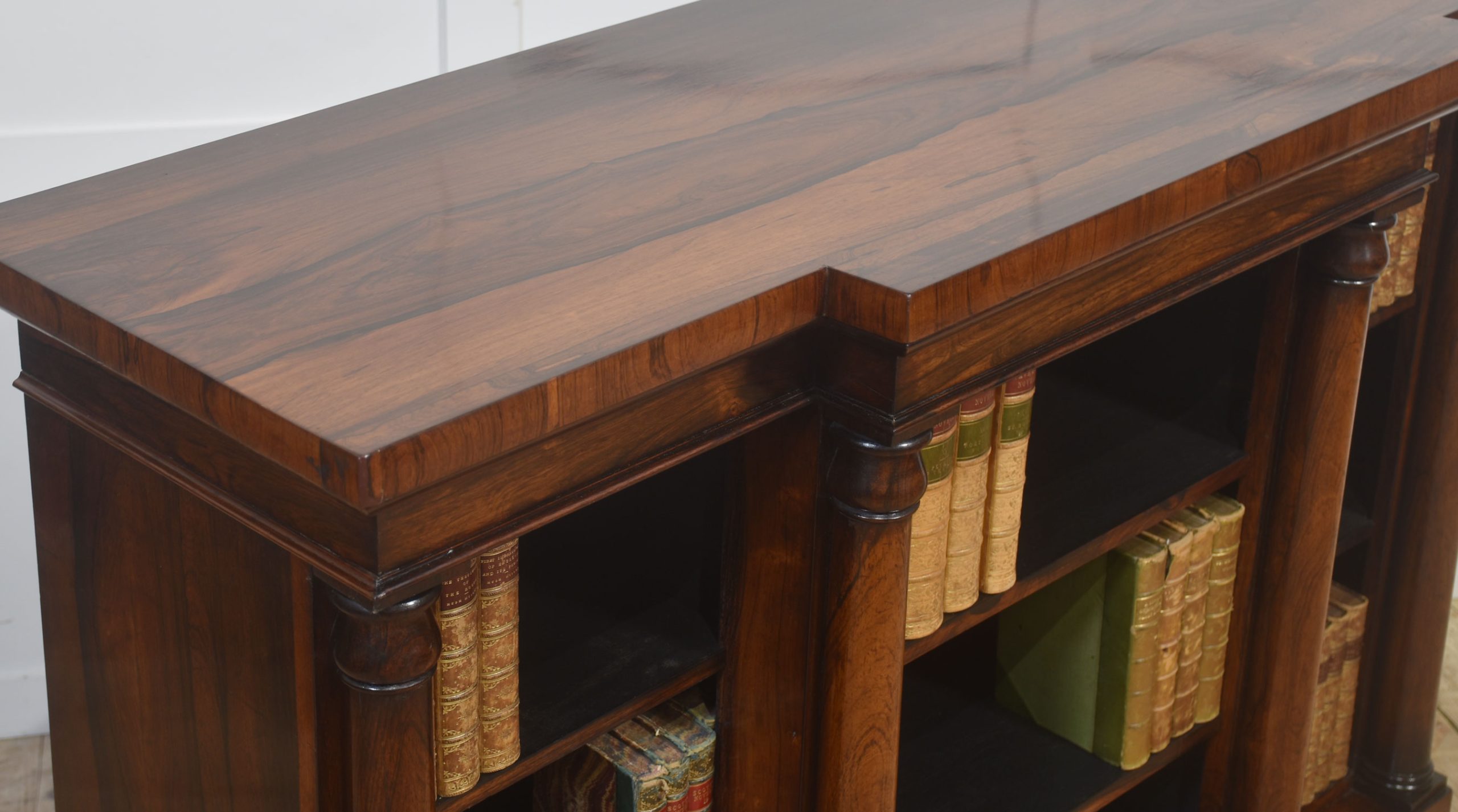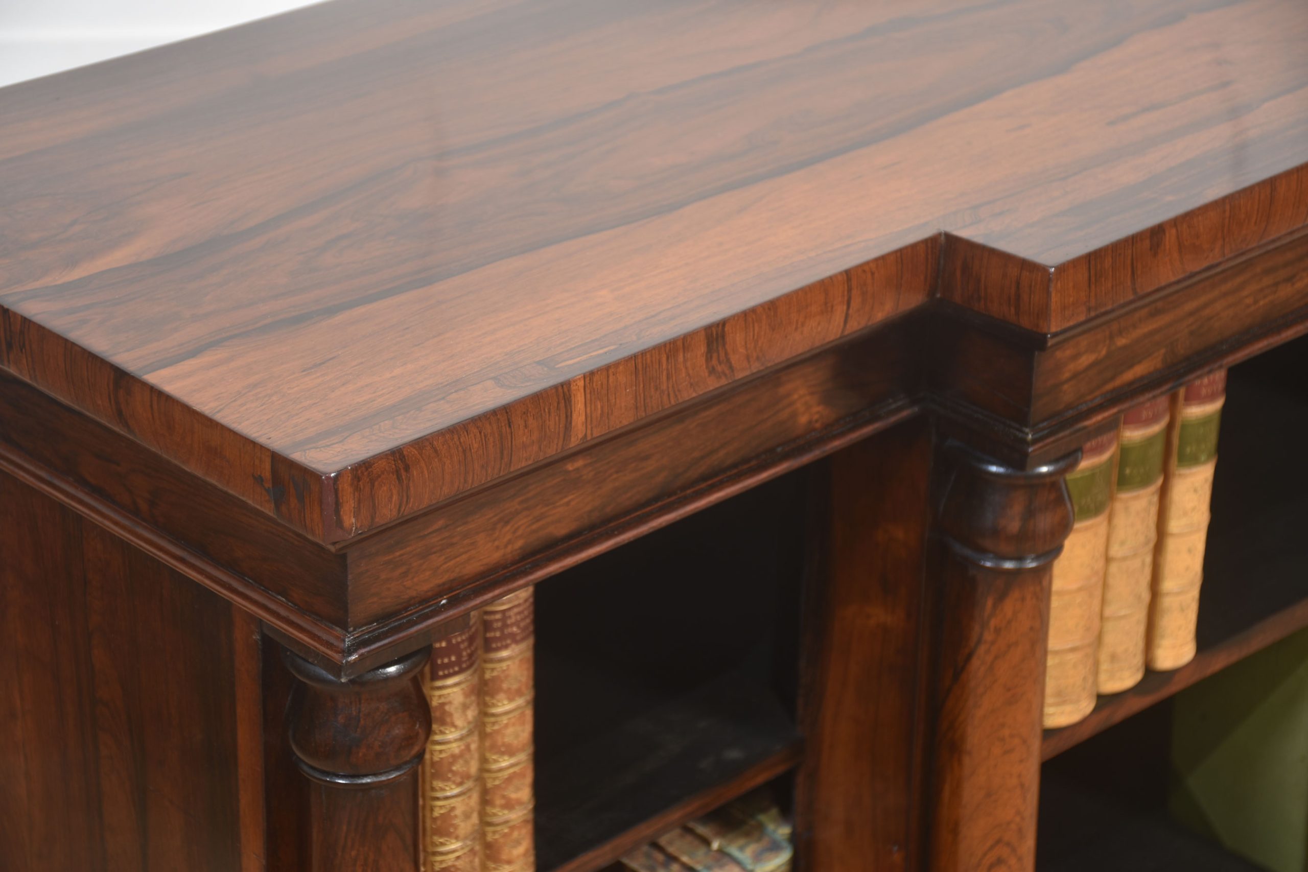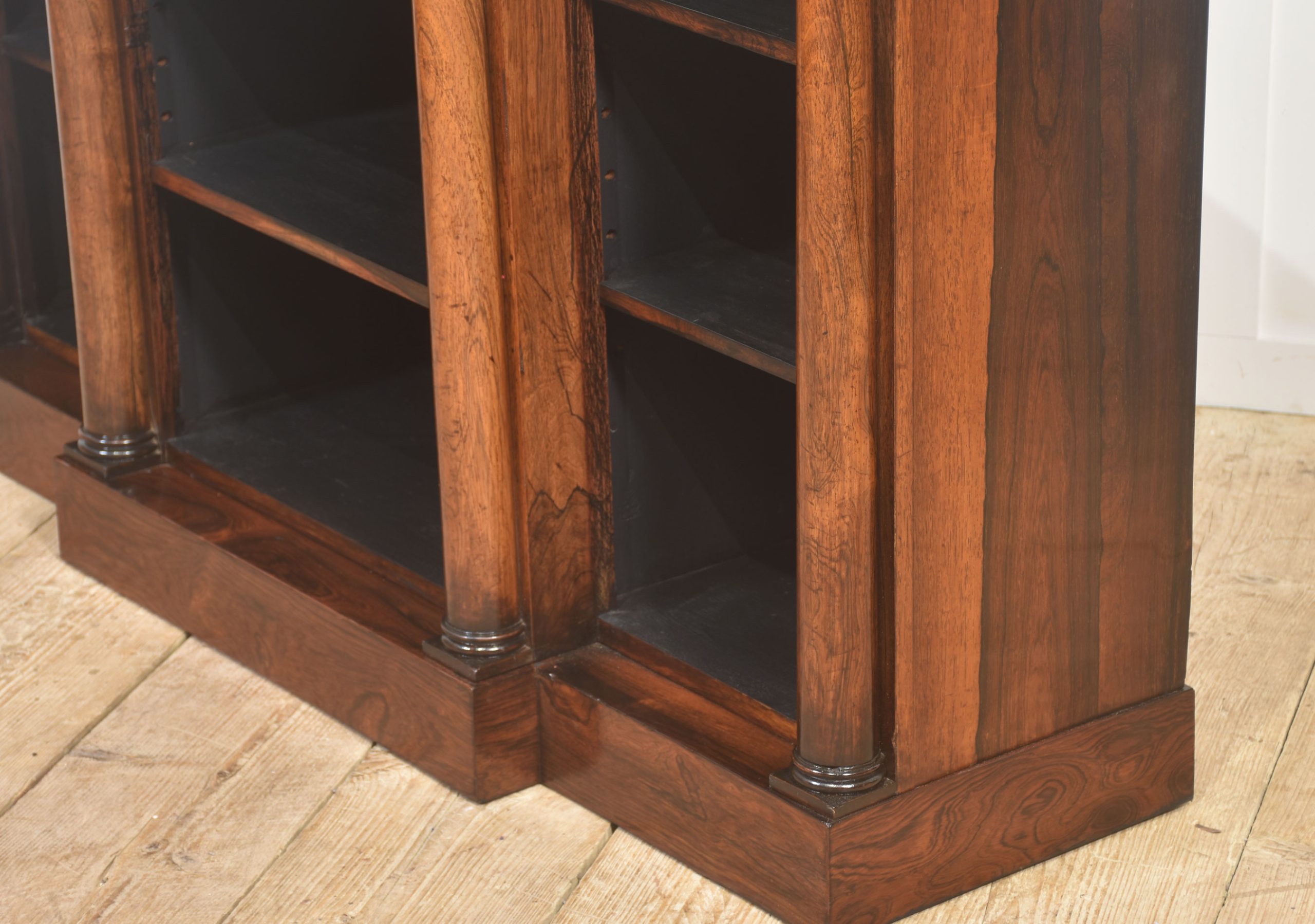 A distinguished 19th-century rosewood breakfront open bookcase of exceptional quality. The stepped breakfront top displays richly figured rosewood grain and sits above three open sections arranged in a classic breakfront formation. Each bay is flanked by substantial turned columns, adding architectural presence and visual balance. The interior is fitted with adjustable shelves, offering versatile storage for books or decorative pieces.
