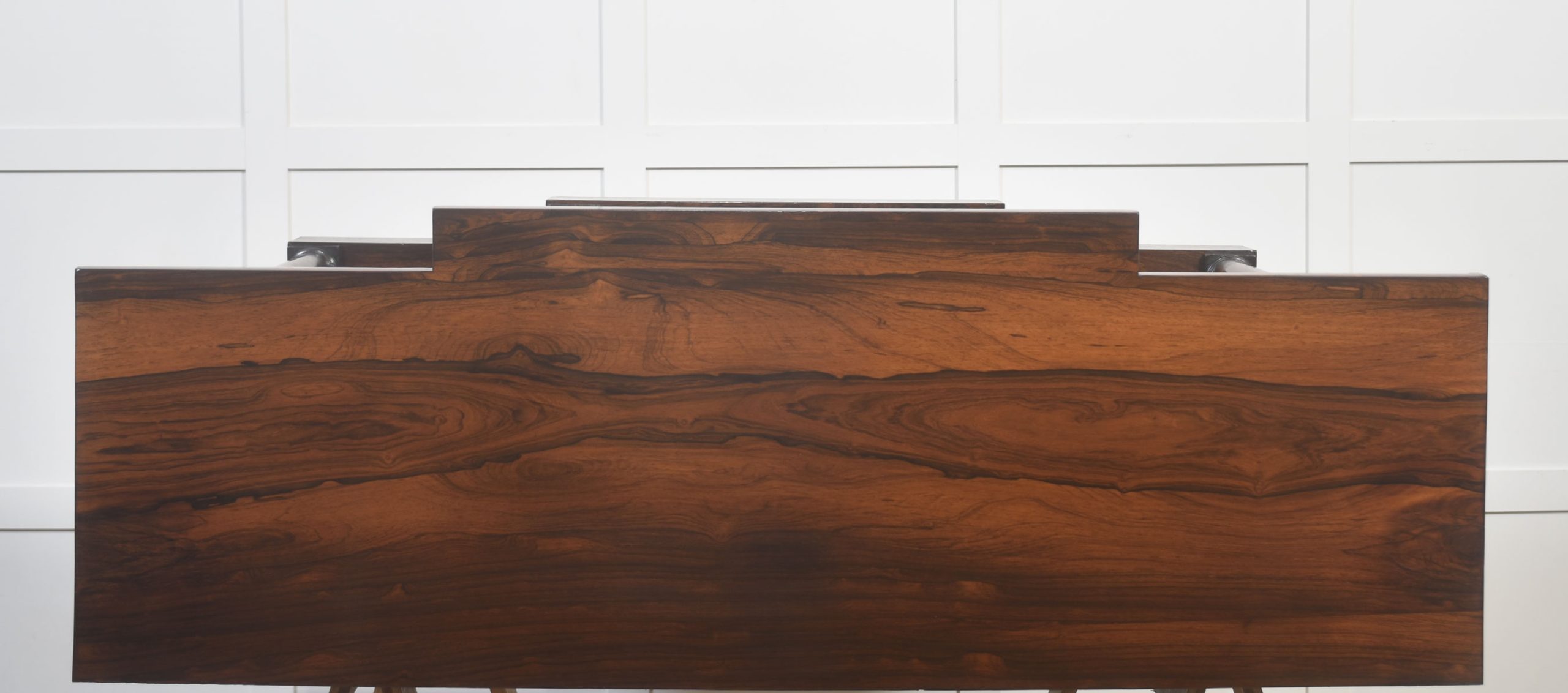The rosewood throughout is of superb colour and figuring, enhanced by a well-preserved polished finish. The piece is raised on a solid plinth base, supporting its elegant proportions and refined Regency-influenced design.