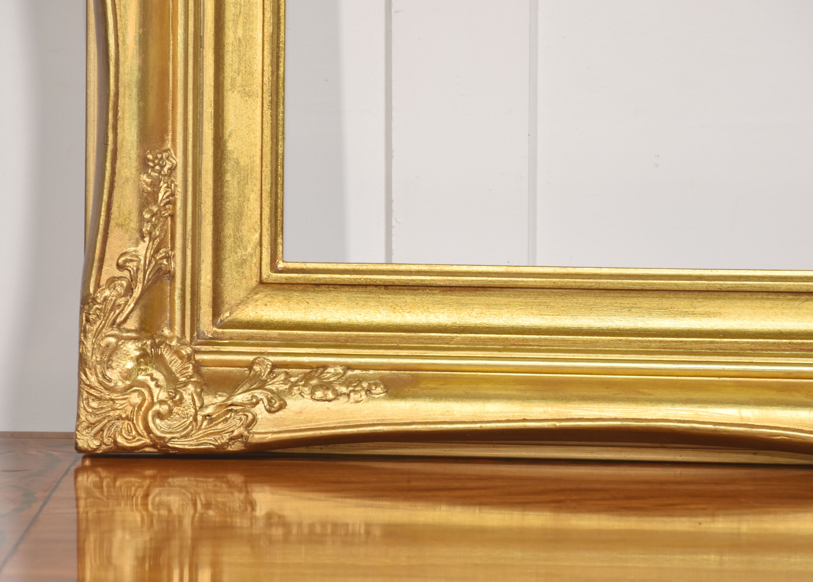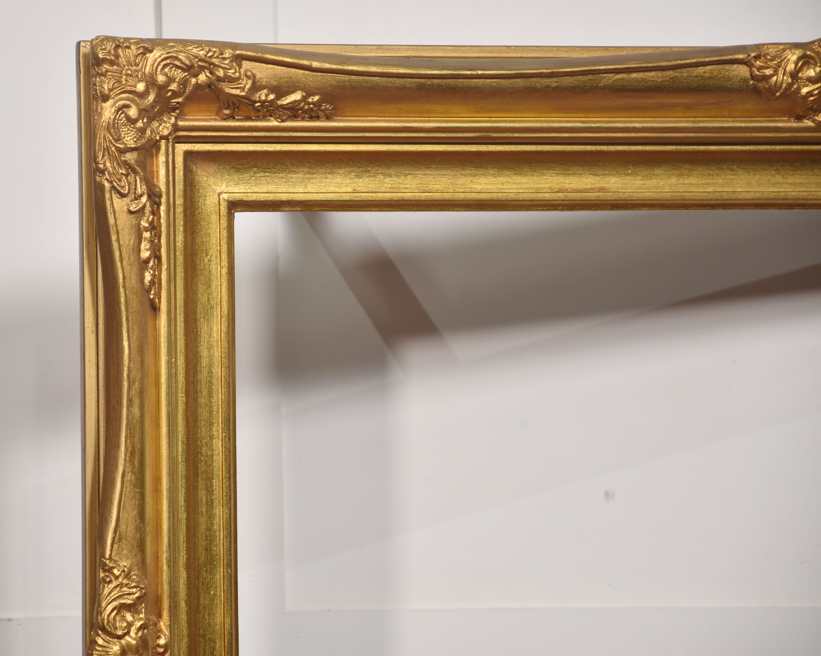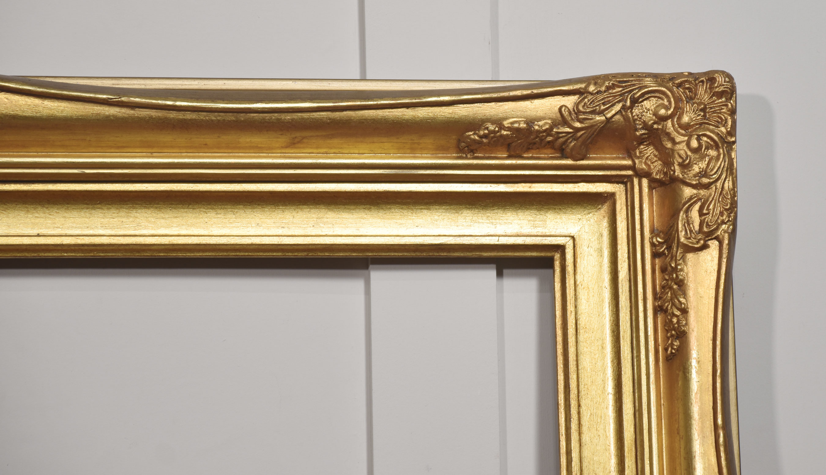 The surface is finished in a warm, burnished gold tone, with variations in the gilding that accentuate the depth and movement of the carving. The inner sight edge is defined by a stepped moulding, providing a visual transition from the elaborate outer border to the picture aperture.