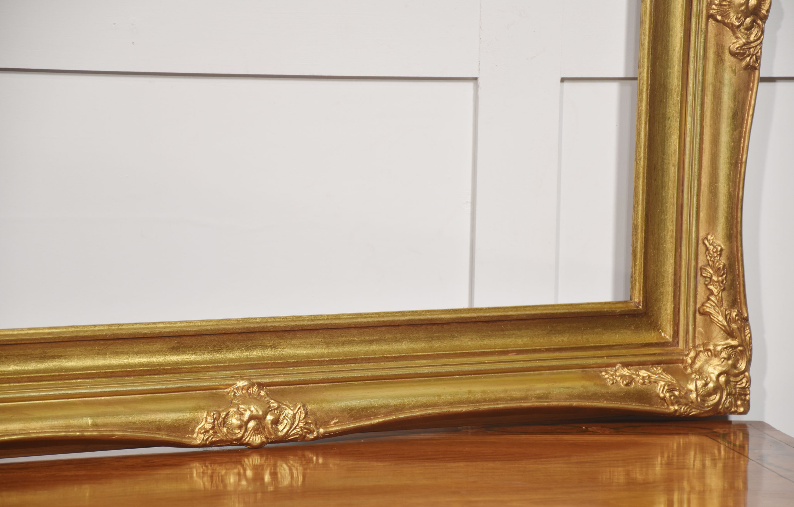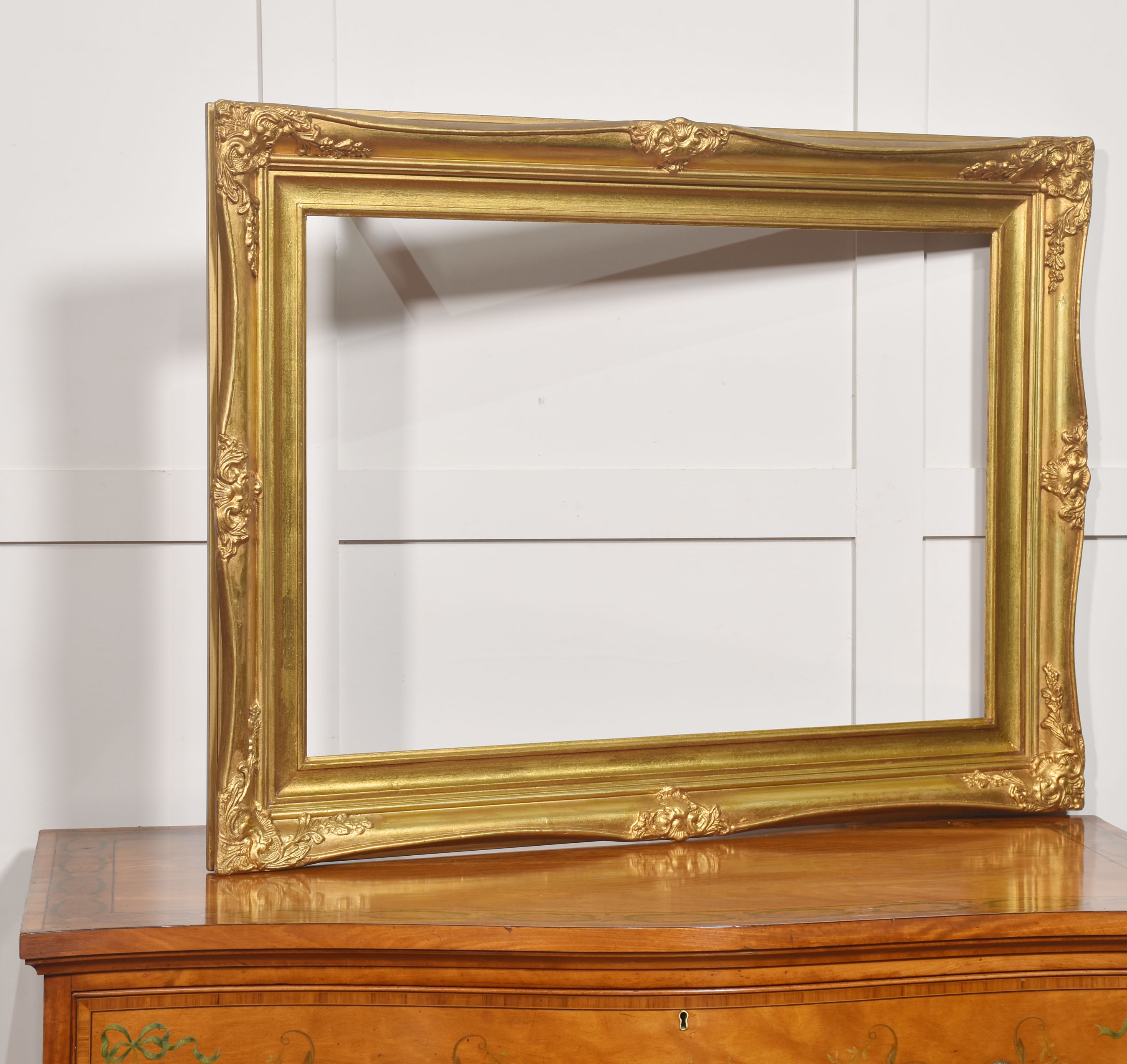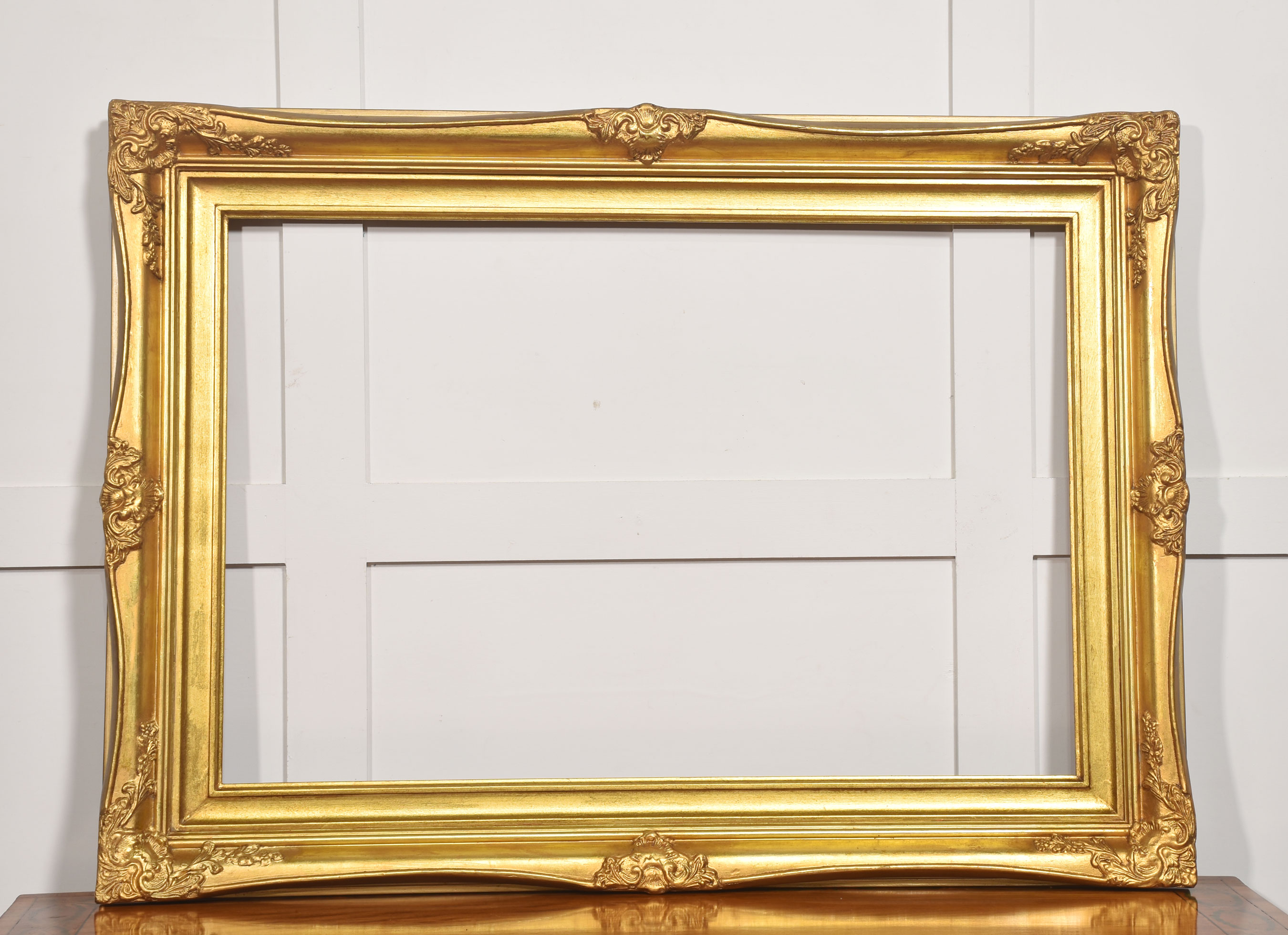 The surface is finished in a warm, burnished gold tone, with variations in the gilding that accentuate the depth and movement of the carving. The inner sight edge is defined by a stepped moulding, providing a visual transition from the elaborate outer border to the picture aperture.