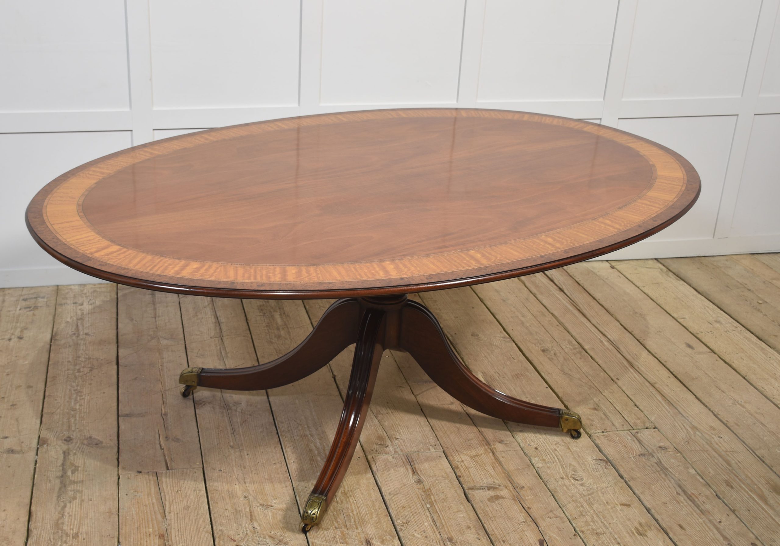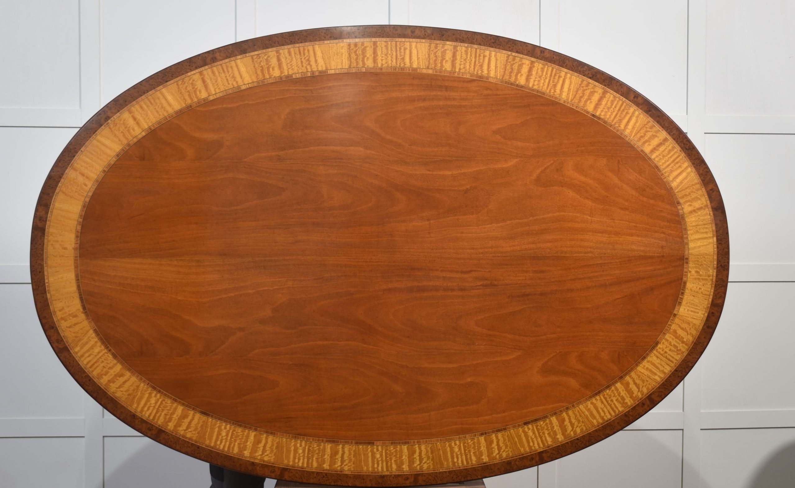 A superb quality Regency-style oval mahogany dining table, featuring a beautifully figured mahogany top with an exquisite satinwood and burr walnut crossbanded border, accentuated by fine string inlay. The table’s surface has a rich, polished finish that highlights the depth and character of the wood grain.