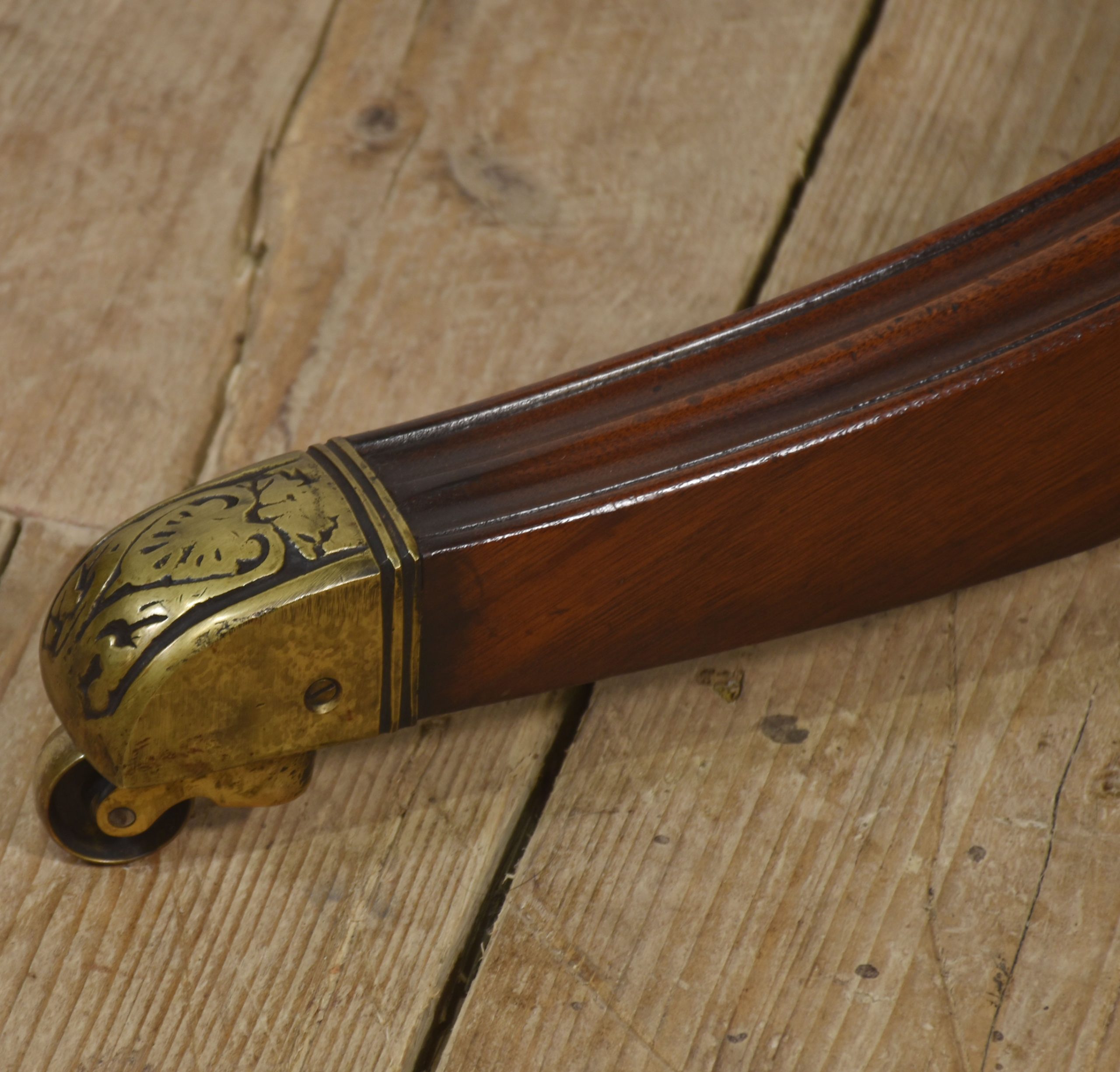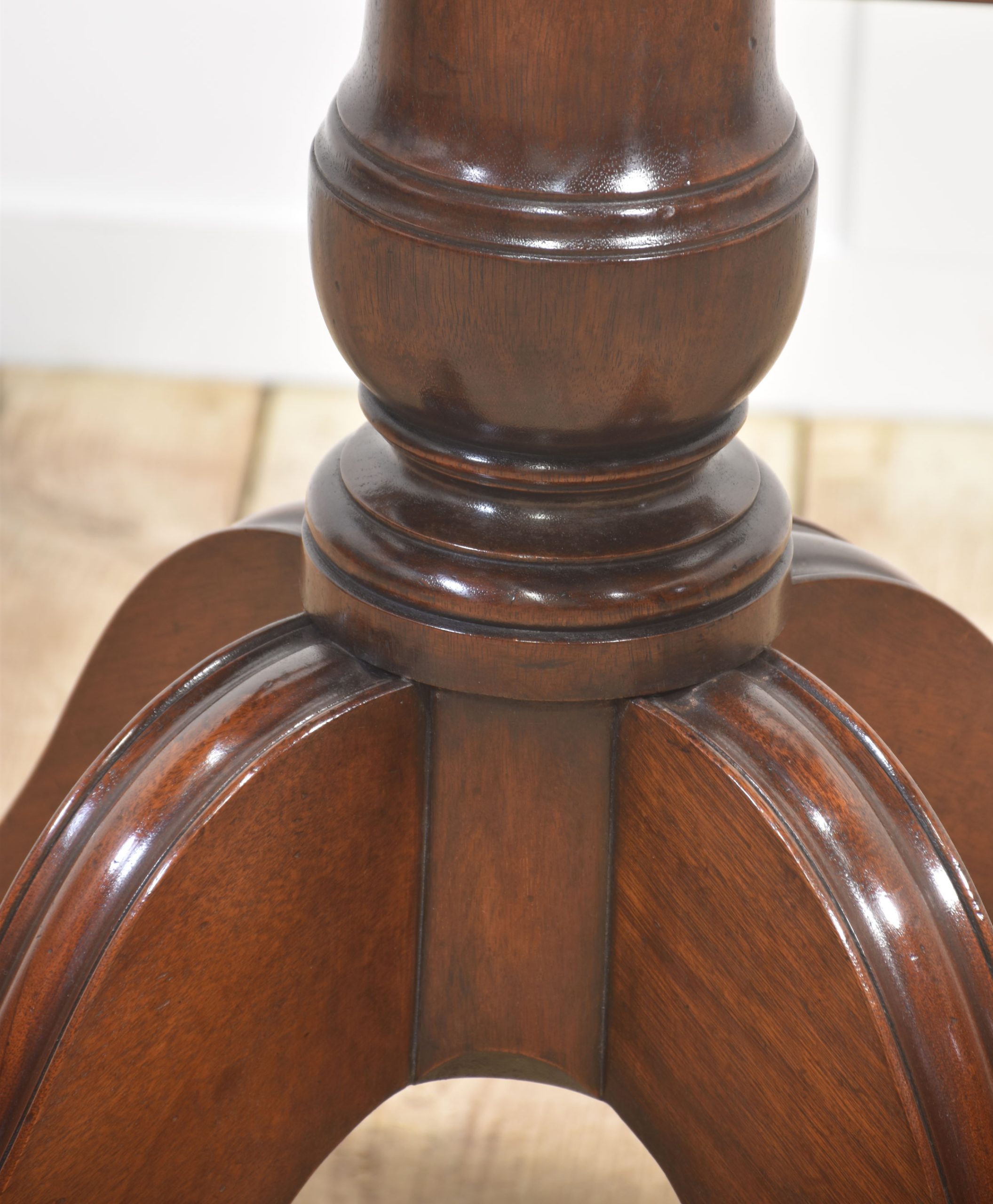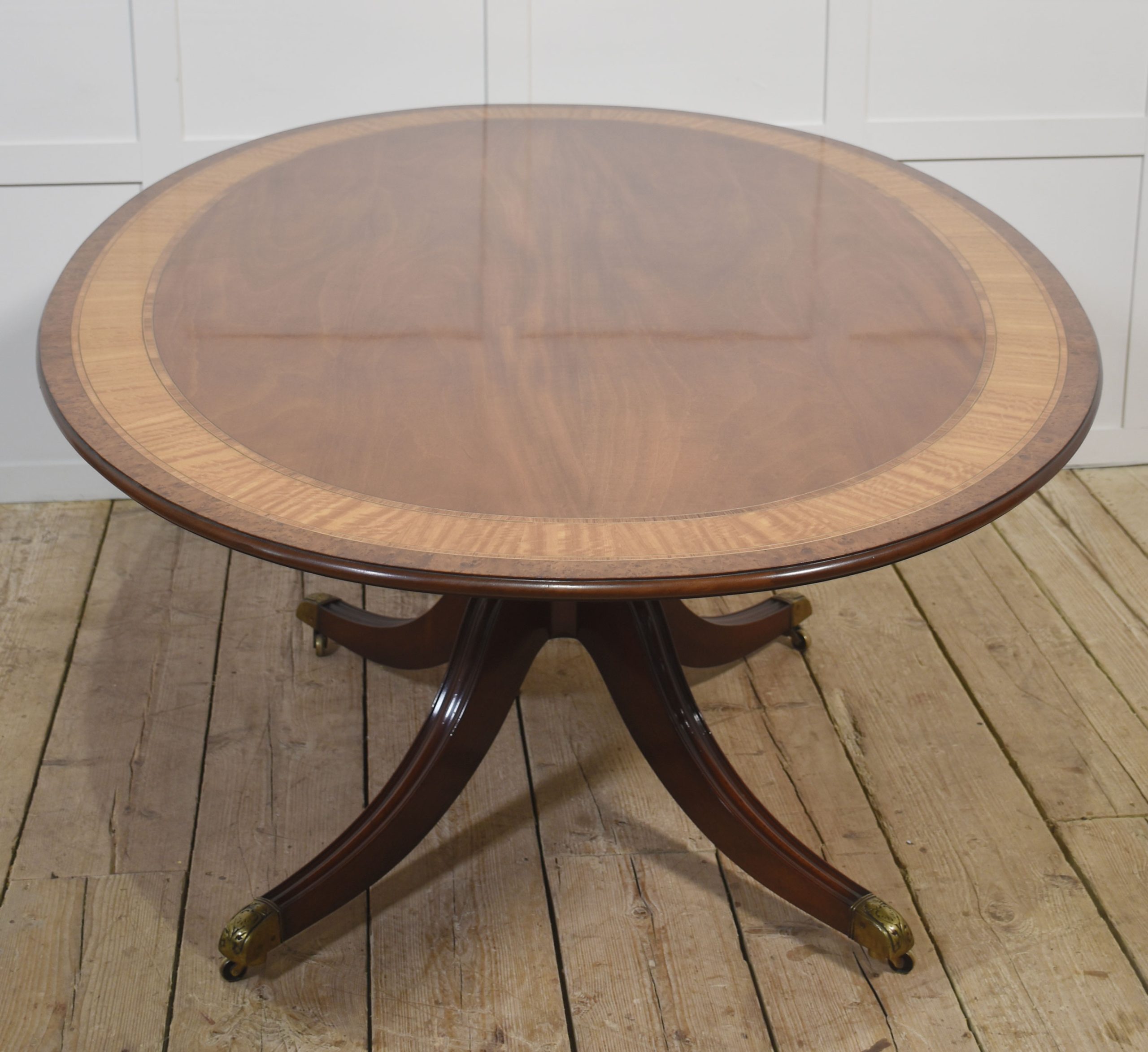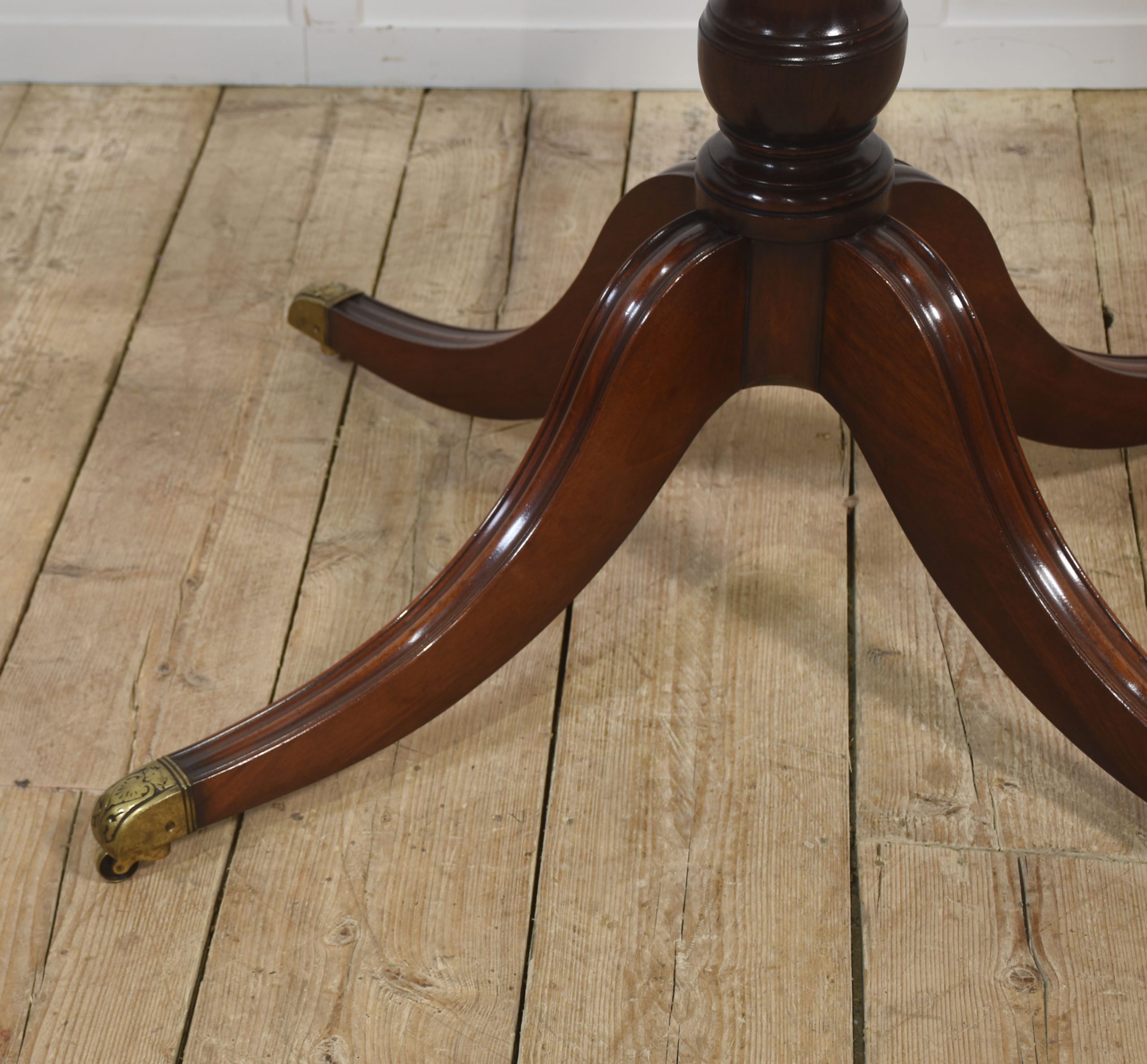 Supported by a central turned pedestal base, the table stands on four elegant splayed legs terminating in brass caps and castors, combining both style and practicality. The craftsmanship throughout is exceptional, reflecting traditional Regency design with timeless appeal.
