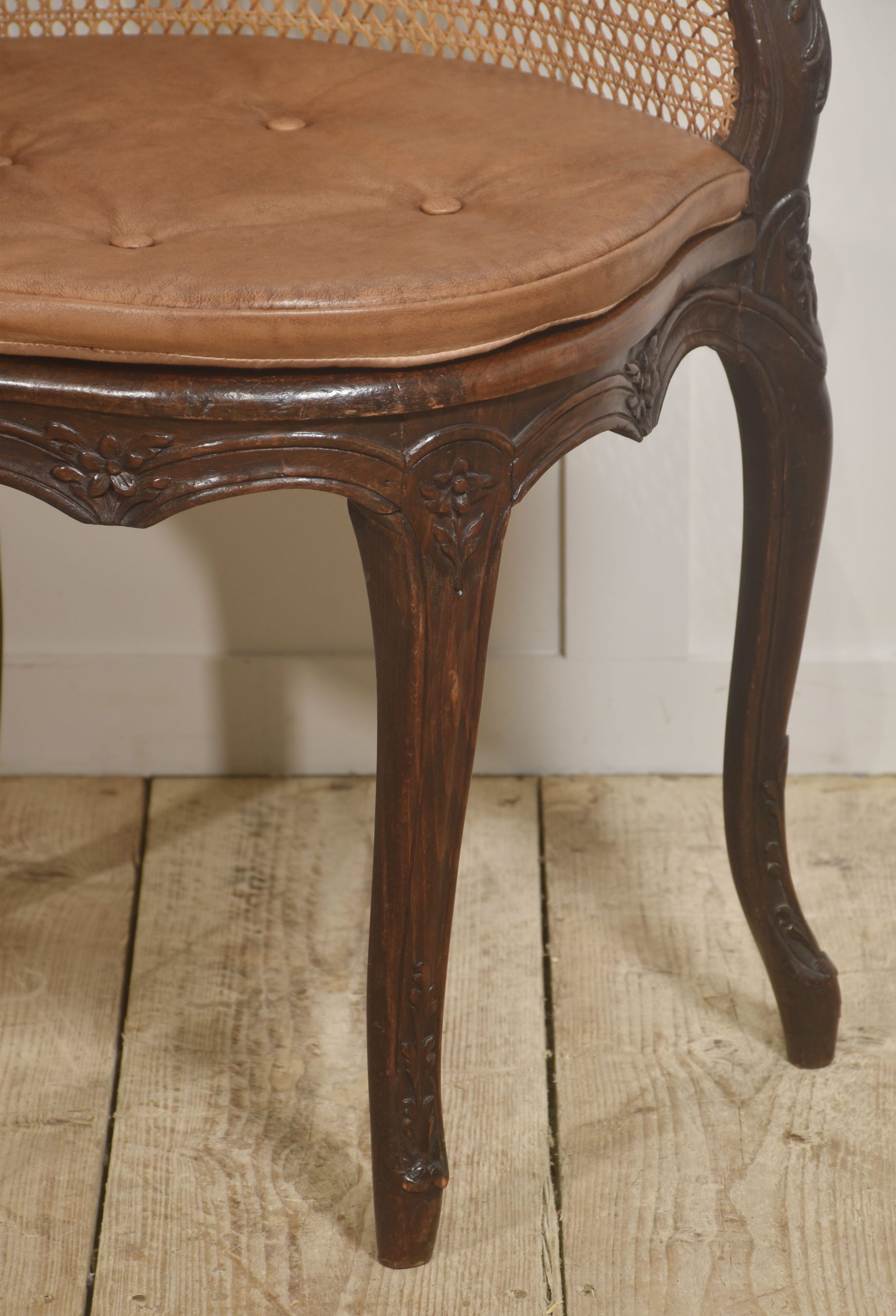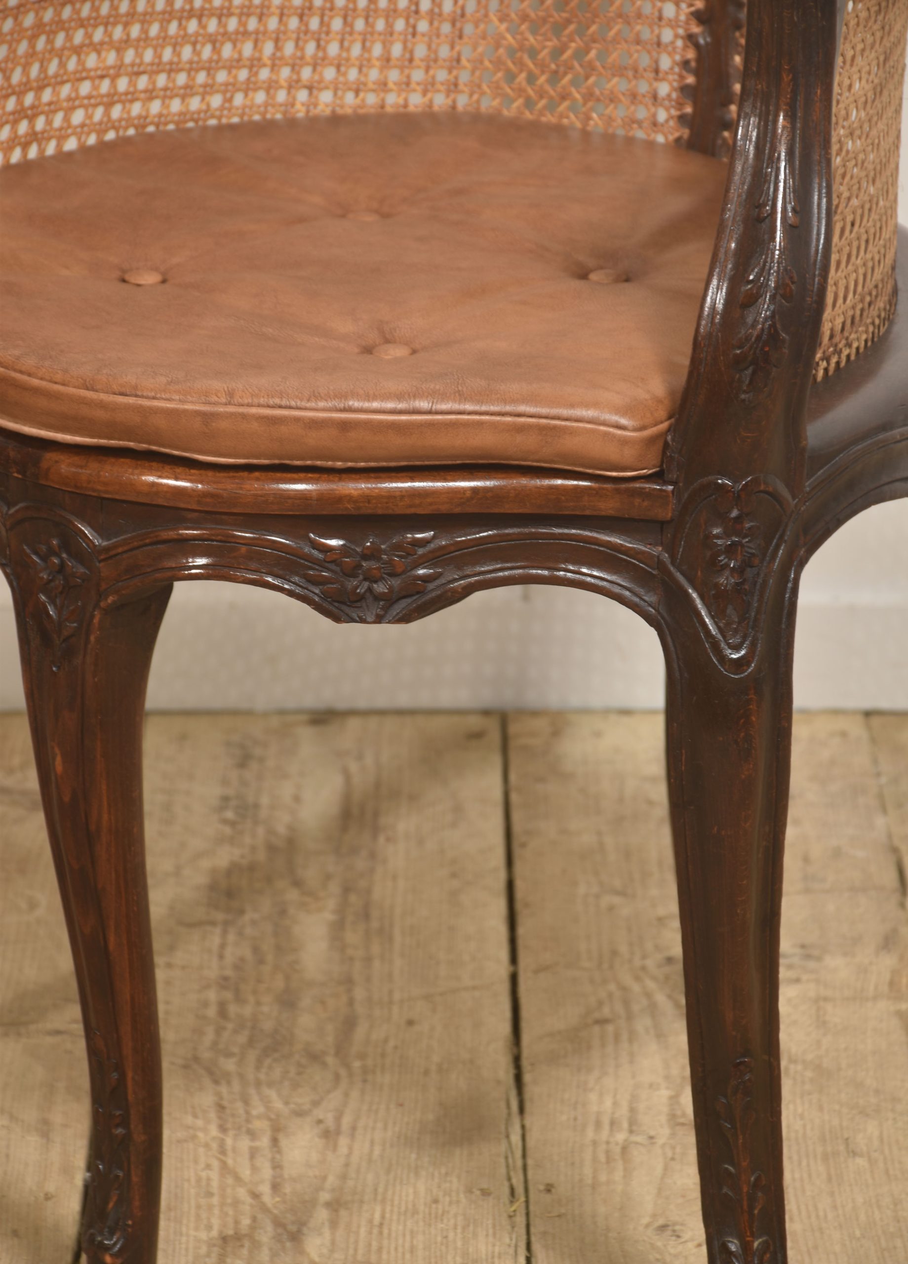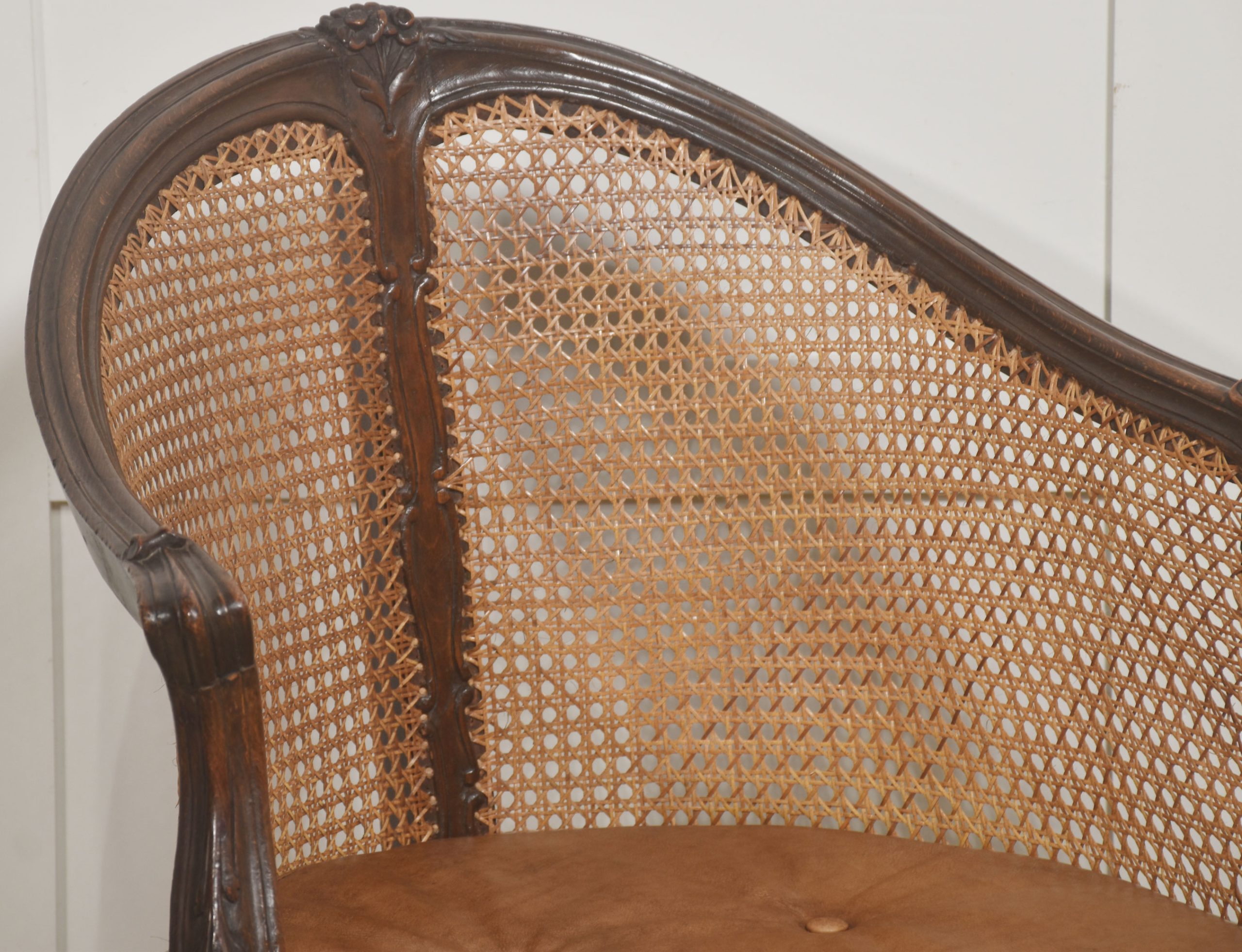 A finely modeled French bergère chair executed in richly patinated carved oak, displaying elegant Rococo Revival influence. The asymmetrical, serpentine crest rail flows into a gracefully contoured horseshoe-shaped back, fitted throughout with finely woven natural cane. The shaped arms descend in a continuous sweep to join the seat rail, reinforcing the chair’s fluid, sculptural profile.