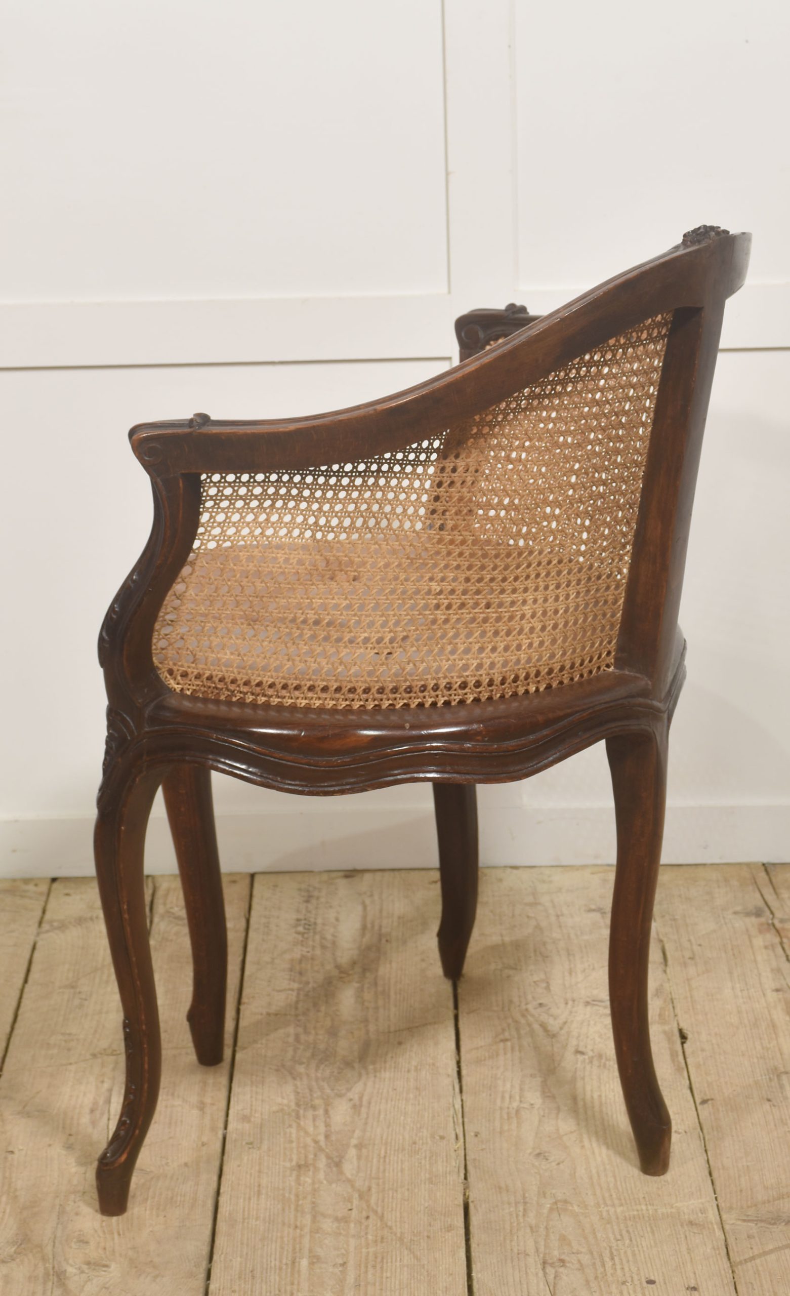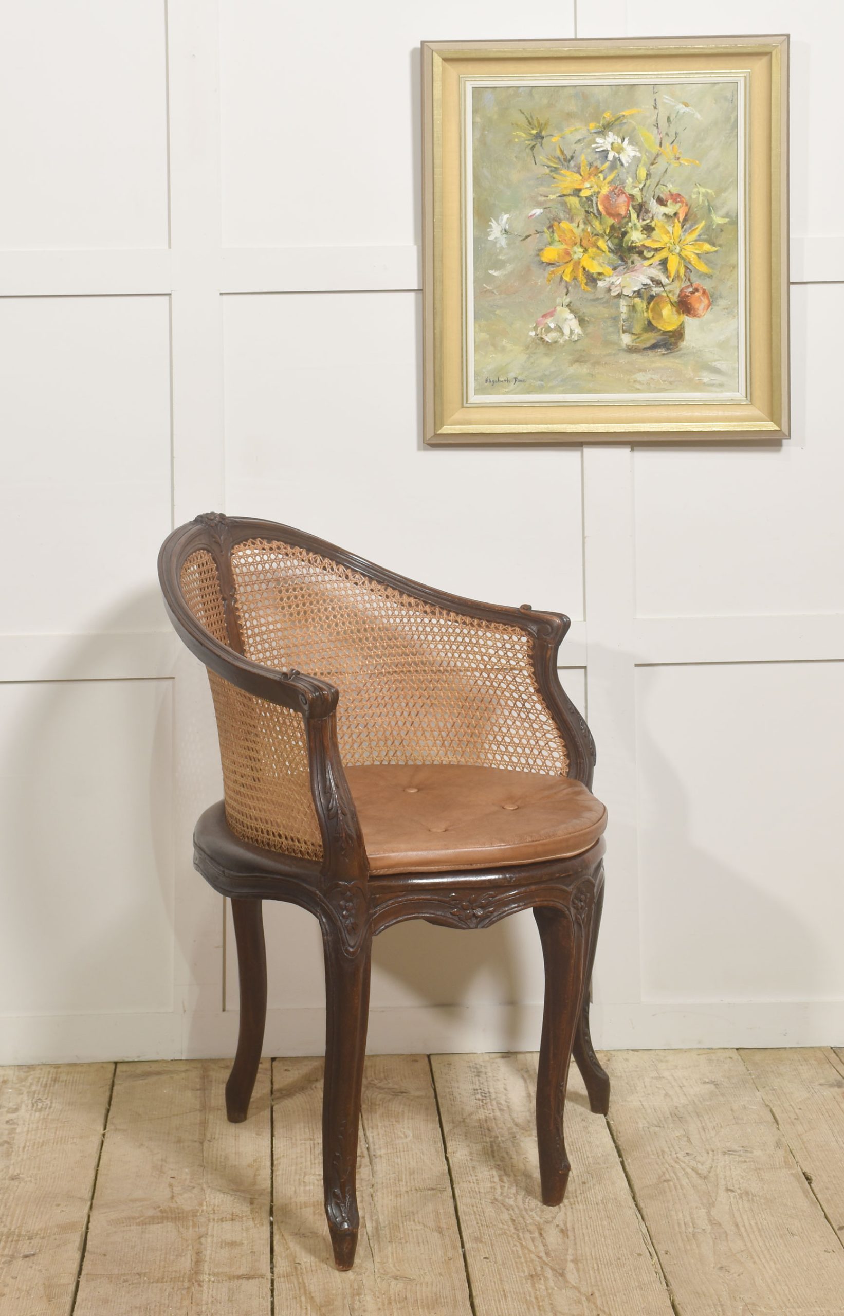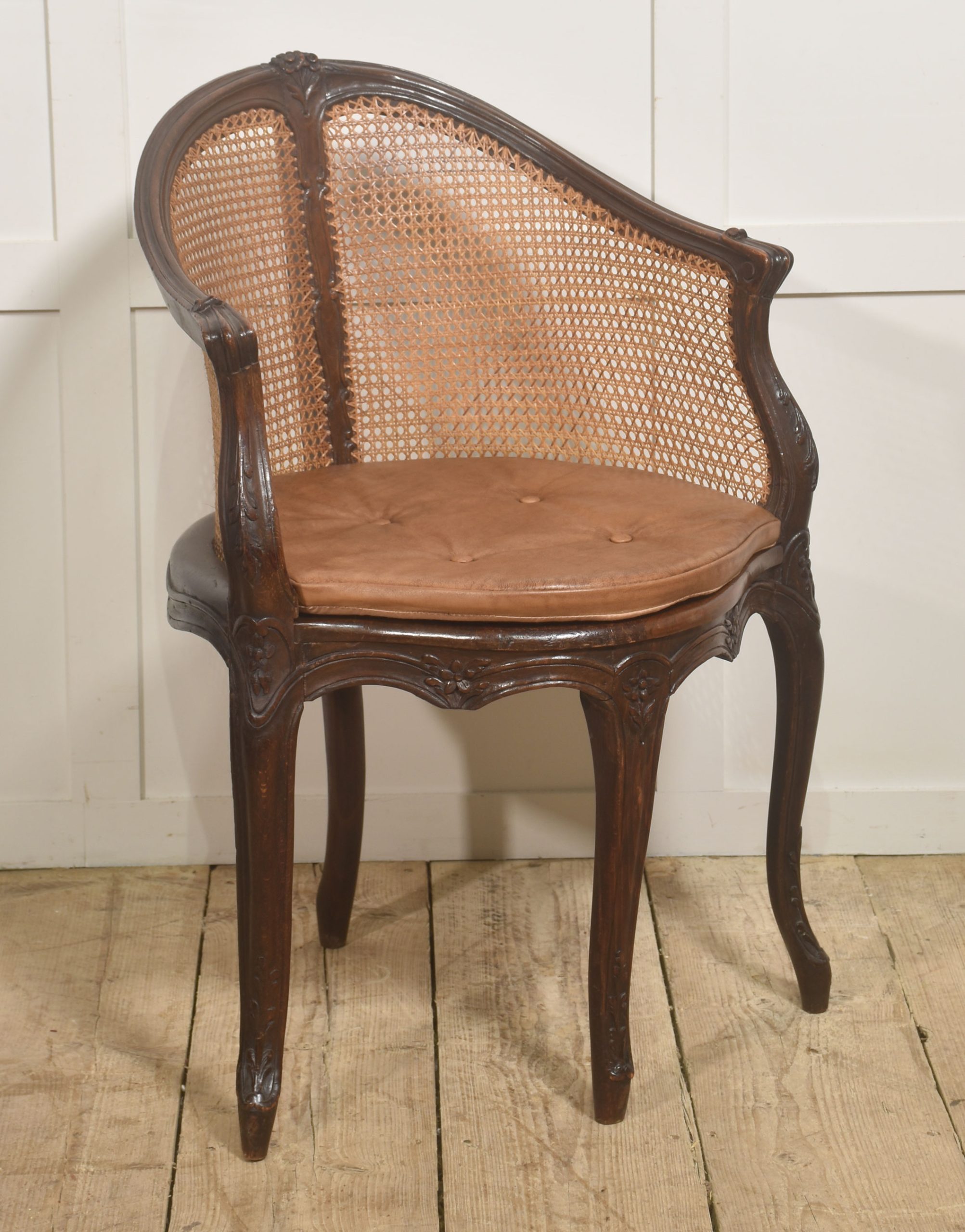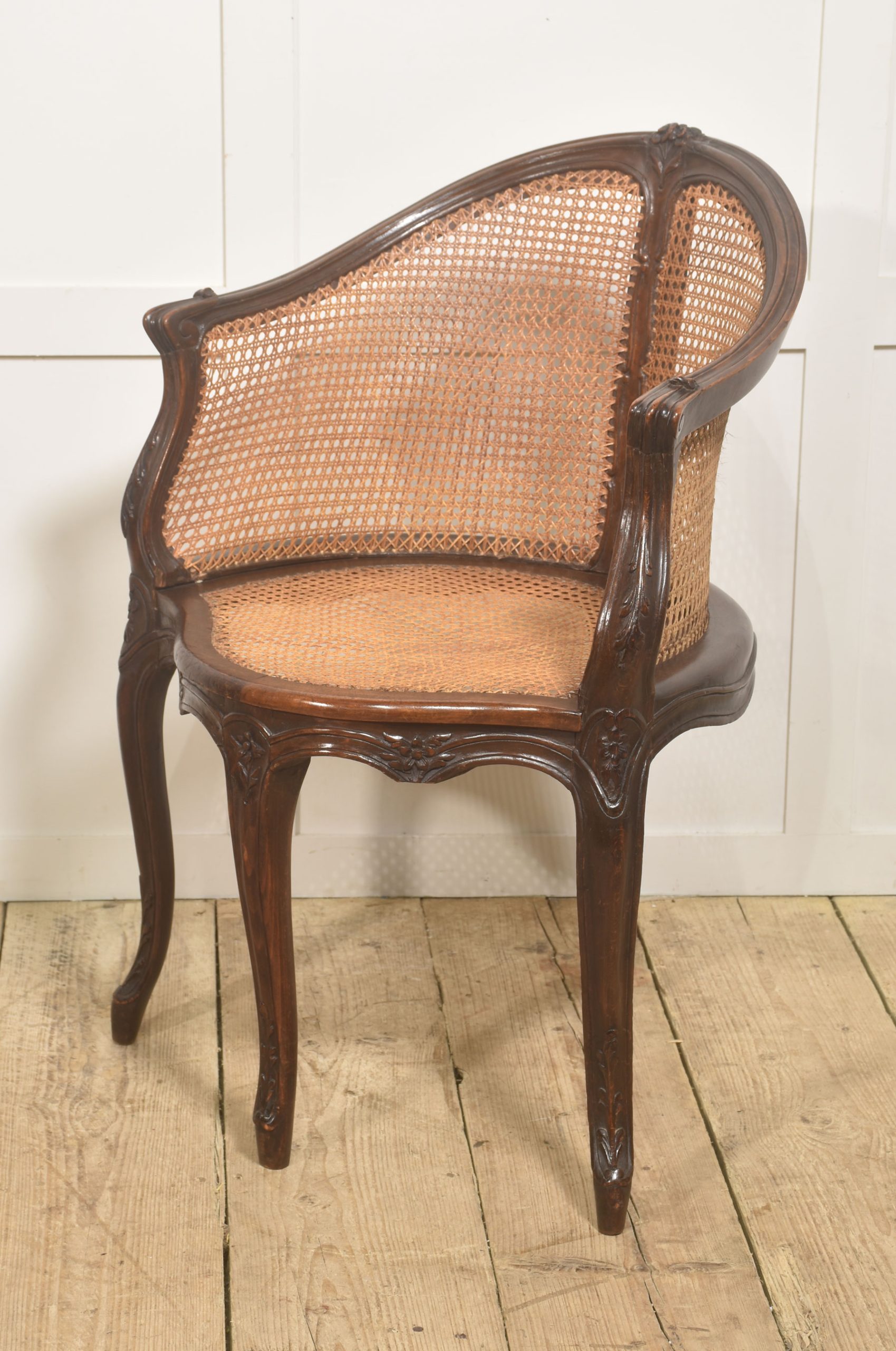 A finely modeled French bergère chair executed in richly patinated carved oak, displaying elegant Rococo Revival influence. The asymmetrical, serpentine crest rail flows into a gracefully contoured horseshoe-shaped back, fitted throughout with finely woven natural cane. The shaped arms descend in a continuous sweep to join the seat rail, reinforcing the chair’s fluid, sculptural profile.