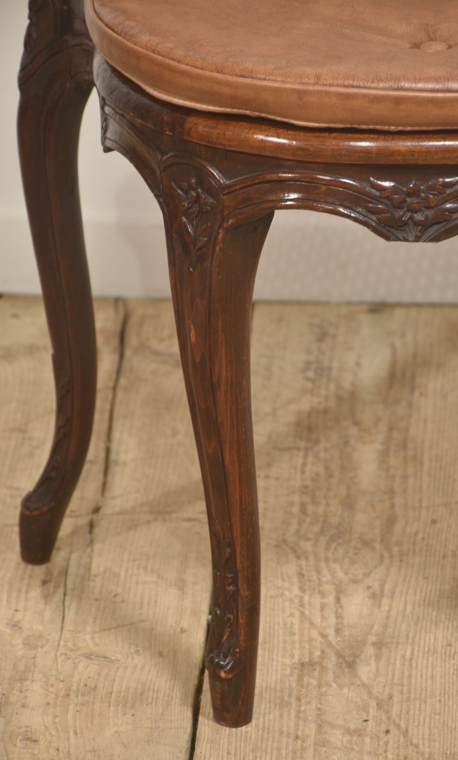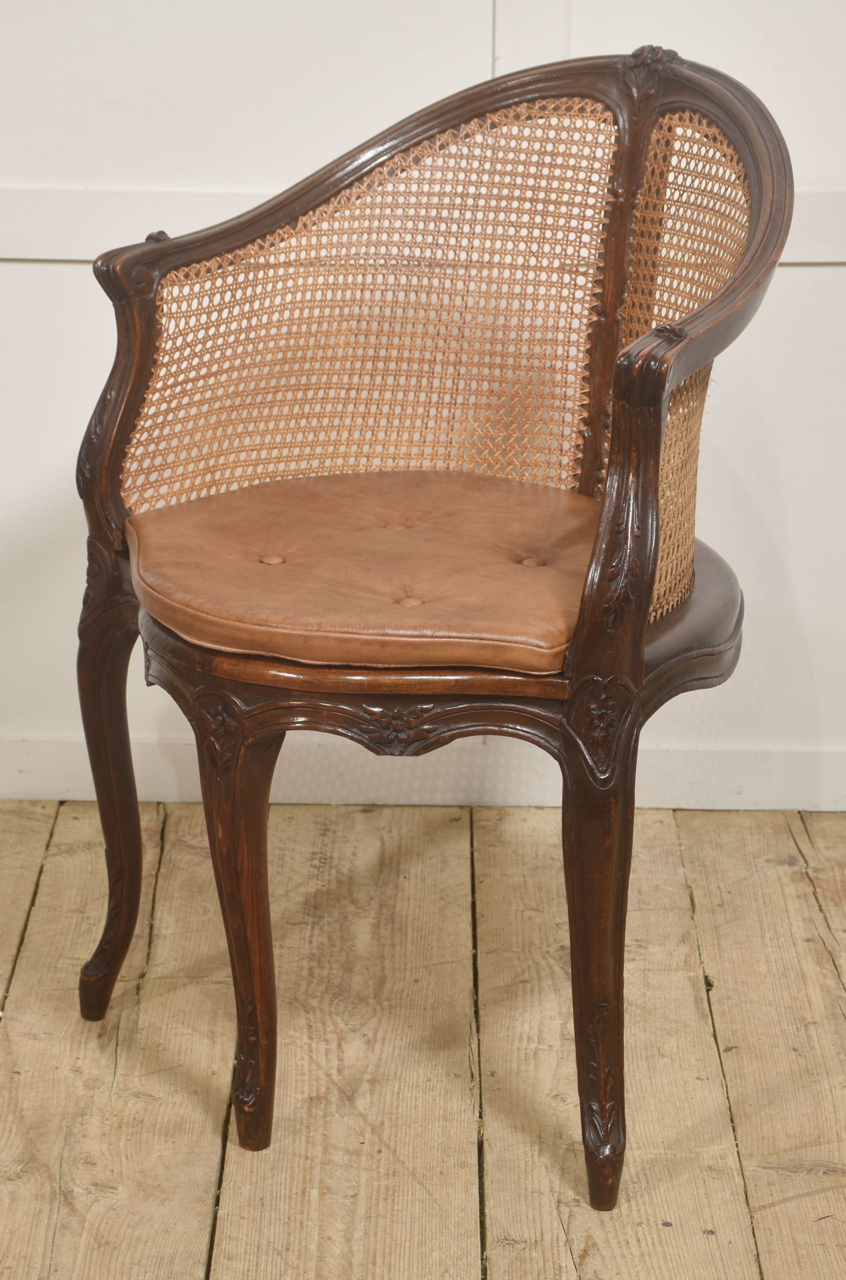 The seat is fitted with a removable, shaped cushion upholstered in tan leather (or leatherette), button-tufted and tailored to the frame; the original caned seat remains intact beneath.