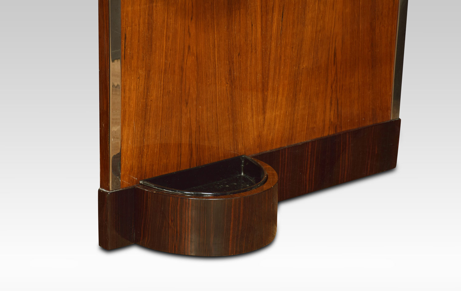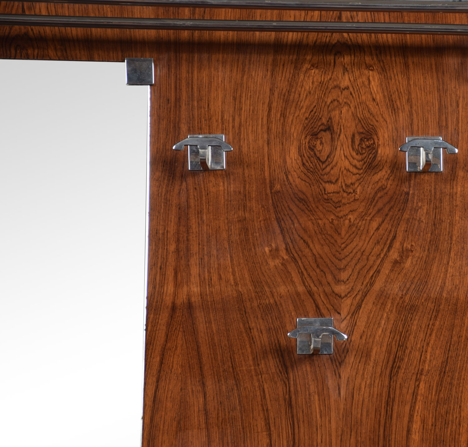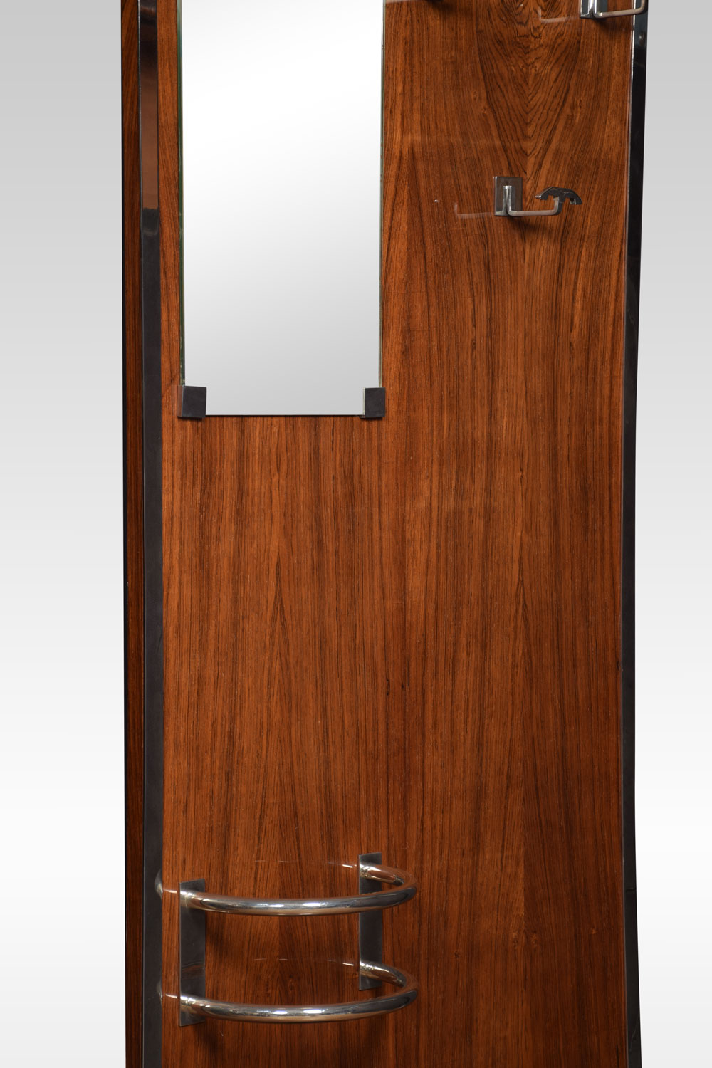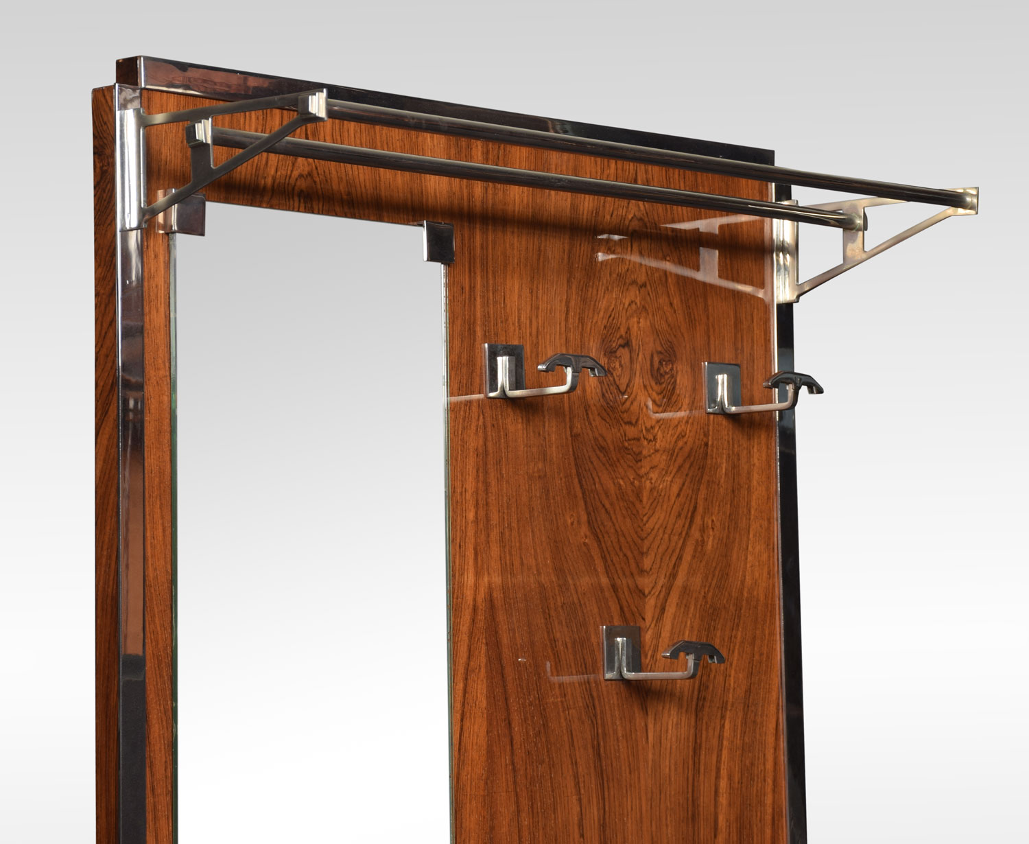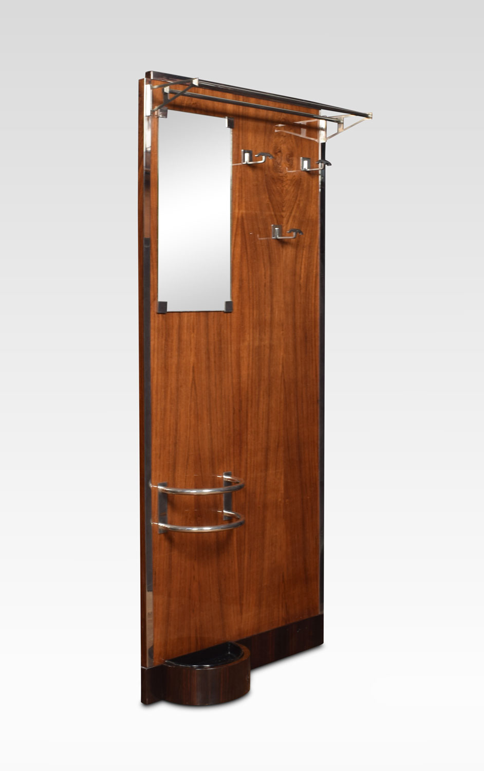 Art Deco Hall Stand the rosewood frame enclosed in chrome border. the top with hat shelf above three coat hooks and original plate mirror. The base fitted with umbrella stand raised on macassar plinth.