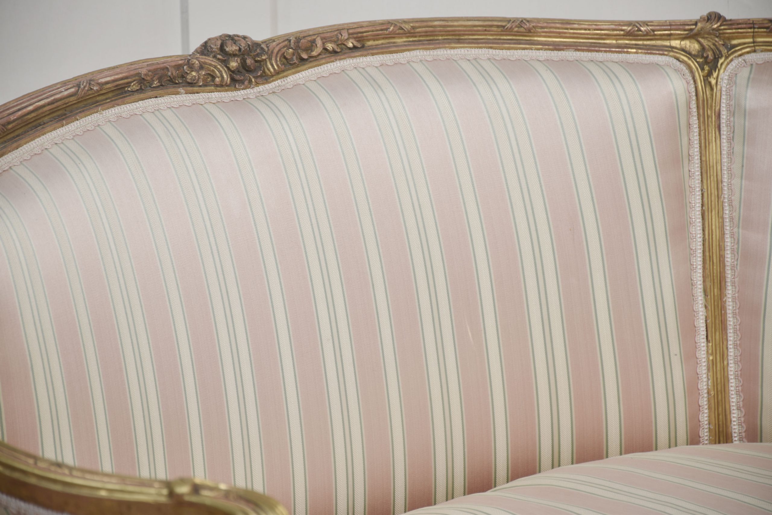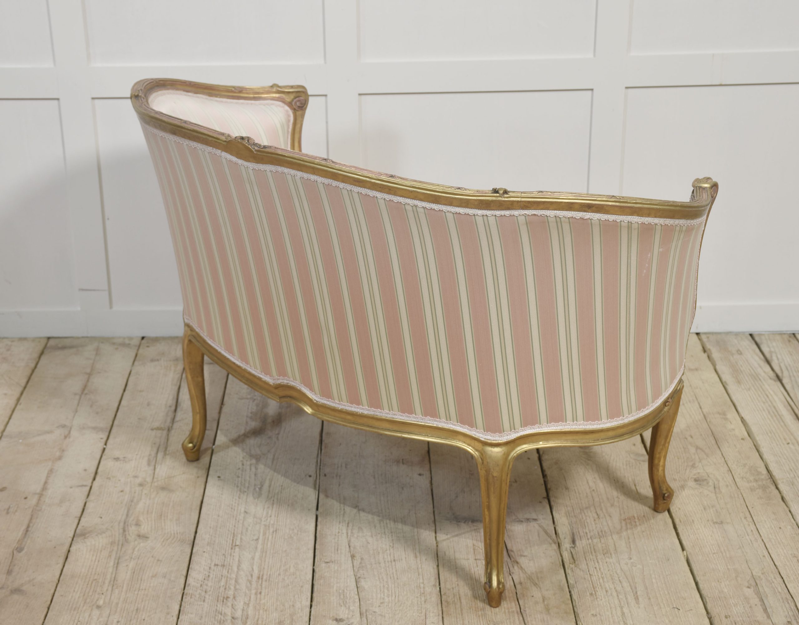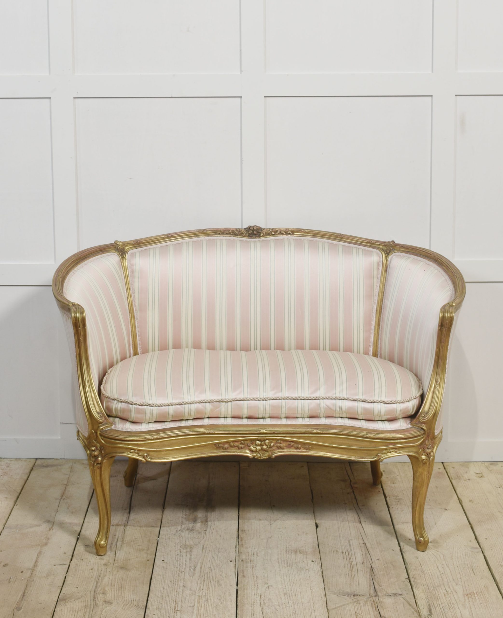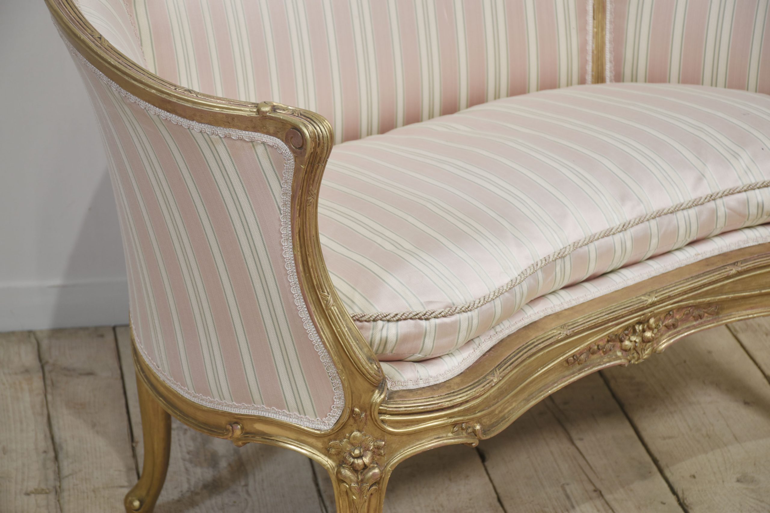 French Louis XV-Style Giltwood Two-Seater Canape settee, late 19th century, upholstered in pink, beige and green striped fabric, the reeded frame decorated with flowers and scrolls, with moulded hand grips above a removable cushion. The moulded seat rail on flower-carved cabriole front legs.