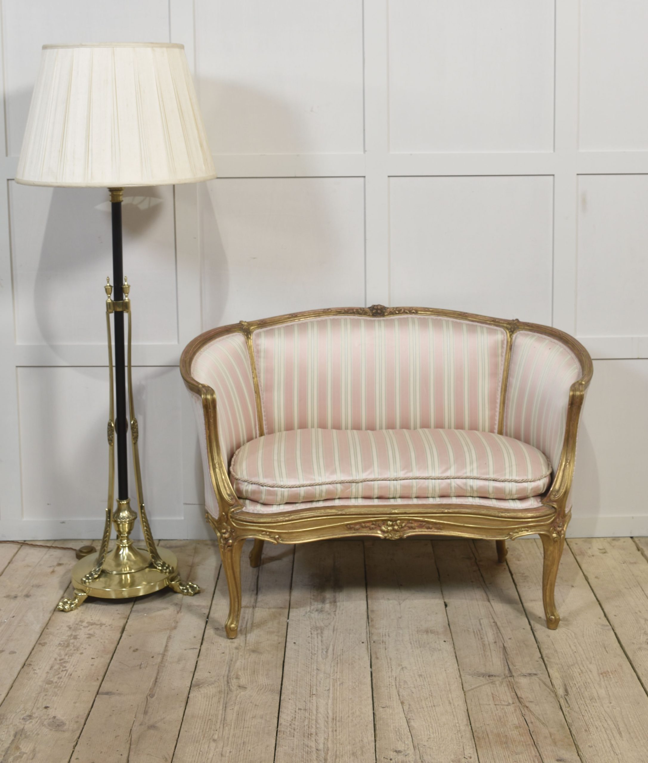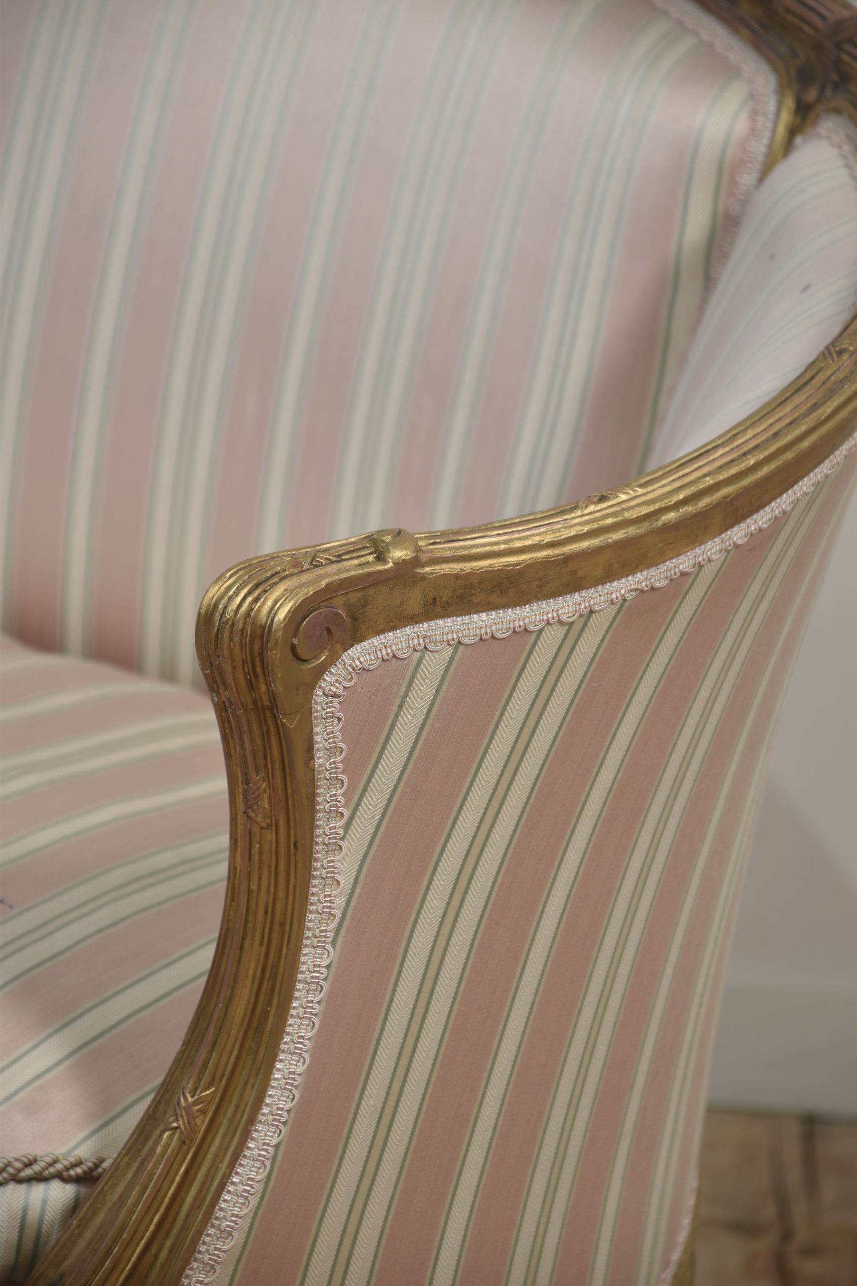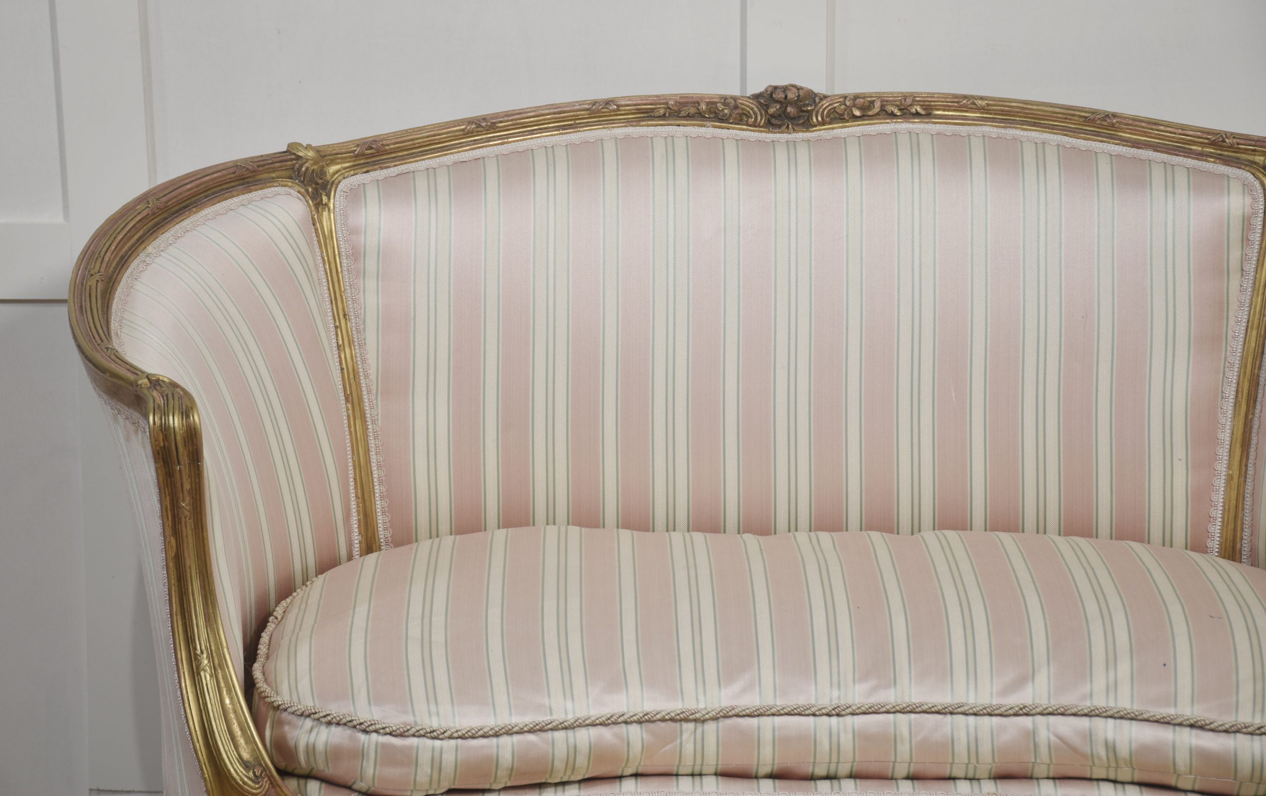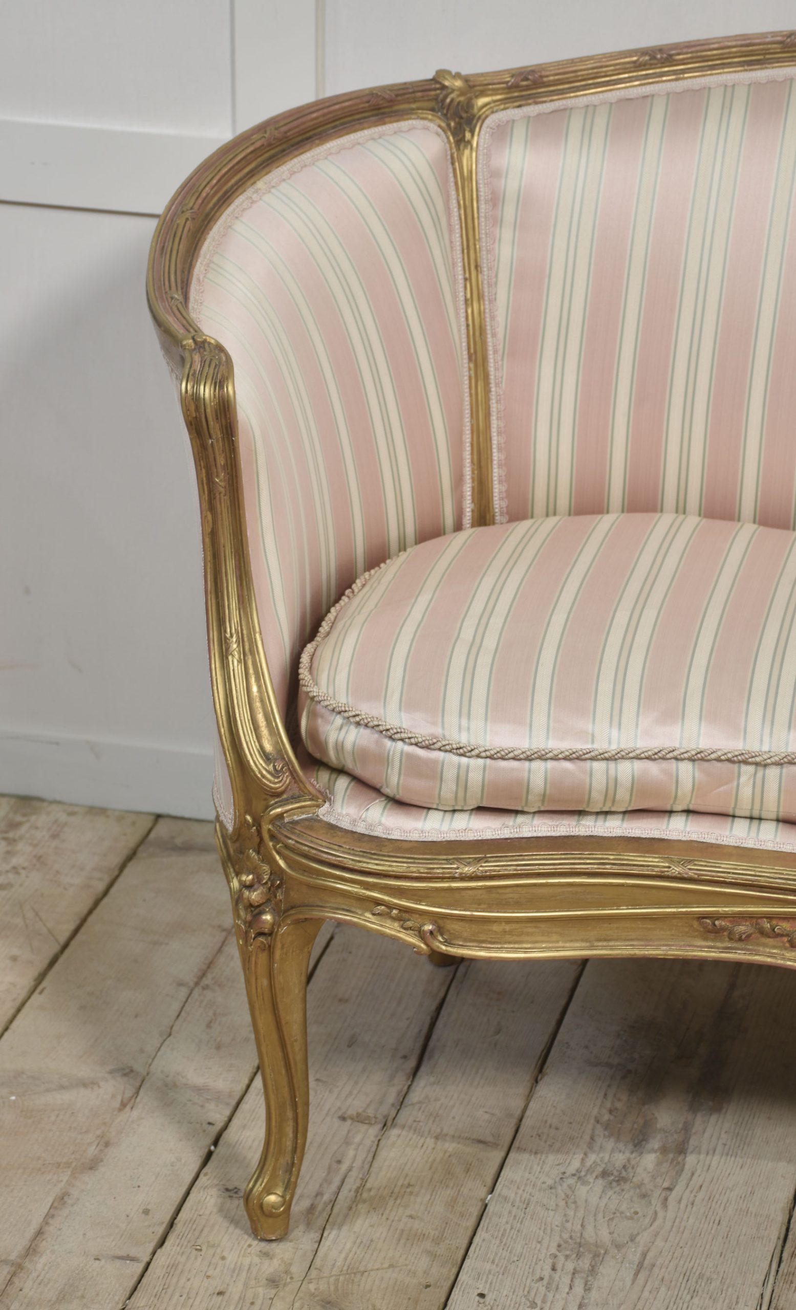 French Louis XV-Style Giltwood Two-Seater Canape settee, late 19th century, upholstered in pink, beige and green striped fabric, the reeded frame decorated with flowers and scrolls, with moulded hand grips above a removable cushion. The moulded seat rail on flower-carved cabriole front legs.