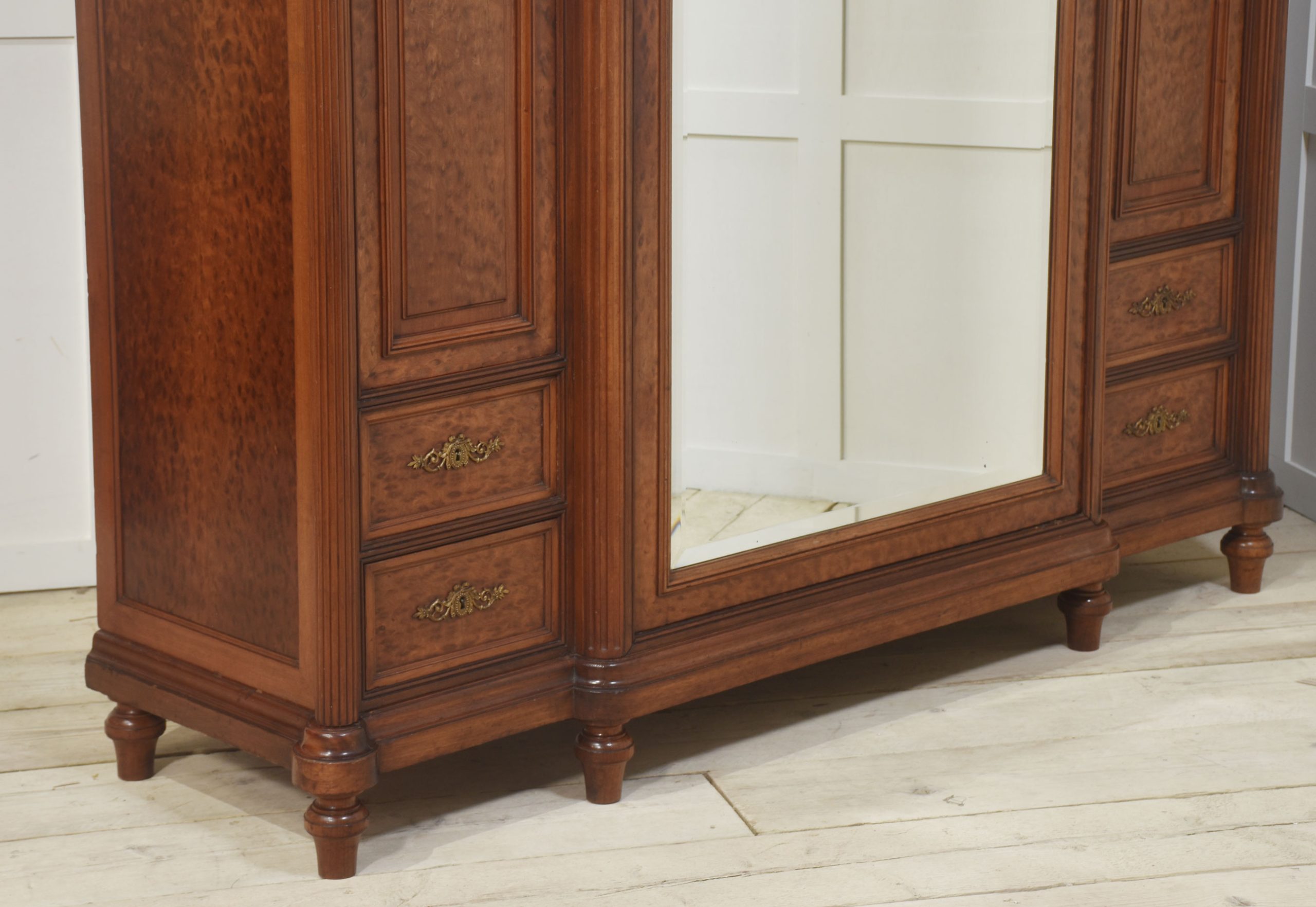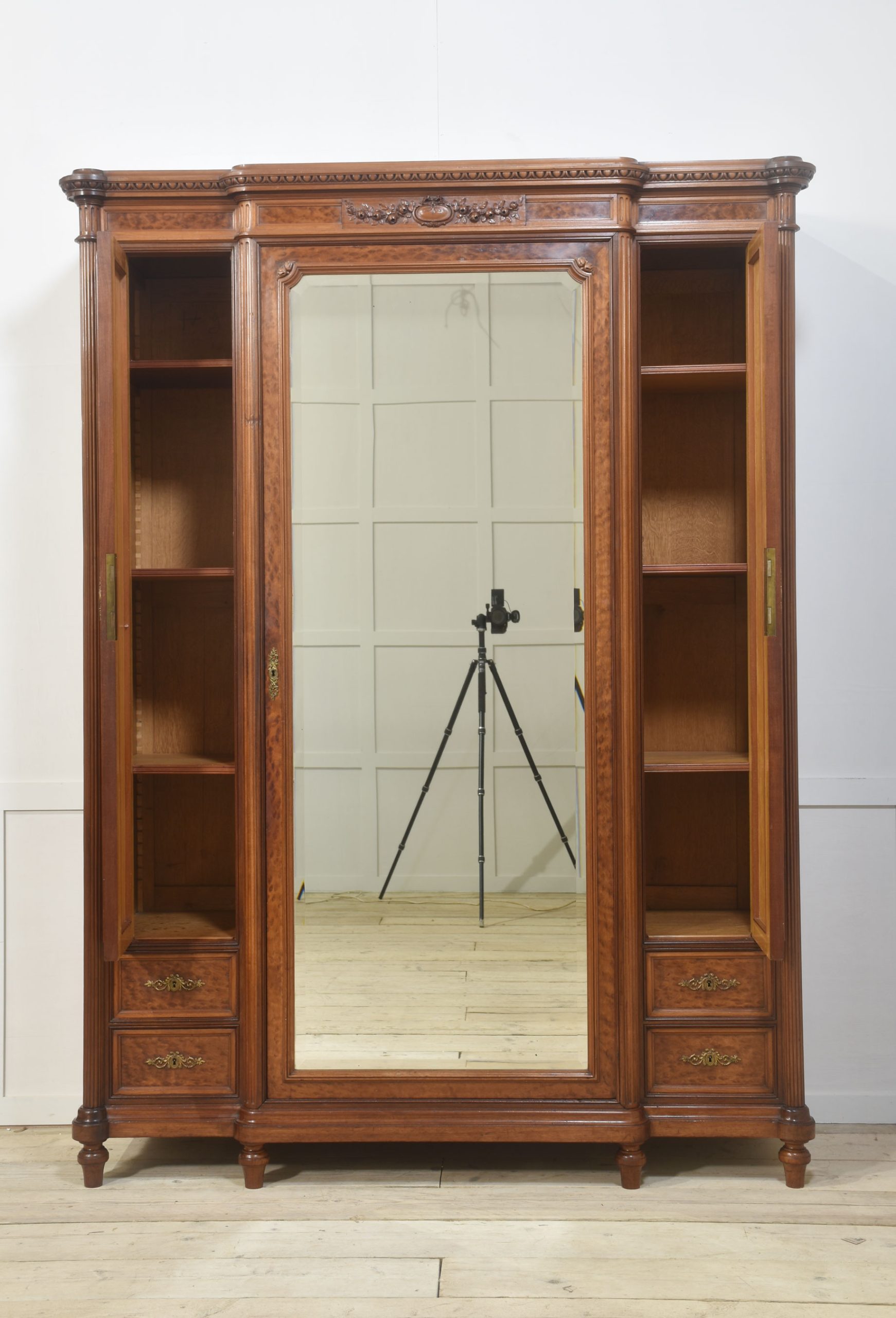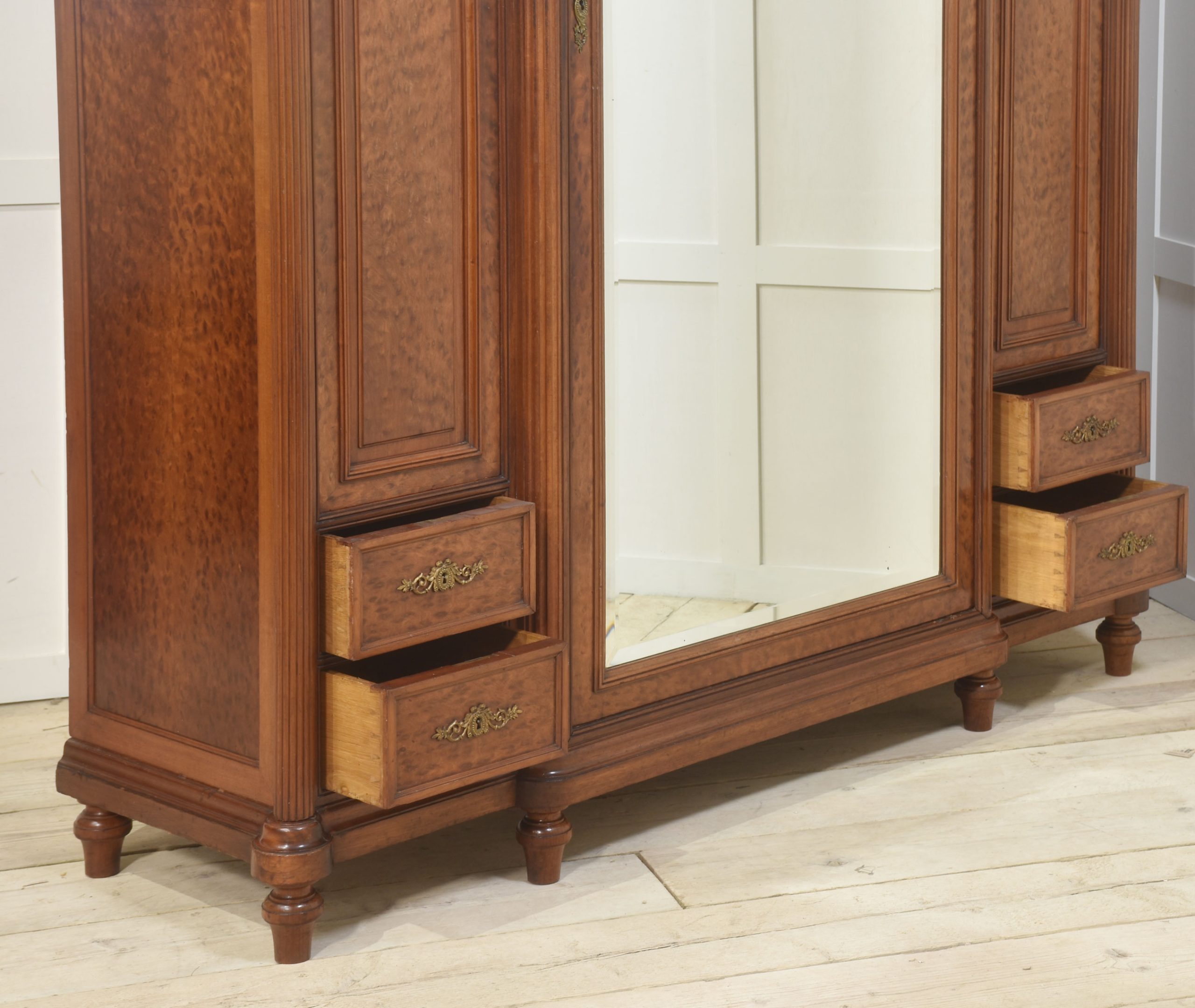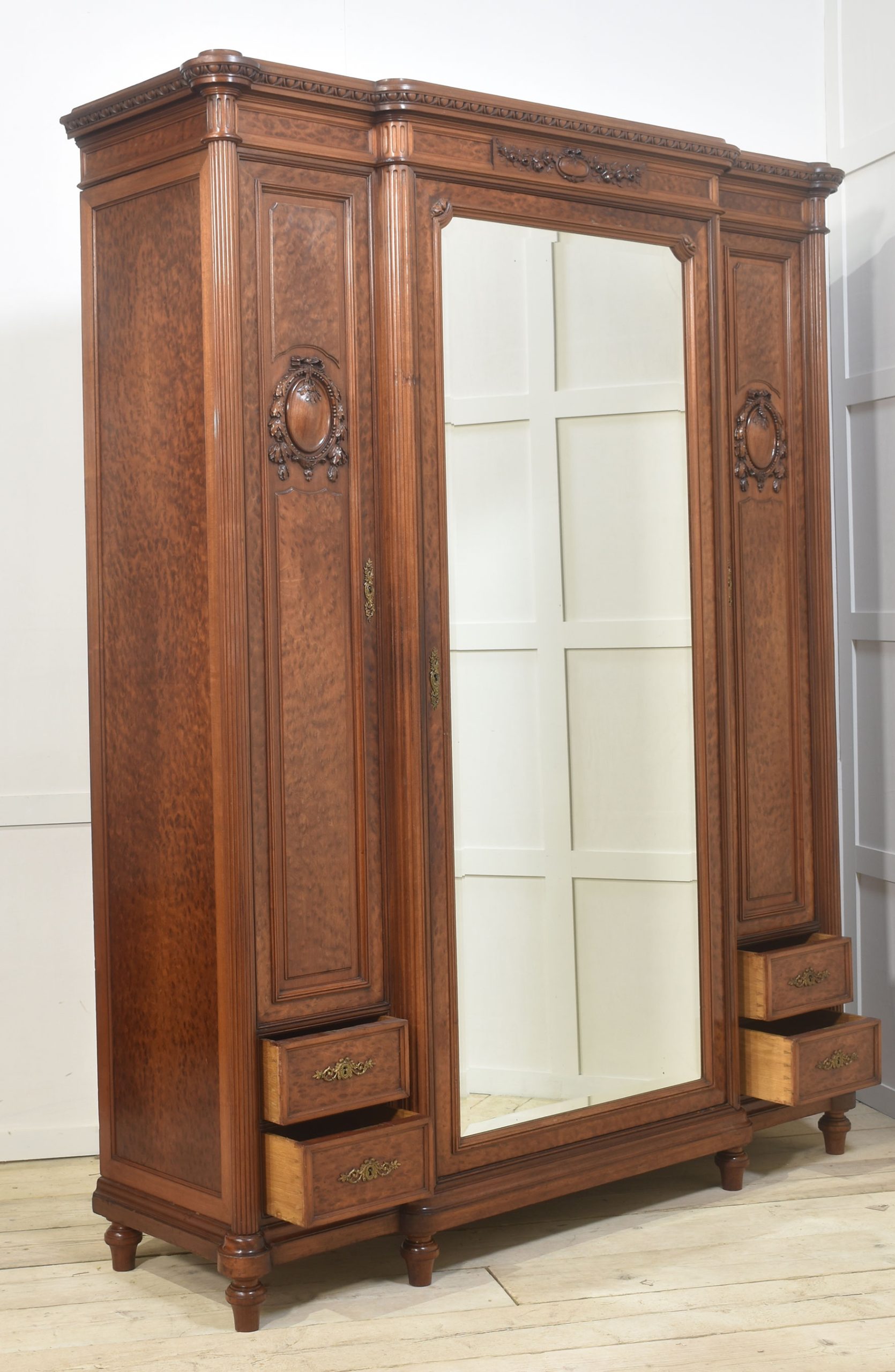 19th Century French Louis XVI Mahogany wardrobe, the breakfront top with carved detail above a large central bevelled mirror door flanked by two narrow well-figure panelled doors. Opening to reveal a large hanging area with adjustable shelving to either side. The base is fitted with four short drawers with brass scrolling handles. All raised on turned feet. The wardrobe will separate for easy transportation.