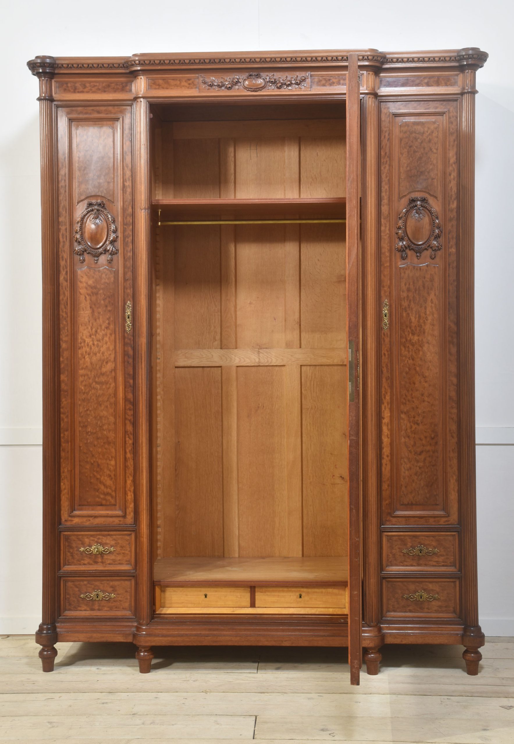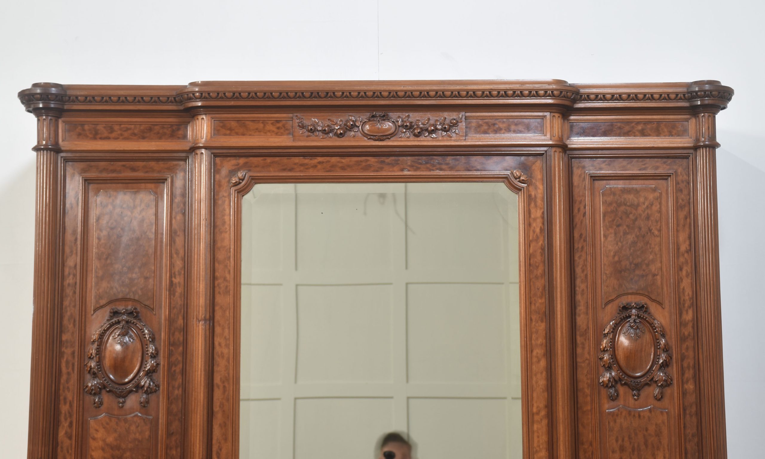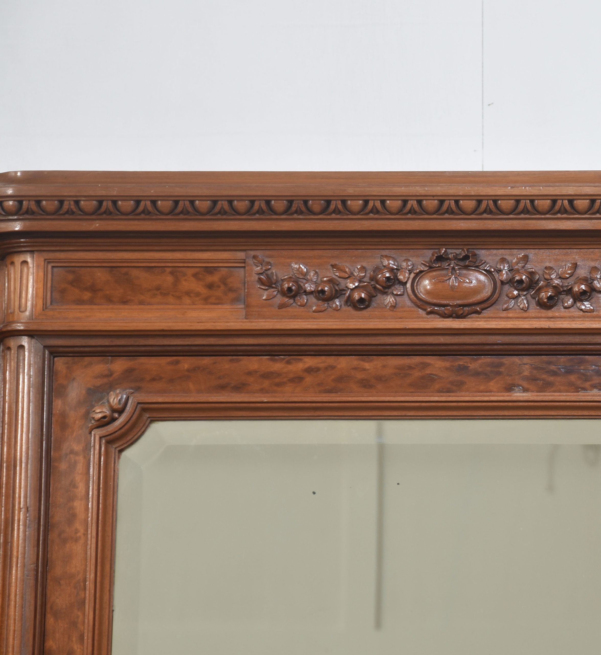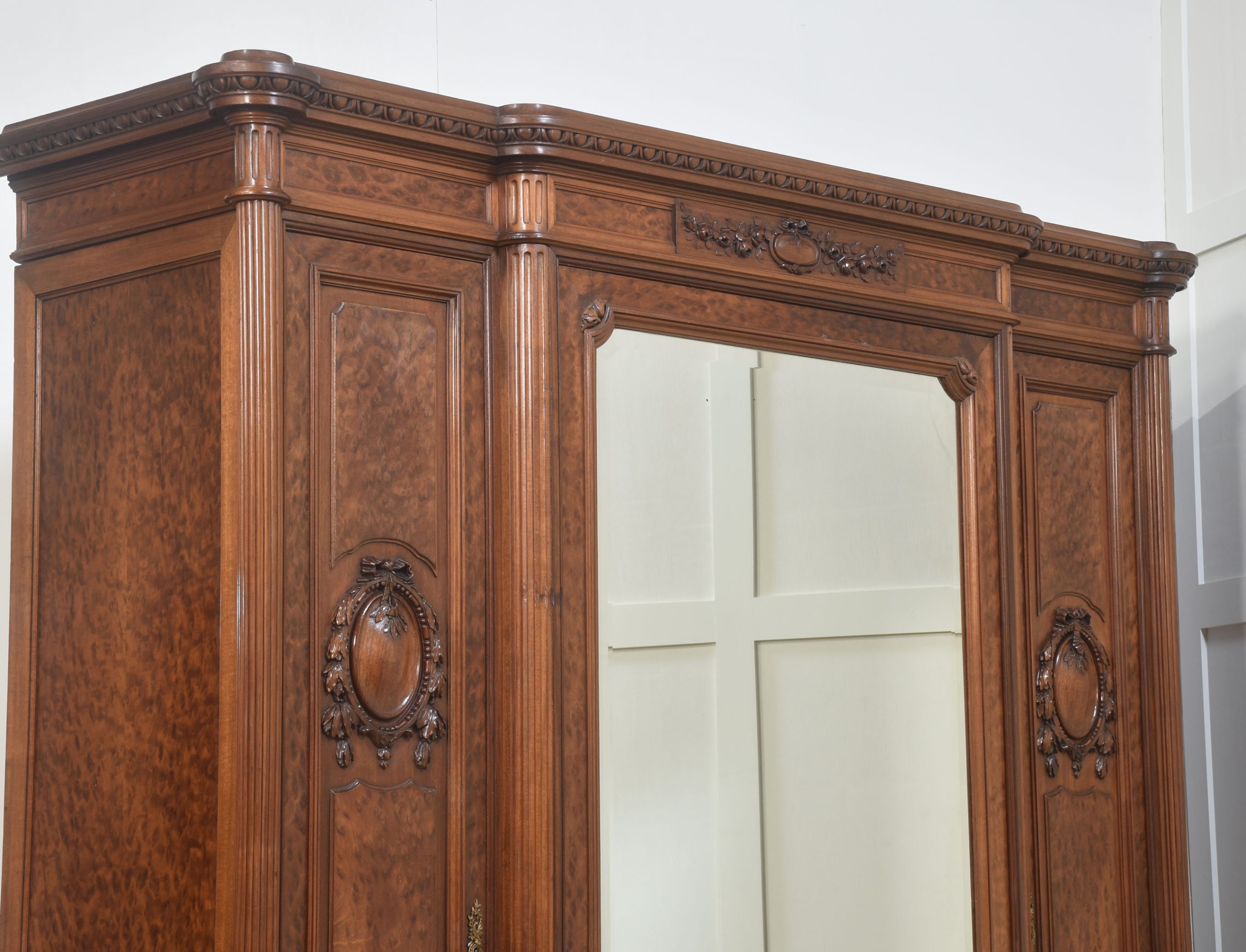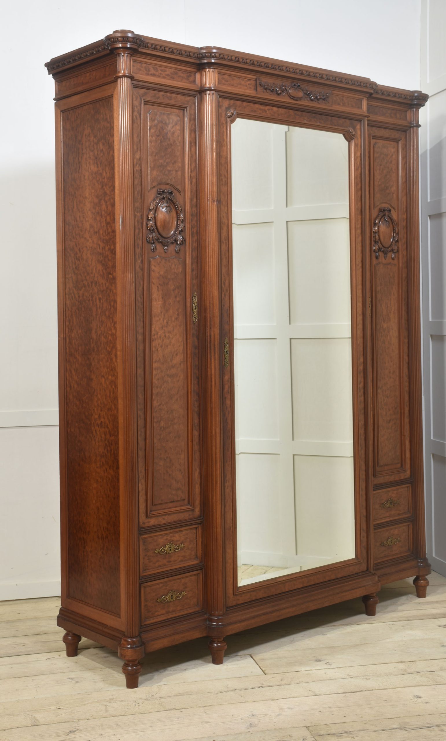 19th Century French Louis XVI Mahogany wardrobe, the breakfront top with carved detail above a large central bevelled mirror door flanked by two narrow well-figure panelled doors. Opening to reveal a large hanging area with adjustable shelving to either side. The base is fitted with four short drawers with brass scrolling handles. All raised on turned feet. The wardrobe will separate for easy transportation.