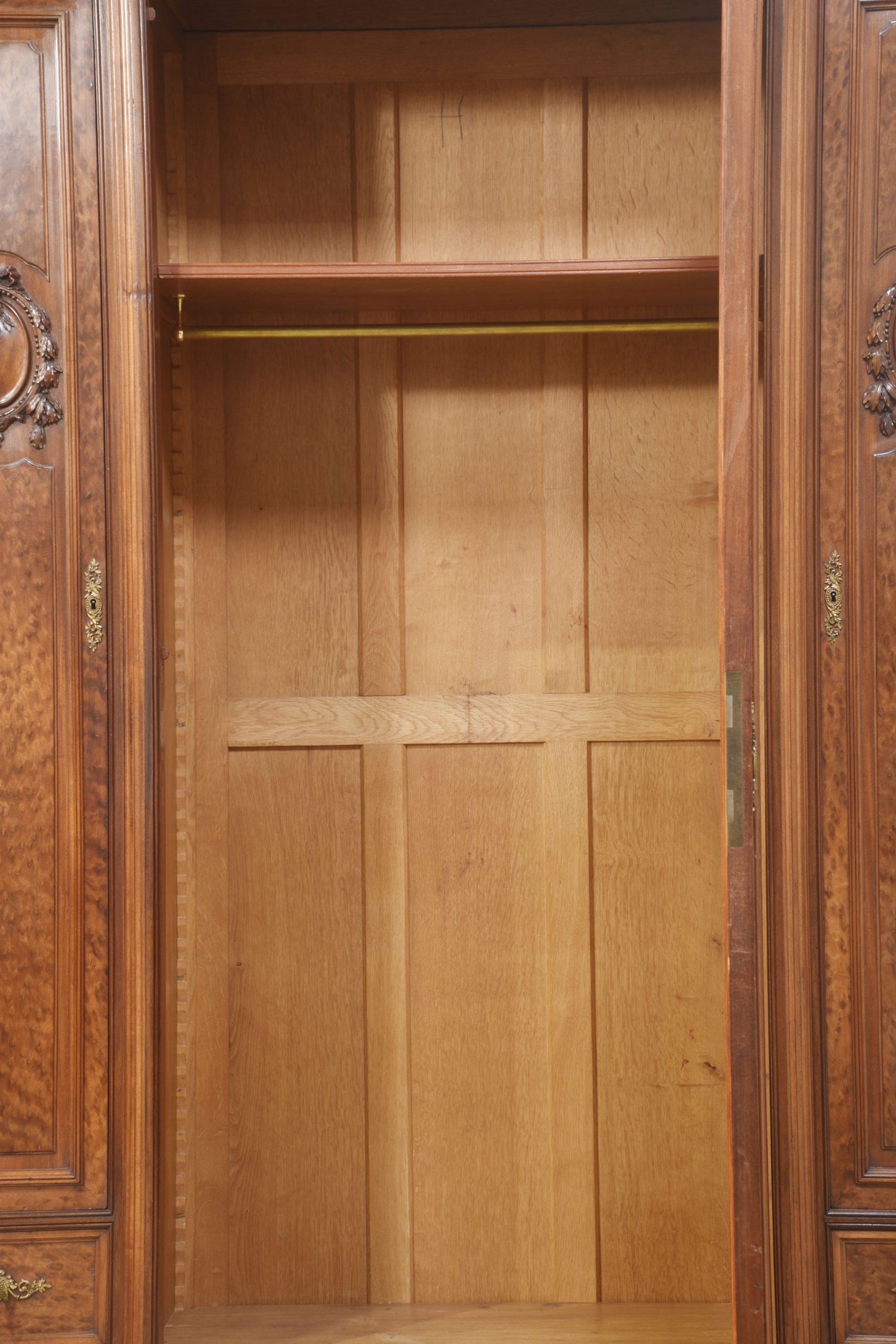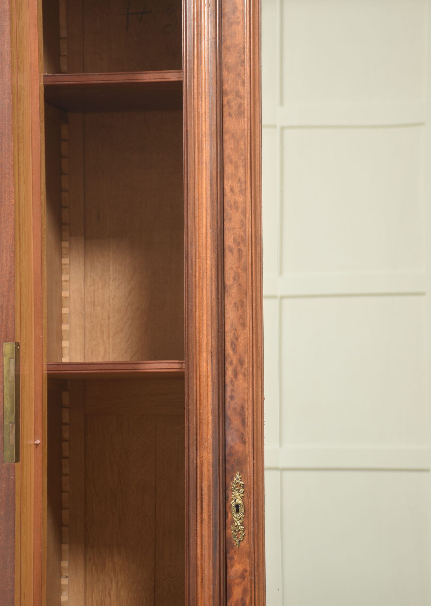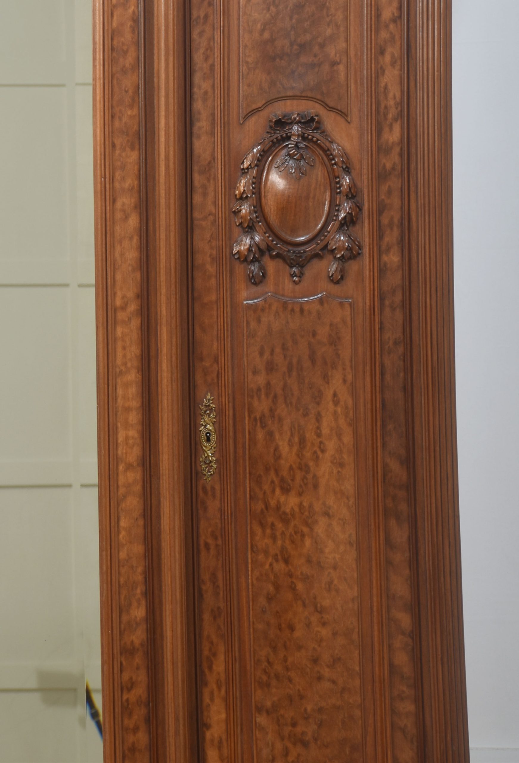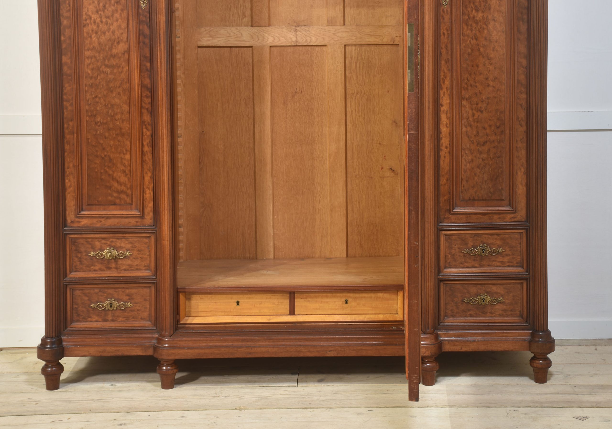 19th Century French Louis XVI Mahogany wardrobe, the breakfront top with carved detail above a large central bevelled mirror door flanked by two narrow well-figure panelled doors. Opening to reveal a large hanging area with adjustable shelving to either side. The base is fitted with four short drawers with brass scrolling handles. All raised on turned feet. The wardrobe will separate for easy transportation.