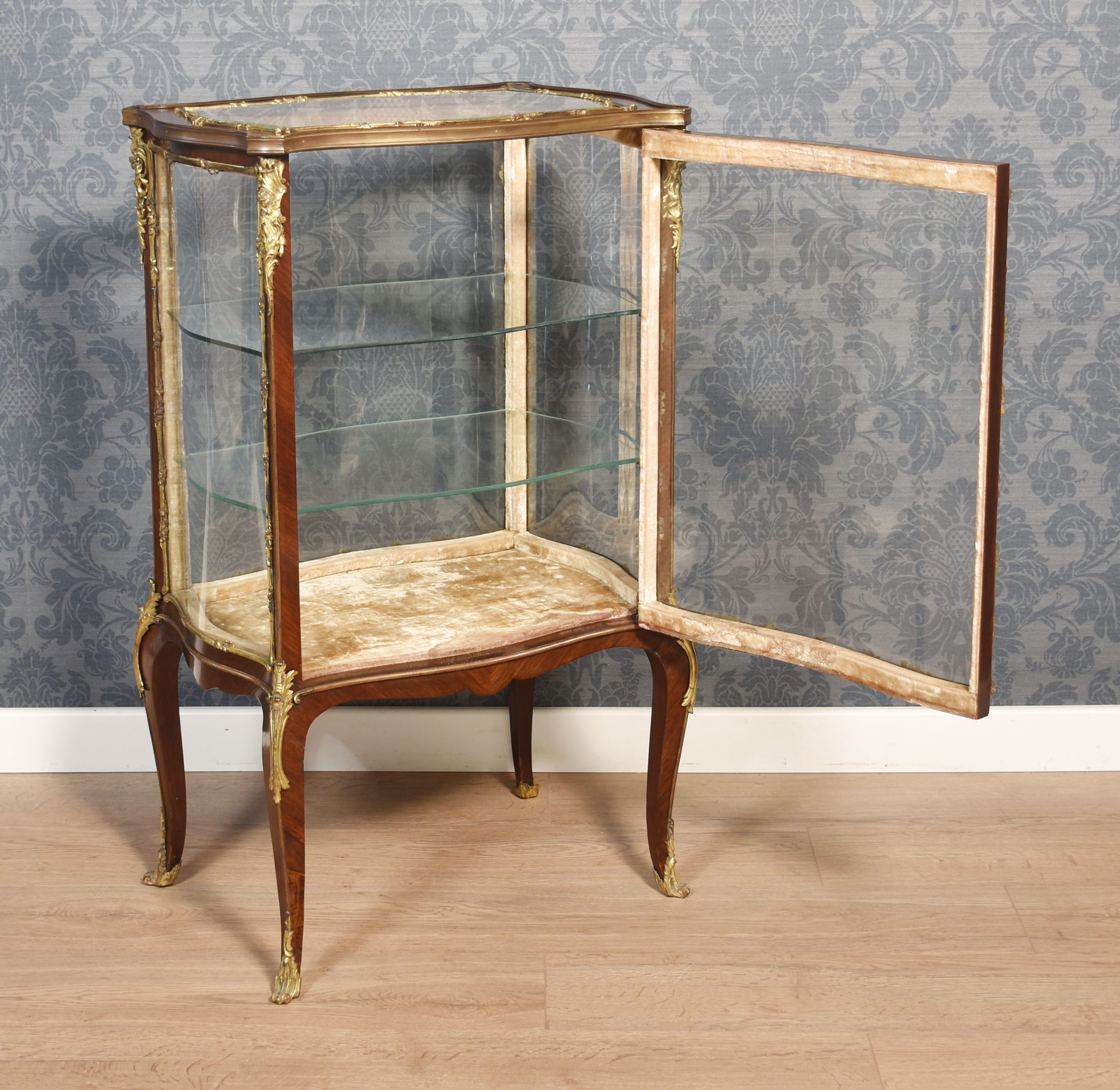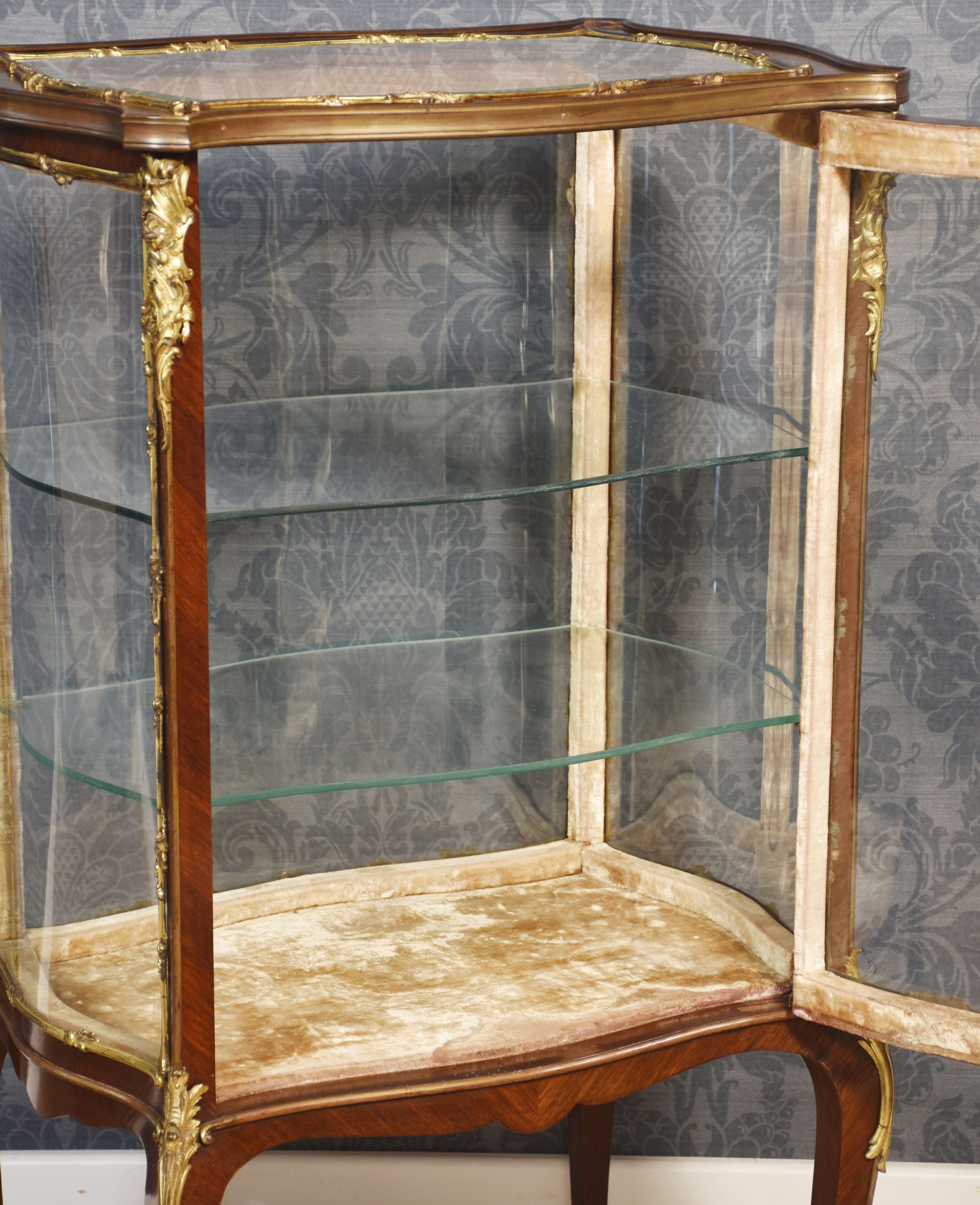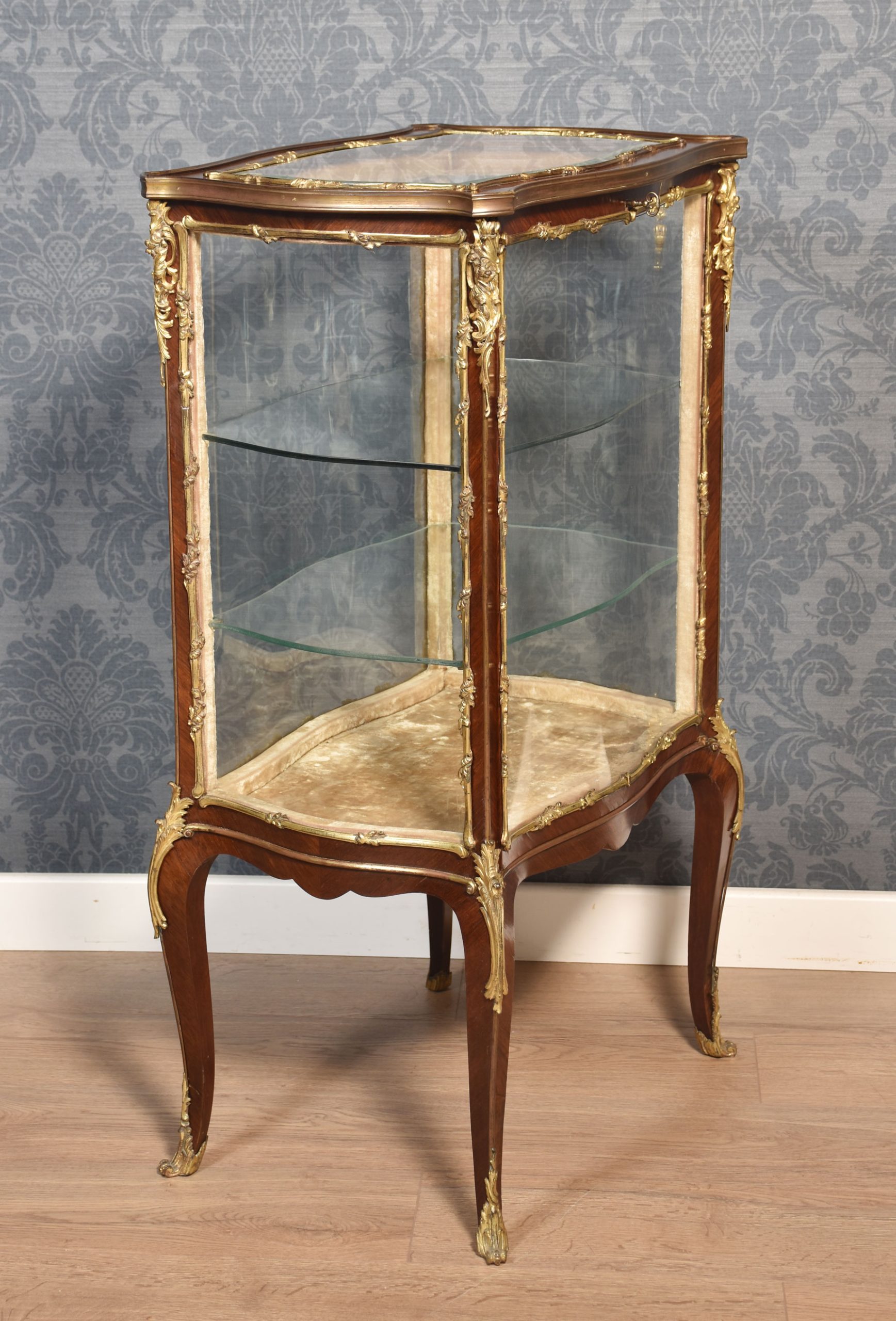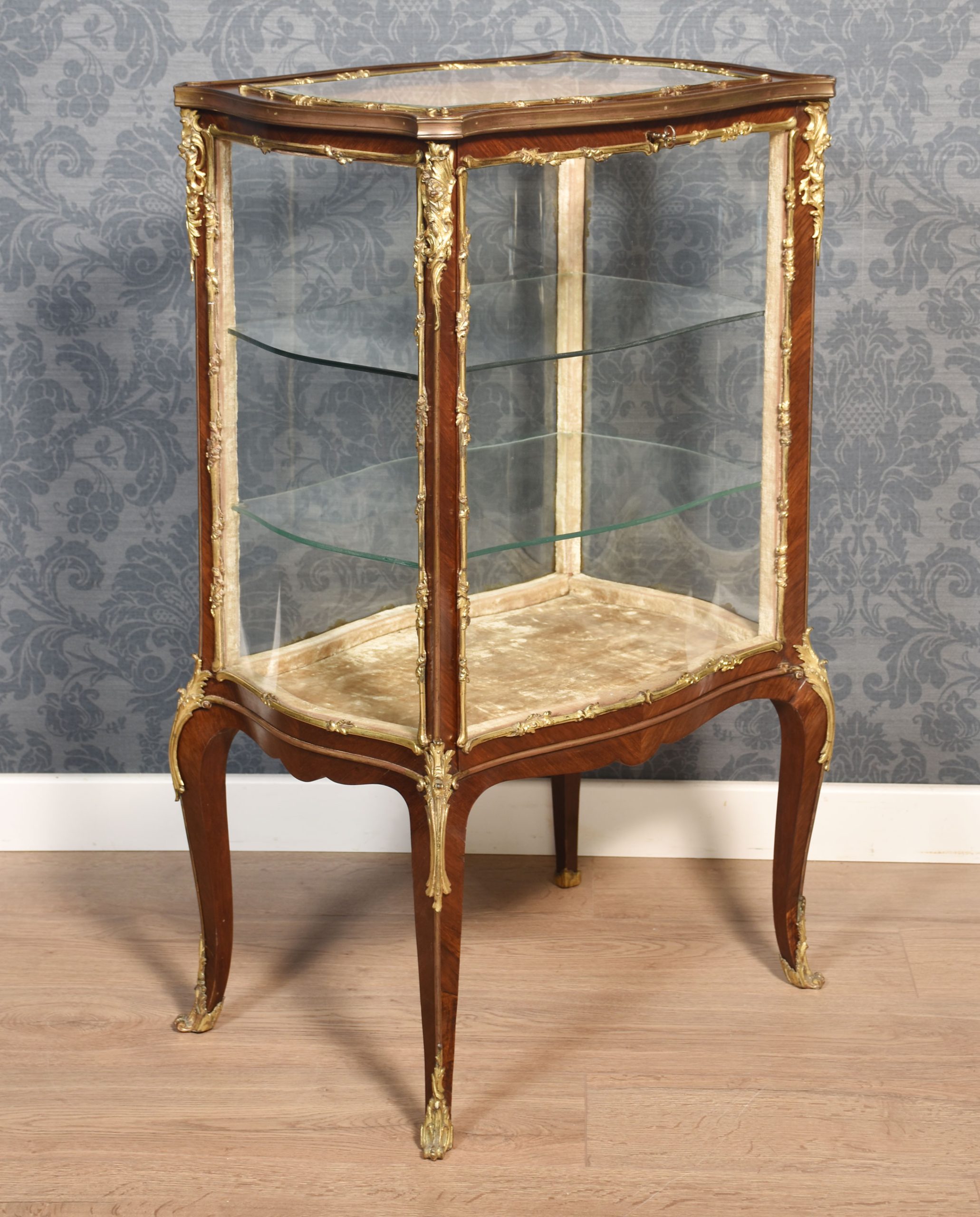 French walnut bijouterie cabinet of Louis XVI design, of serpentine form decorated with gilt metal mounts. The bevelled glass top and shaped glazed sides leading to the large single-door opening to reveal two glass shelves. All raised up on slender cabriole supports.