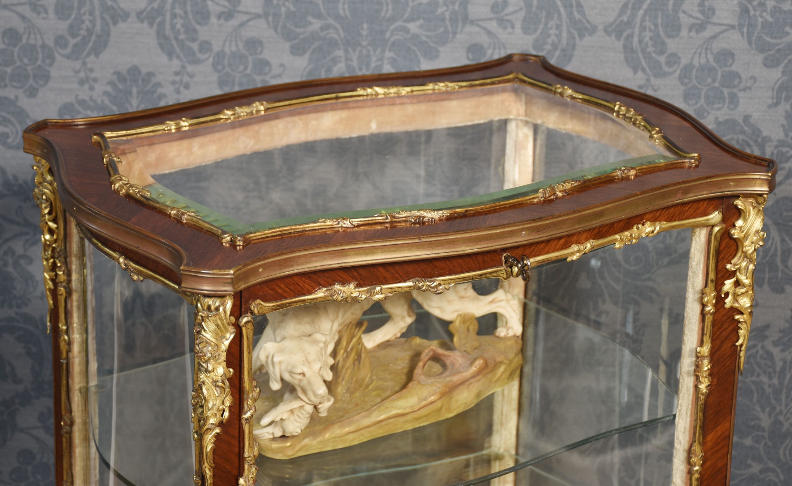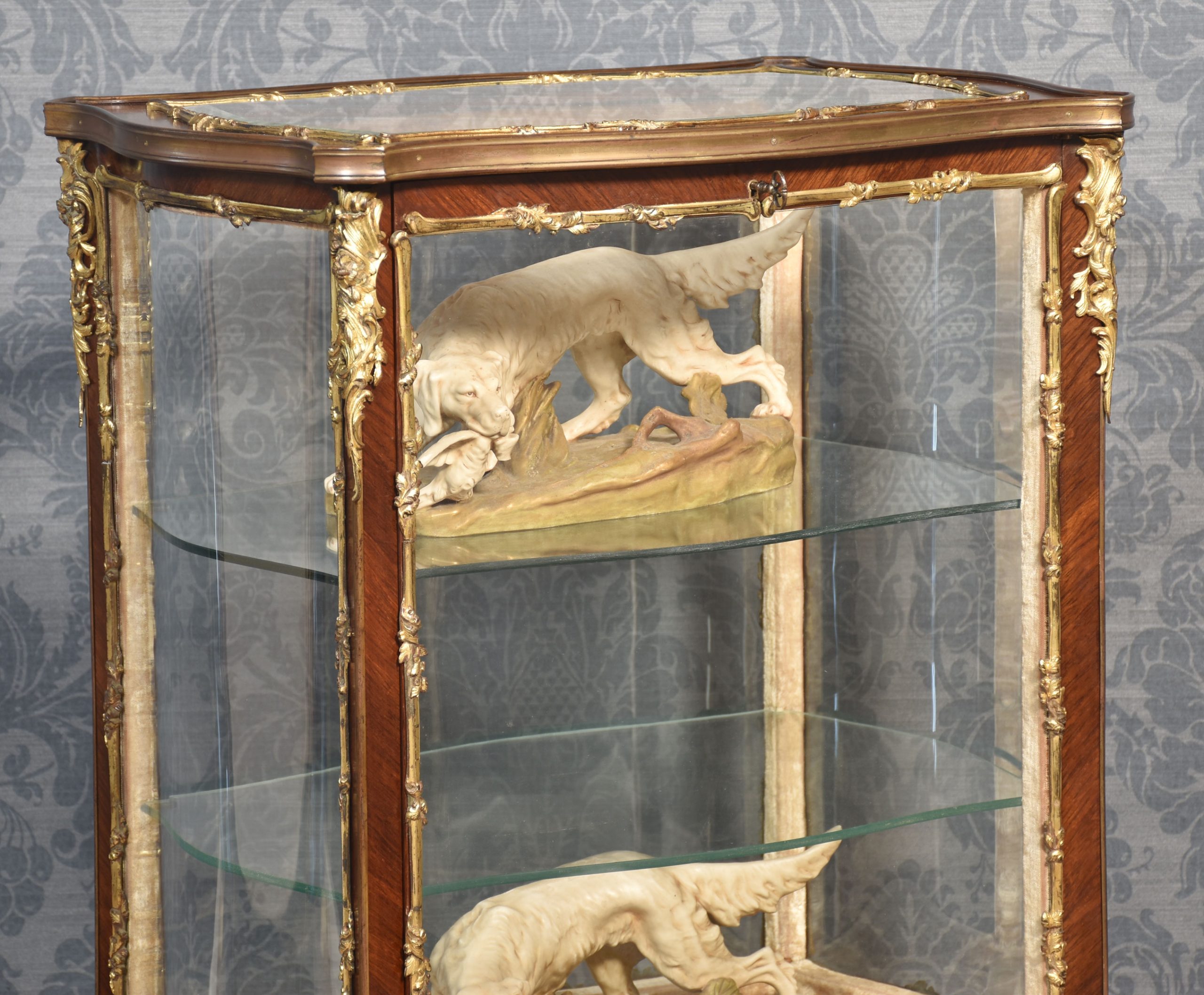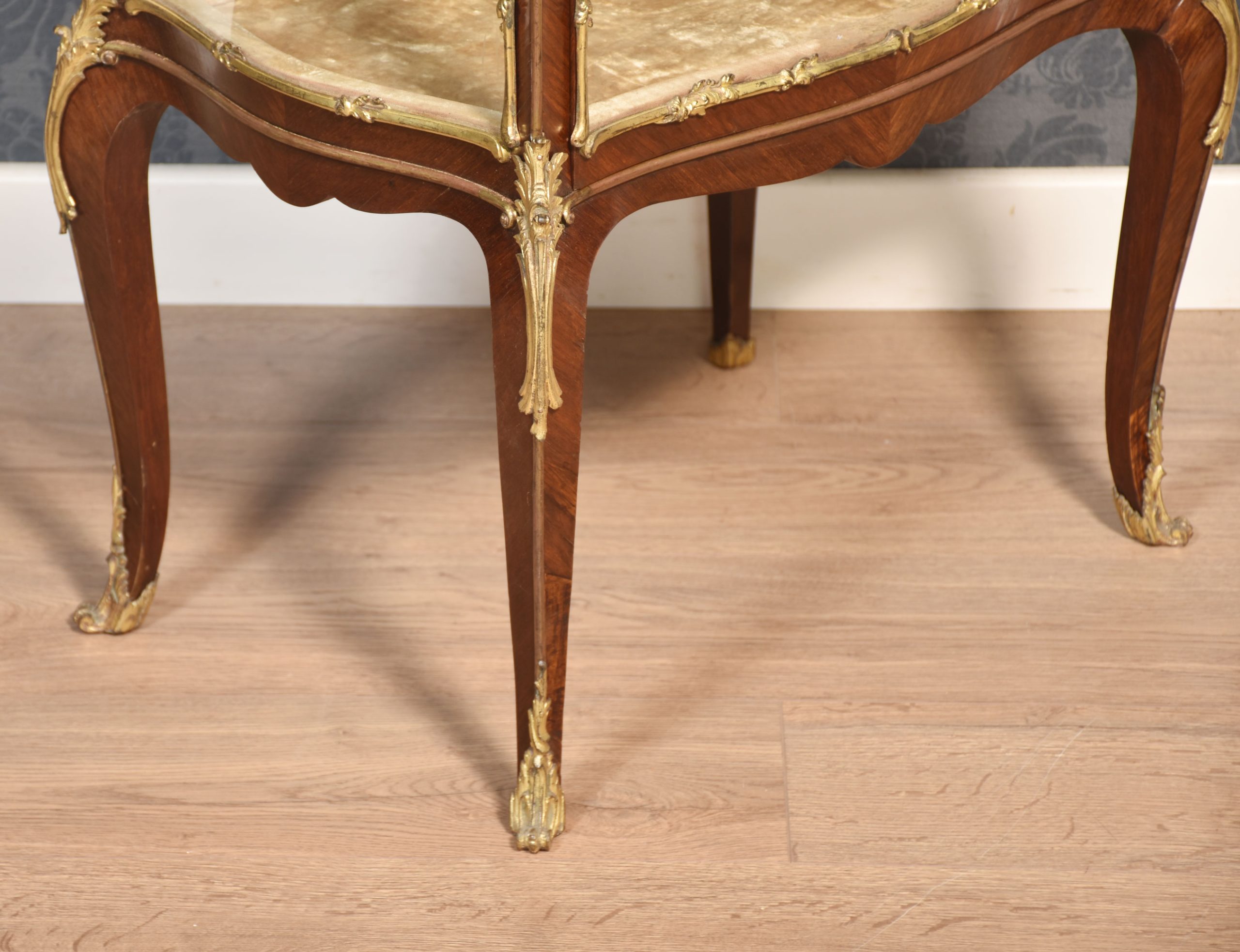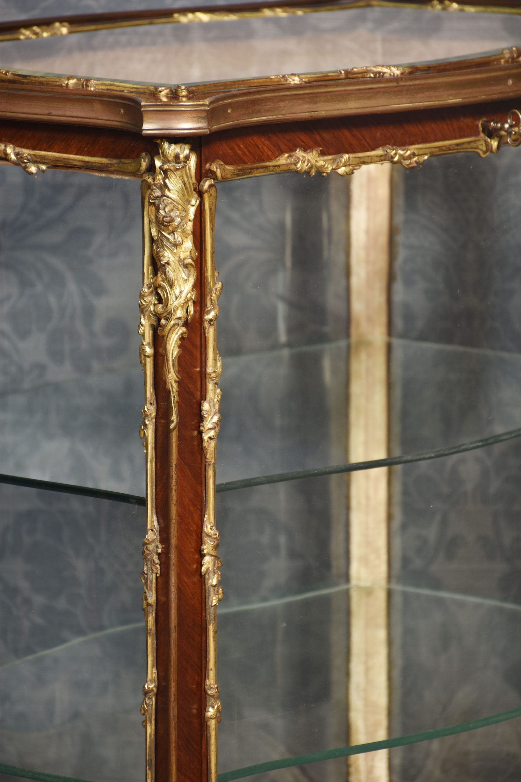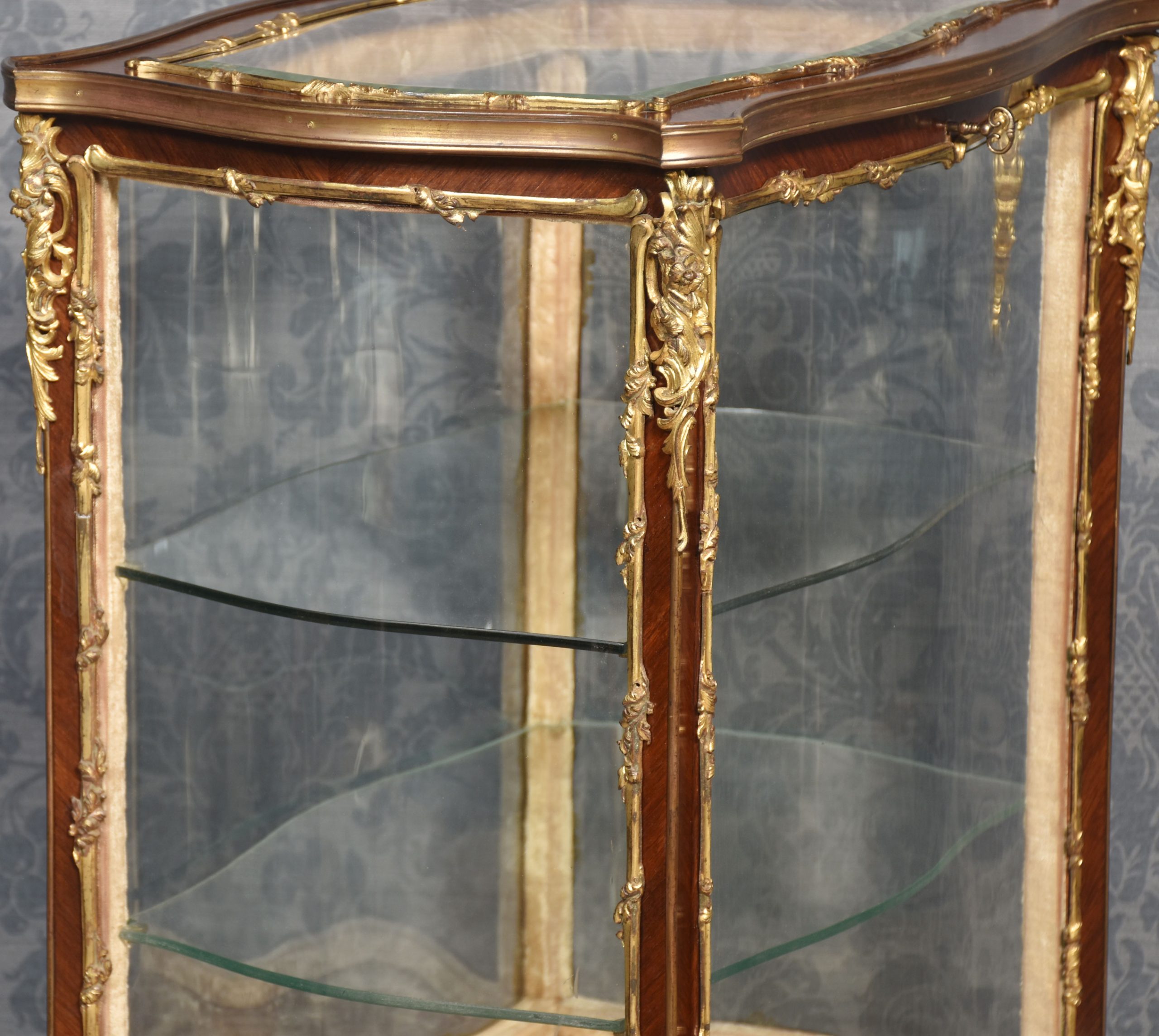 French walnut bijouterie cabinet of Louis XVI design, of serpentine form decorated with gilt metal mounts. The bevelled glass top and shaped glazed sides leading to the large single-door opening to reveal two glass shelves. All raised up on slender cabriole supports.