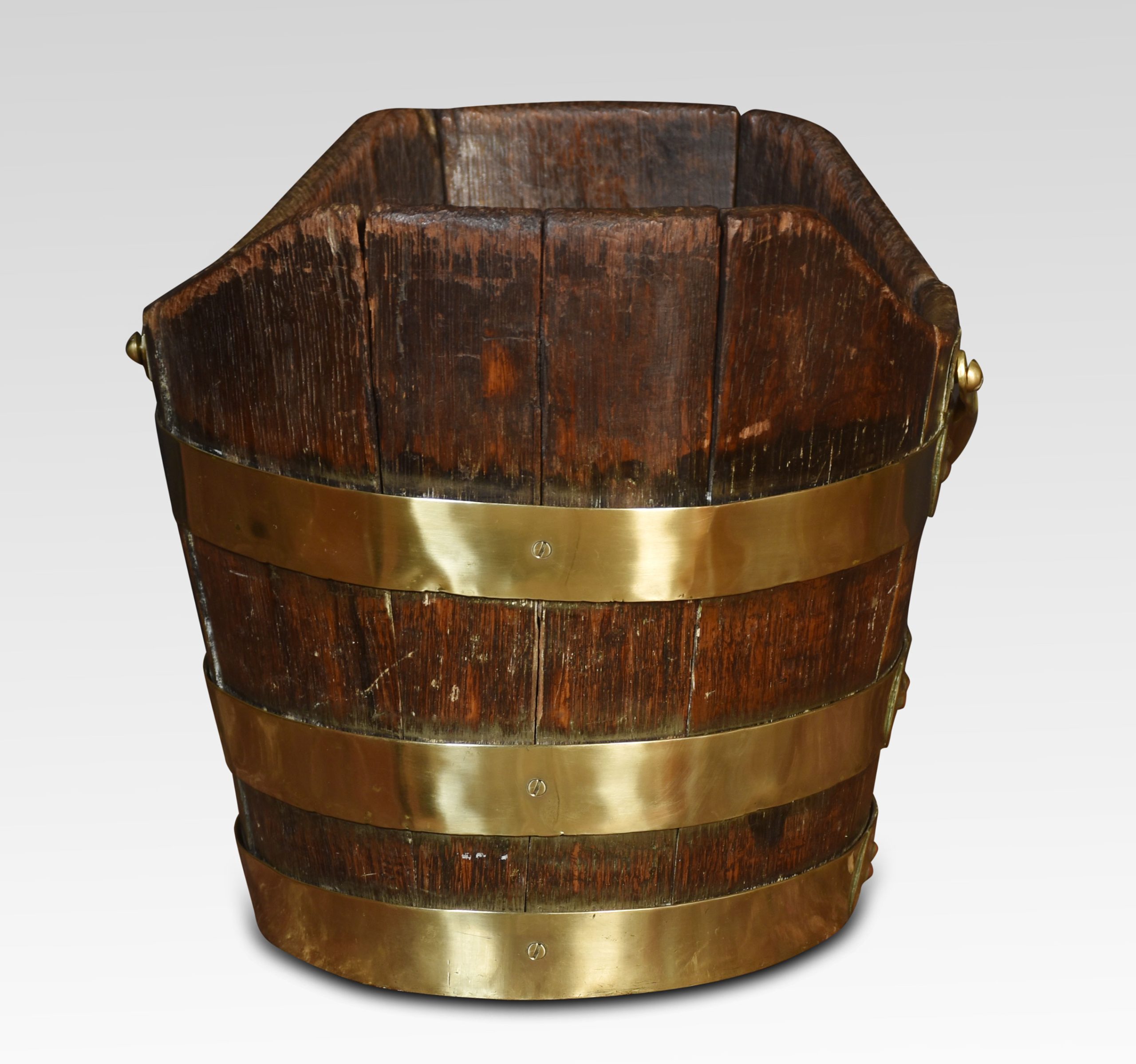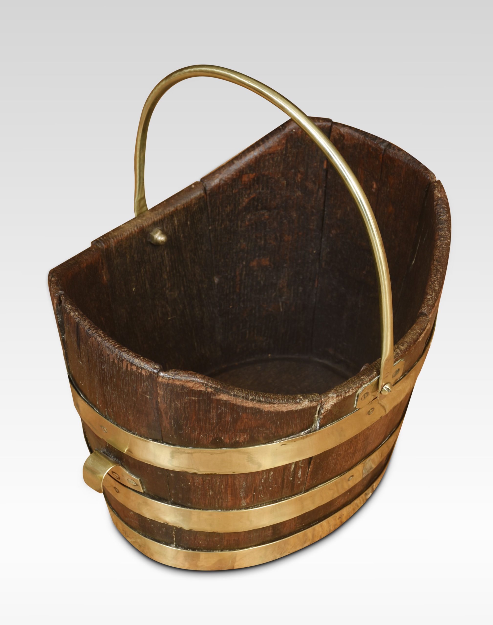 George III peat bucket with handle above the oak frame encased in brass bands.