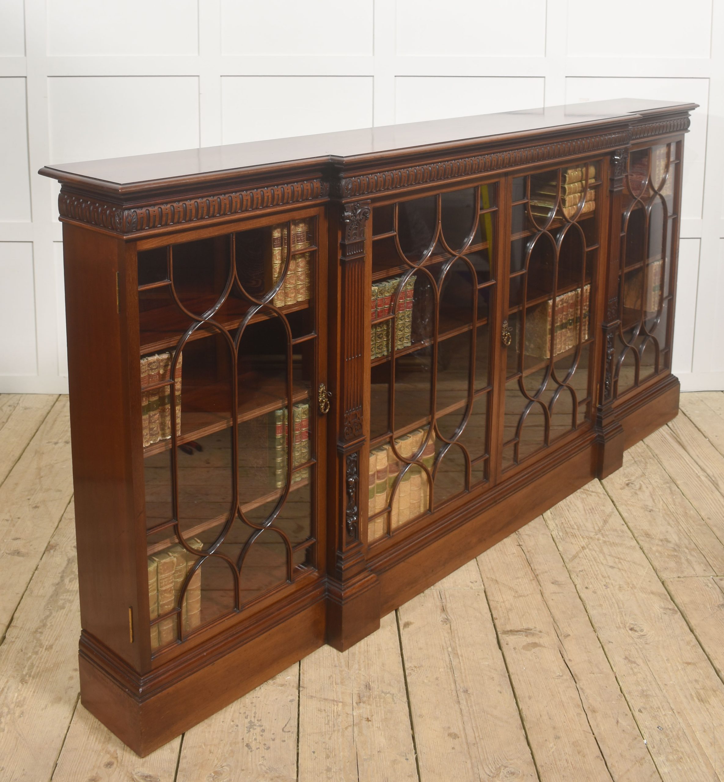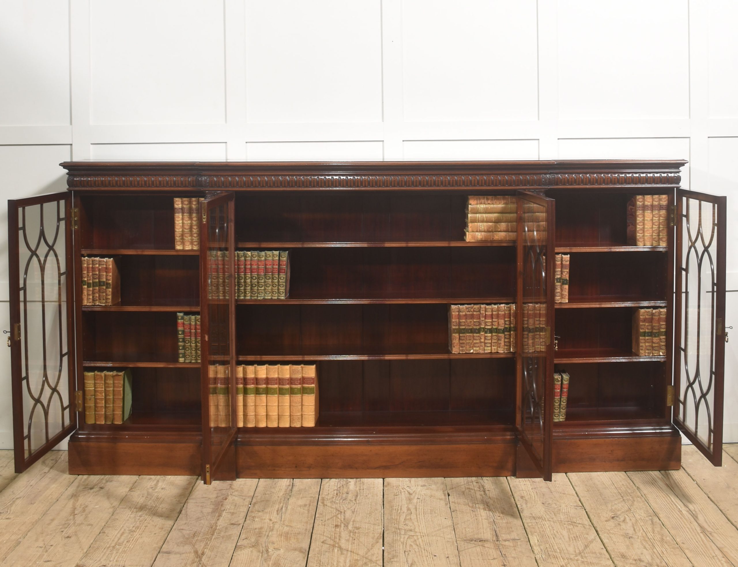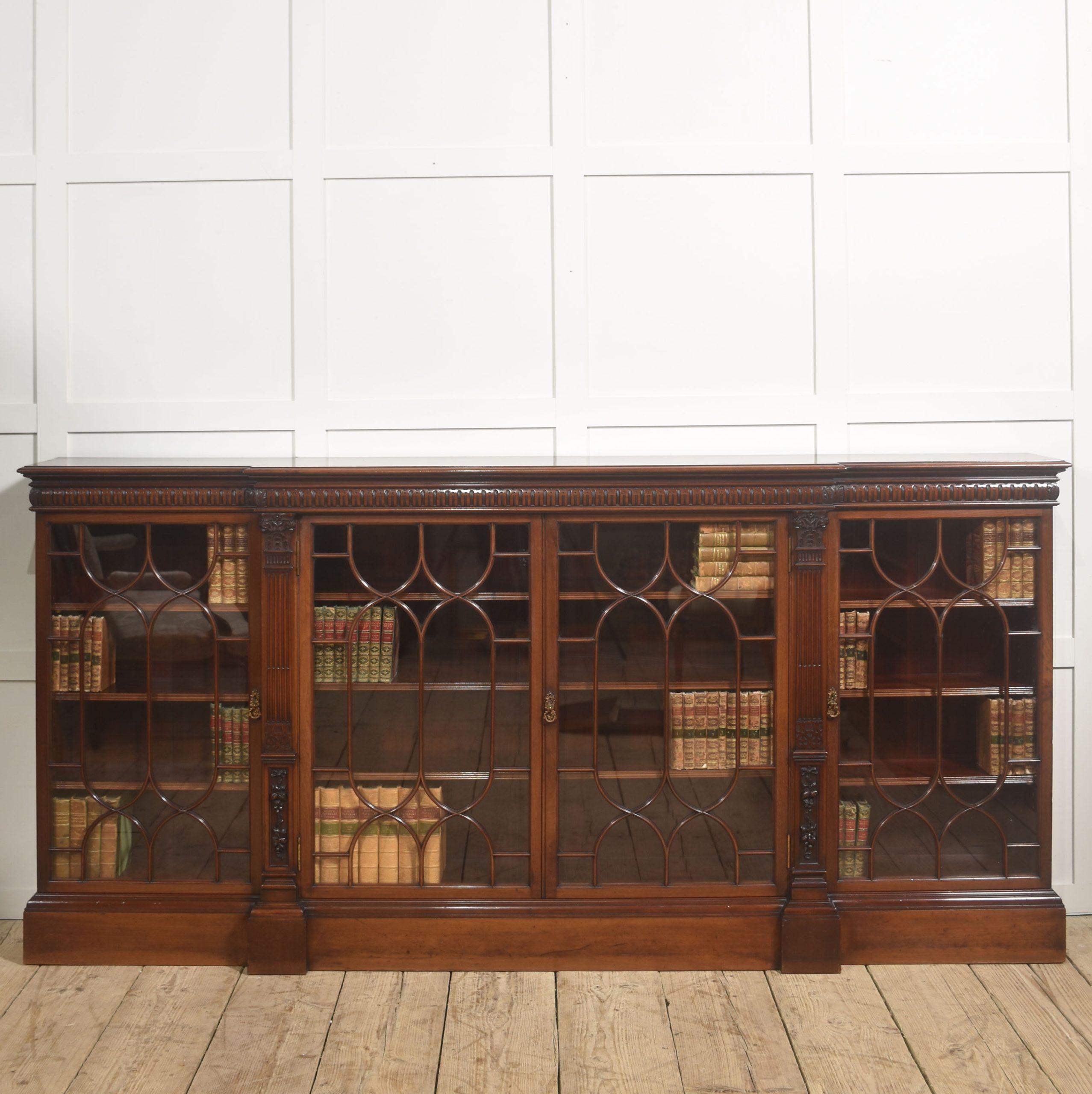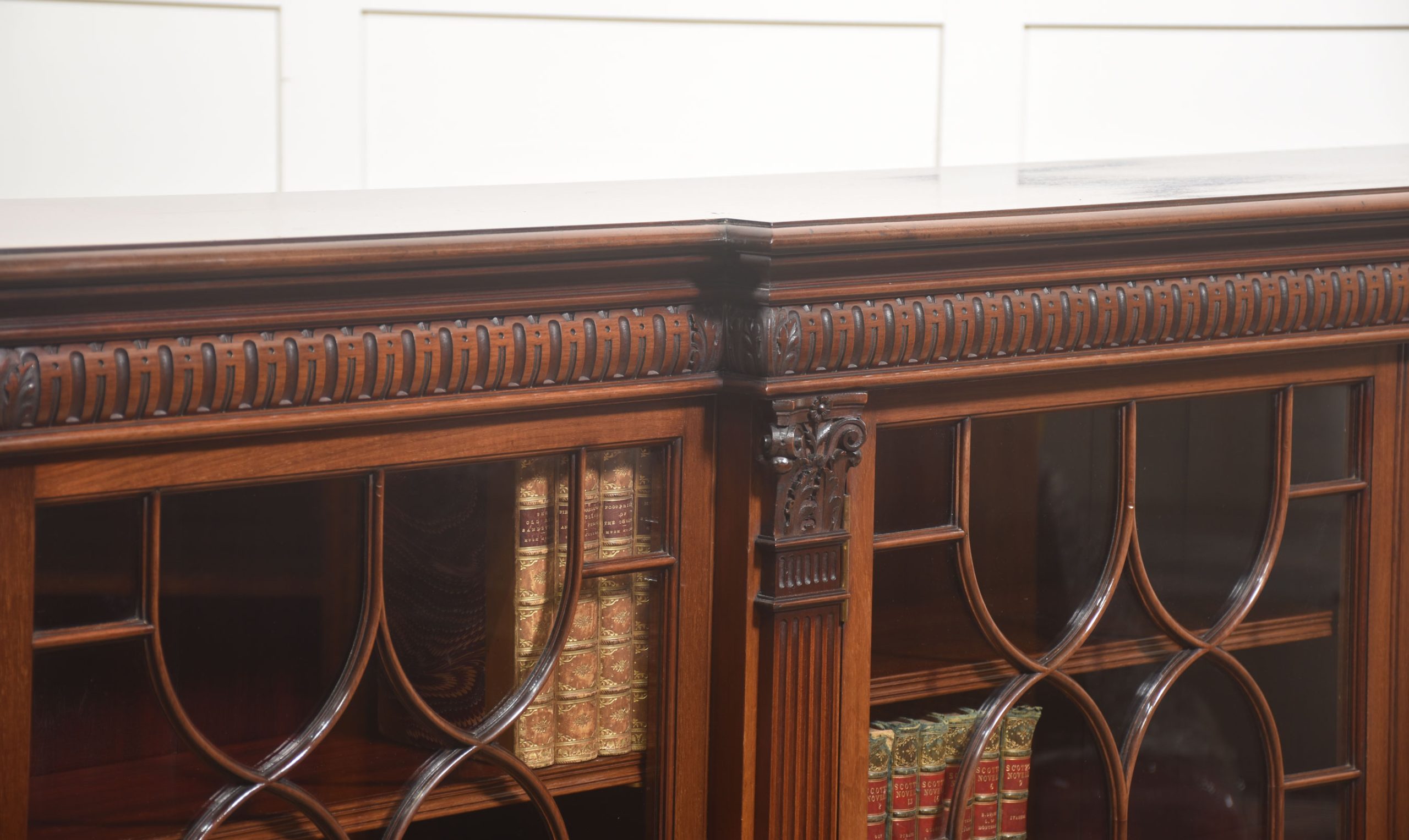 This impressive antique breakfront bookcase is crafted in richly figured mahogany and presents a refined interpretation of classical Georgian design, combining elegant proportions with finely executed decorative detail. The cabinet features a long, low breakfront form, with a subtly projecting central section flanked by slightly recessed end compartments, creating a balanced architectural silhouette well suited to both traditional libraries and refined interior spaces.