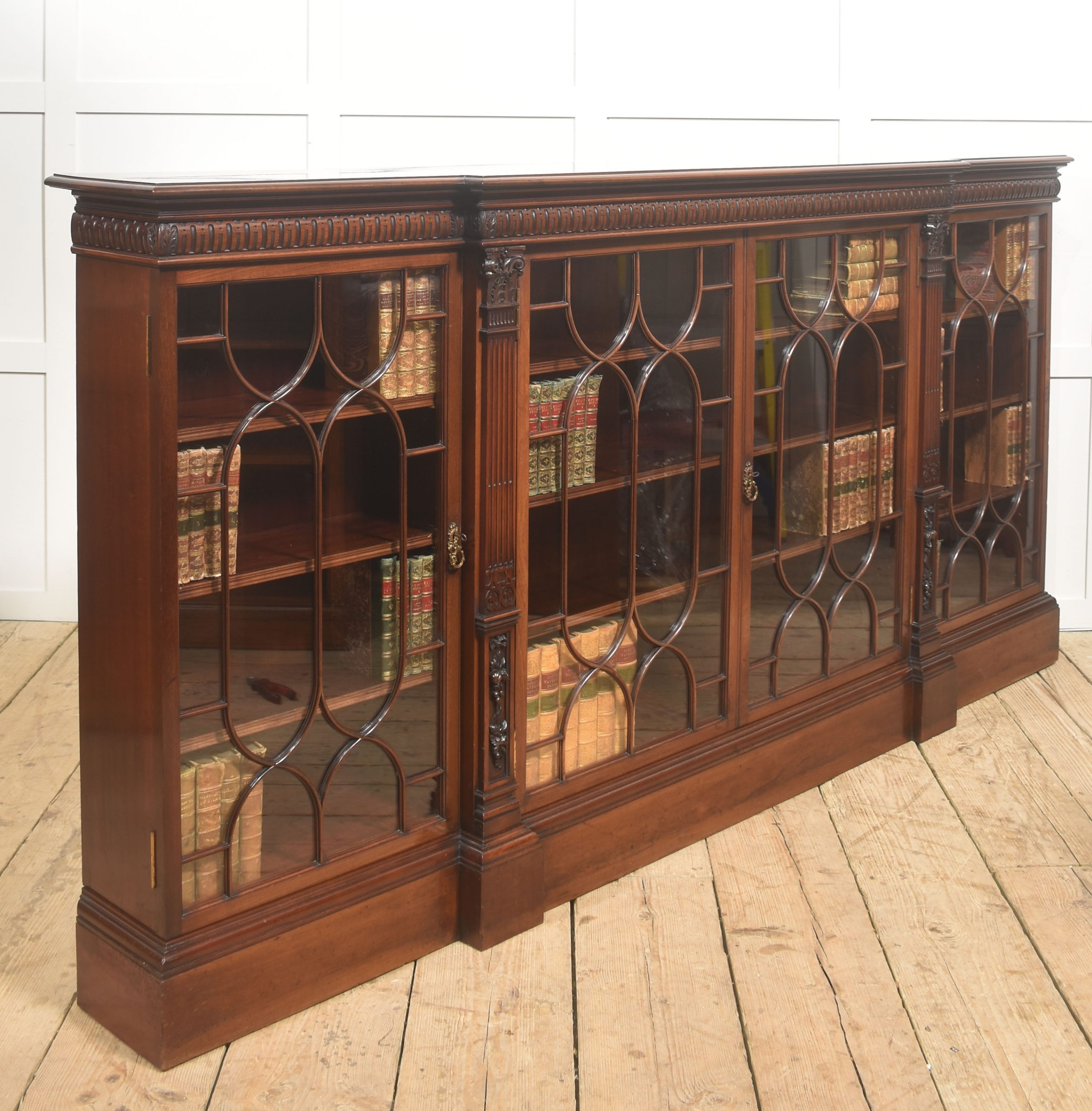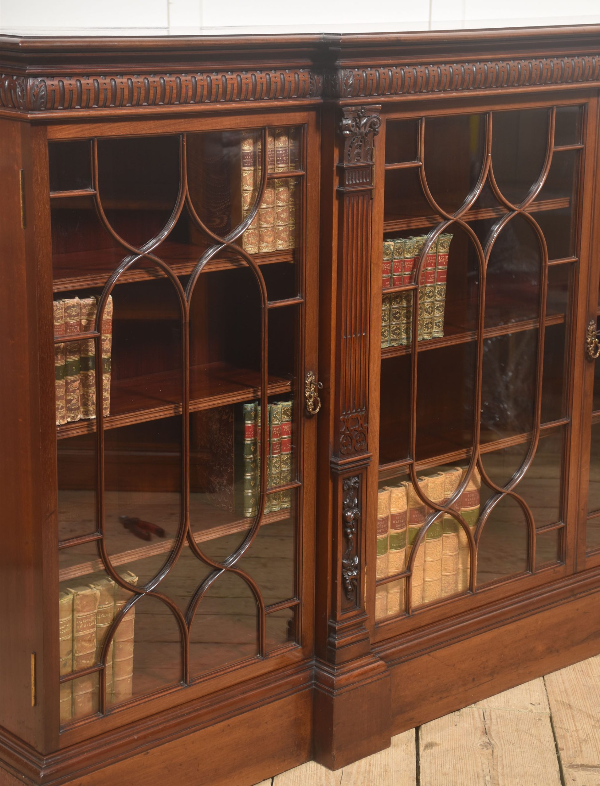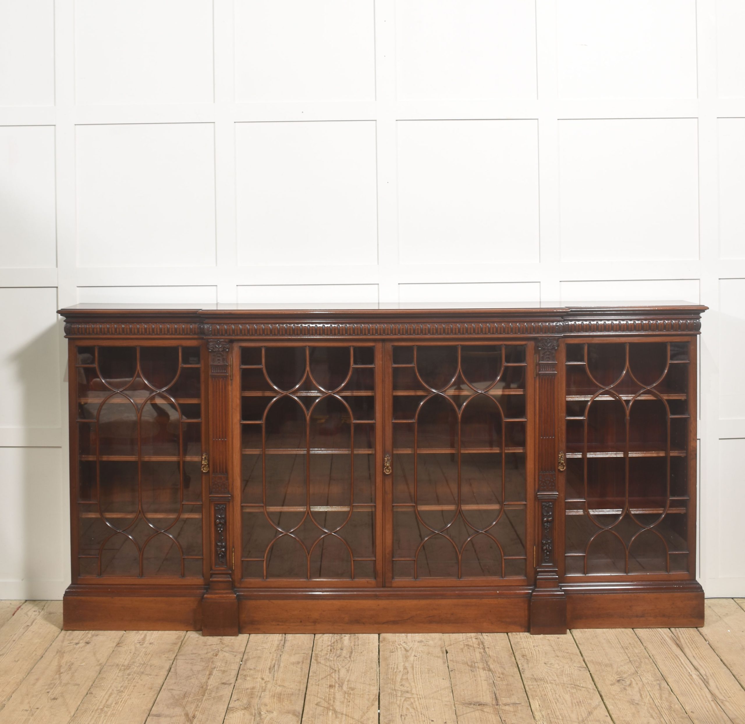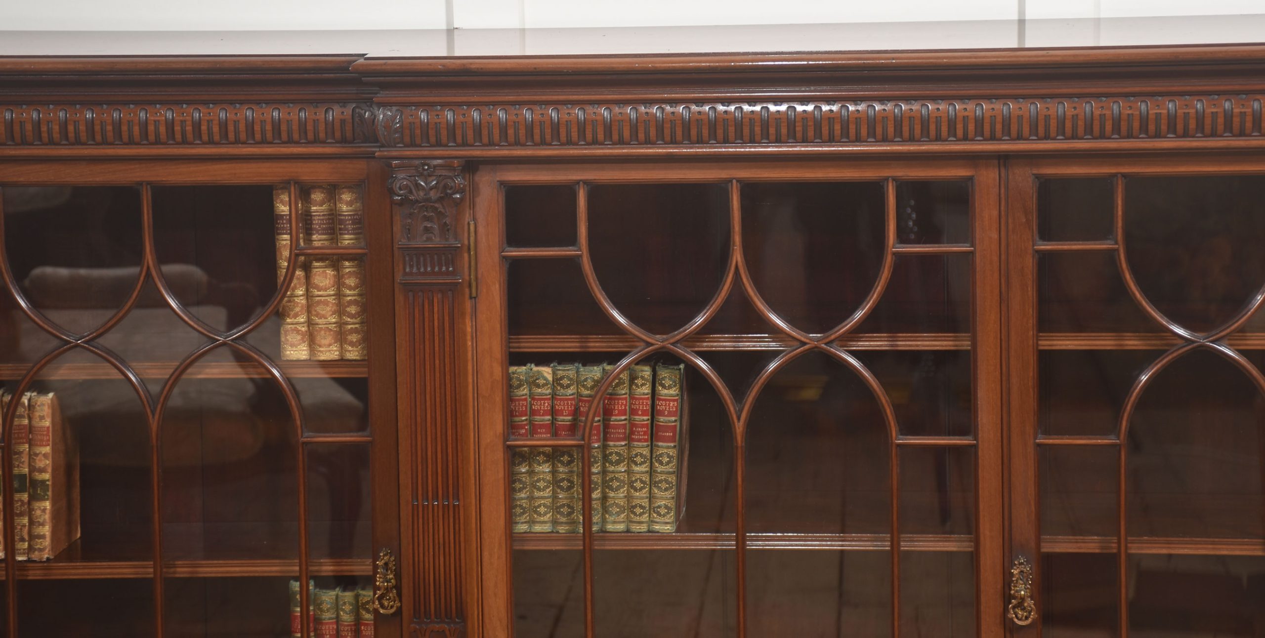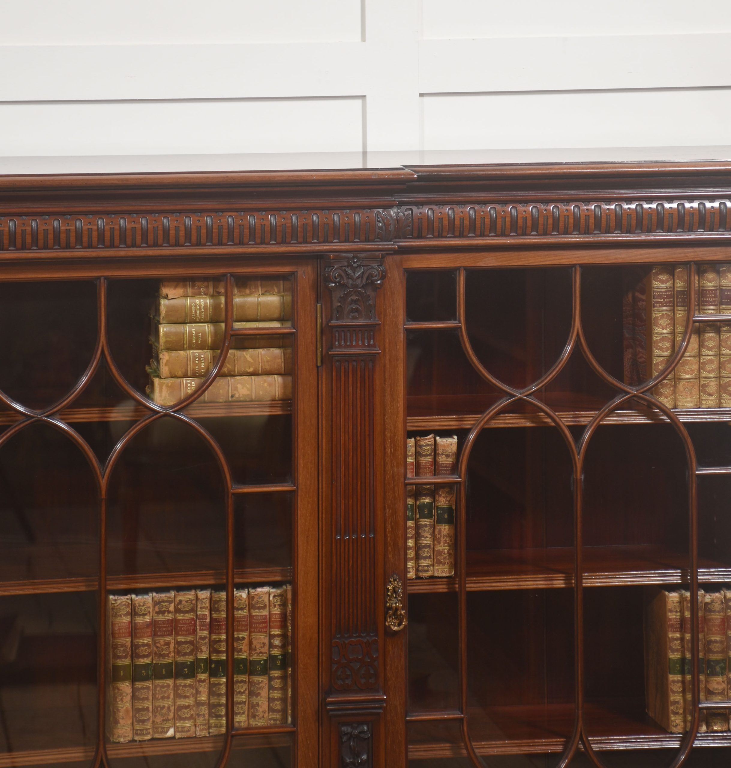 This impressive antique breakfront bookcase is crafted in richly figured mahogany and presents a refined interpretation of classical Georgian design, combining elegant proportions with finely executed decorative detail. The cabinet features a long, low breakfront form, with a subtly projecting central section flanked by slightly recessed end compartments, creating a balanced architectural silhouette well suited to both traditional libraries and refined interior spaces.