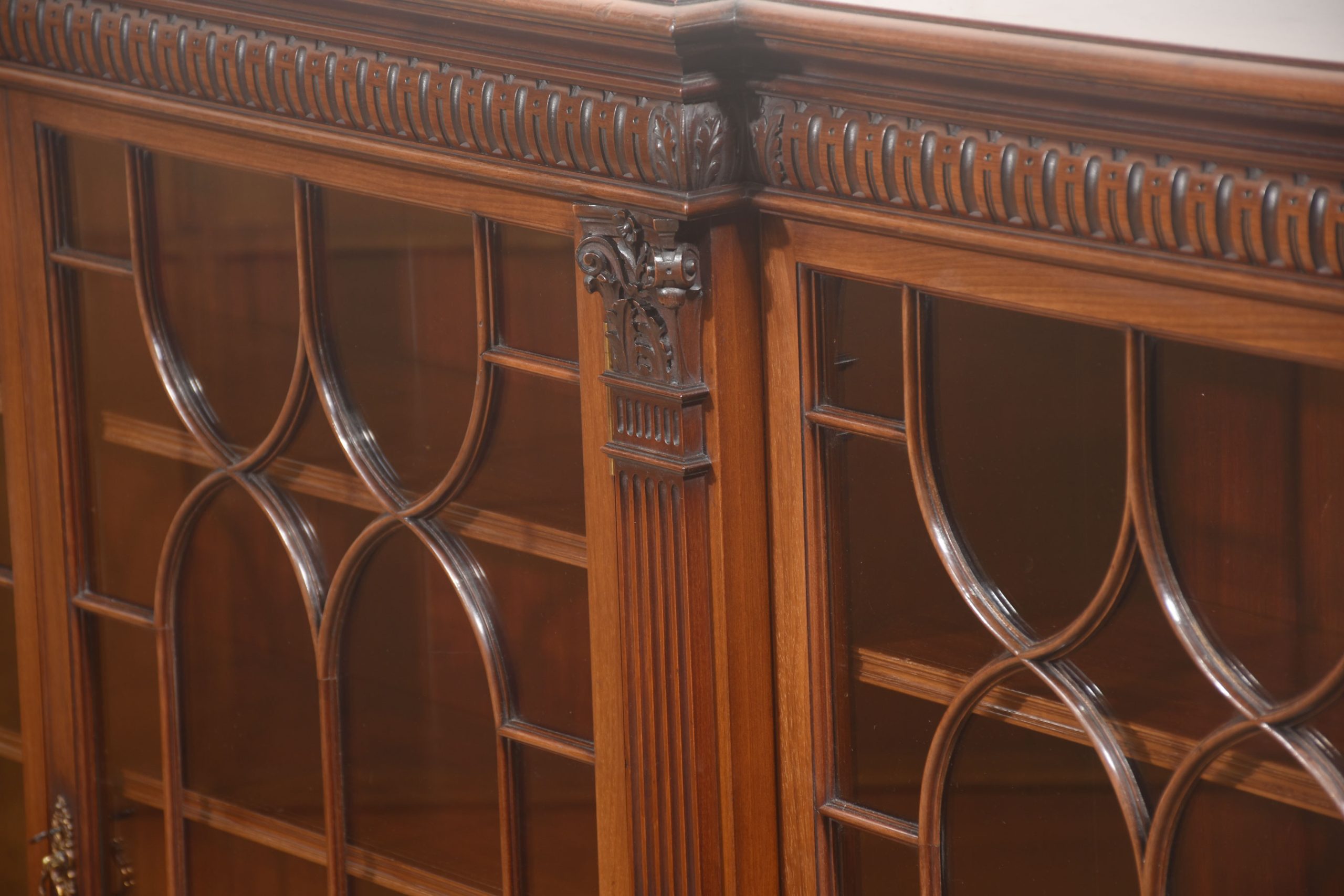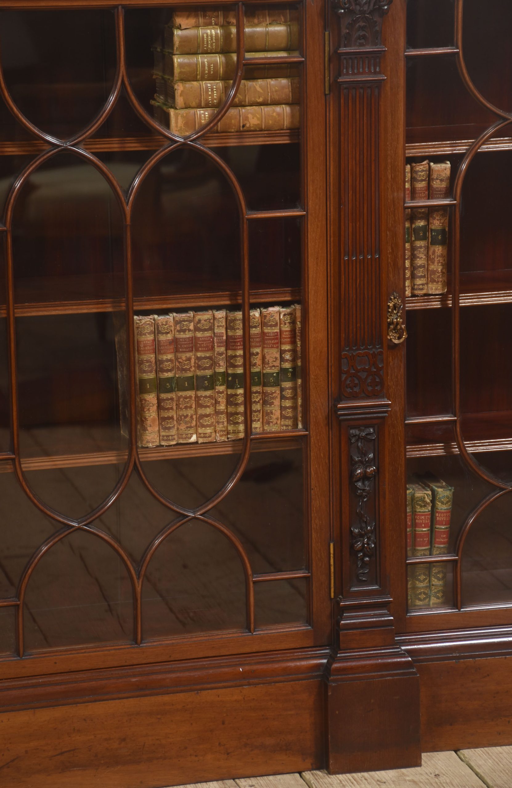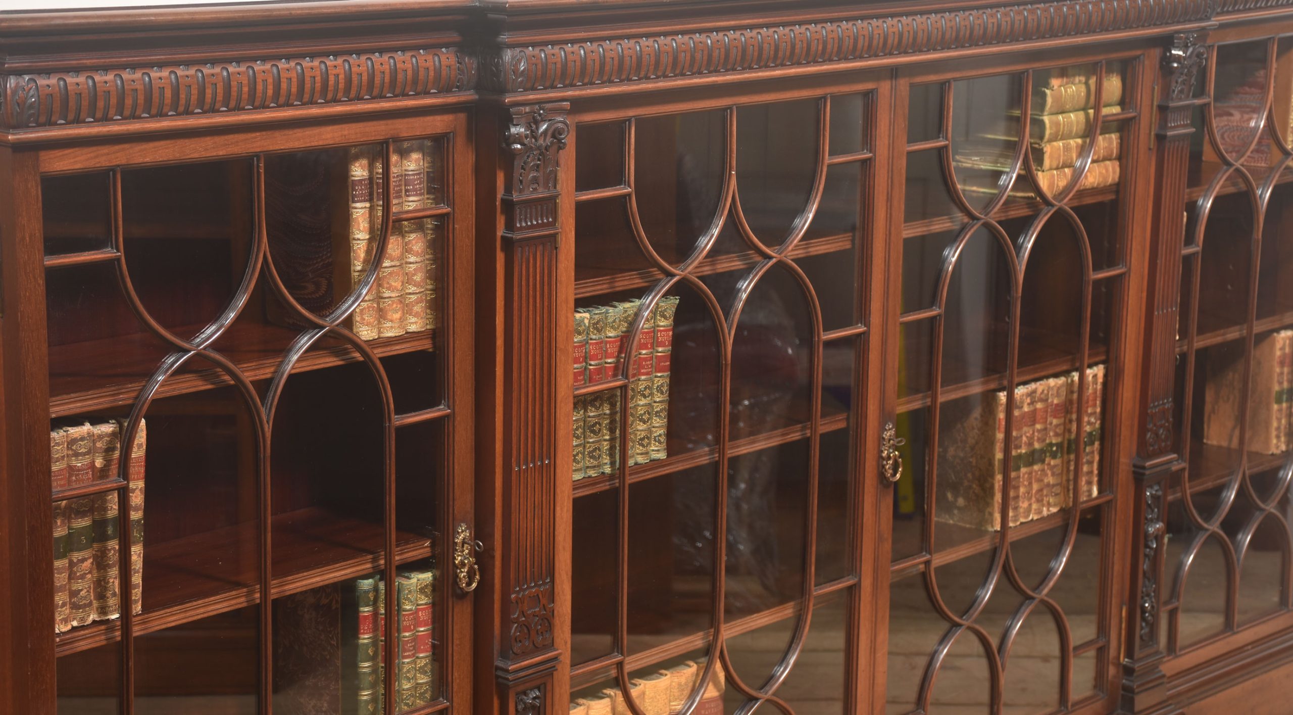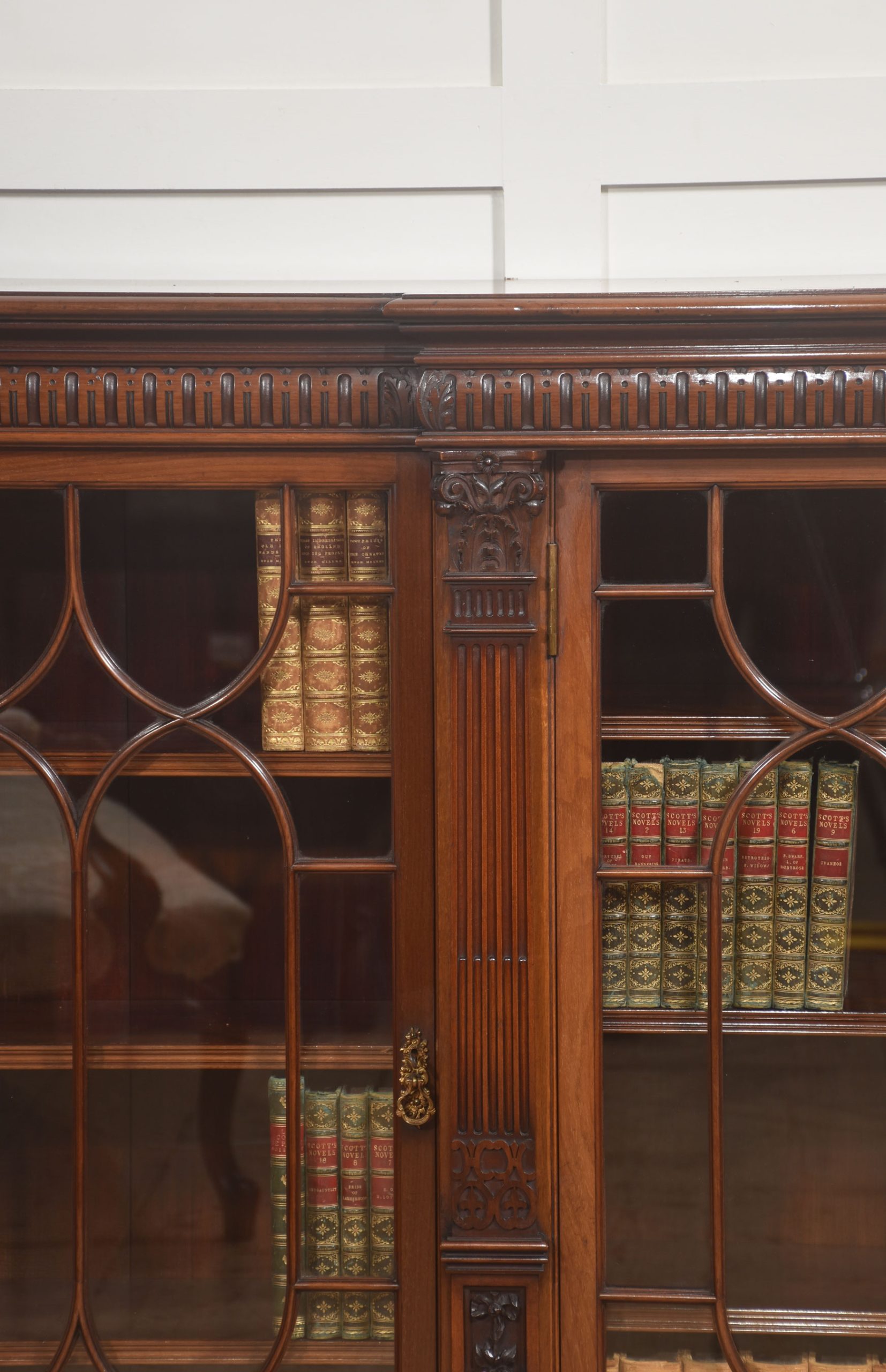 This impressive antique breakfront bookcase is crafted in richly figured mahogany and presents a refined interpretation of classical Georgian design, combining elegant proportions with finely executed decorative detail. The cabinet features a long, low breakfront form, with a subtly projecting central section flanked by slightly recessed end compartments, creating a balanced architectural silhouette well suited to both traditional libraries and refined interior spaces.