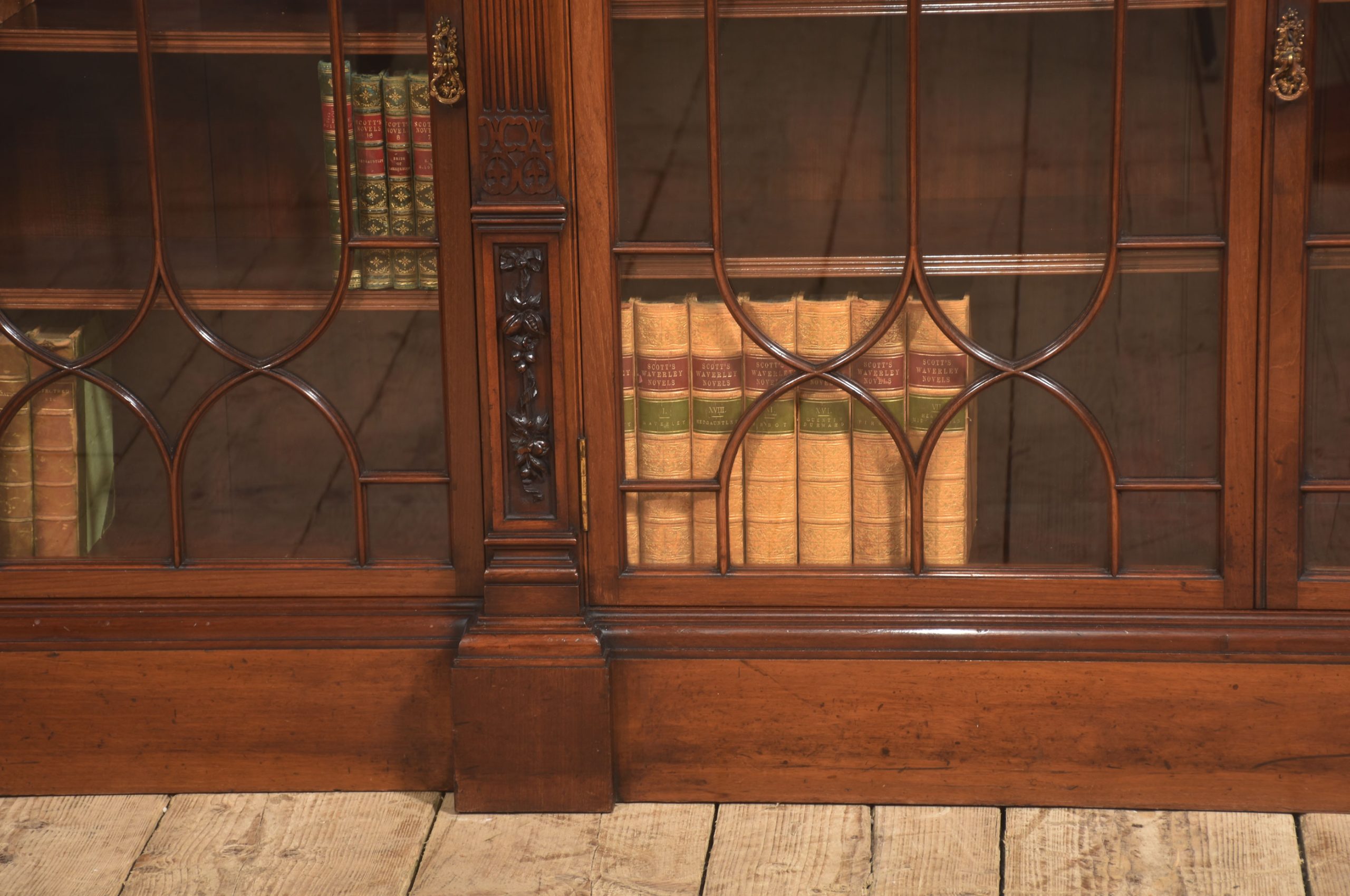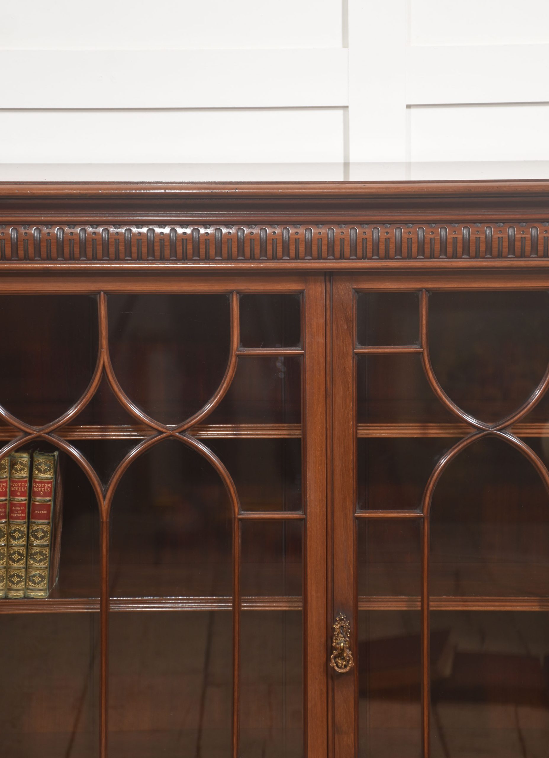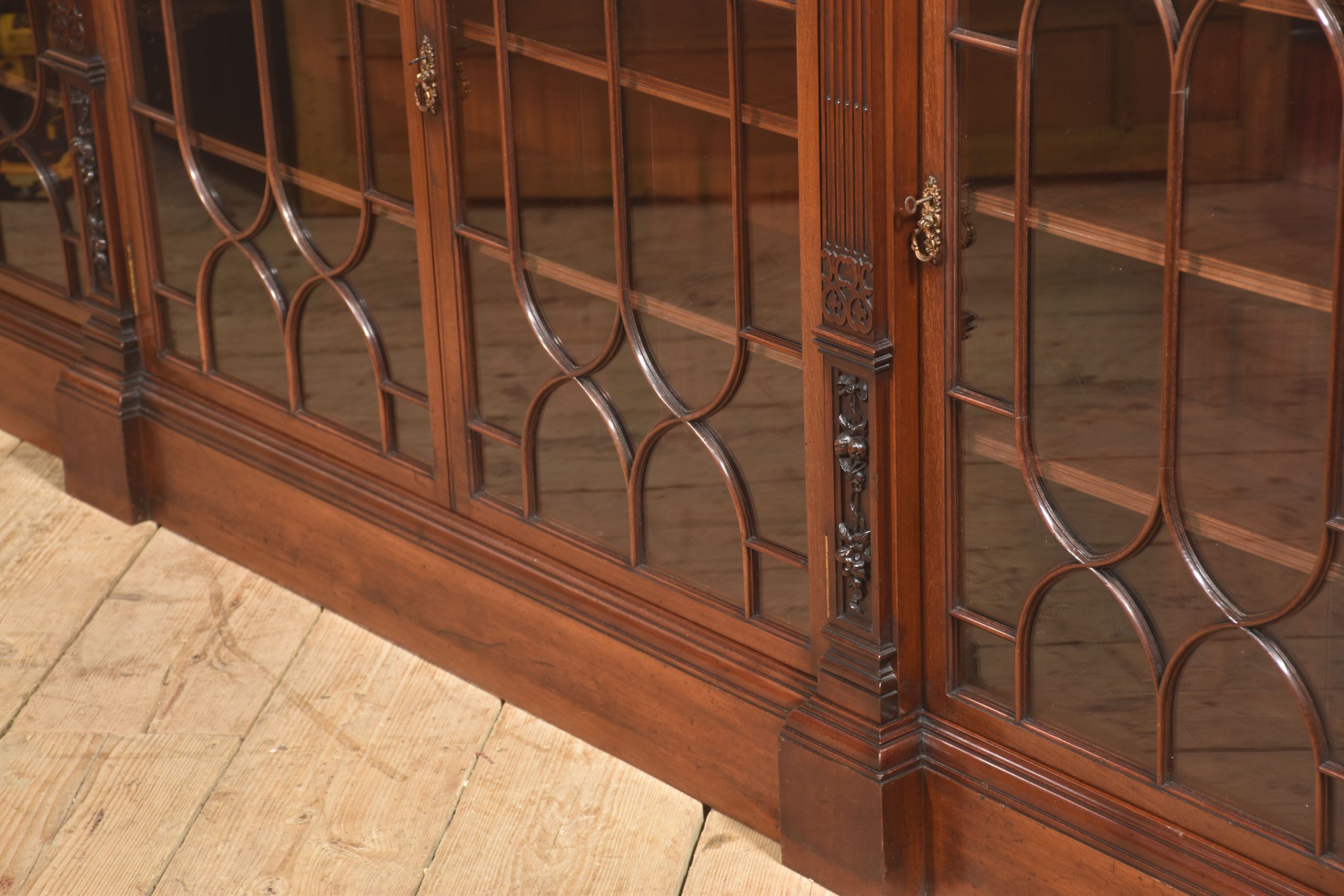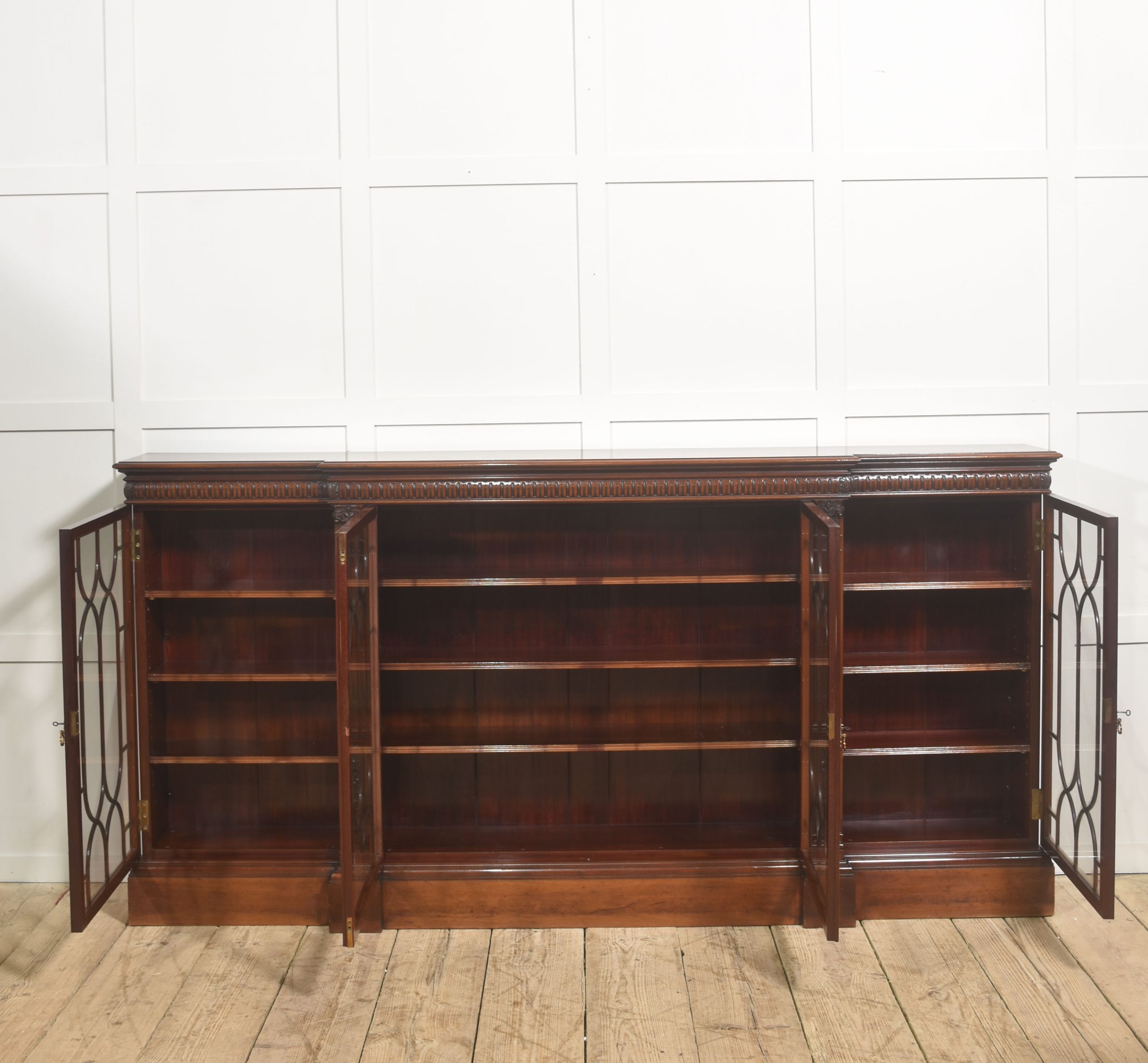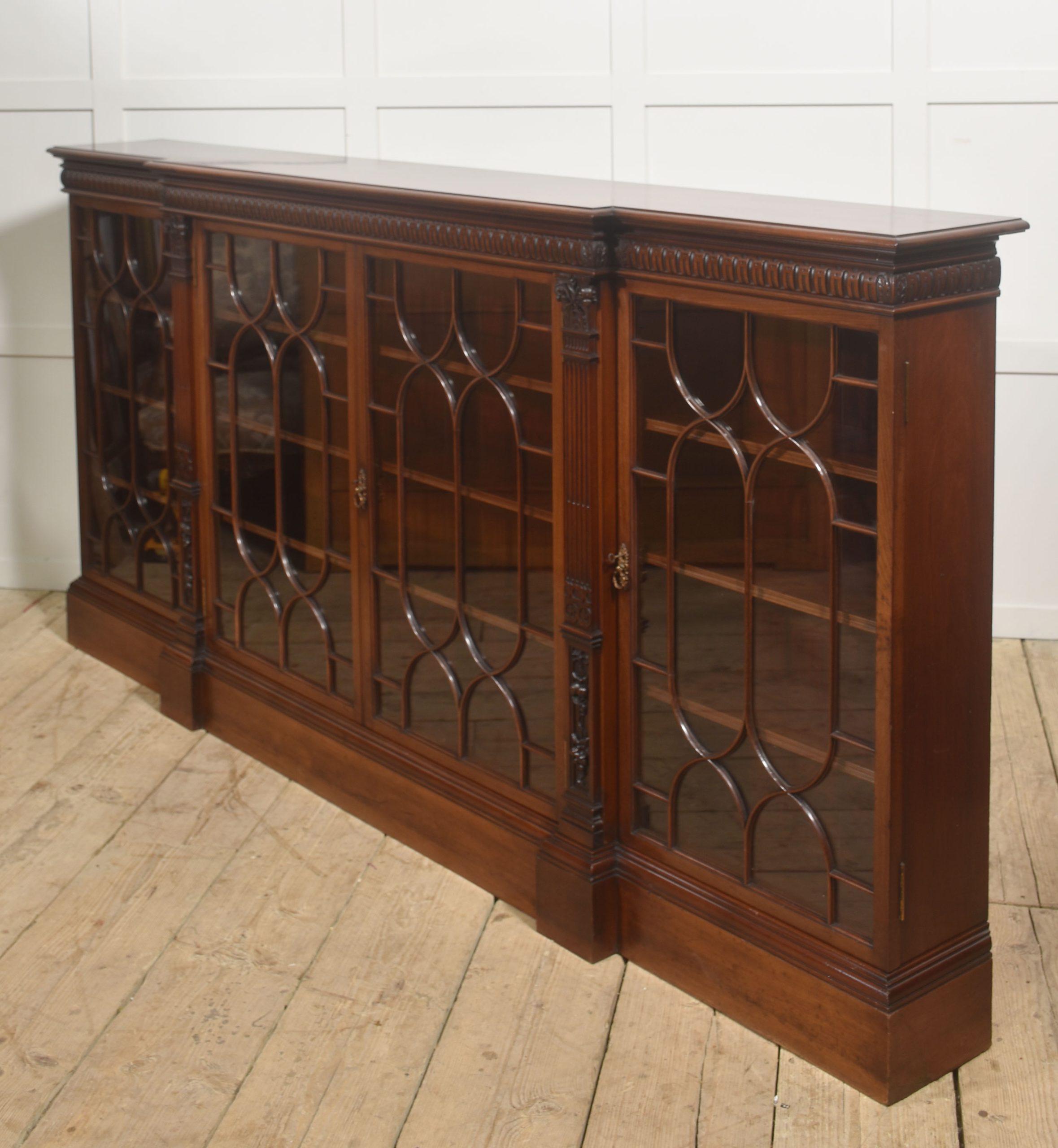 This impressive antique breakfront bookcase is crafted in richly figured mahogany and presents a refined interpretation of classical Georgian design, combining elegant proportions with finely executed decorative detail. The cabinet features a long, low breakfront form, with a subtly projecting central section flanked by slightly recessed end compartments, creating a balanced architectural silhouette well suited to both traditional libraries and refined interior spaces.