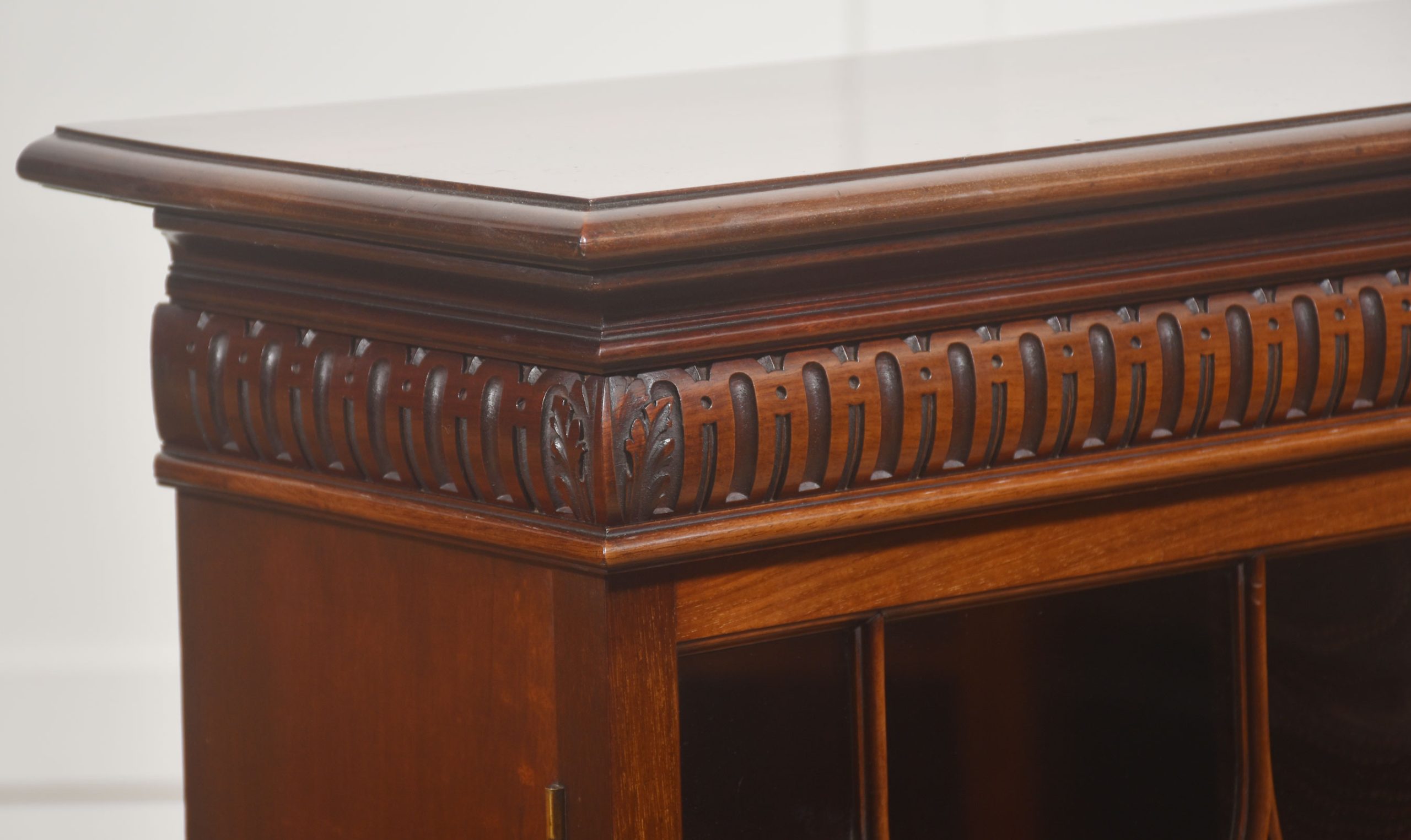Between the glazed door sections, the bookcase is articulated with fluted pilasters that add vertical emphasis and classical character. These pilasters are further embellished with carved details, including floral and foliate motifs, lending the cabinet a subtle sense of ornament without overwhelming its elegant form. The upper frieze is decorated with a continuous carved dentil-style moulding that runs across the entire width of the bookcase, reinforcing the architectural inspiration behind the design and drawing the eye along the length of the piece.